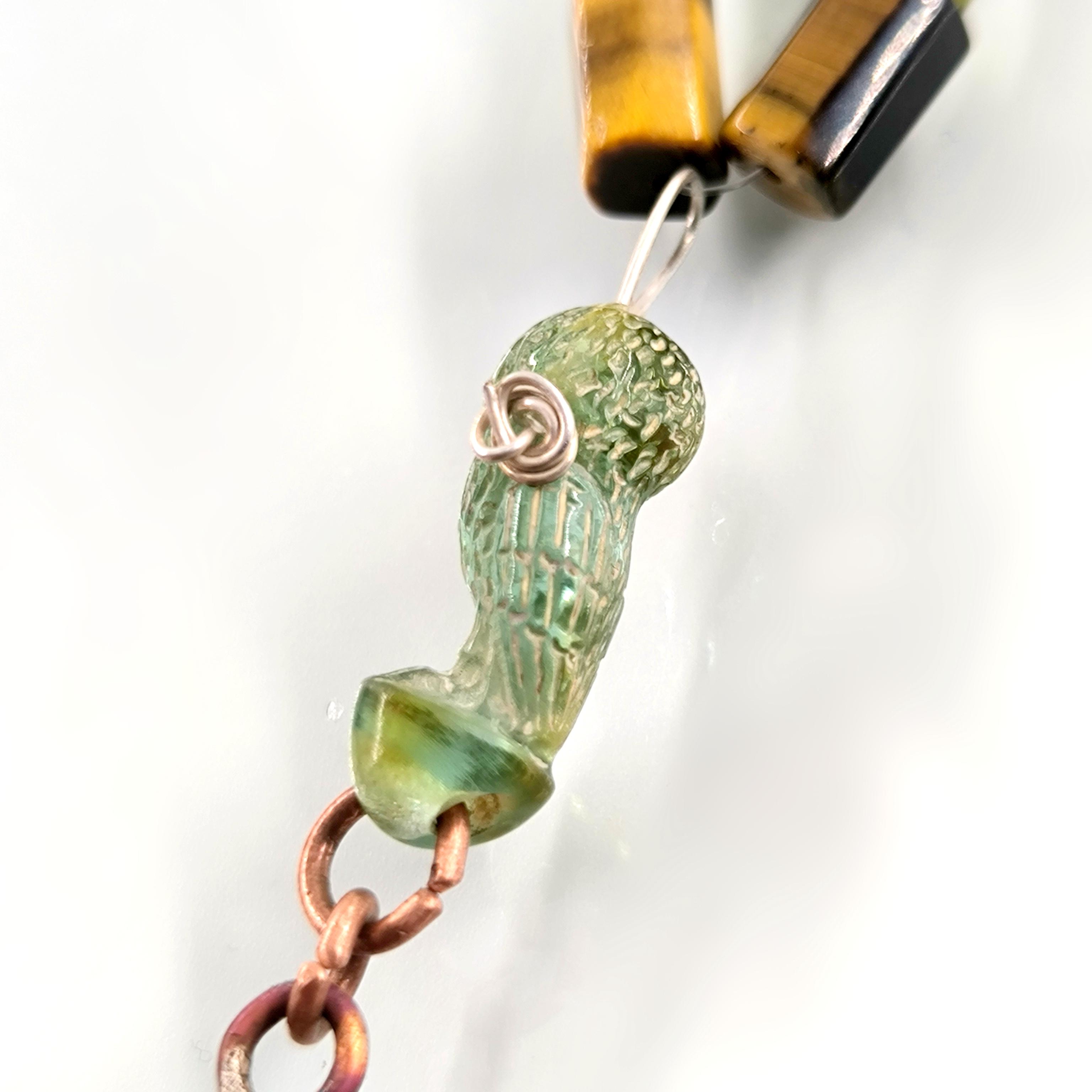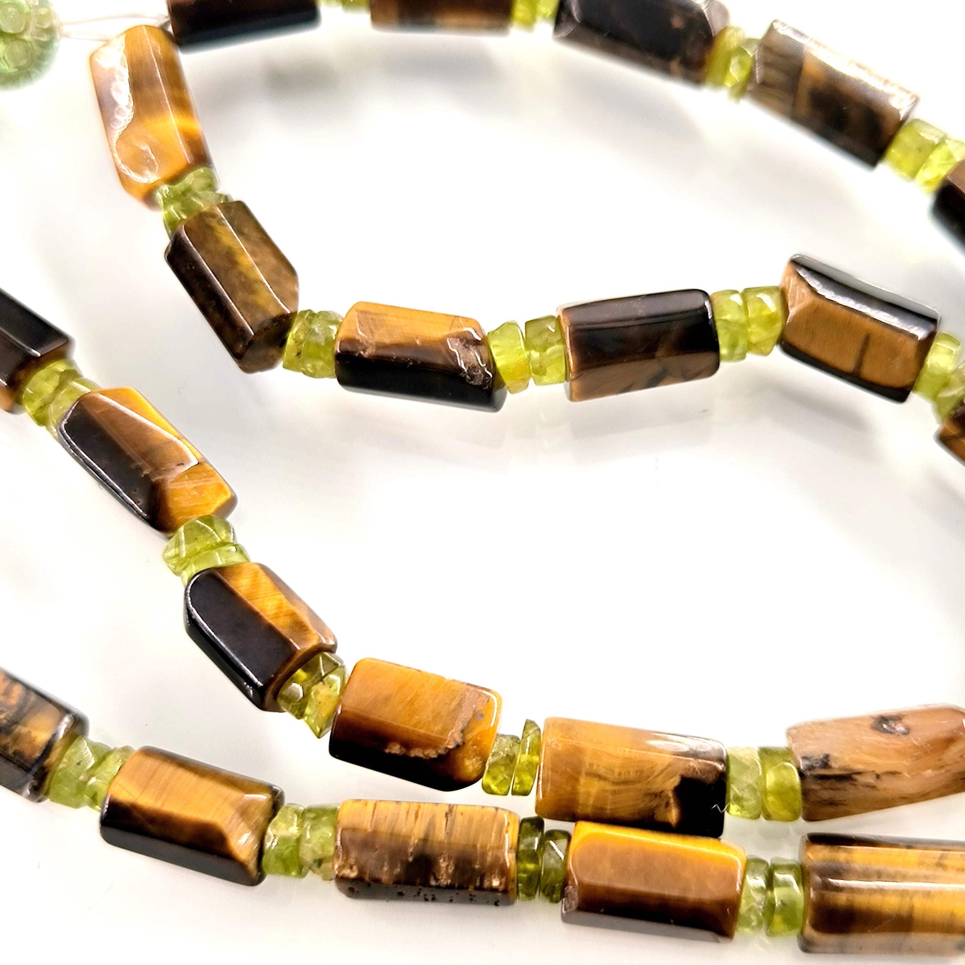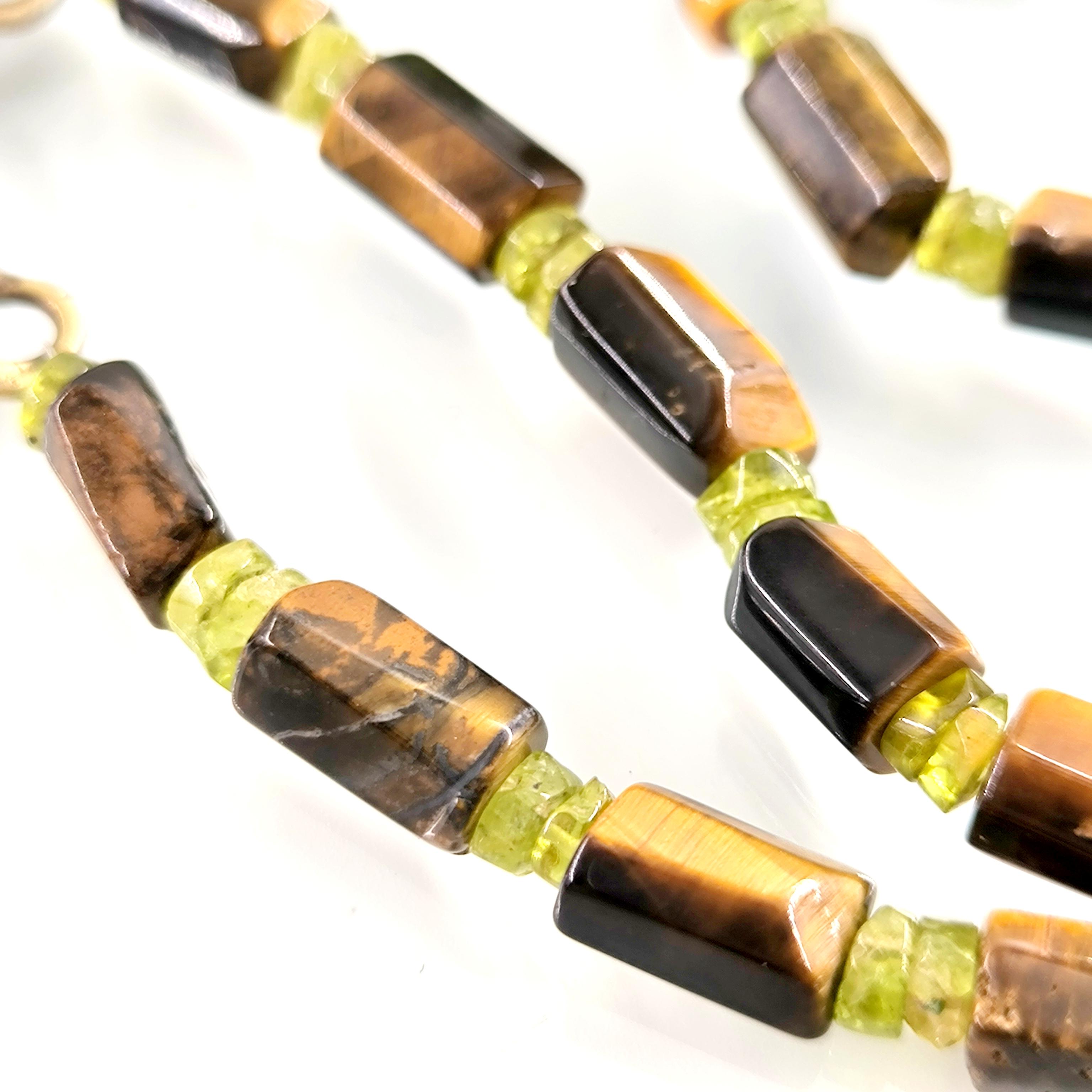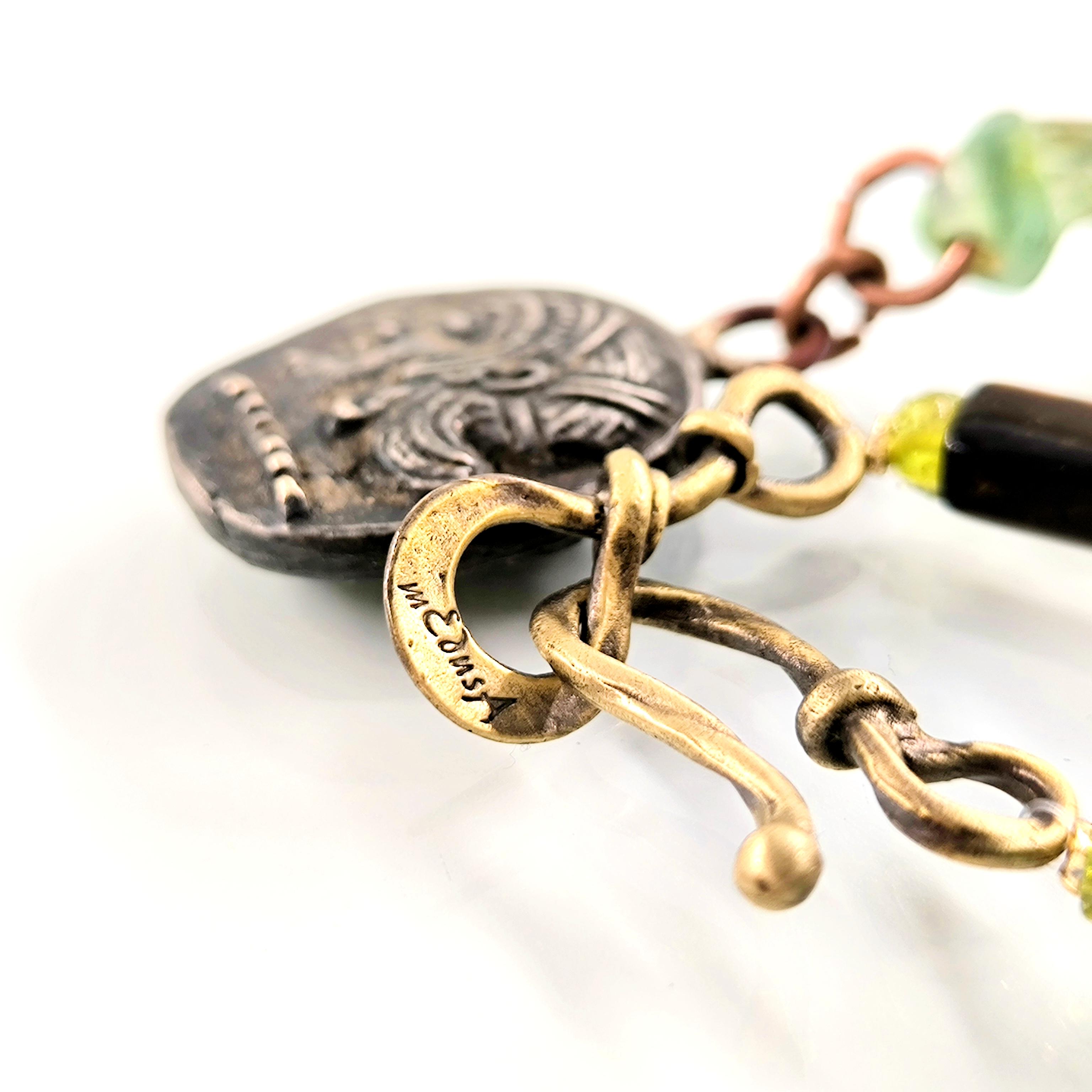 Bu tasarımda antik dünyanın bilgelik sembollerini güçlü taşlarla bir araya getirdim. Zincir bölümünde yer alan kaplan gözü taşları ışıkla birlikte canlı bir derinlik yaratırken, aralarındaki natürel zebercetler tasarıma taze ve enerjik bir denge katıyor. Kolye ucunda yer alan yeşil kehribar üzerindeki baykuş kabartması, Athena’nın kadim bilgeliğini simgeler. Hemen altında sallanan düşük ayar gümüş replika ilkel Athena sikkesi ise tasarıma arkeolojik bir ruh kazandırıyor. Medusa imzalı özel gümüş klips ile tamamlanan bu parça, hem güçlü semboller taşıyan hem de boyunda dikkat çeken özgün bir sanat kolyesidir.