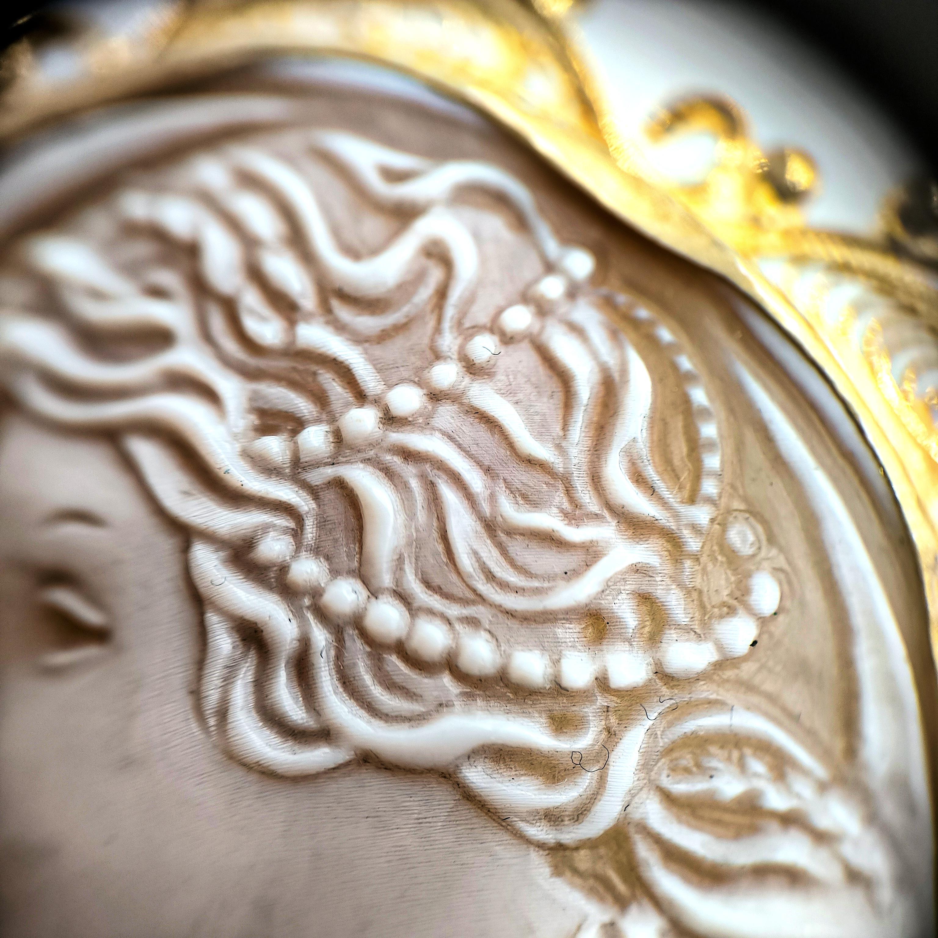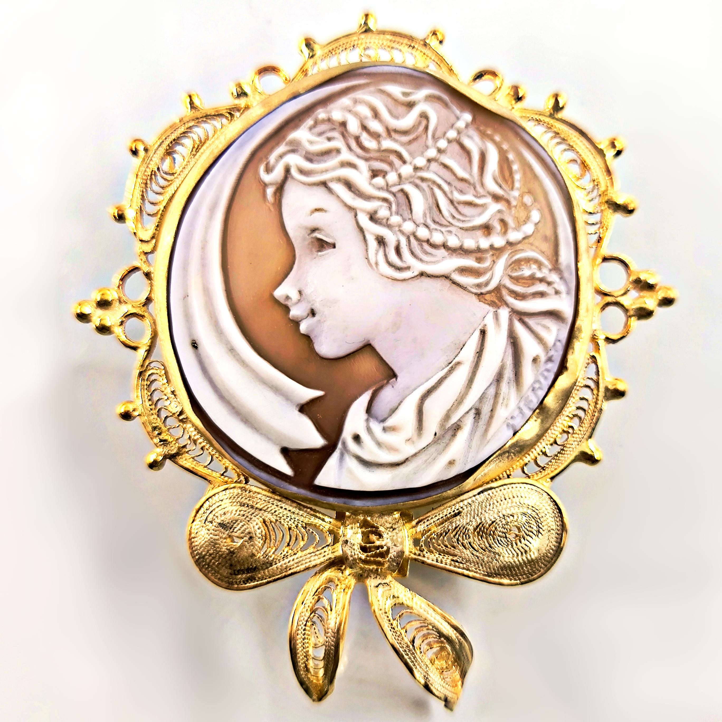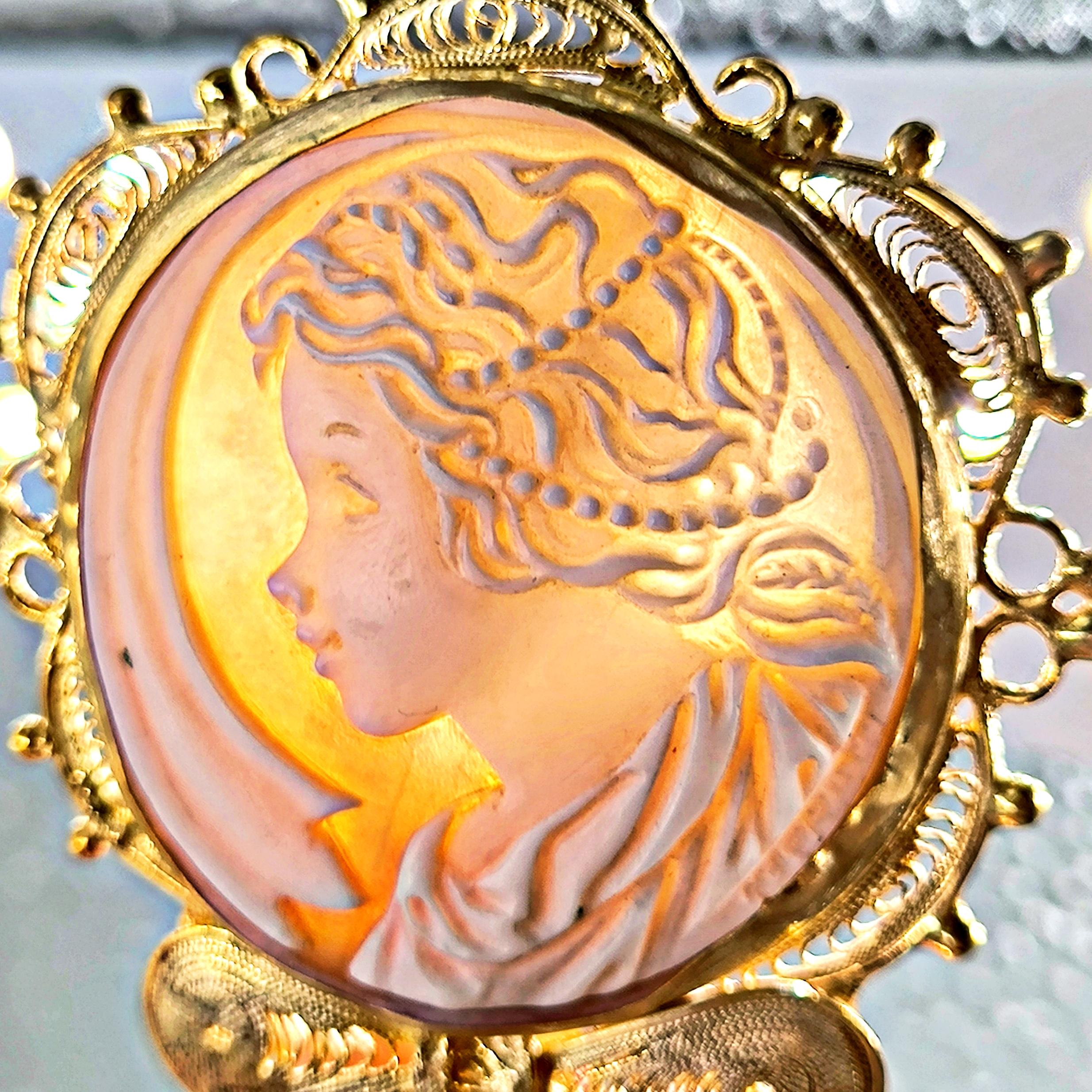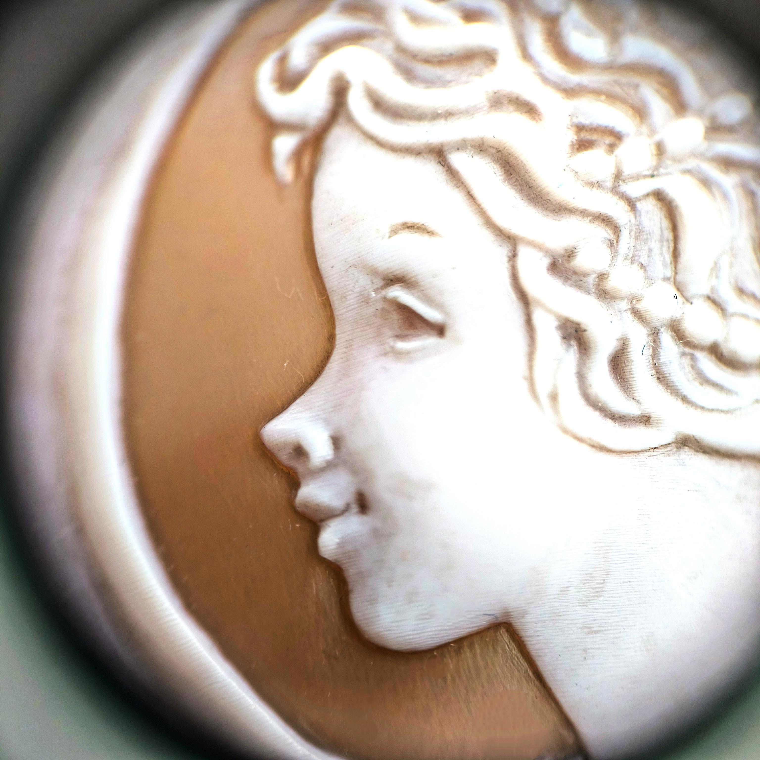 1990’lar yapımı bu imzalı cameo, ay siluetiyle bütünleşen bakışları ve inci gibi işlenmiş saç detaylarıyla büyülüyor.