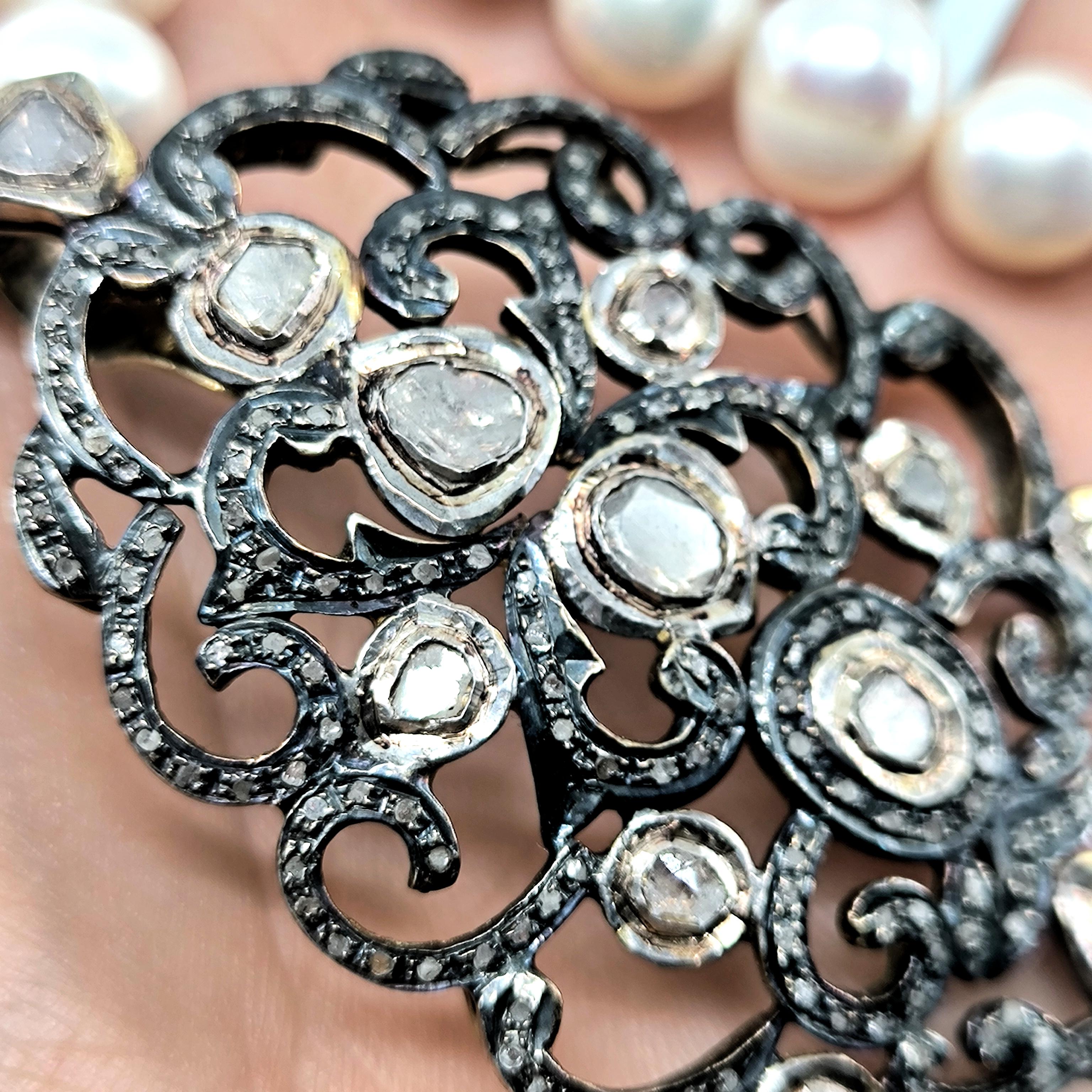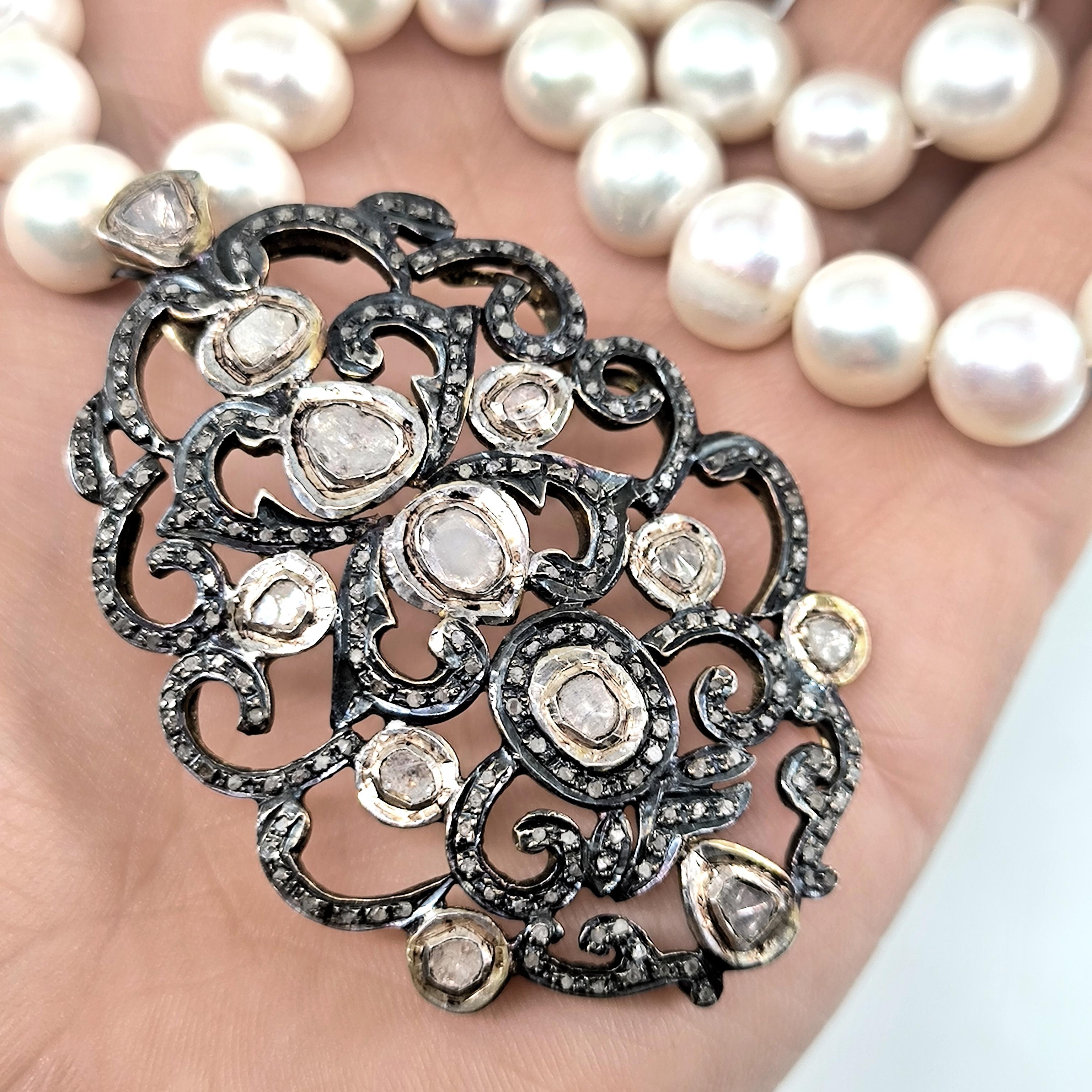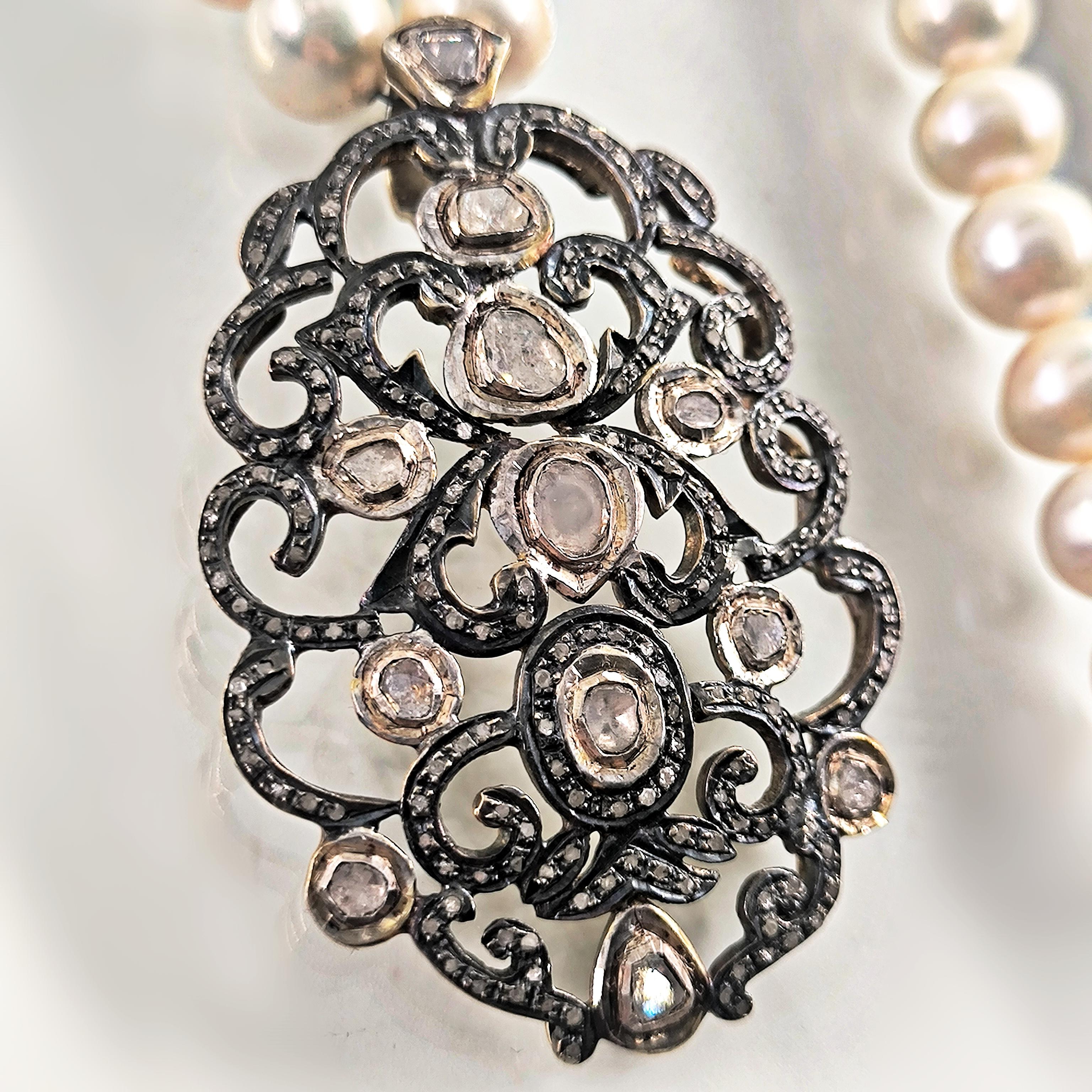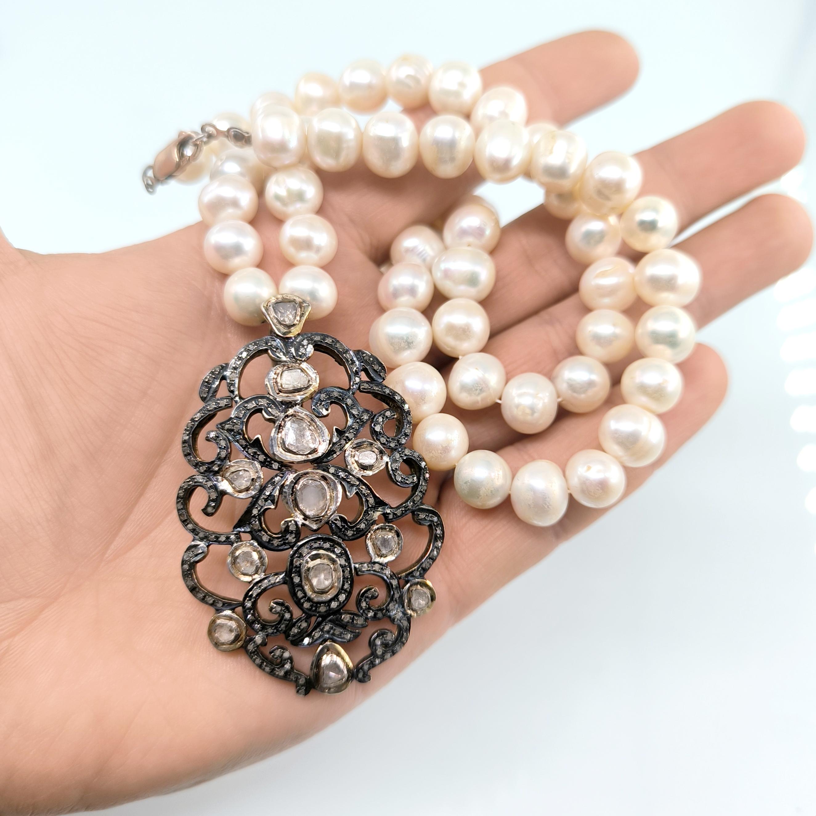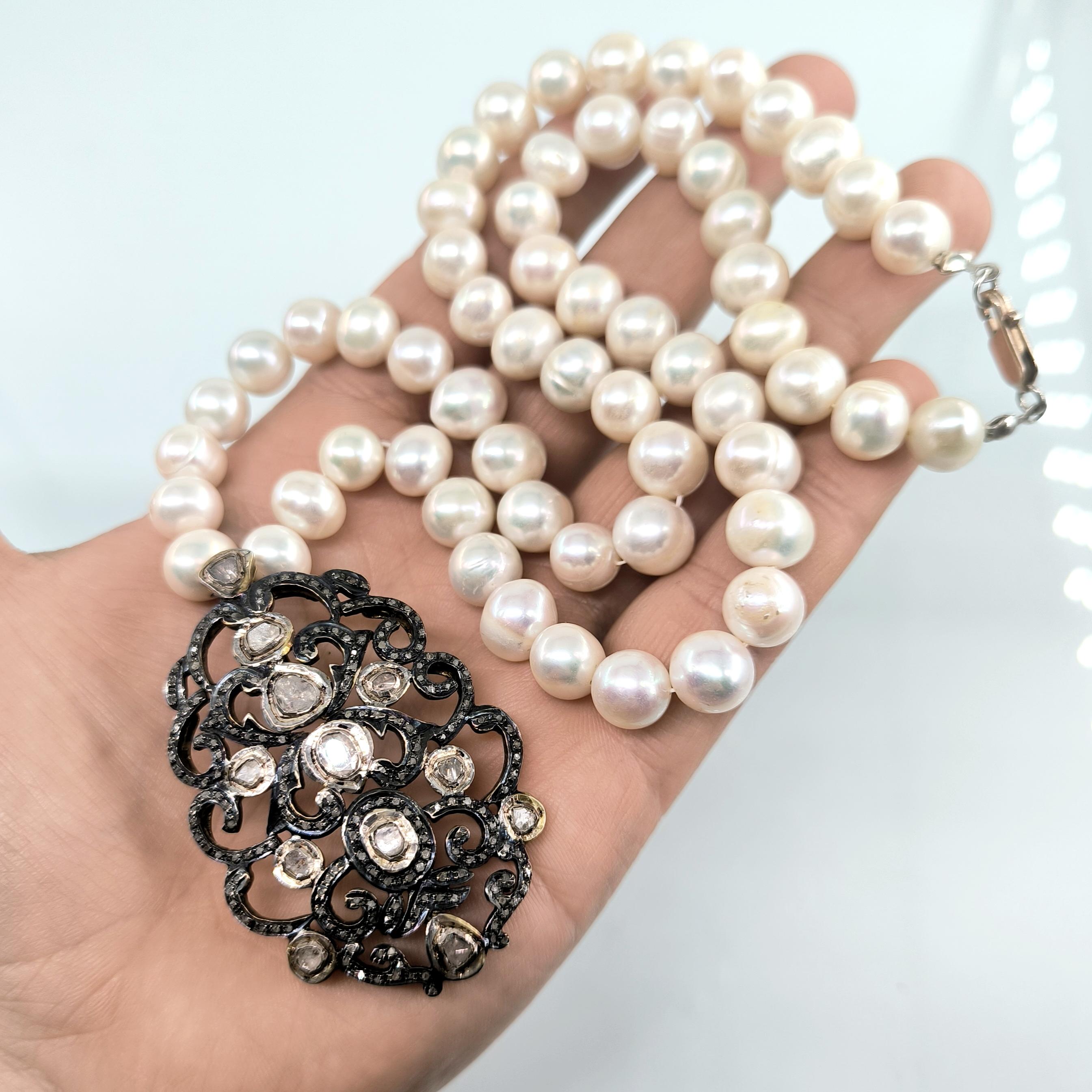 Bu tasarımda zarafetin en saf halini doğanın armağanı olan iri natürel incilerle buluşturdum. İnci tanelerinin yumuşak ışıltısı, zamanın içinden gelen bir asalet hissi taşırken kolye ucundaki Hint işçiliği adeta bir mücevher şiiri gibi karşımıza çıkar. 925 ayar gümüş üzerine işlenmiş ince motifler, iri elmaslar ve etrafa serpiştirilmiş minik elmas kırıntılarıyla büyüleyici bir ışık oyunu oluşturur. Her açıdan farklı bir parıltı veren bu kolye, kadim saray mücevherlerinin ruhunu taşıyan nadide bir parçadır. Boyunda taşındığında yalnızca bir takı değil, zarafetin ve ihtişamın sessiz bir imzası olur. Üzerinde gördüğünüz her taş natürel elmastır.