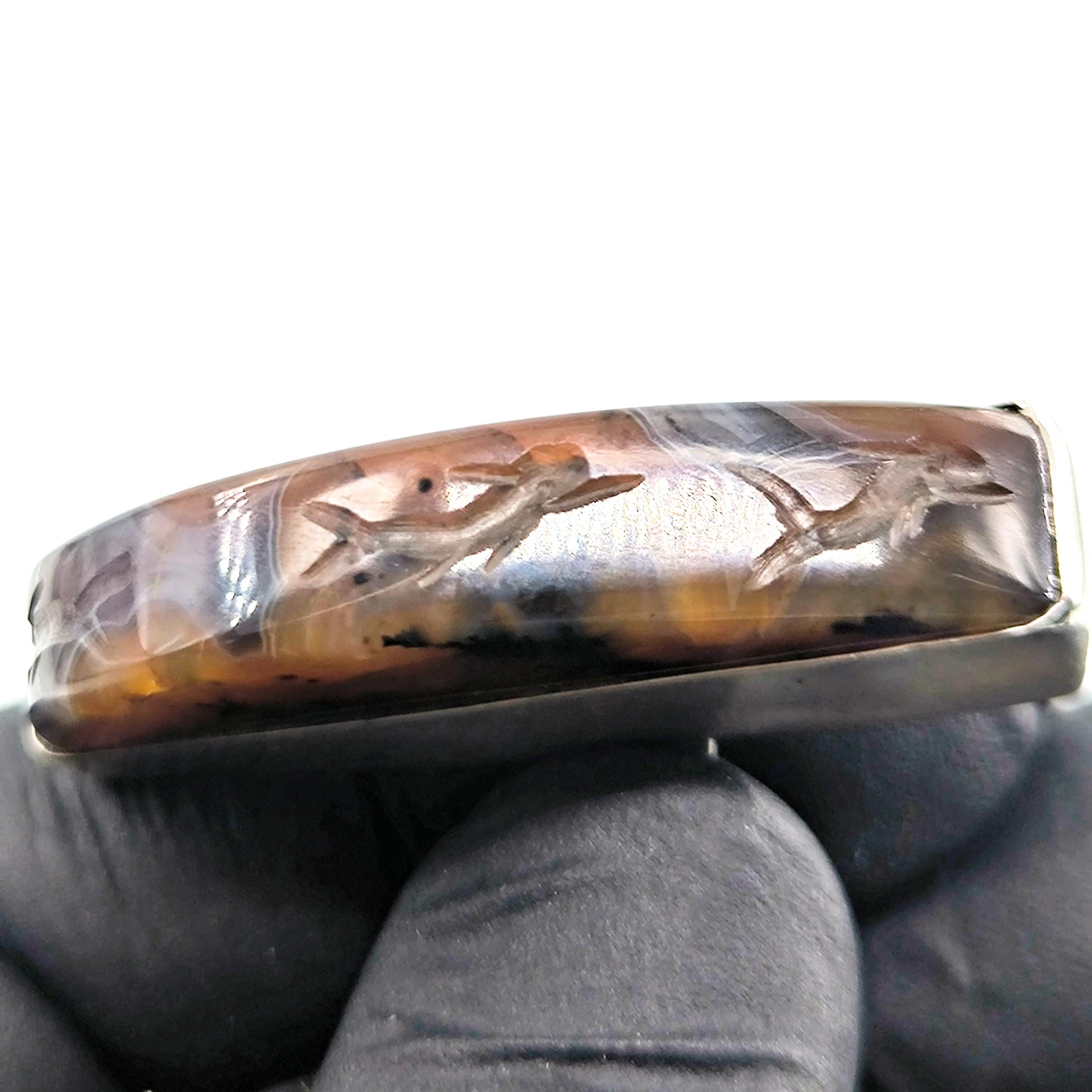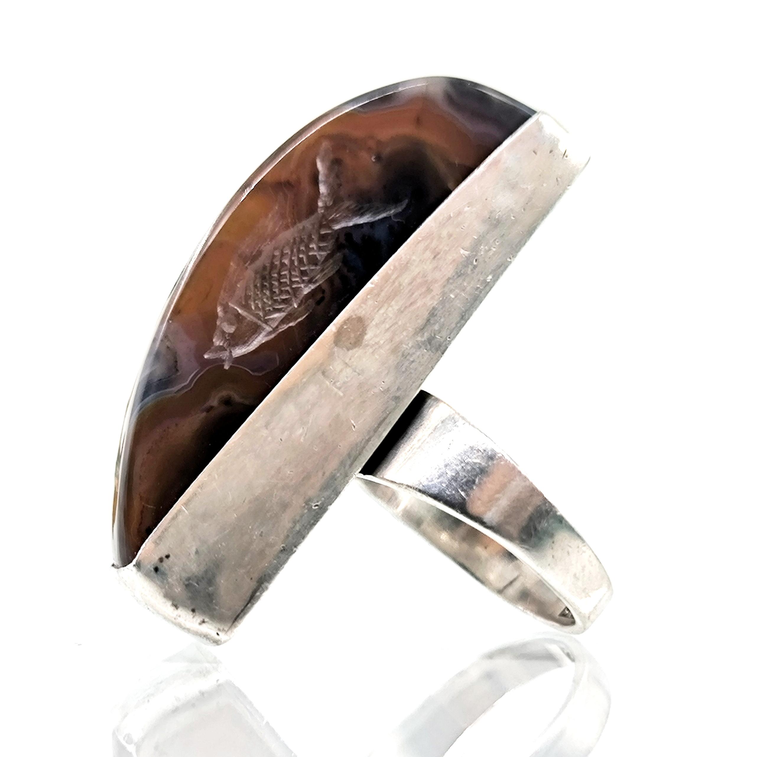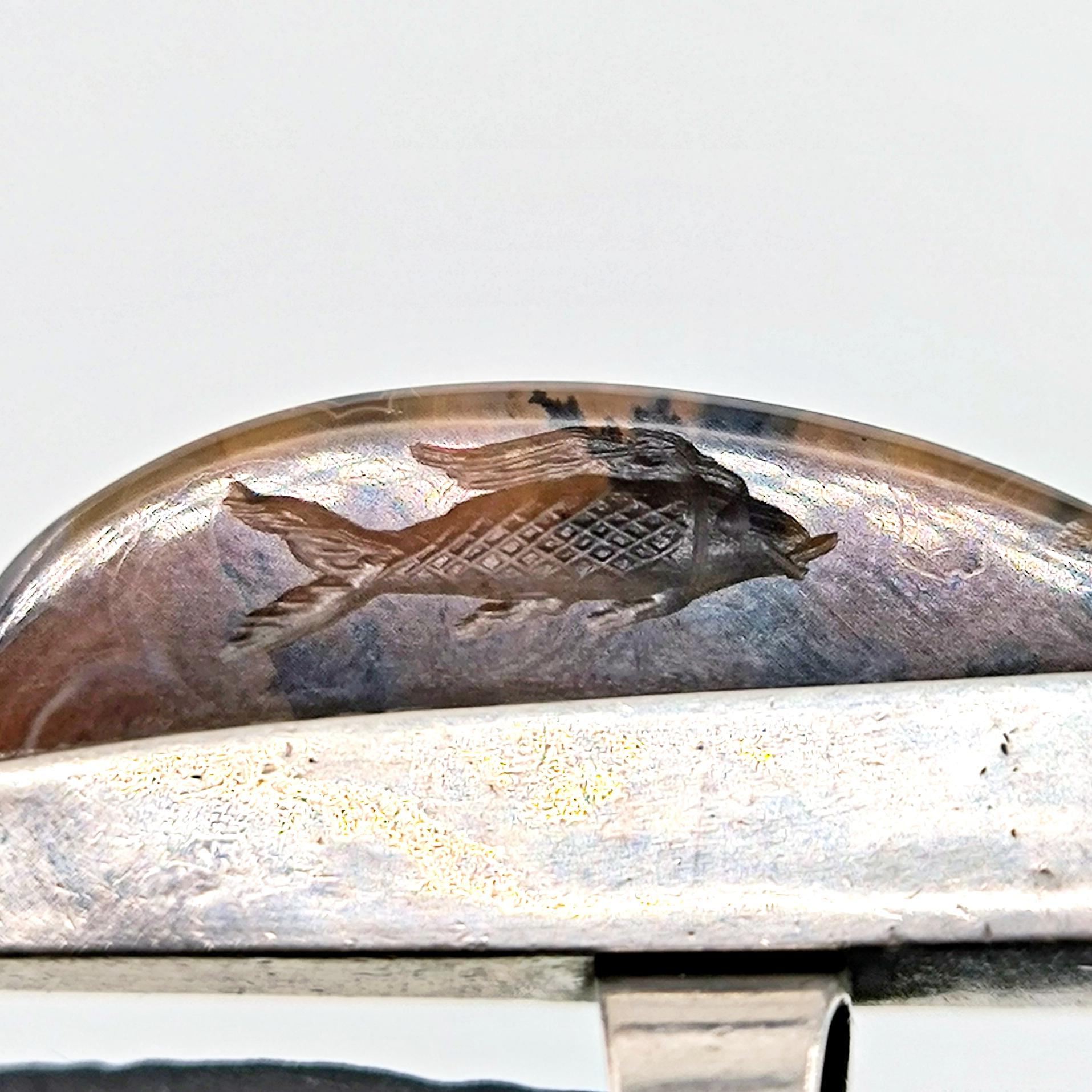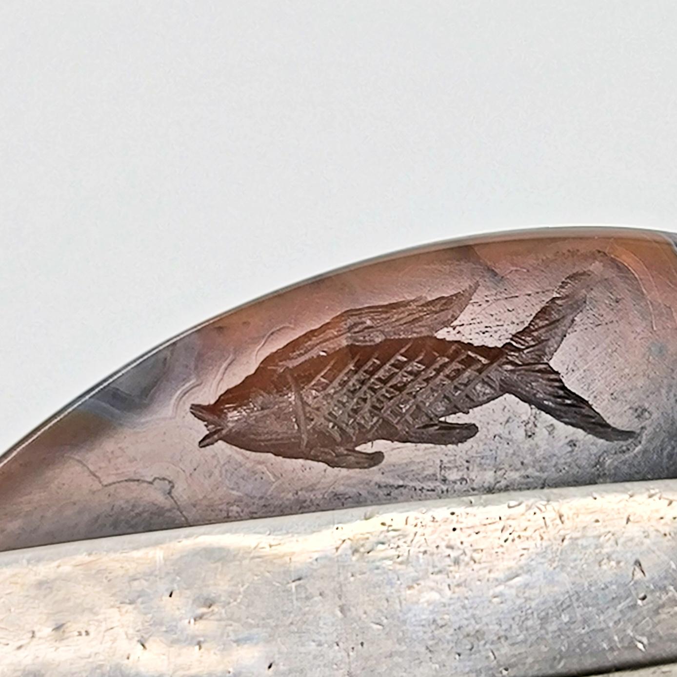 Doğanın damarlarını andıran eşsiz desene sahip özel kesim agat taşının içine, negatif oyma tekniği ile iki balık ve üst bölümde üç yunusun zarif hareketlerini işledim. Su elementinin sonsuz döngüsünü temsil eden bu figürler, hayatın akışına teslim olmanın, bereketin ve şansın güçlü sembolleridir. 925 ayar gümüşten el işçiliğiyle hazırlanan minimalist çerçeve, taşı tüm ihtişamıyla öne çıkarırken doğal tonların derinliğini kusursuzca vurgular. Hem mitolojik hem ruhsal anlamlar taşıyan, özgün ve tek bir adet olarak üretilmiş koleksiyon parçası.