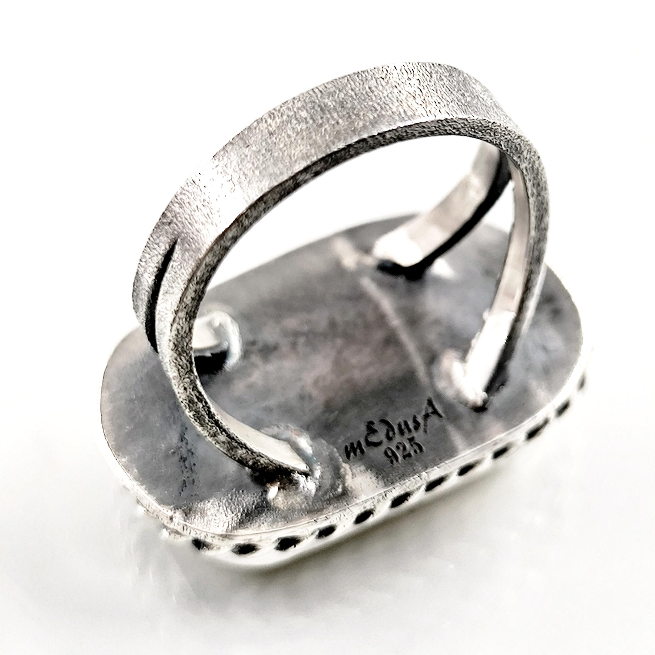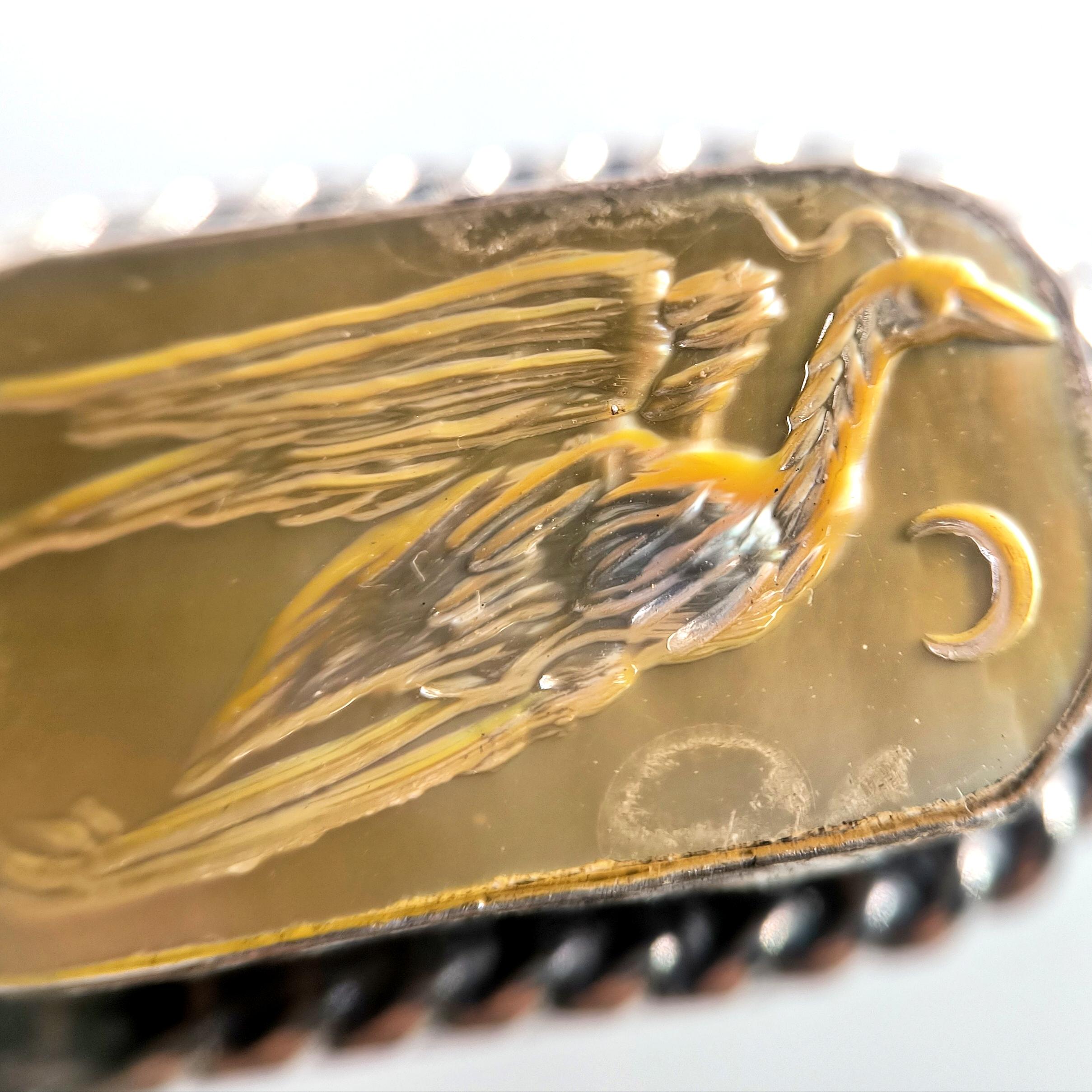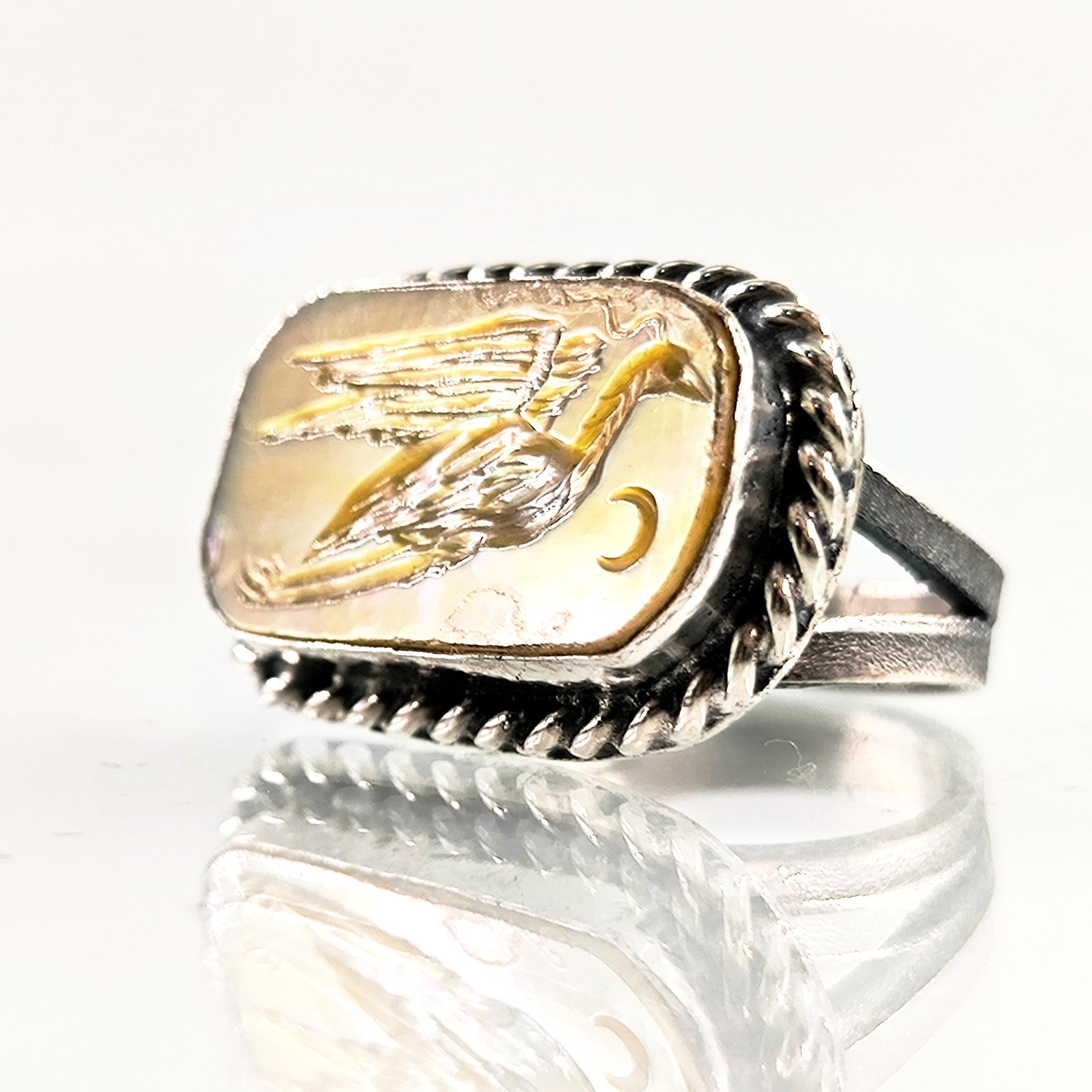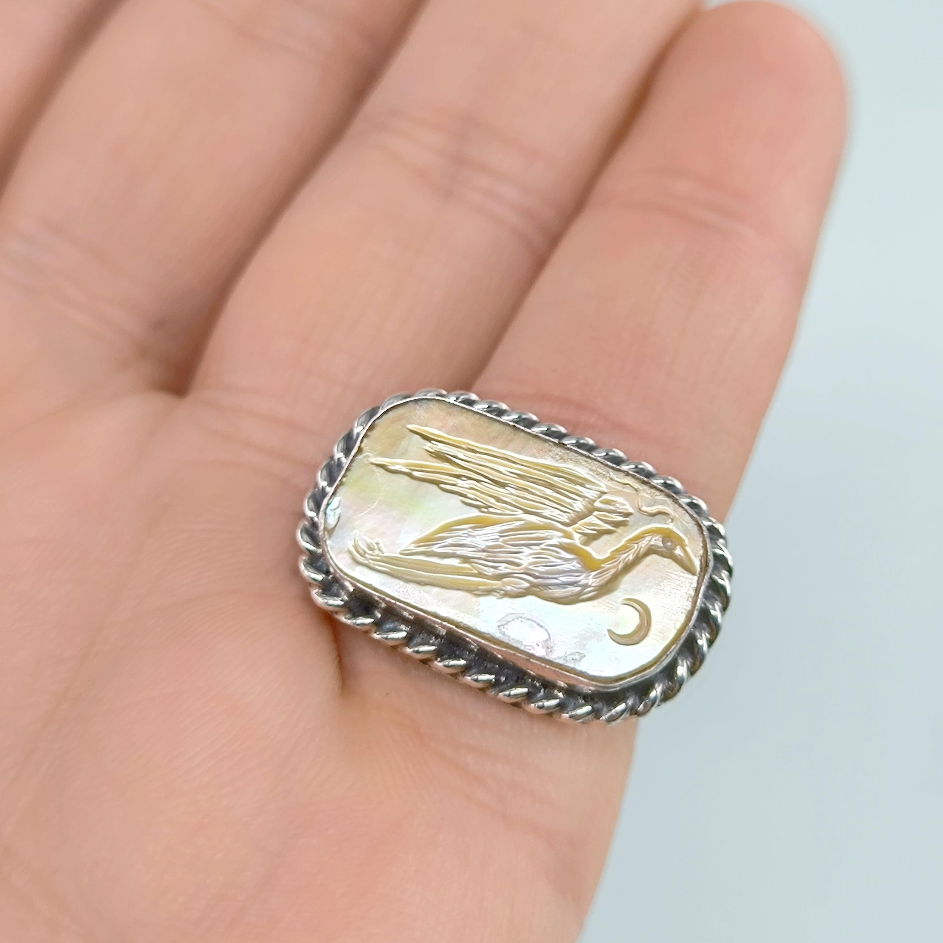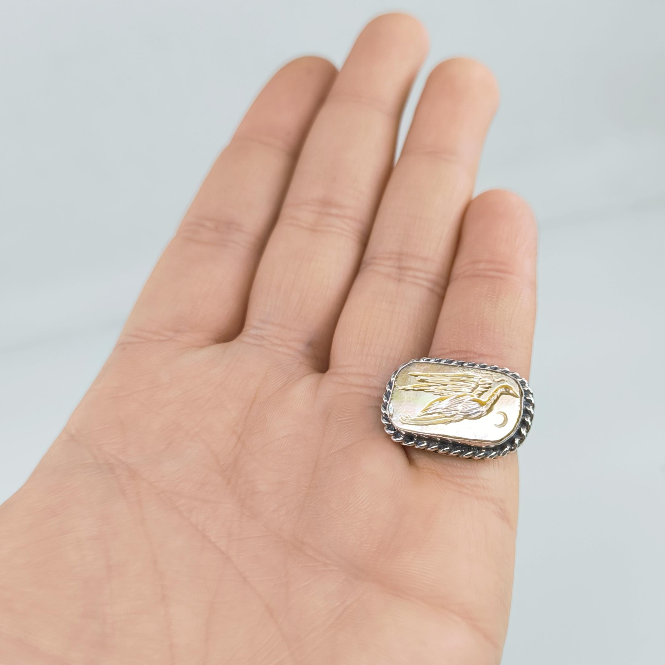 Antik efsaneler, suyun aynasında kaderini bekleyen balıkçılın sabrı ve sezgisiyle karanlık gecelerde yolu bulanlardan bahseder. Ayın gümüş ışığında kanatlarını açtığında, gökyüzü ile su arasında kurduğu köprü, ruhun kendi iç ışığını bulma anını temsil eder. Sedef taşının derin parıltısında yeniden hayat bulan bu figür, içsel denge, dinginlik ve sezgisel bilgelik taşıyan kadim bir semboldür. Her çizgisi el oyması negatif intaglio tekniğiyle işlenmiş balıkçıl kuşu, binlerce yıllık bir arketipin modern yorumunu sunar. El işçiliği 925 ayar gümüşten üretilmiş olup tek adet hazırlanmıştır. Zamansız ruhu taşıyan güçlü bir koleksiyon parçasıdır.