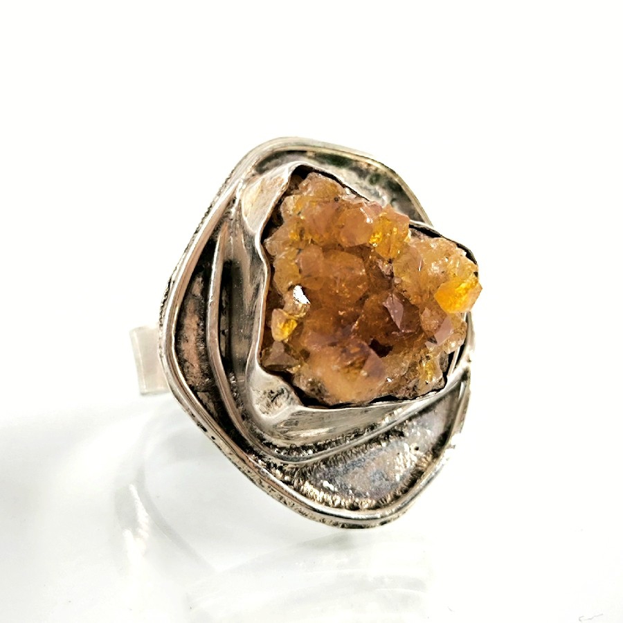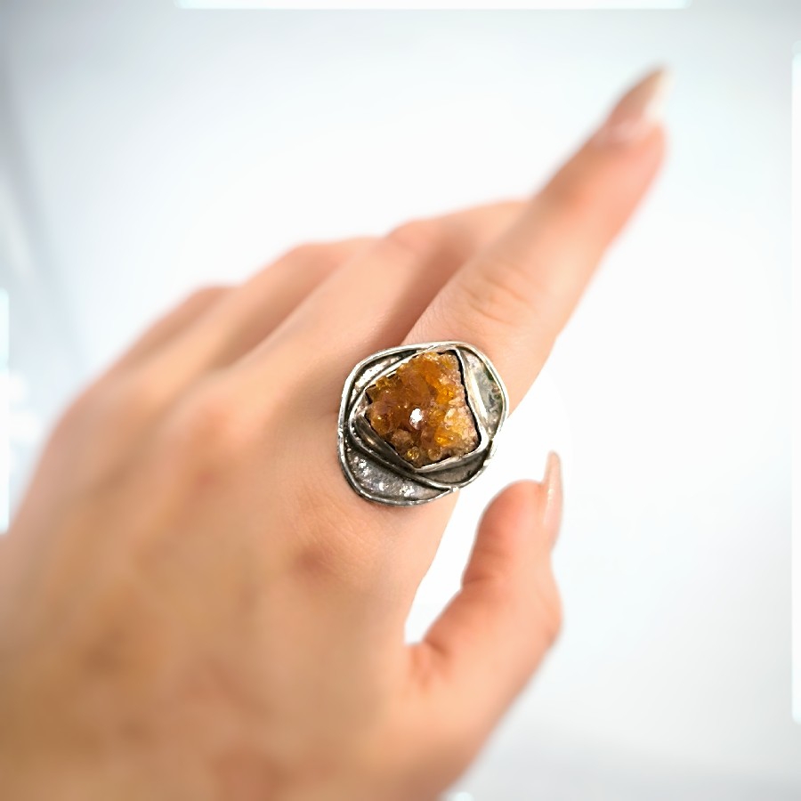 Yüzükte kullanılan ham sitrin taşı, doğal bir enerji kaynağı olarak bilinir ve kişinin aura enerjisini yükseltmeye yardımcı olur. Ayrıca bolluk, refah ve mutluluk getirdiğine inanılır. Bu nedenle bu yüzük, kullanıcısına hem stil hem de sakinlik kazandırır.