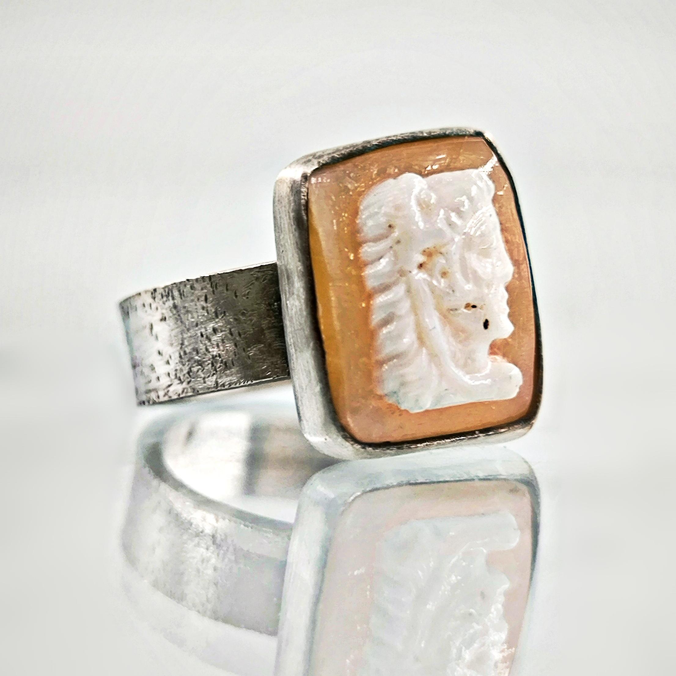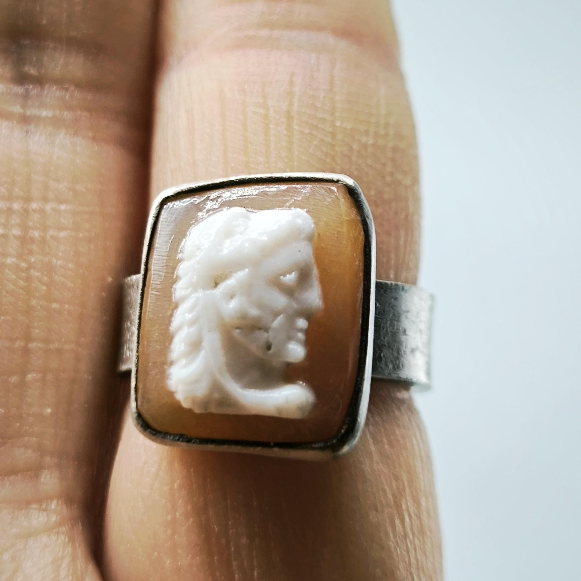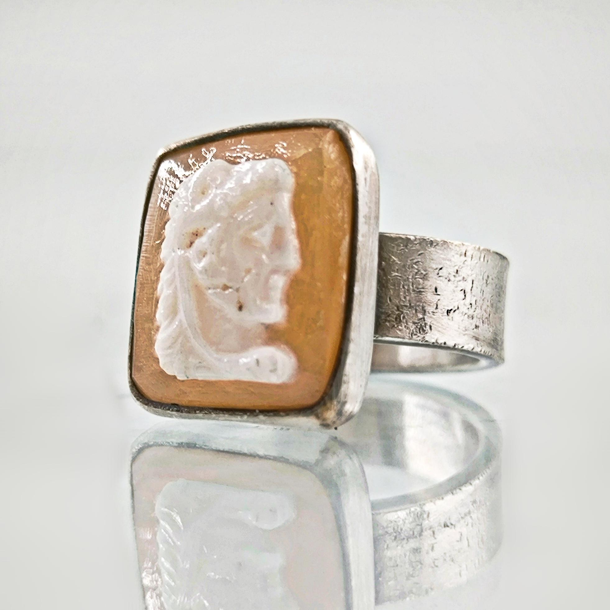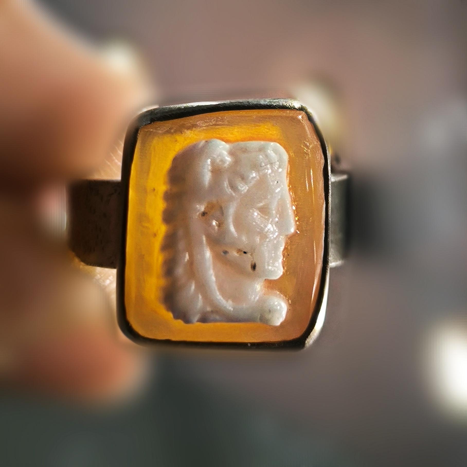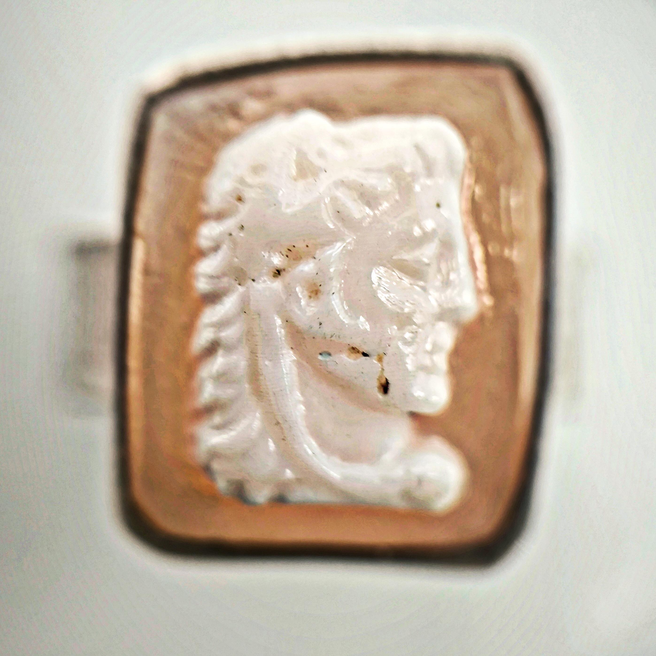 Bir ''mEdusA'' eseridir. Natürel Shell deniz kabuğu üzeri (casssisrufa) oyma ''Büyük İskender'' tasviri çalıştığımız 925 Ayar Gümüş antik stilde yüzüğümüz!