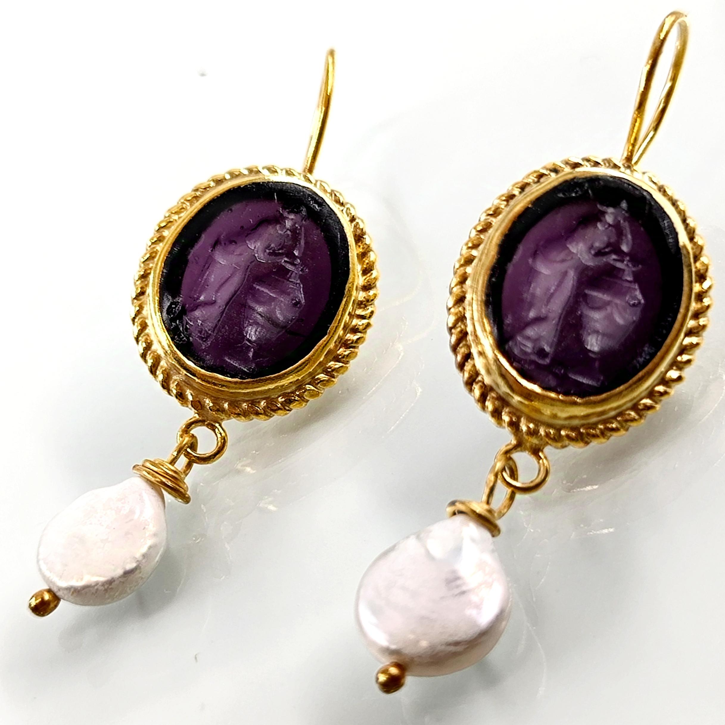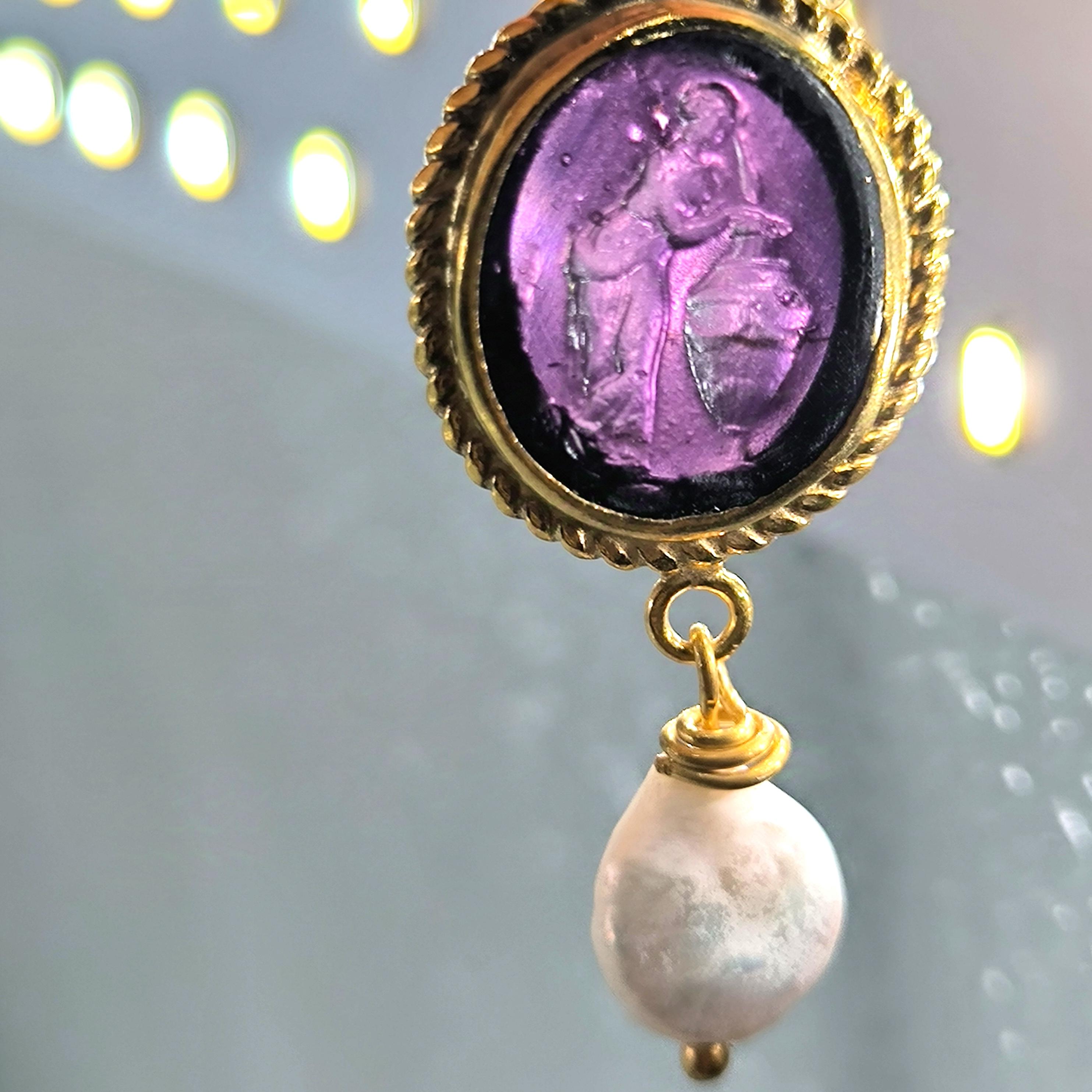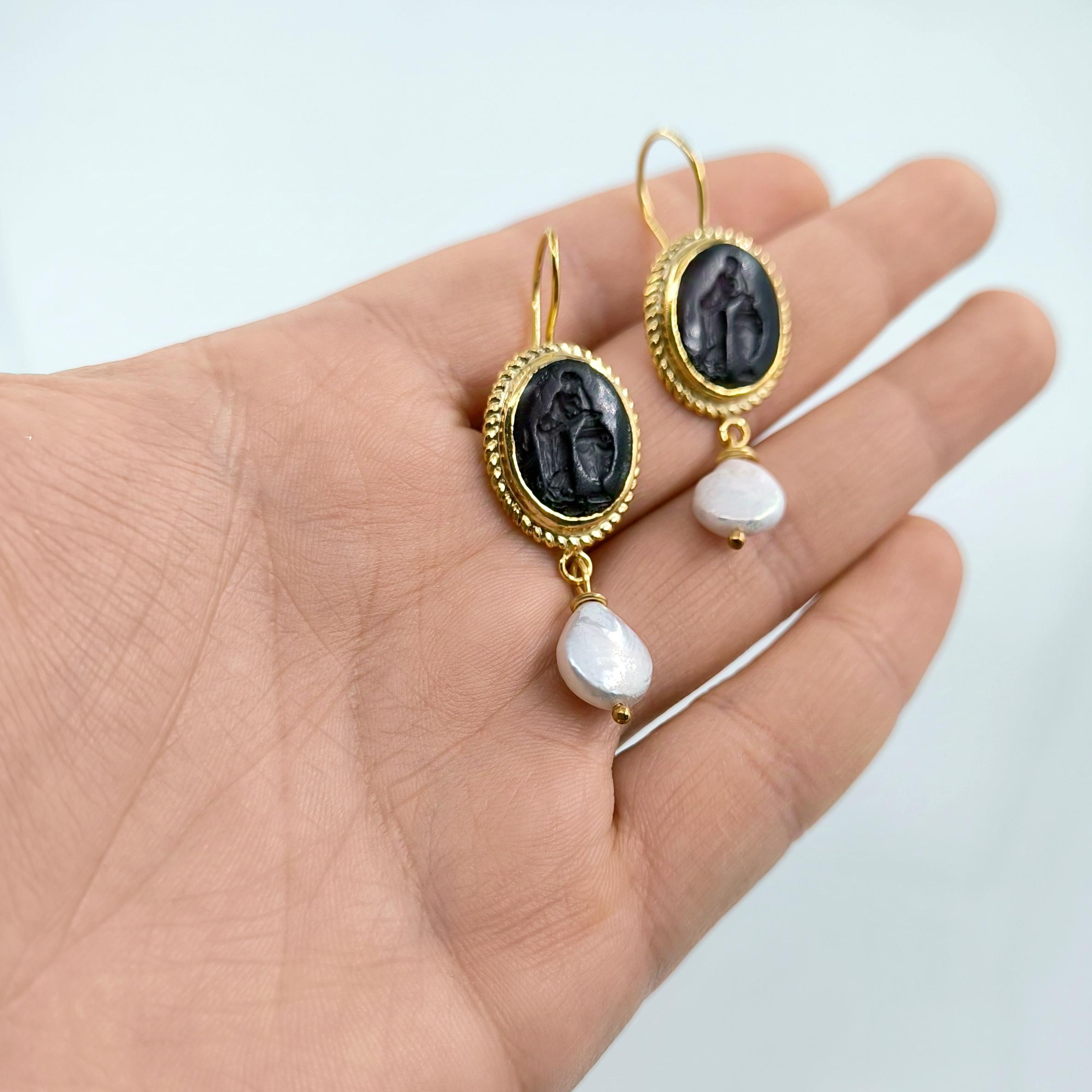 Cam üzeri pres tekniği ile çalışılmış Roma sahneli intaglio taşlı, tamamı gümüşten natürel inci ile süslediğimiz antik stilde medusa tasarımı küpemiz!