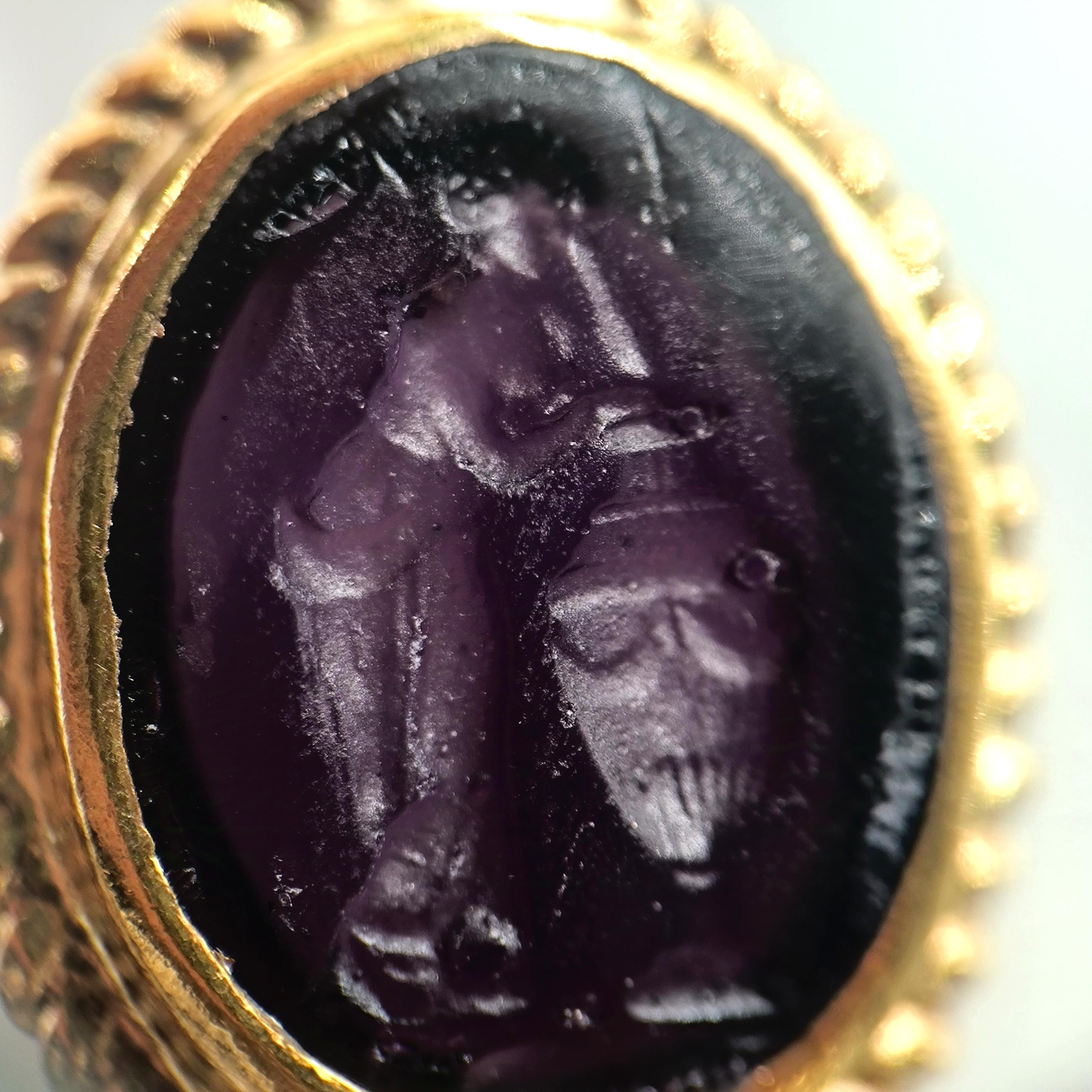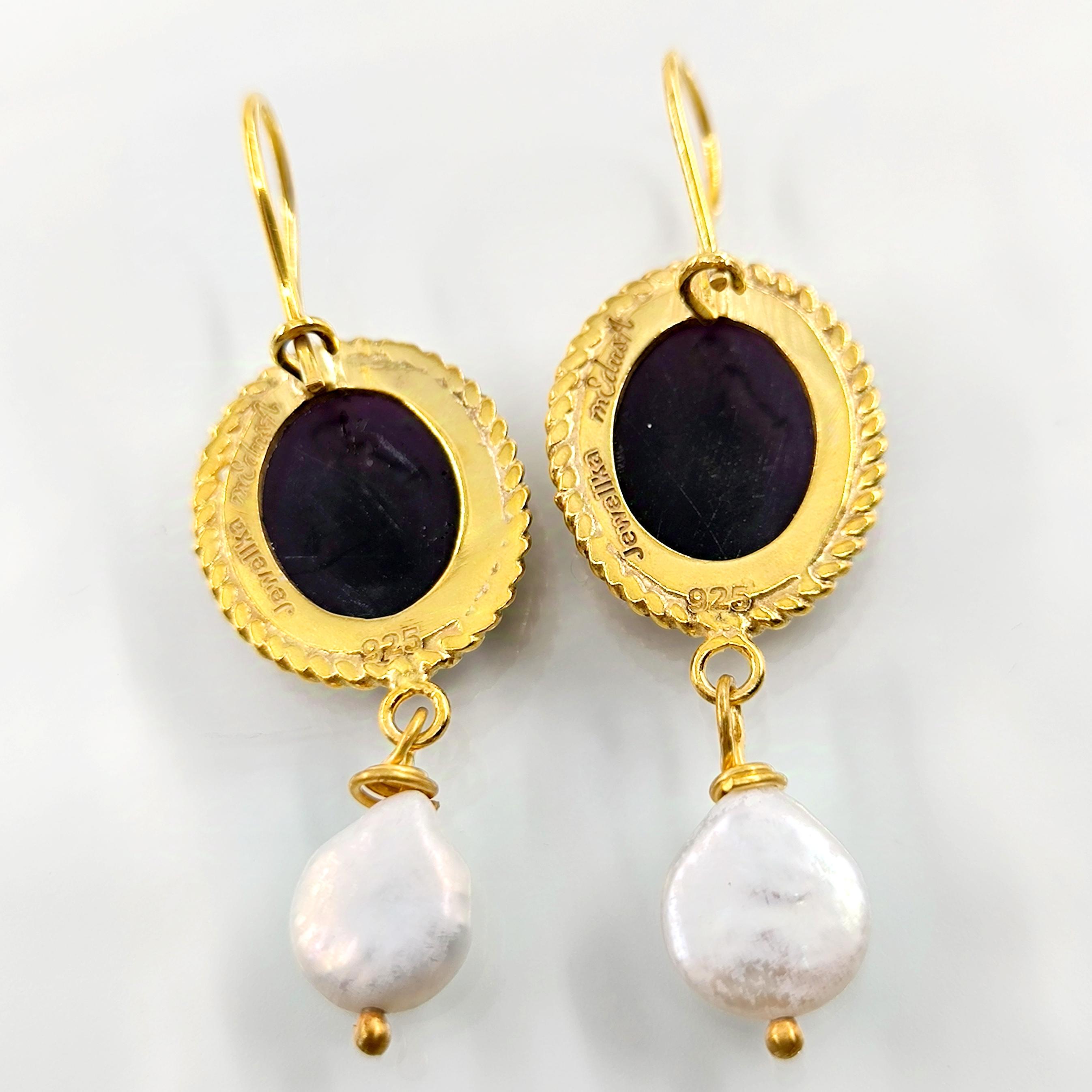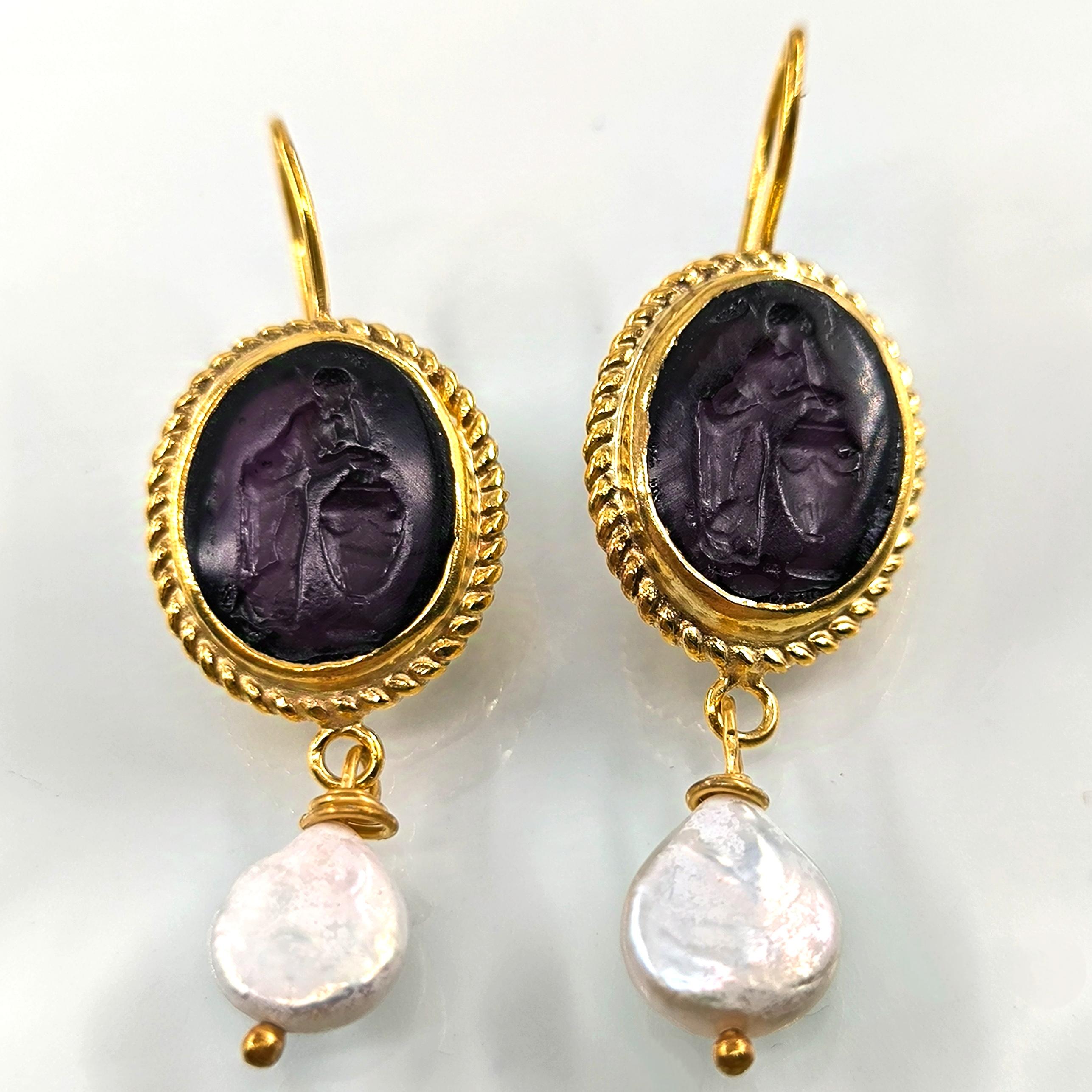 Cam üzeri pres tekniği ile çalışılmış Roma sahneli intaglio taşlı, tamamı gümüşten natürel inci ile süslediğimiz antik stilde medusa tasarımı küpemiz!
