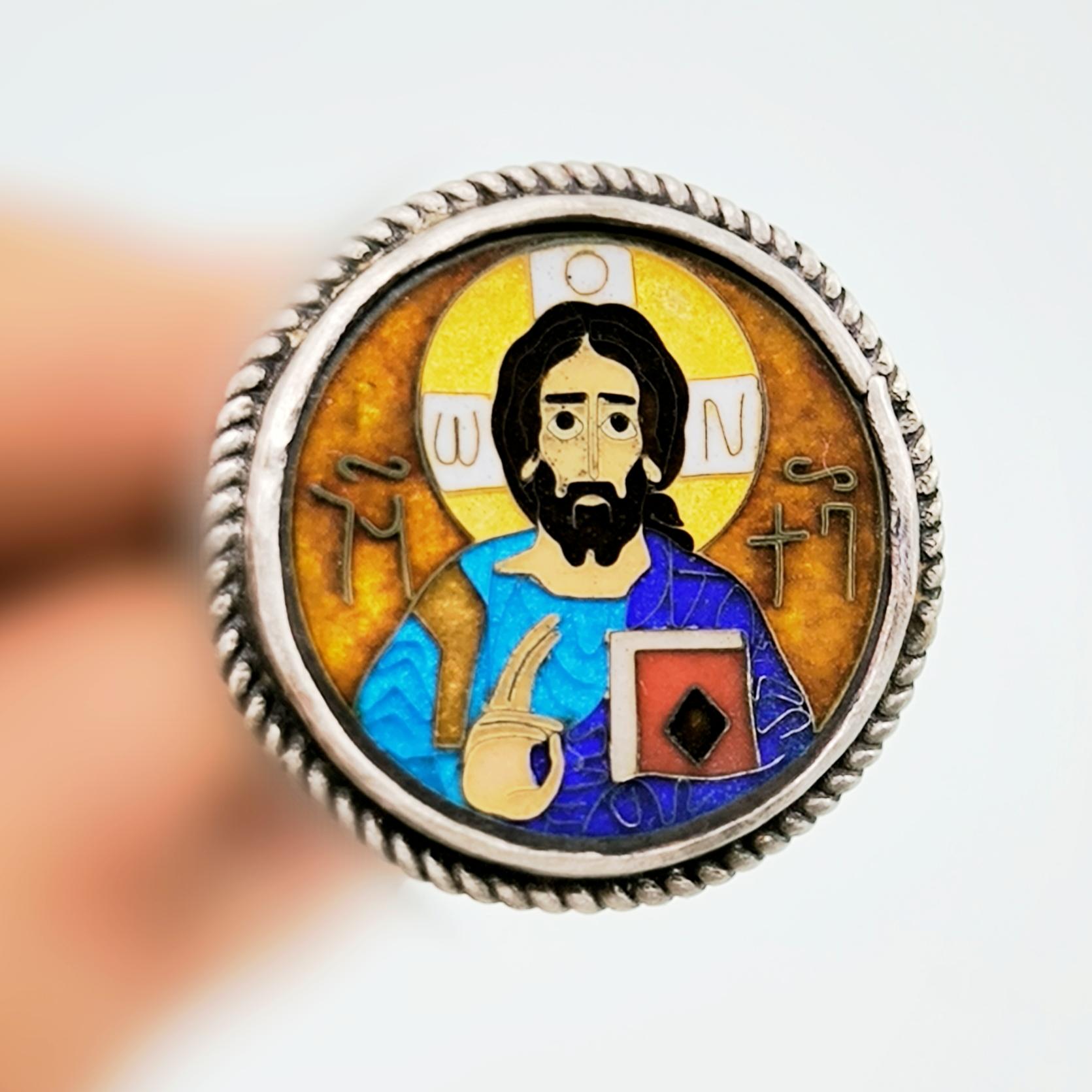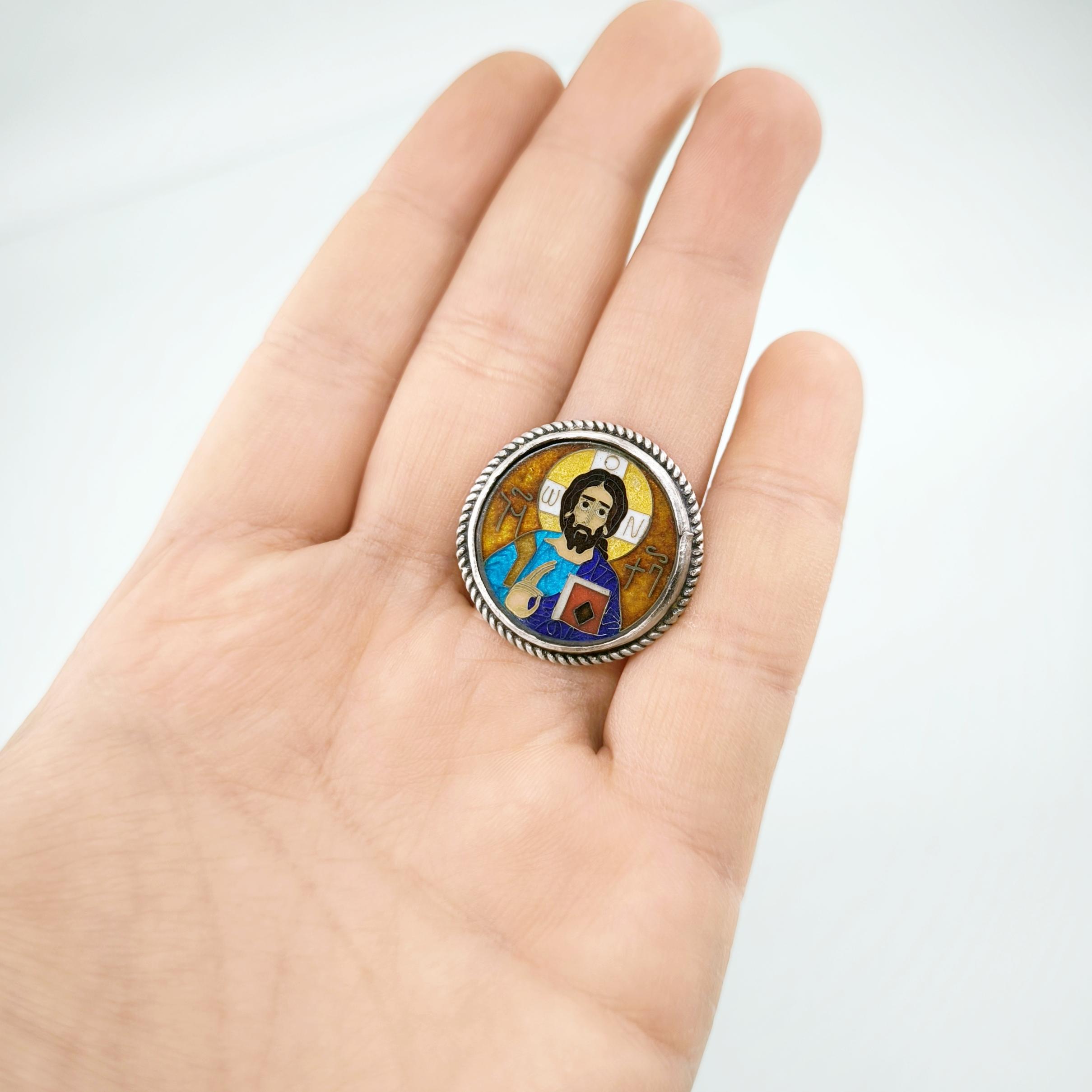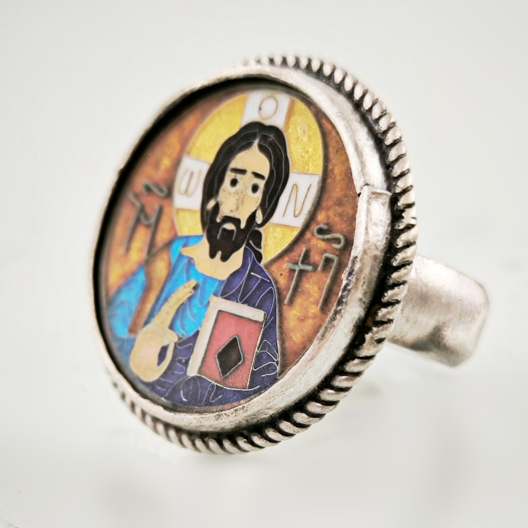 Bu özel tasarım yüzük, cam minesi sanatıyla işlenmiş İsa figürünü üzerinde taşır. Bizans ikonografisini yansıtan renkler ve detaylarla bezenmiş yüzey, sanat ve inancın birleşimini göz alıcı bir şekilde sunar. Çevresindeki gümüş çerçeve, eserin ruhunu tamamlayan antik bir görünüm kazandırır. Koleksiyonluk bir parça olmasının yanı sıra, manevi anlamı güçlü bir yüzük olarak öne çıkar.