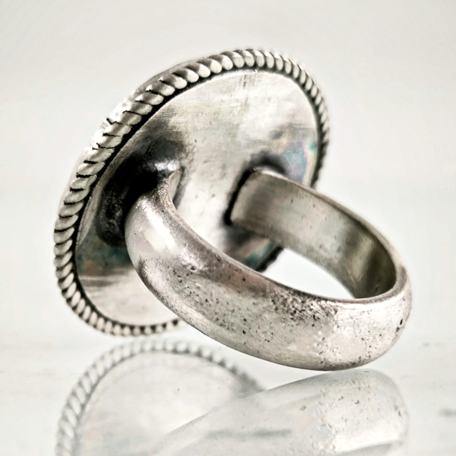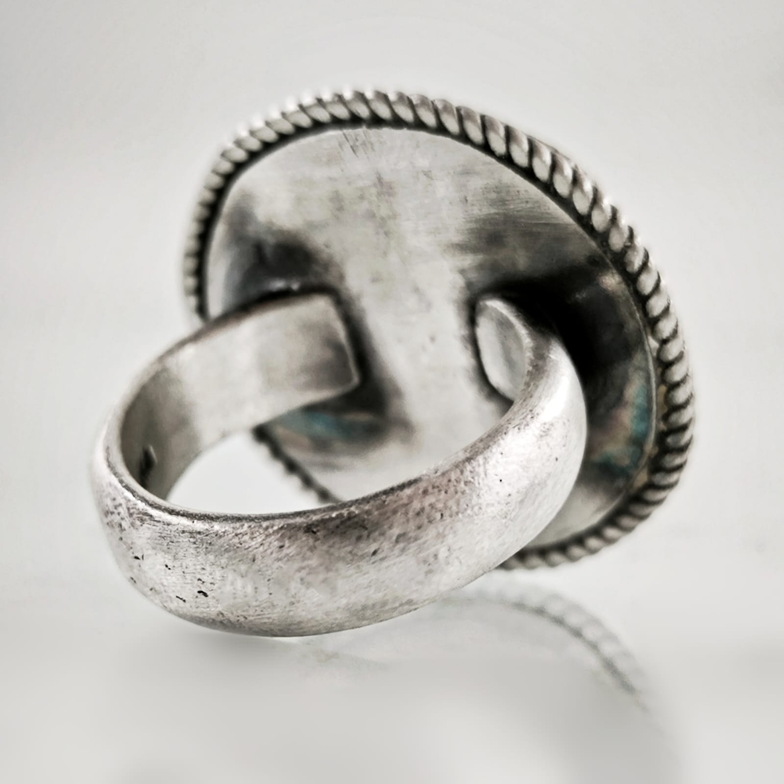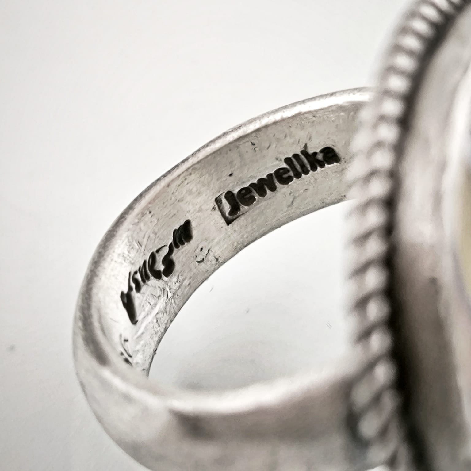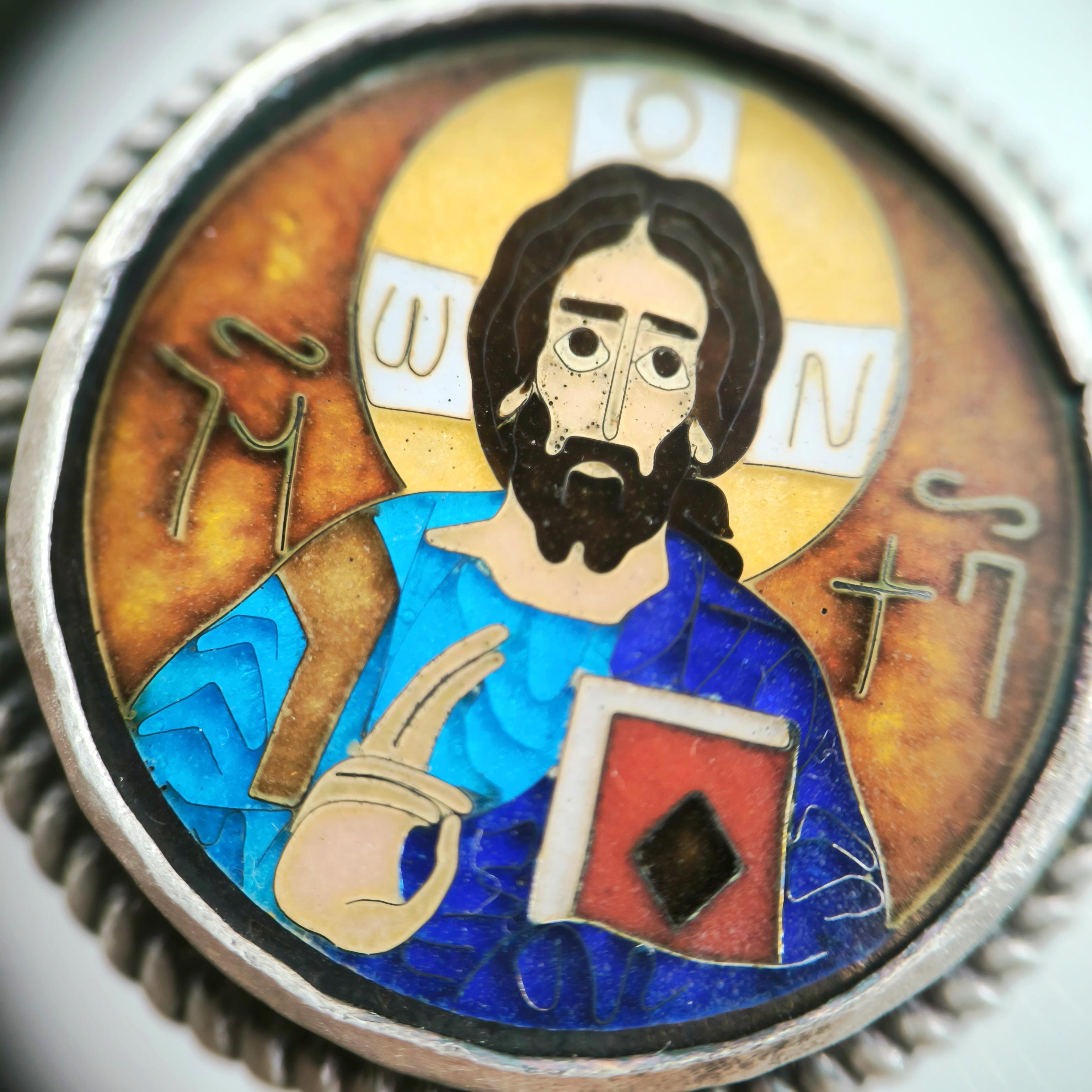 Bu özel tasarım yüzük, cam minesi sanatıyla işlenmiş İsa figürünü üzerinde taşır. Bizans ikonografisini yansıtan renkler ve detaylarla bezenmiş yüzey, sanat ve inancın birleşimini göz alıcı bir şekilde sunar. Çevresindeki gümüş çerçeve, eserin ruhunu tamamlayan antik bir görünüm kazandırır. Koleksiyonluk bir parça olmasının yanı sıra, manevi anlamı güçlü bir yüzük olarak öne çıkar.
