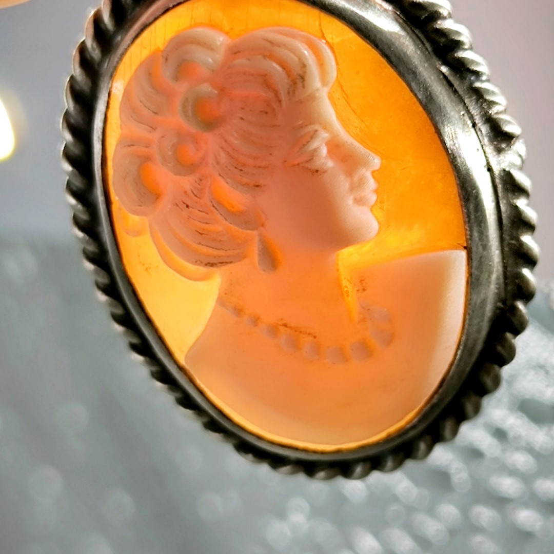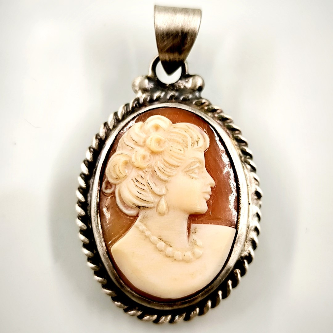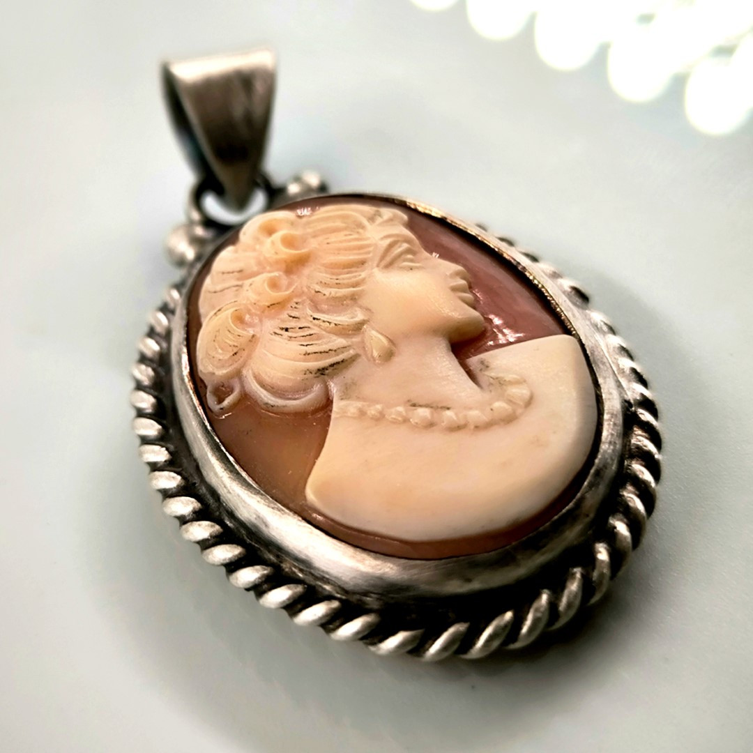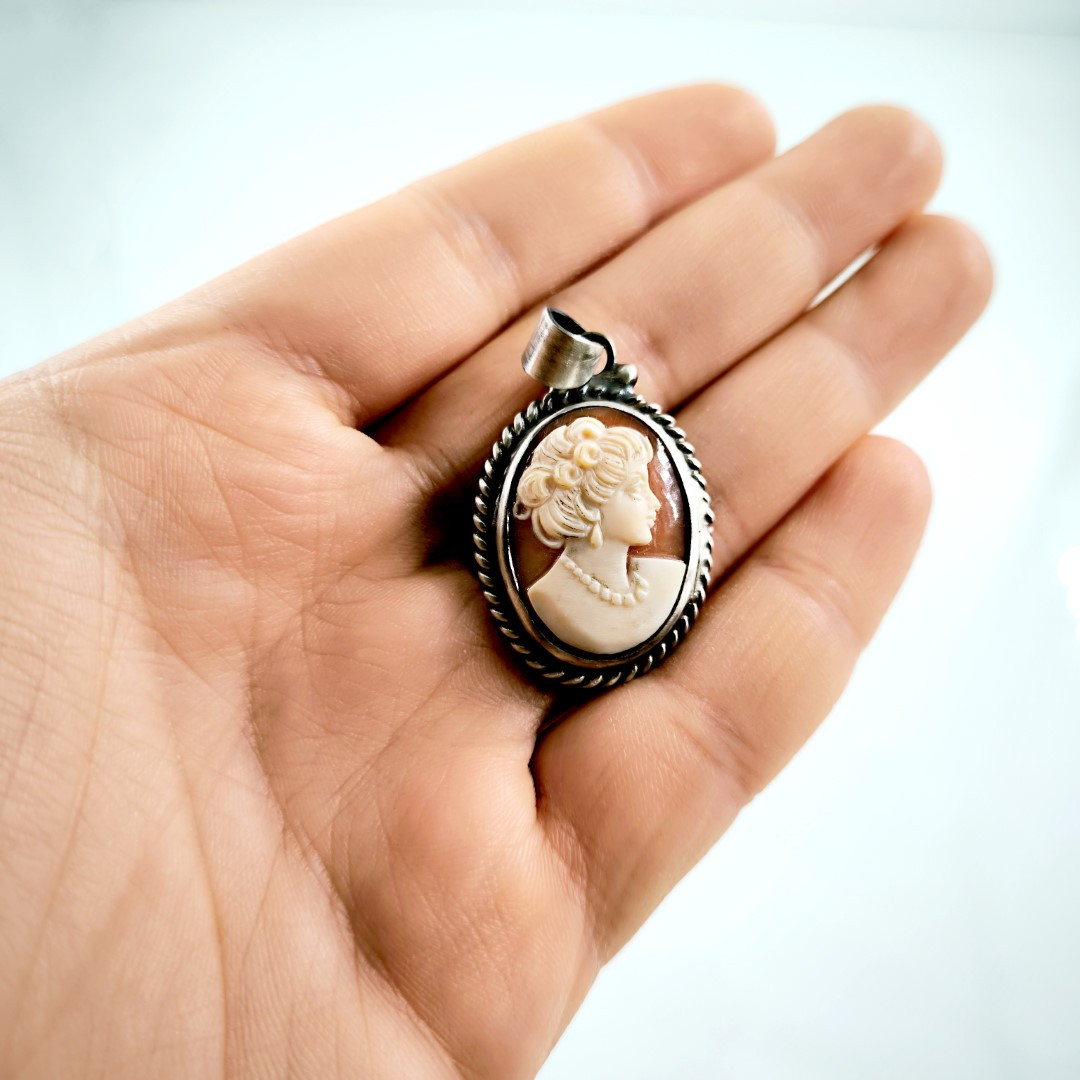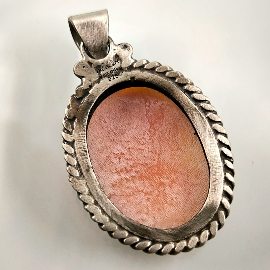 Eşsiz bir Antika Cameo mücevher ! Deniz kabuğu Üzerine "LEYDİ" rölyefi çalışılmış Avrupa yapımı Çerçevesi kendi tasarımımız olan Gümüş eskitme cameo kolyemiz! ( 4.2x2.5cm 8.2 Gr.)