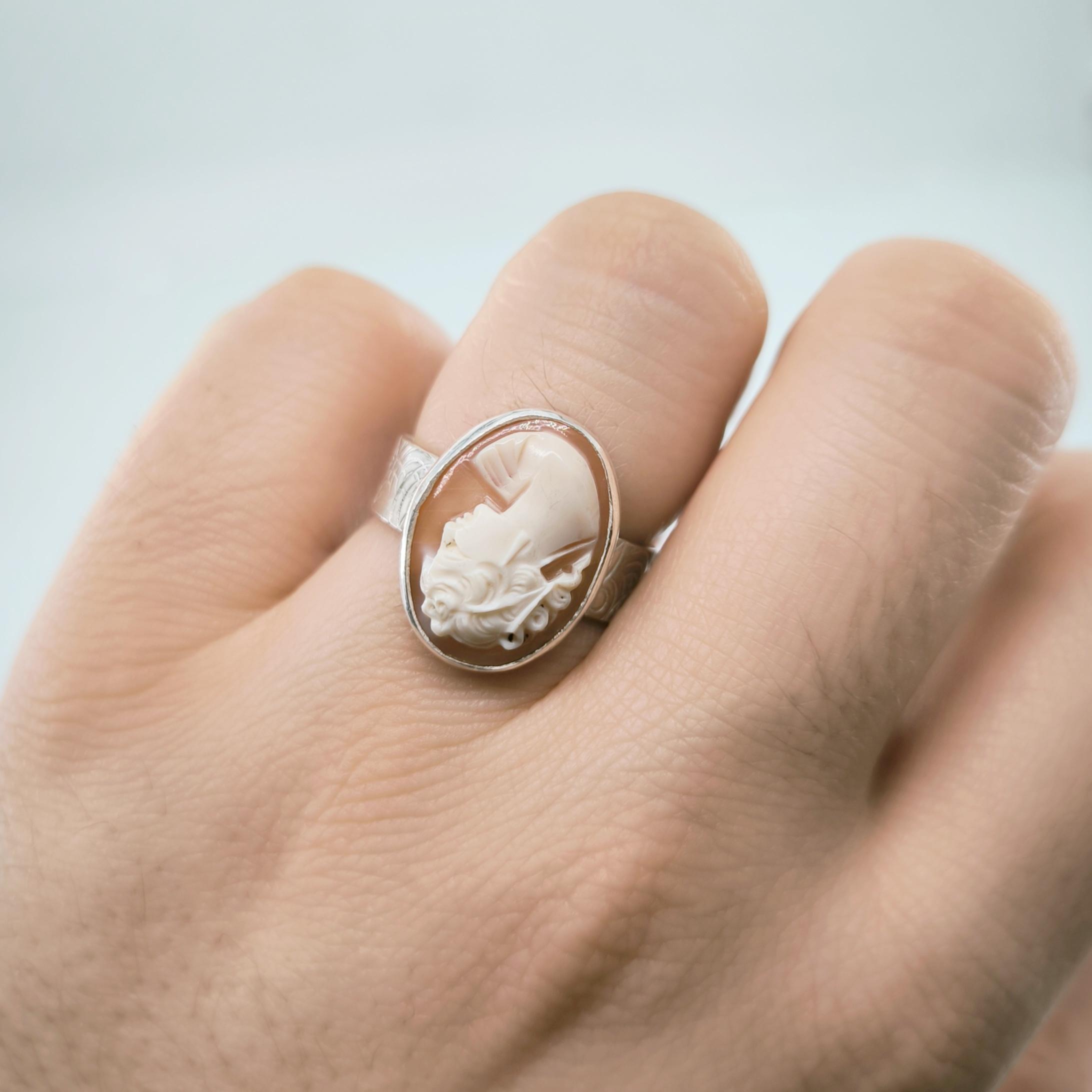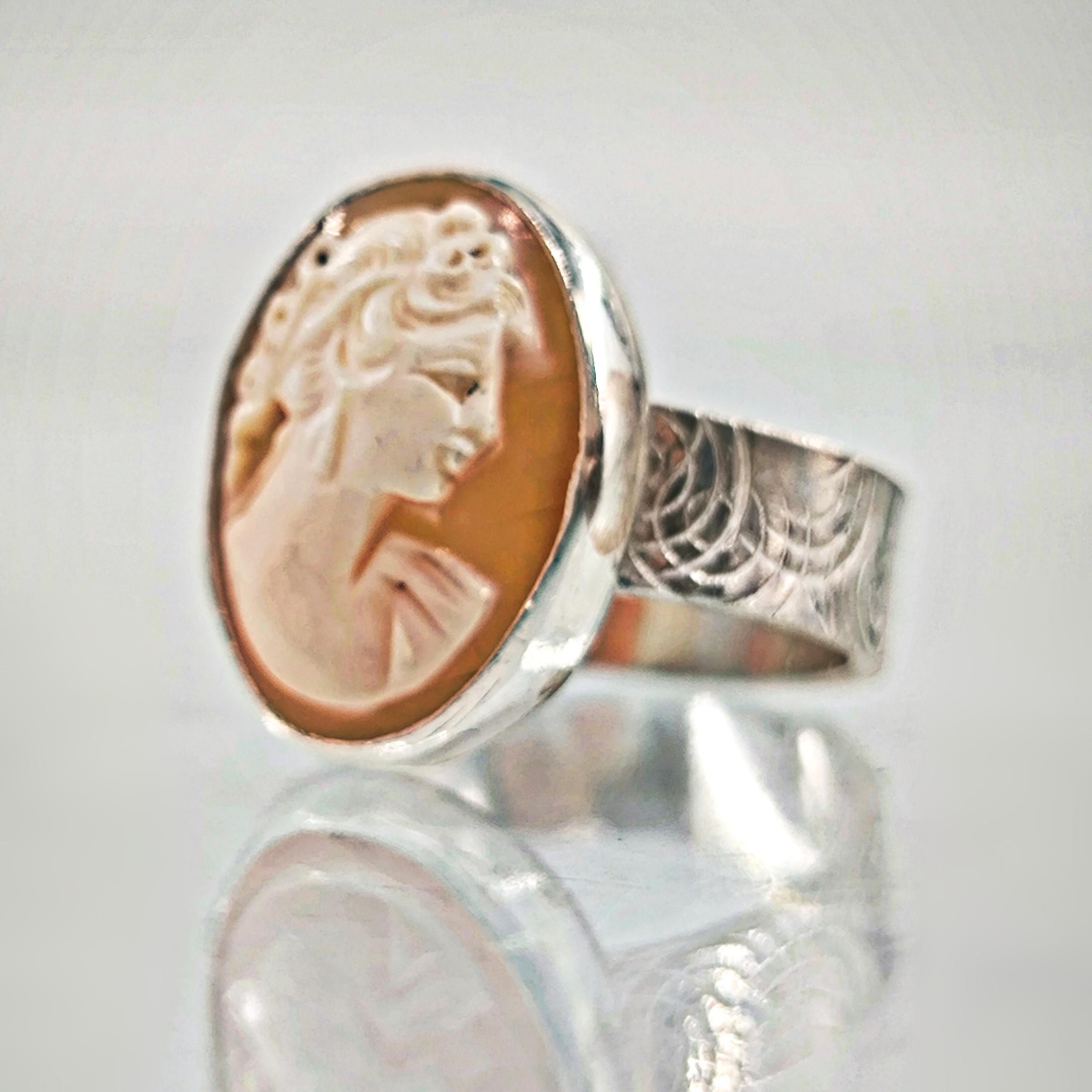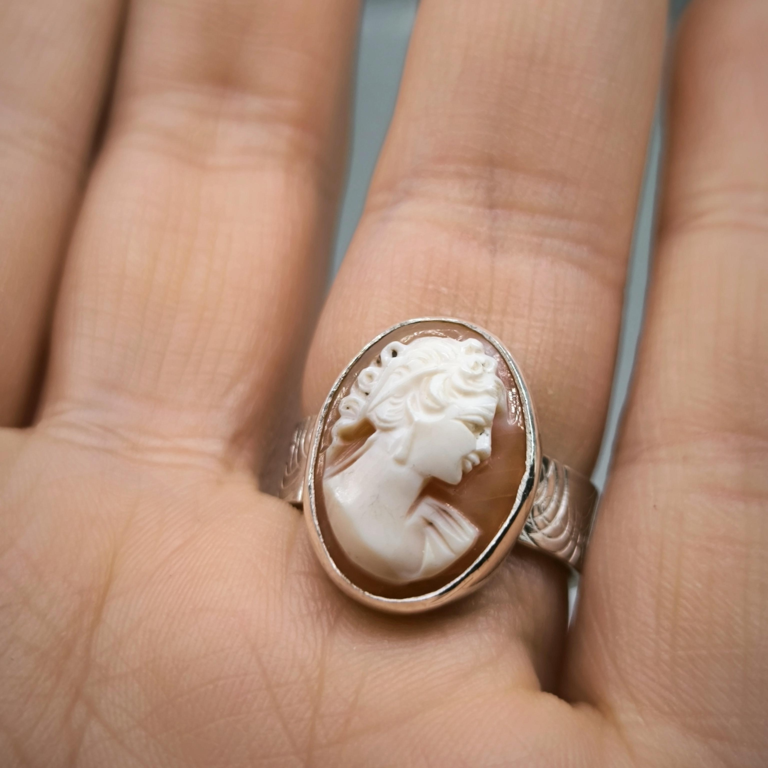 Bir ''mEdusA'' eseridir. Natürel Shell deniz kabuğu üzeri (casssisrufa) oyma ''Leydi'' tasviri çalışılmış 925 Ayar Gümüş antik stilde yüzüğümüz!
