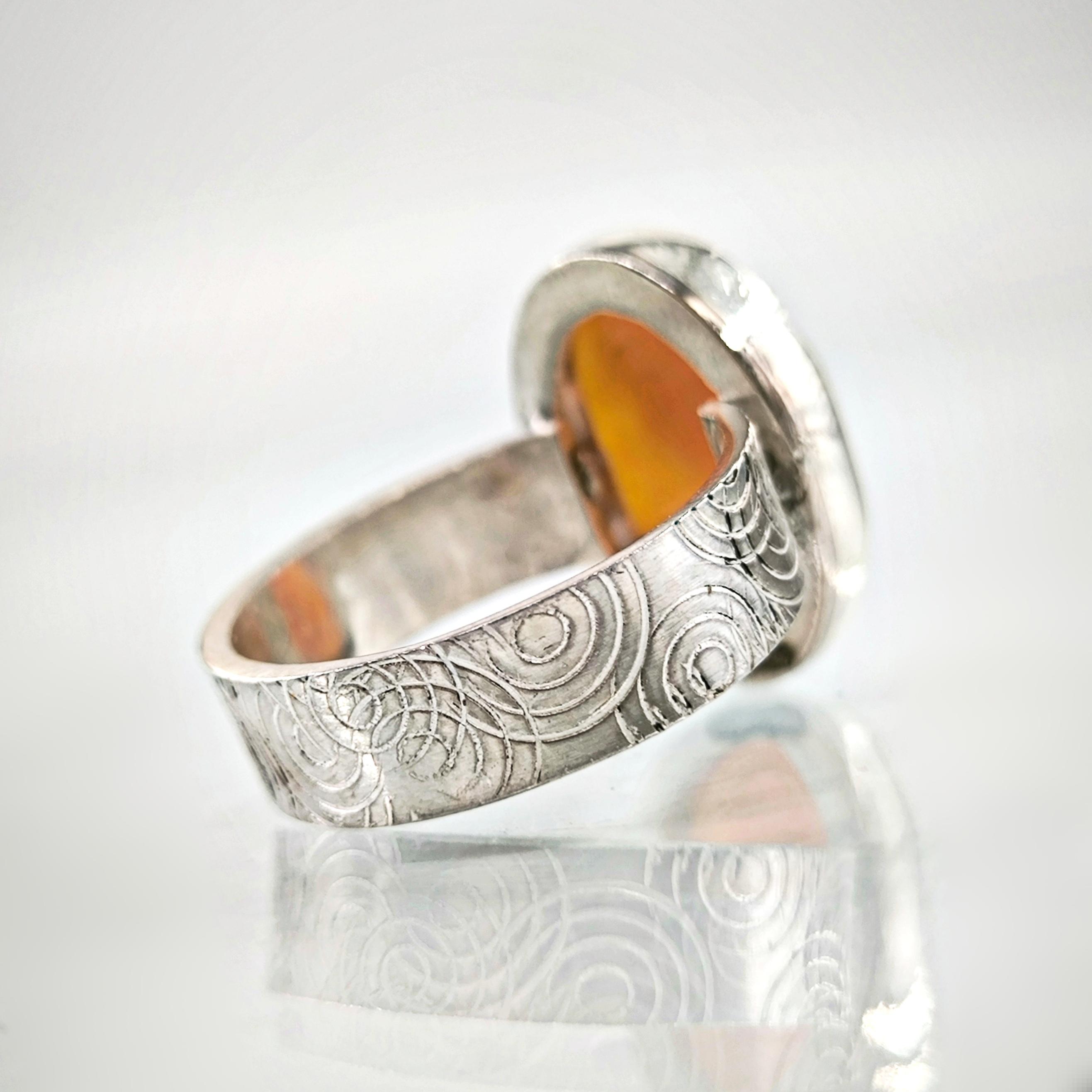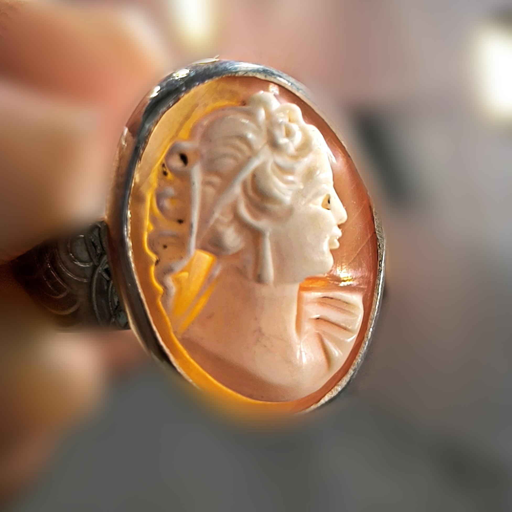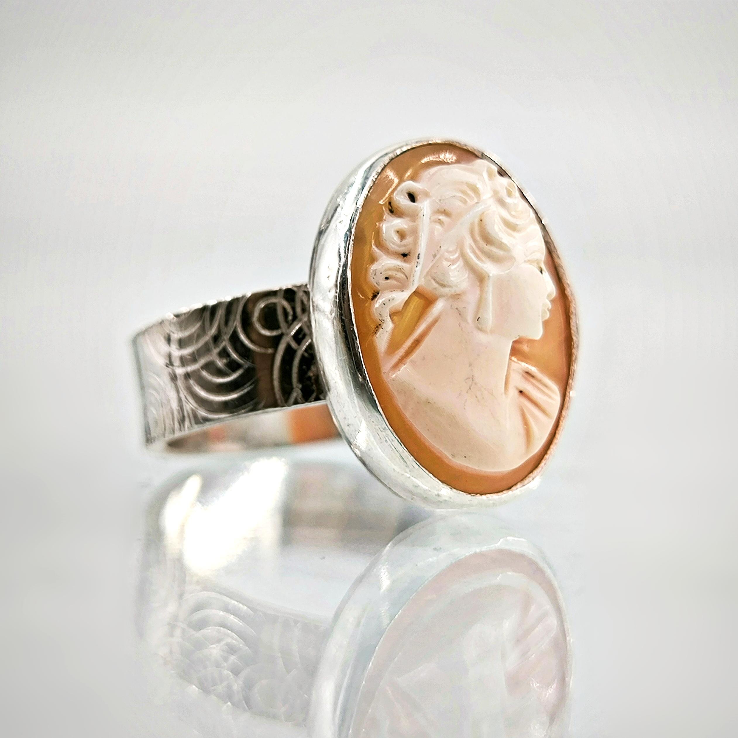 Bir ''mEdusA'' eseridir. Natürel Shell deniz kabuğu üzeri (casssisrufa) oyma ''Leydi'' tasviri çalışılmış 925 Ayar Gümüş antik stilde yüzüğümüz!