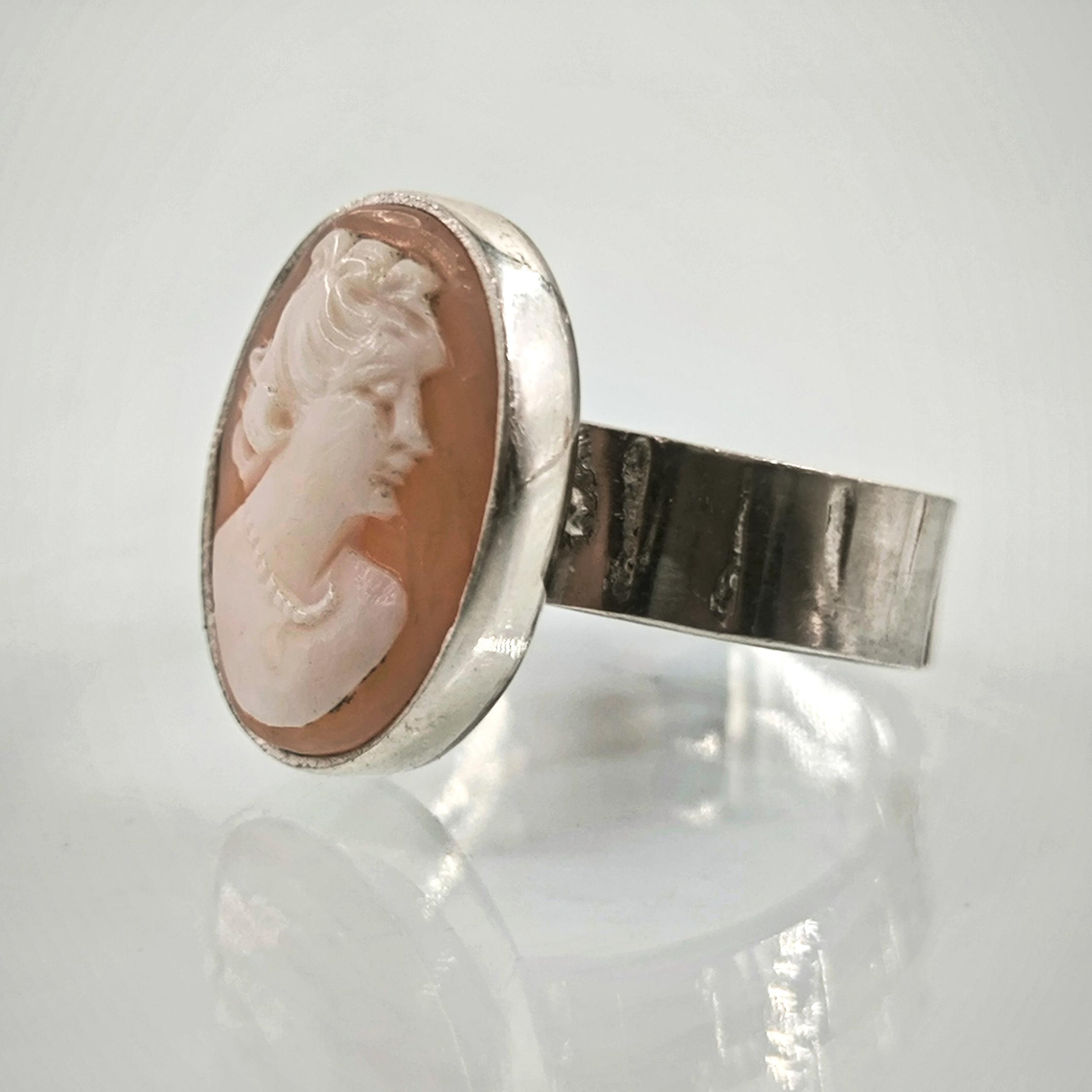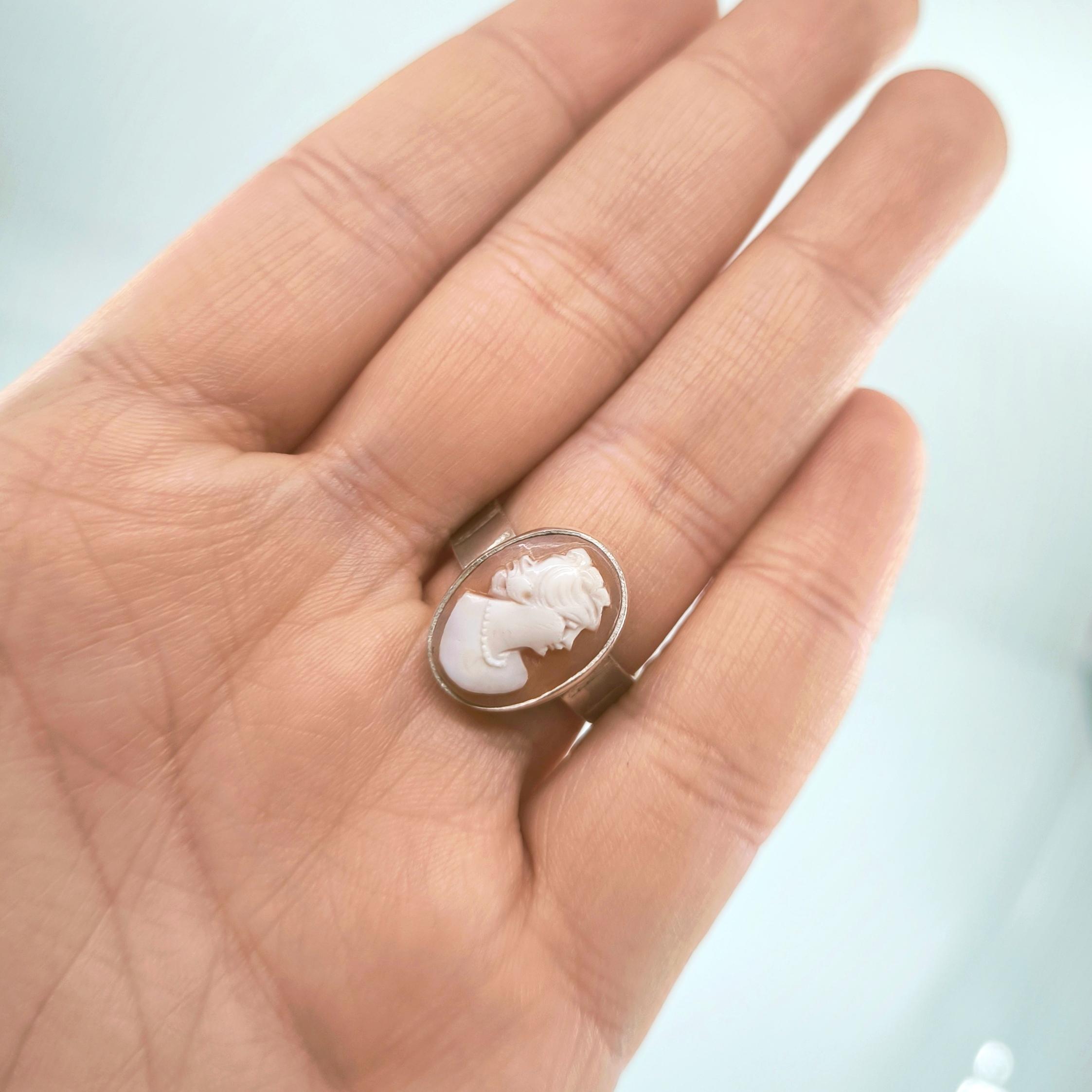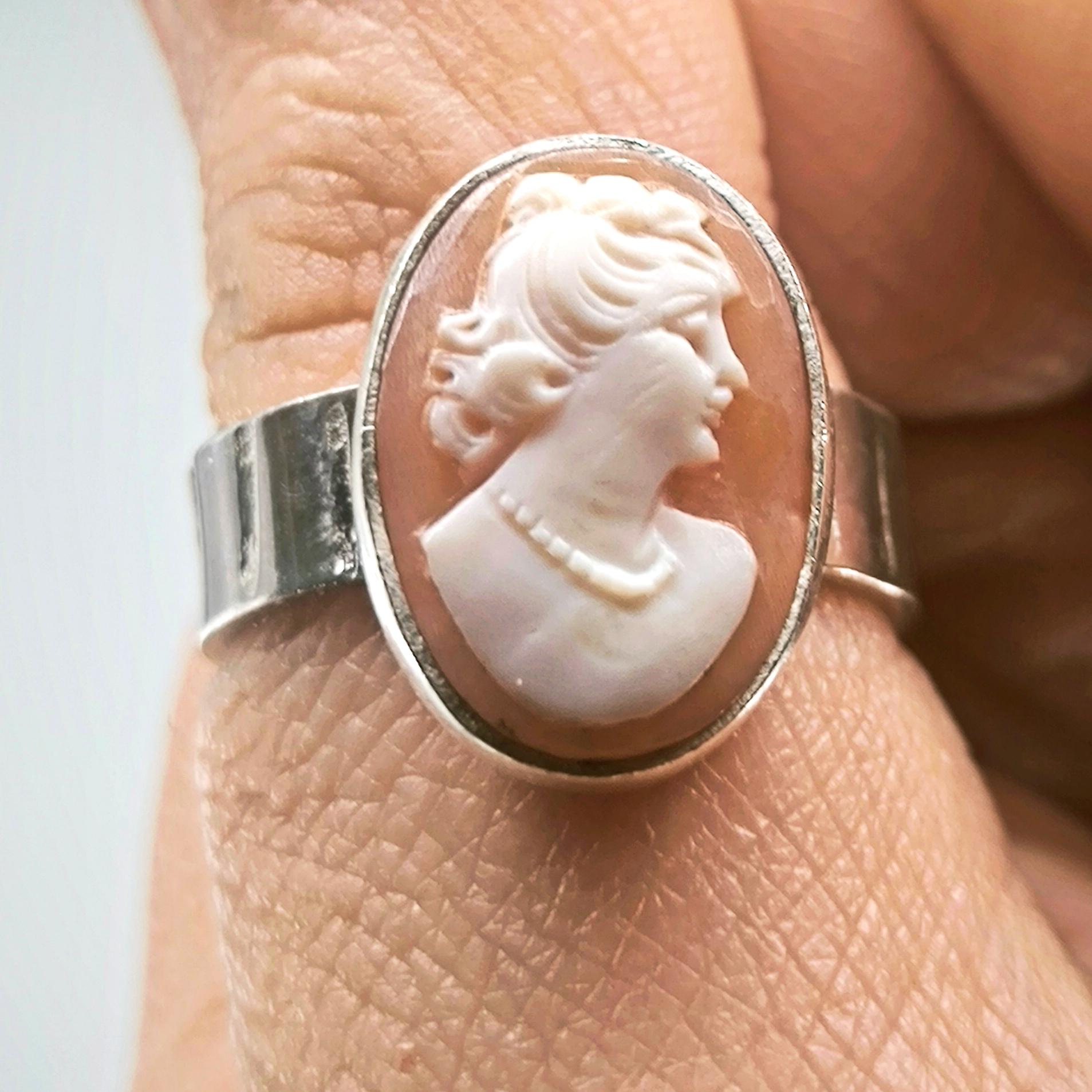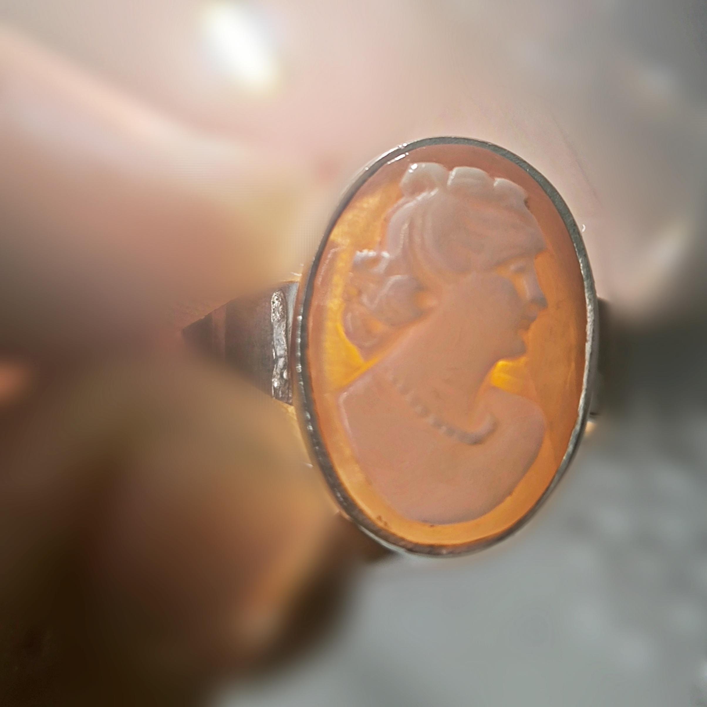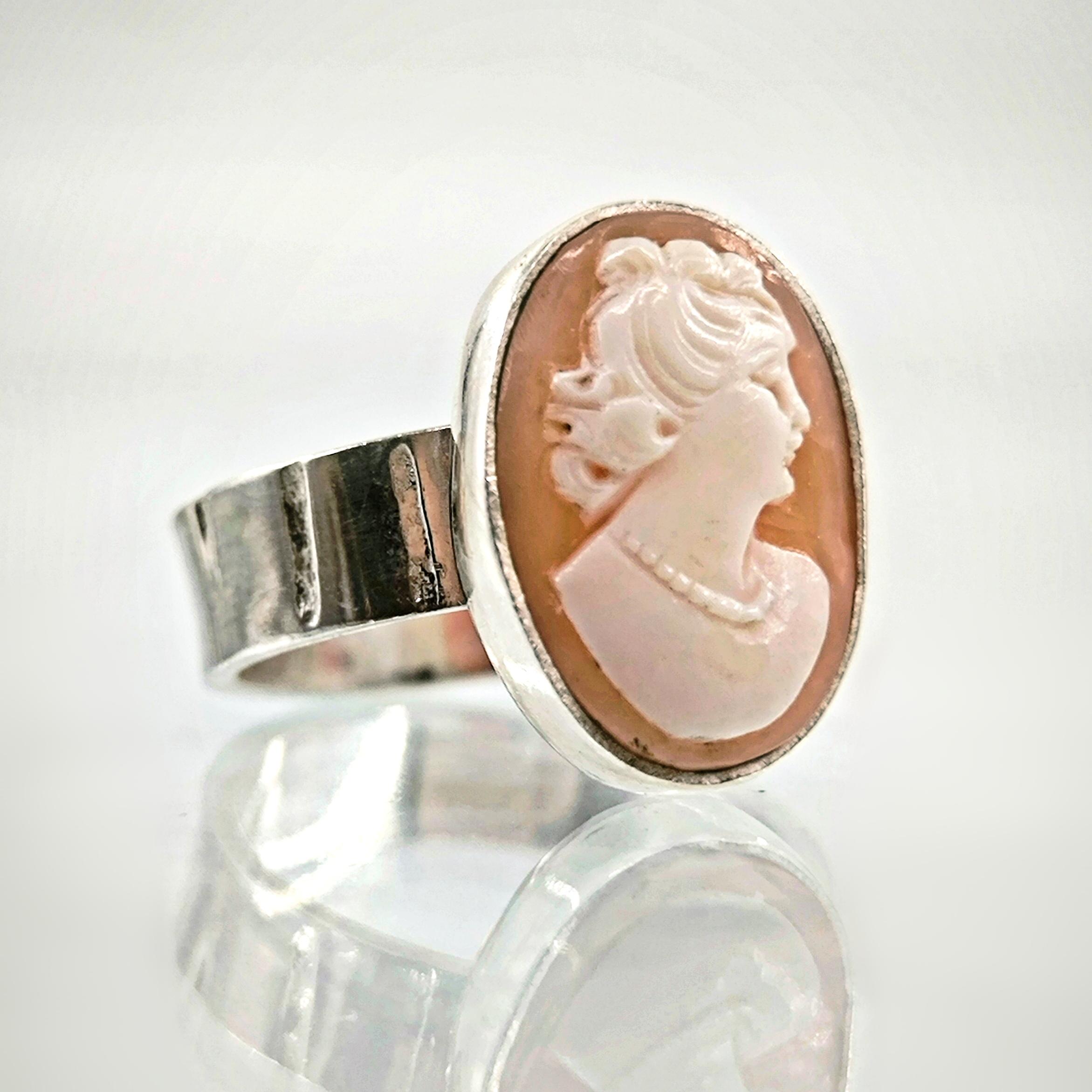 Bir ''mEdusA'' eseridir. Natürel Shell deniz kabuğu üzeri (casssisrufa) oyma ''Leydi'' tasviri çalışılmış 925 Ayar Gümüş antik stilde yüzüğümüz!
