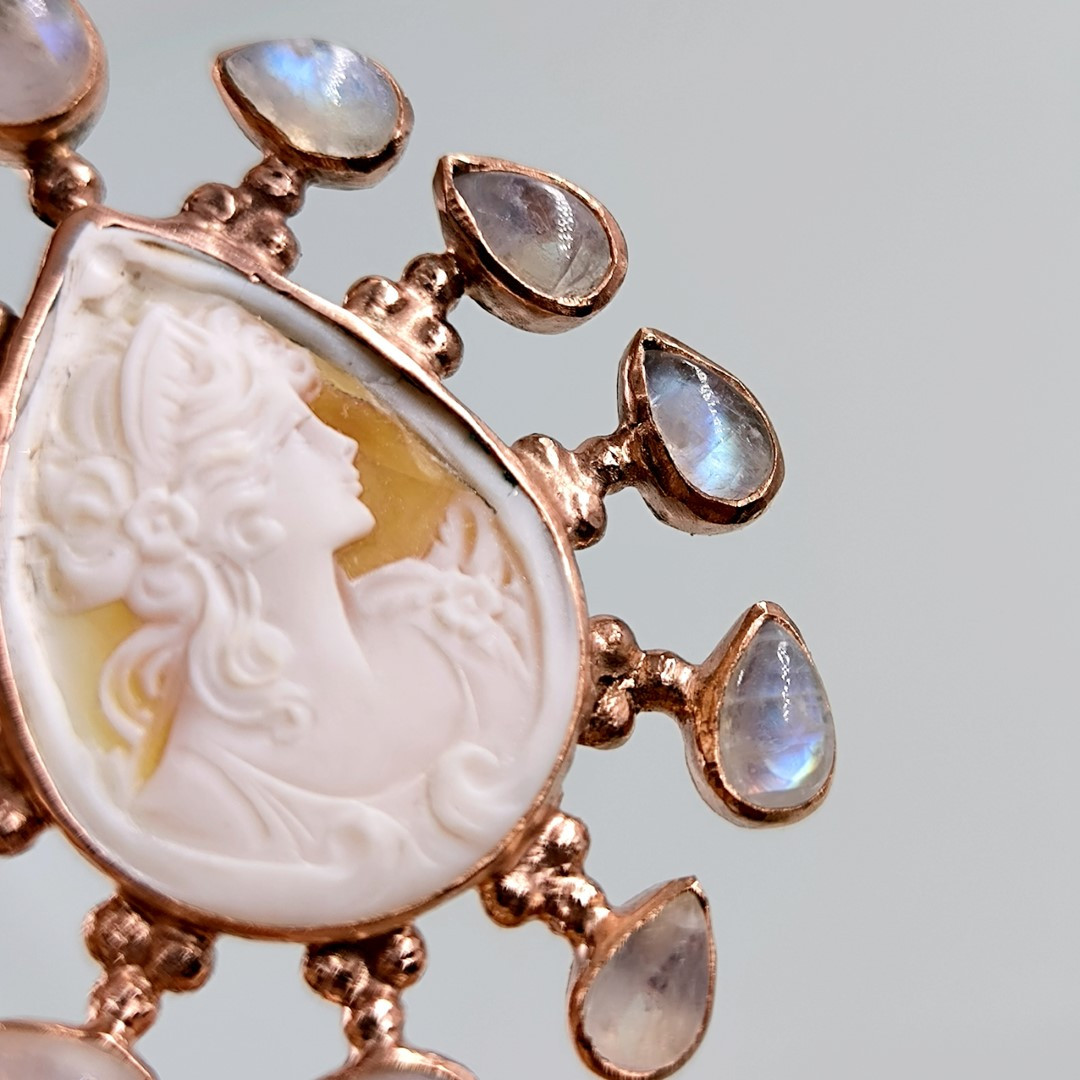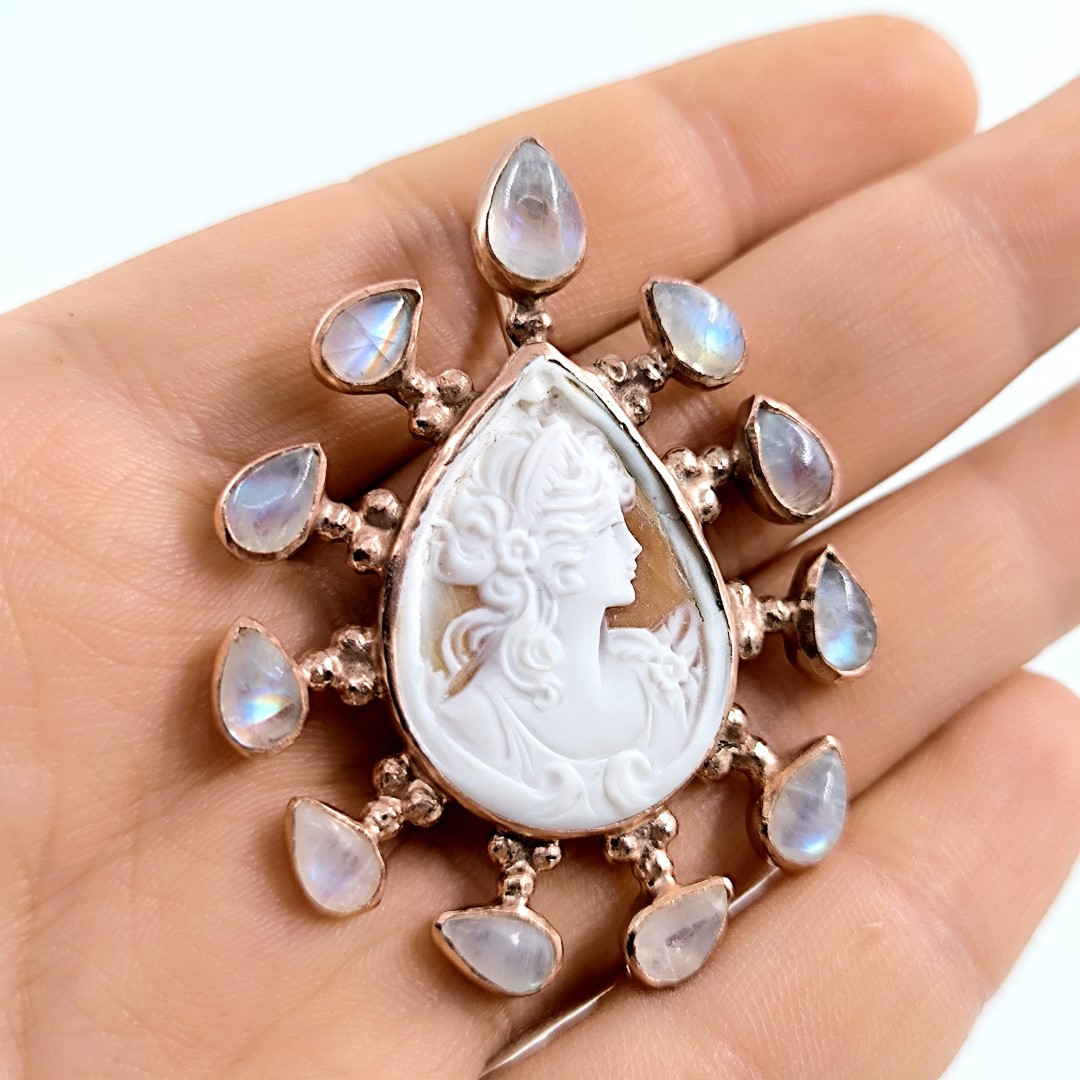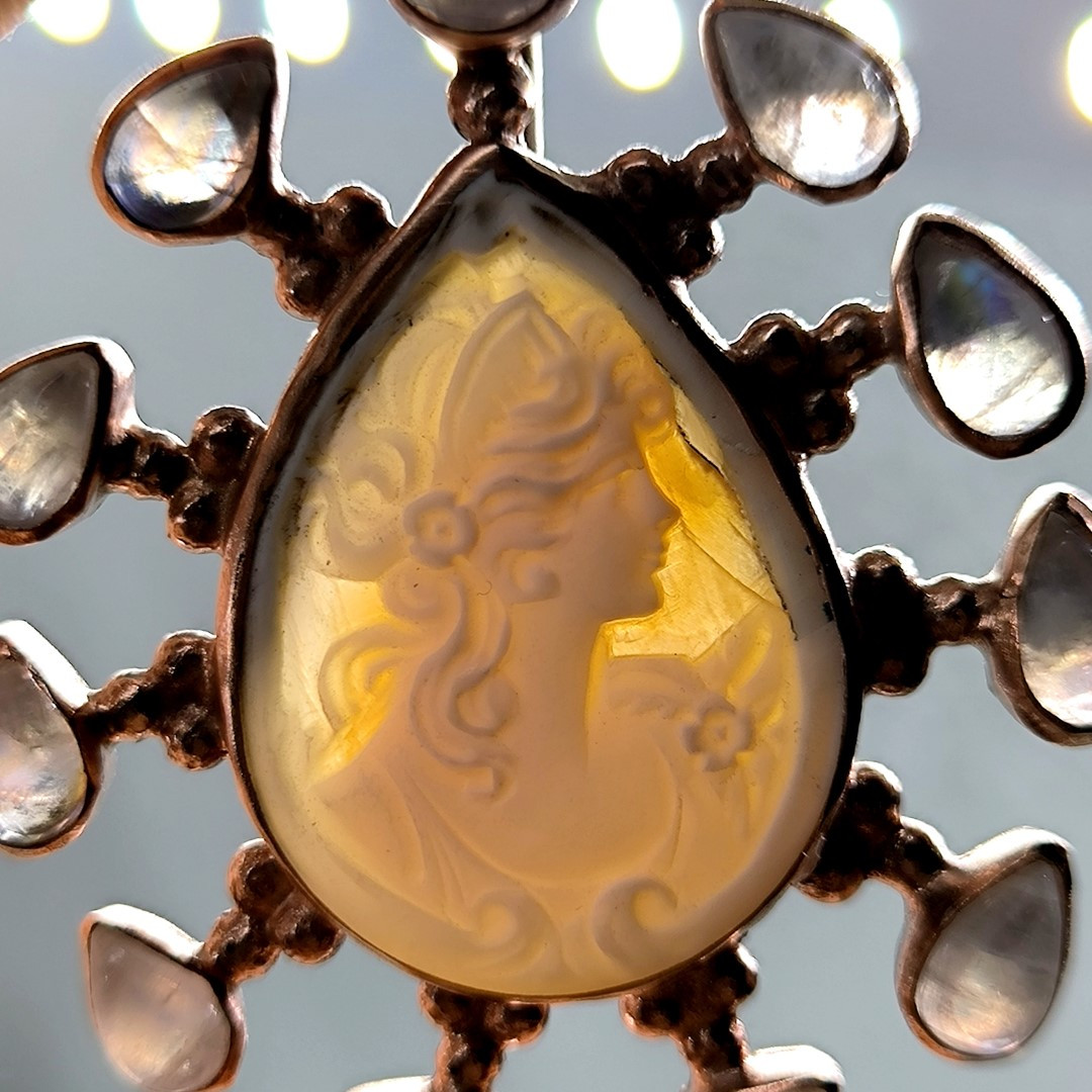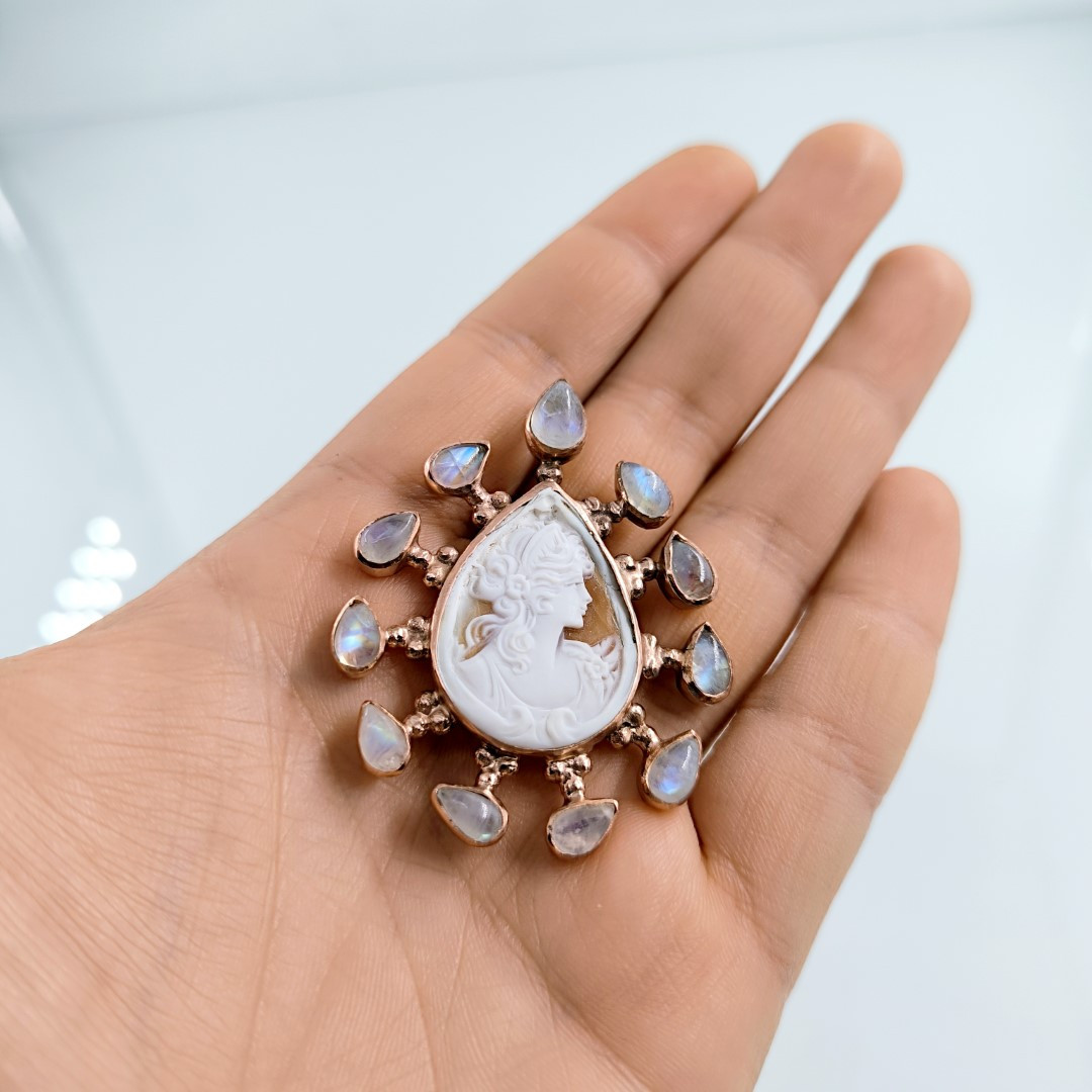 Muhteşem bir mücevher ile yine sizlerleyiz! Eşsiz bir Cameo mücevher! Deniz kabuğu üzeri el oyma çalışılmış Leydi tasvirli muazzam bir madalyon kolye! Ay taşları ile süslediğimiz, Tam bir viktoryan stilde Cameo kolyemiz!! Çerçevemiz tamamen gümüş olup üzeri Rose kaplamadır.. (5.6x4.5cm & 16.5 gr.)