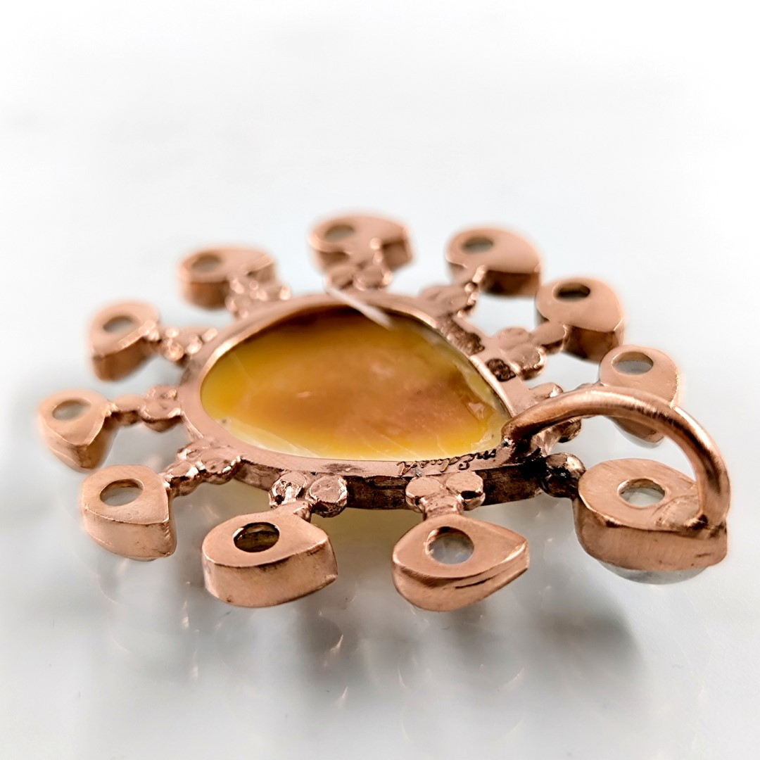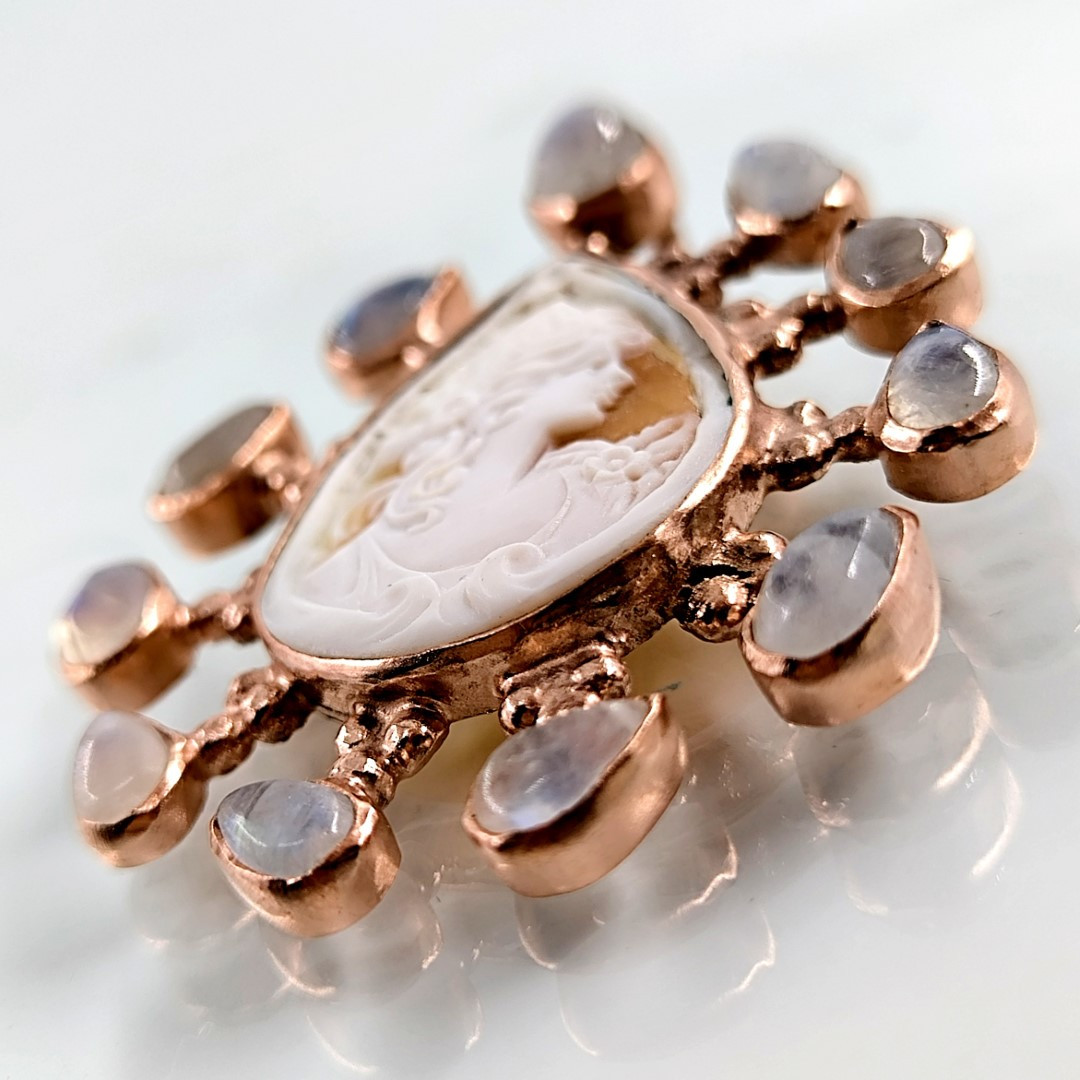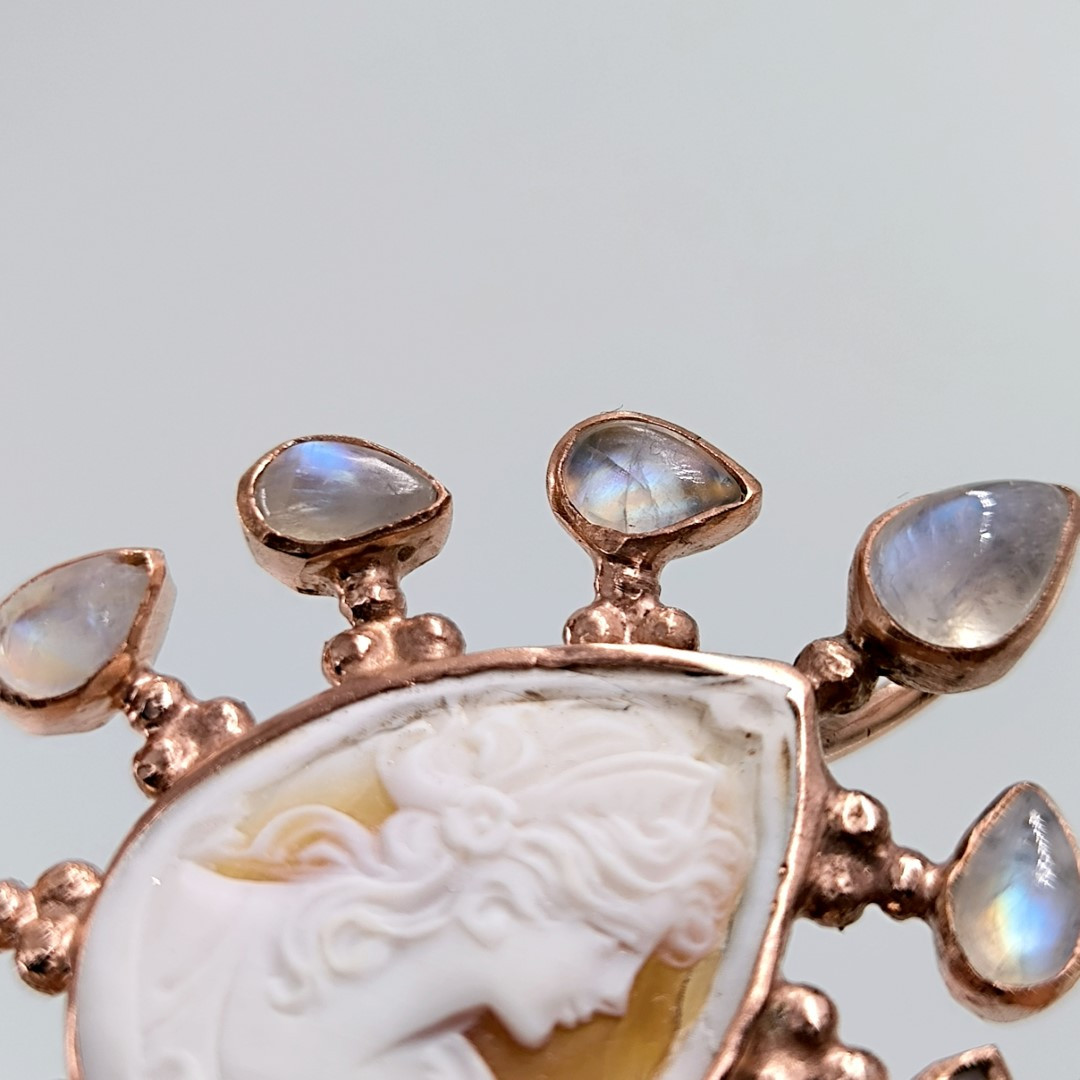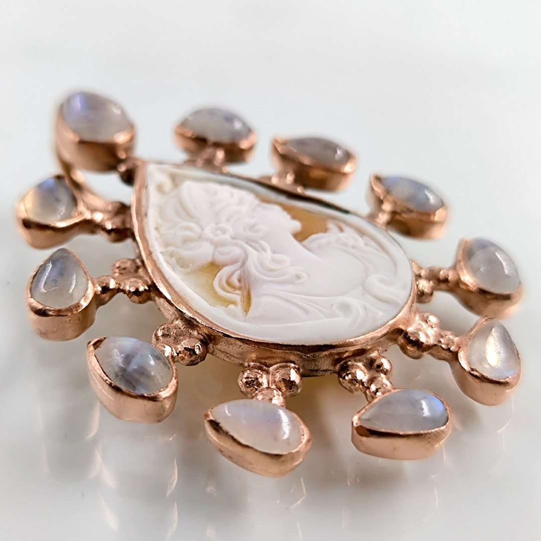Muhteşem bir mücevher ile yine sizlerleyiz! Eşsiz bir Cameo mücevher! Deniz kabuğu üzeri el oyma çalışılmış Leydi tasvirli muazzam bir madalyon kolye! Ay taşları ile süslediğimiz, Tam bir viktoryan stilde Cameo kolyemiz!! Çerçevemiz tamamen gümüş olup üzeri Rose kaplamadır.. (5.6x4.5cm & 16.5 gr.)