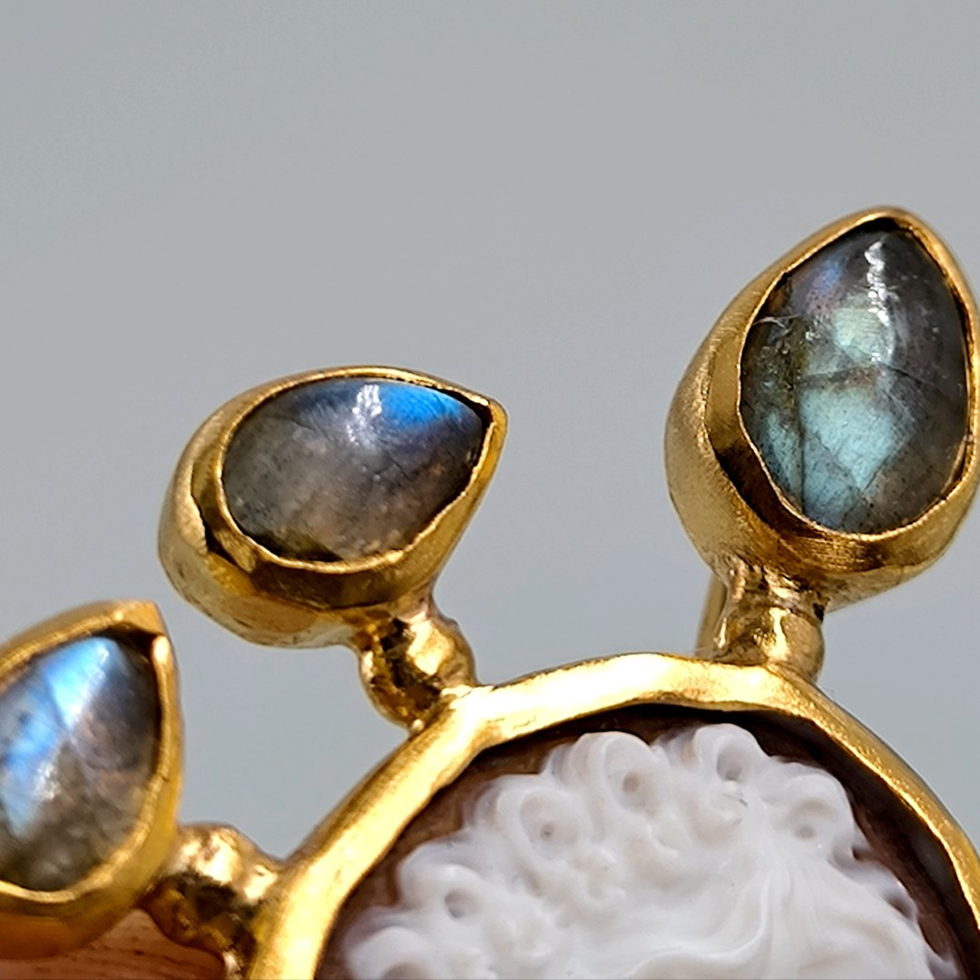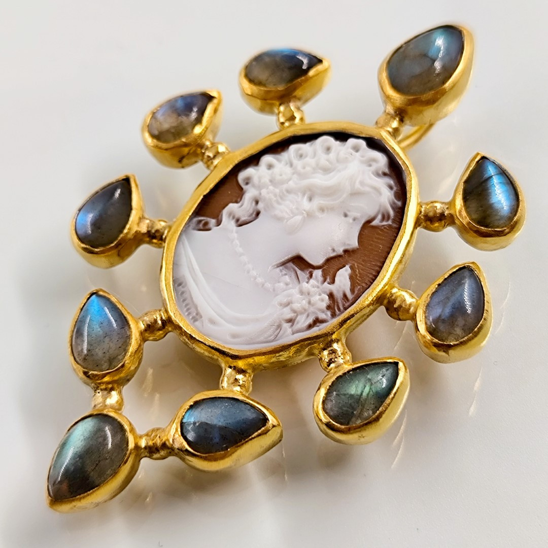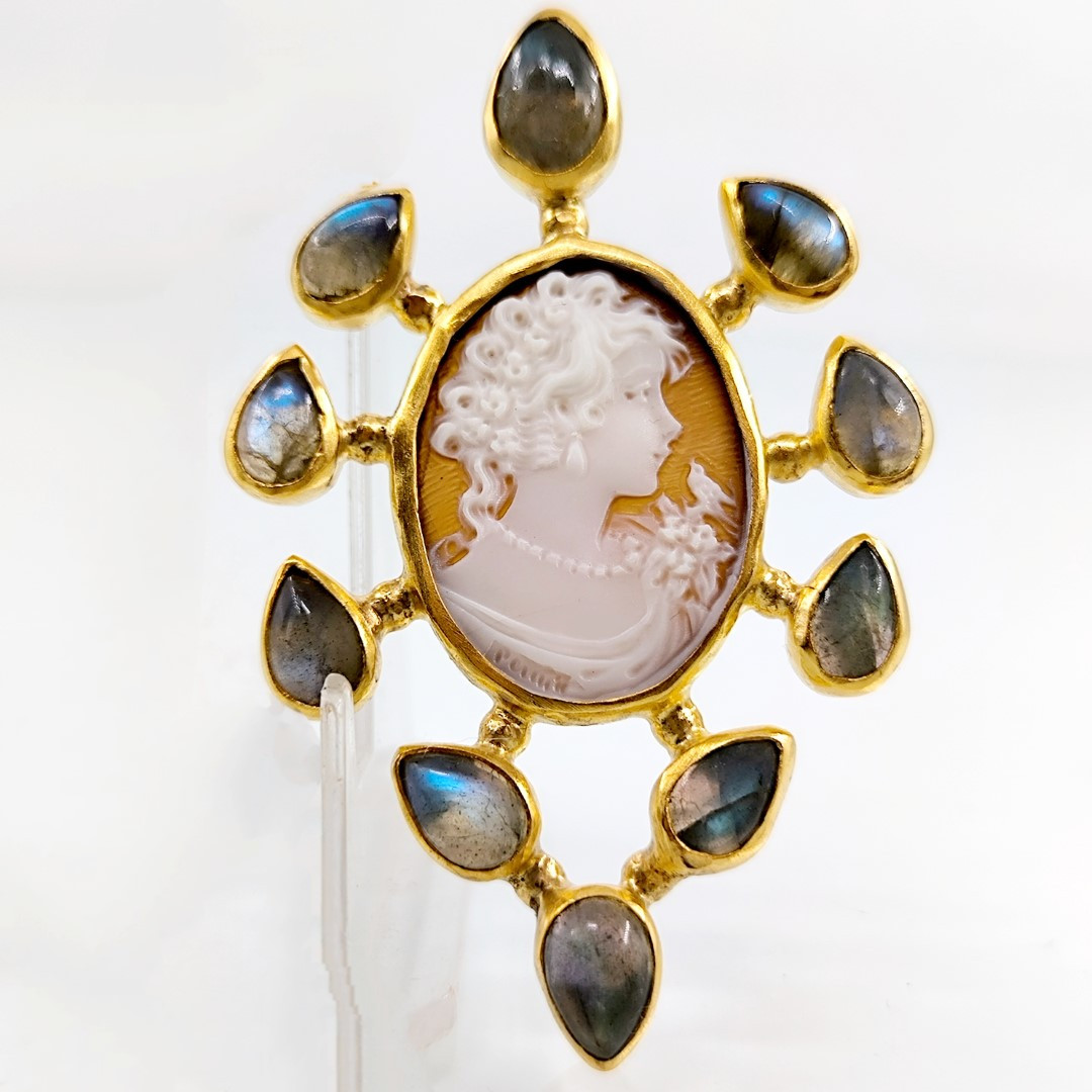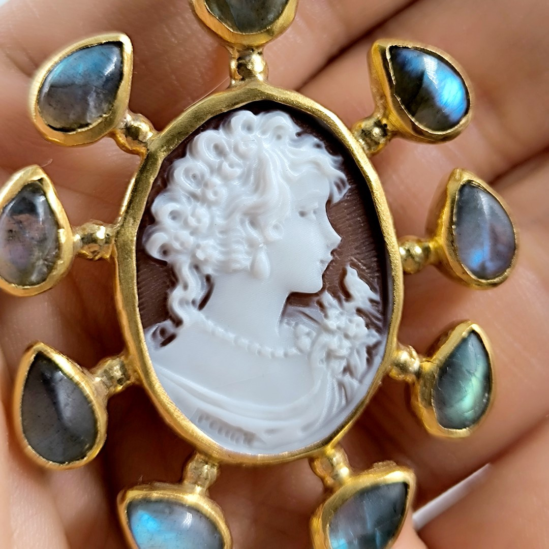 Muhteşem bir mücevher ile yine sizlerleyiz! Eşsiz bir Cameo mücevher! Deniz kabuğu üzeri el oyma çalışılmış Leydi tasvirli muazzam bir madalyon kolye! Ay taşları ile süslediğimiz, Tam bir viktoryan stilde Cameo kolyemiz!! Çerçevemiz tamamen gümüş olup üzeri Altın kaplamadır..