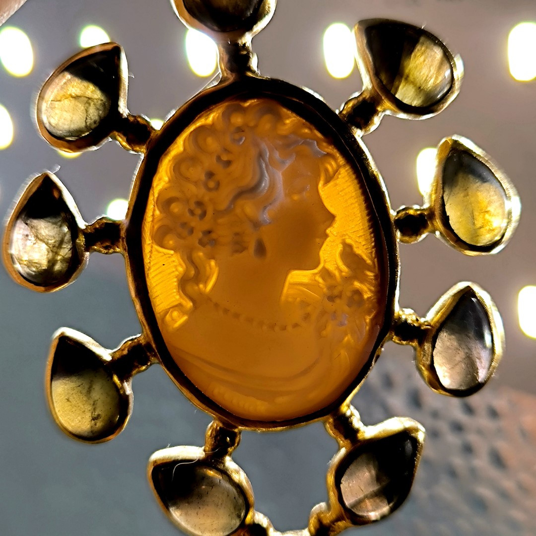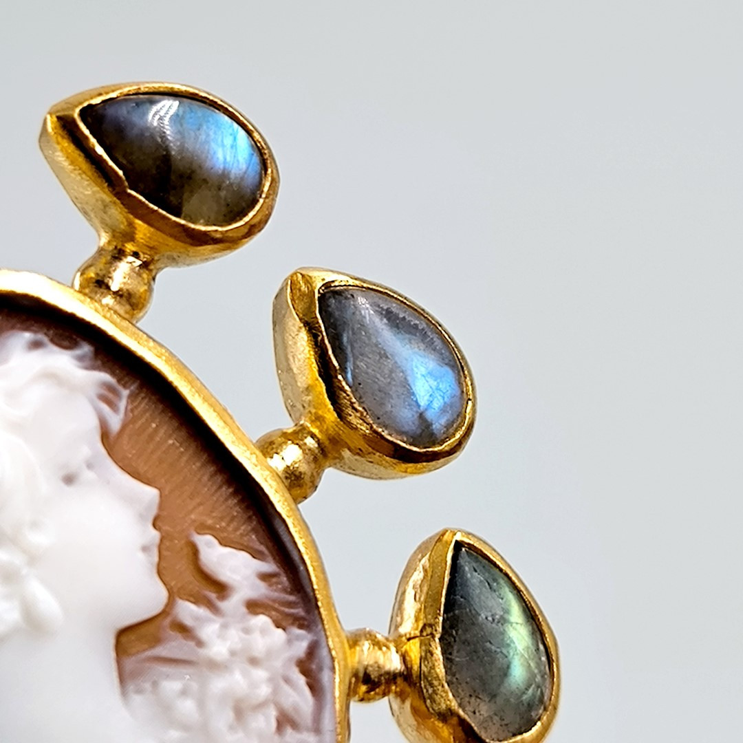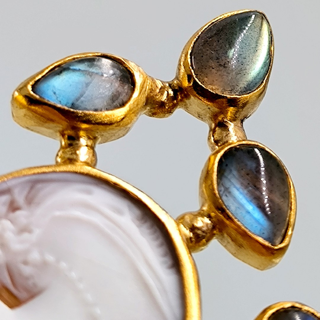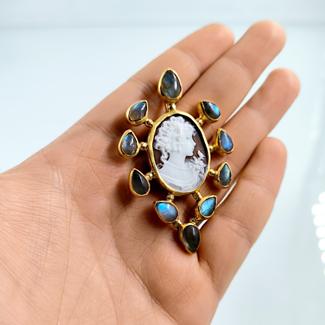 Muhteşem bir mücevher ile yine sizlerleyiz! Eşsiz bir Cameo mücevher! Deniz kabuğu üzeri el oyma çalışılmış Leydi tasvirli muazzam bir madalyon kolye! Ay taşları ile süslediğimiz, Tam bir viktoryan stilde Cameo kolyemiz!! Çerçevemiz tamamen gümüş olup üzeri Altın kaplamadır..