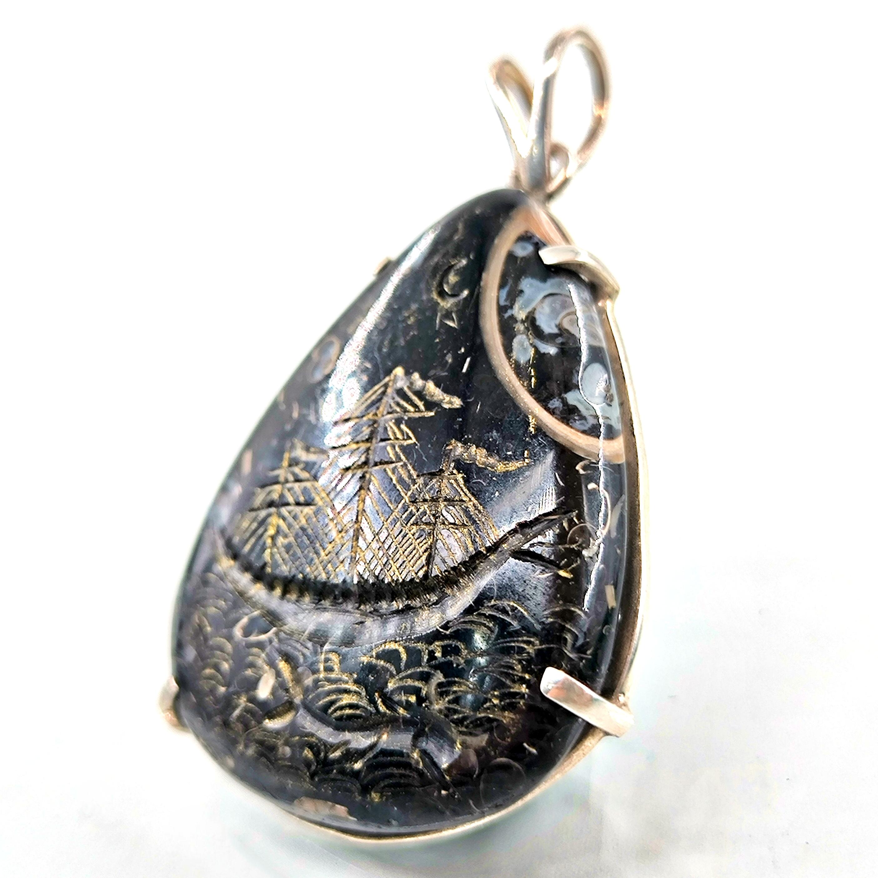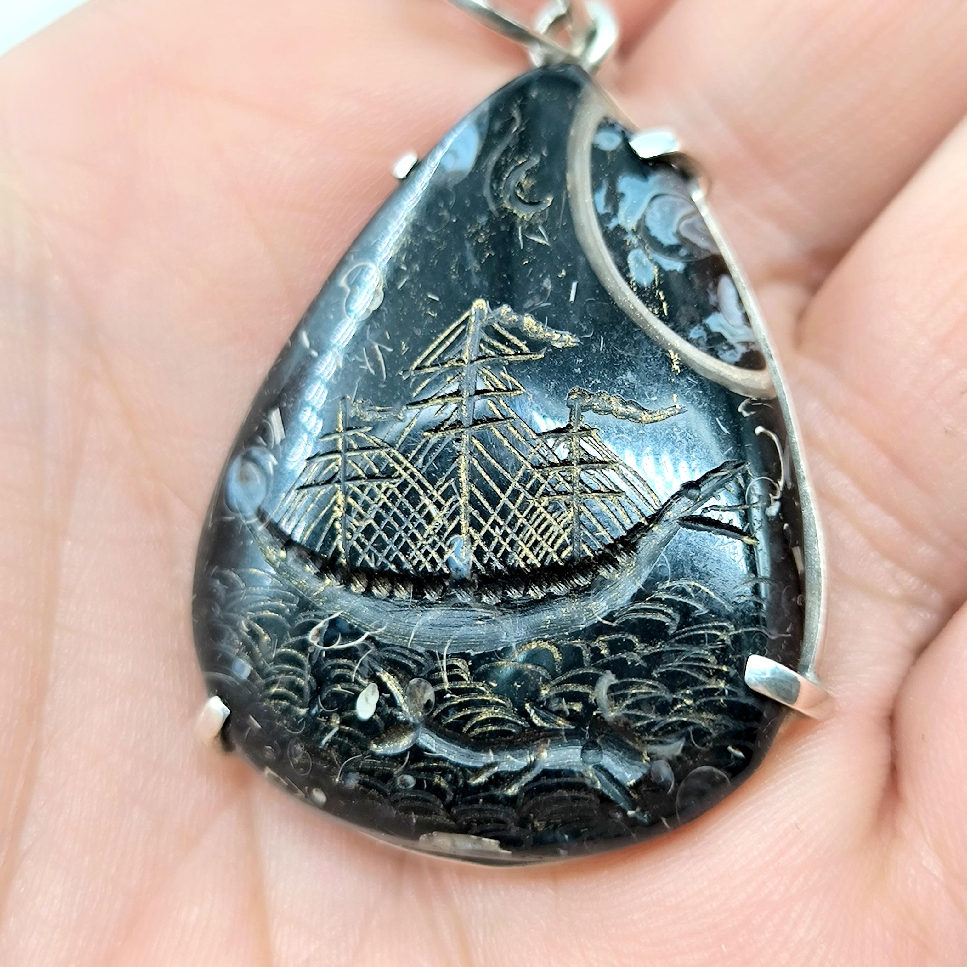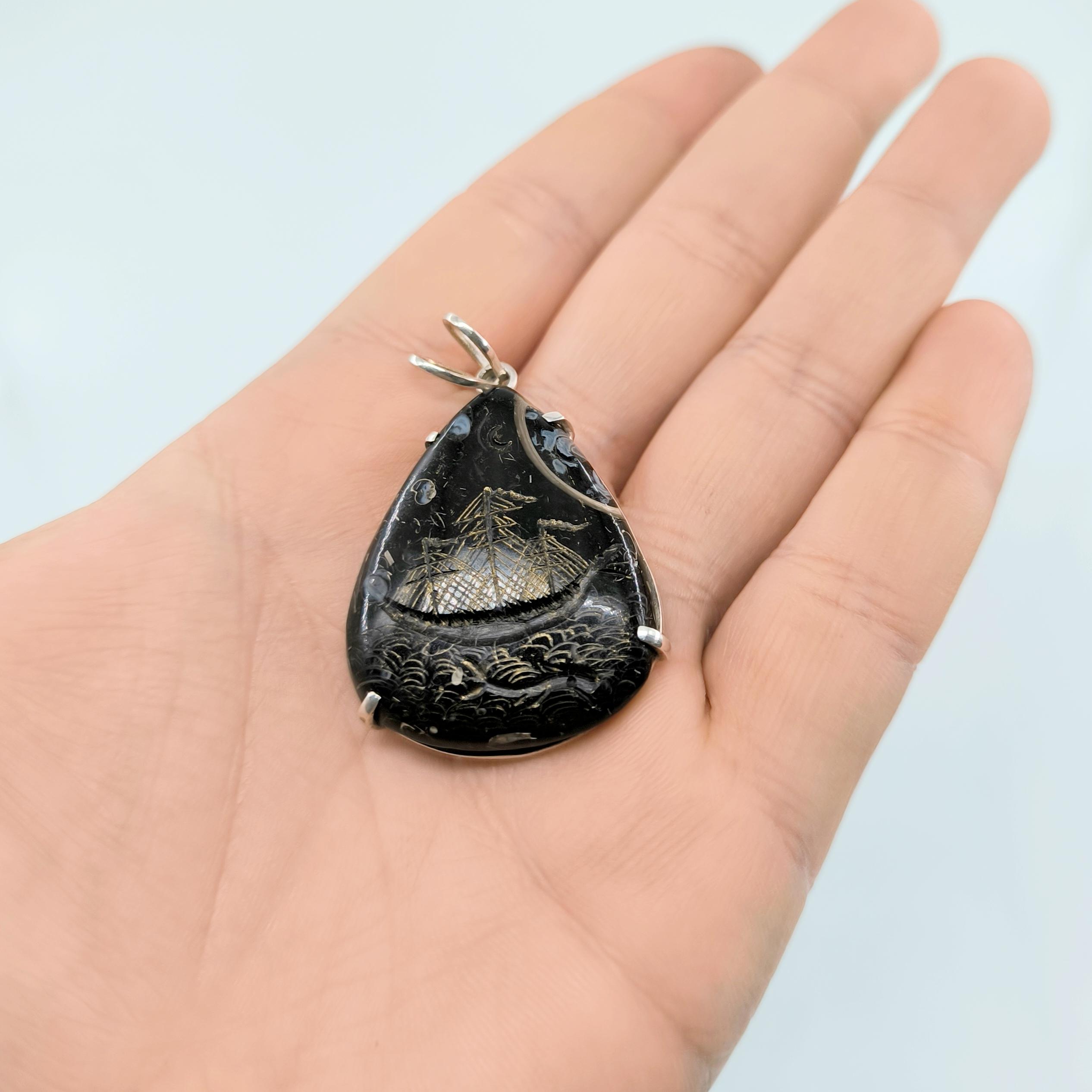 Fosilli Jasper’ın karanlık ve gizemli dokusunda, antik deniz efsanelerini yeniden canlandırdığım bu çalışmada; korkusuzca dalgaları yaran canavar başlı bir gemiyi ve hemen altında yol gösterici ruhu temsil eden yunusu oyma tekniğiyle işledim. Taşın doğal fosil izleri gece denizi gibi derin bir atmosfer yaratırken, el işçiliği altın tonlu detaylar dalgaların ve gemi direklerinin ışıltısını vurguluyor. 925 ayar gümüş çerçevesi ise bu efsaneyi zarif bir forma taşıyor. macerayı, mitolojiyi ve özgürlüğü temsil eden güçlü bir kolye.
