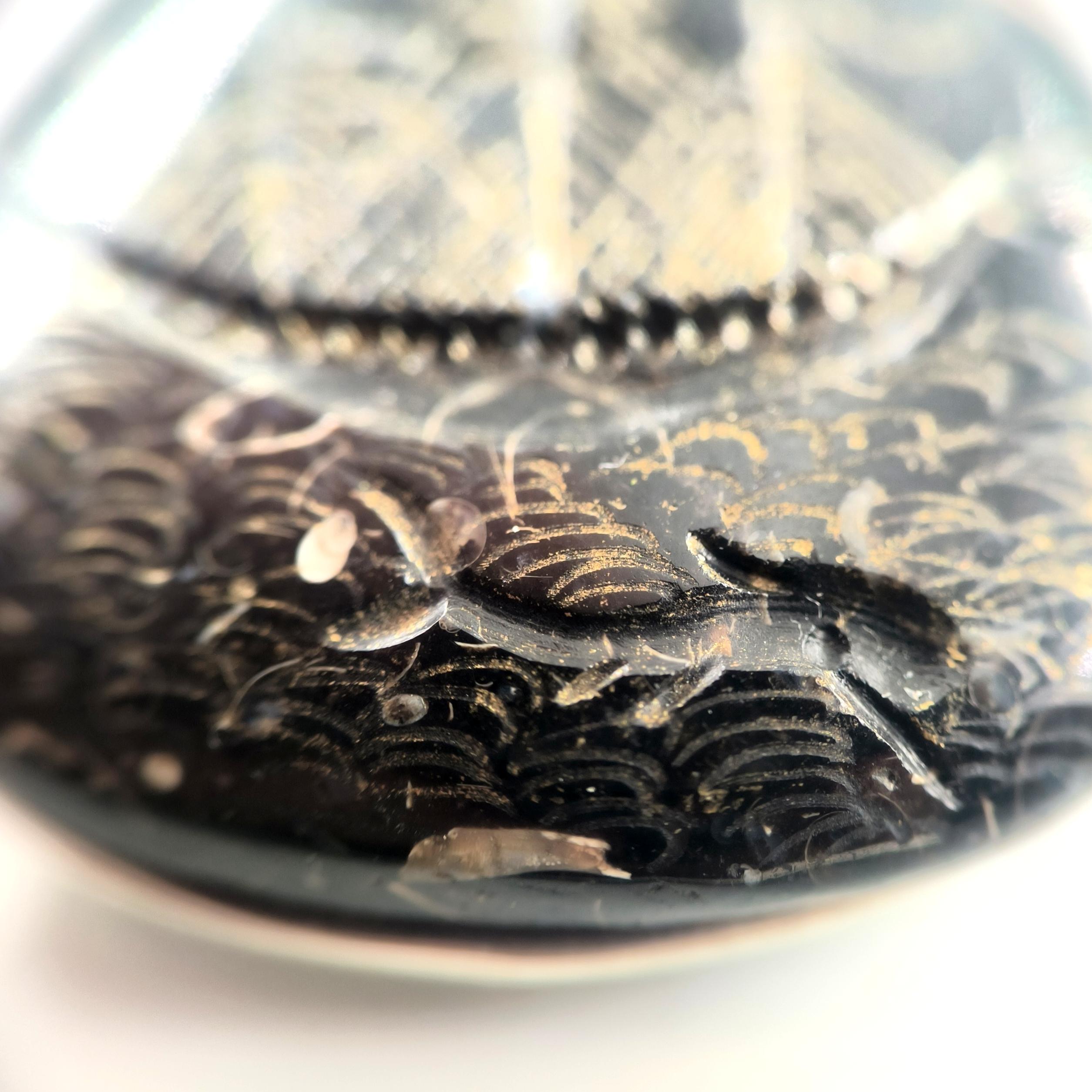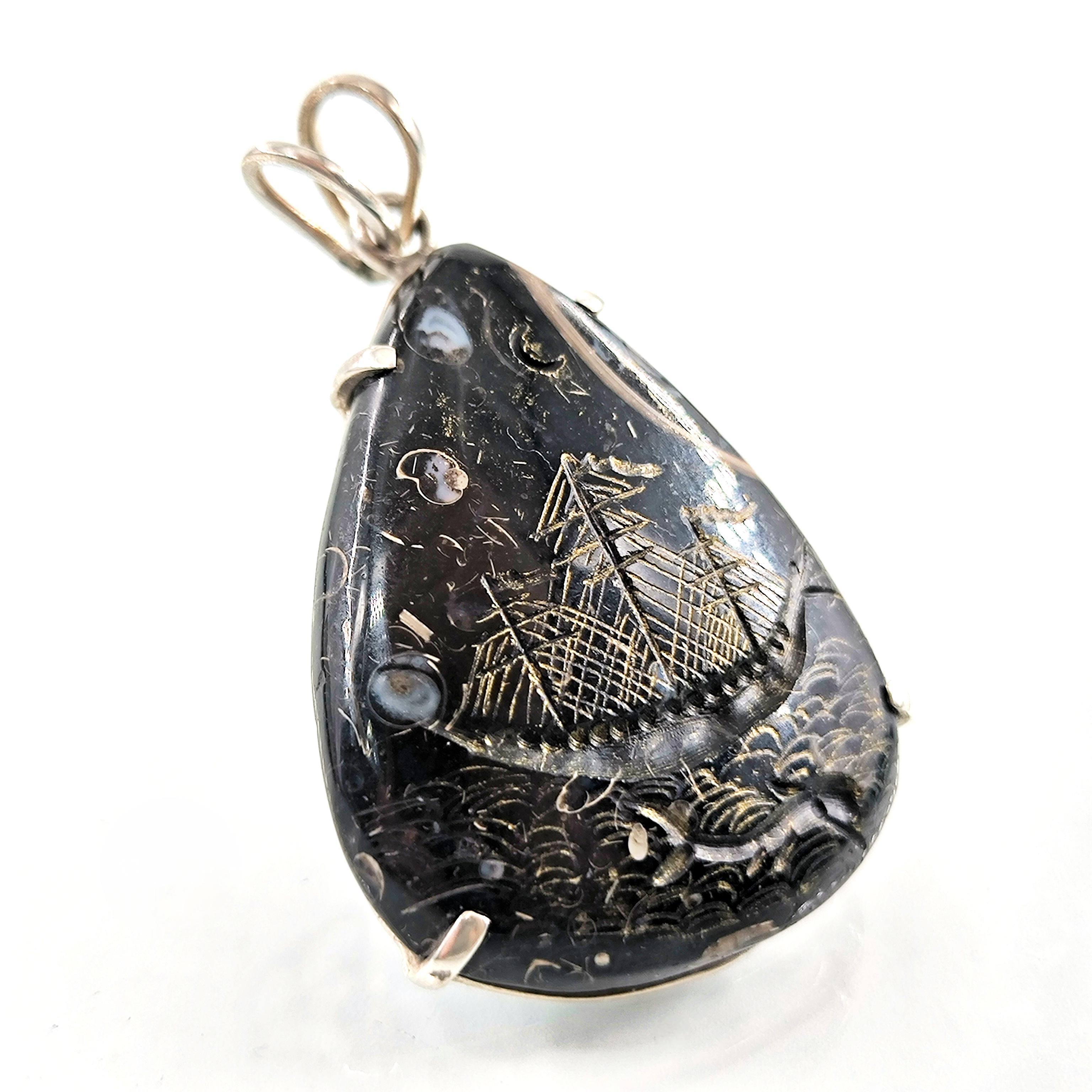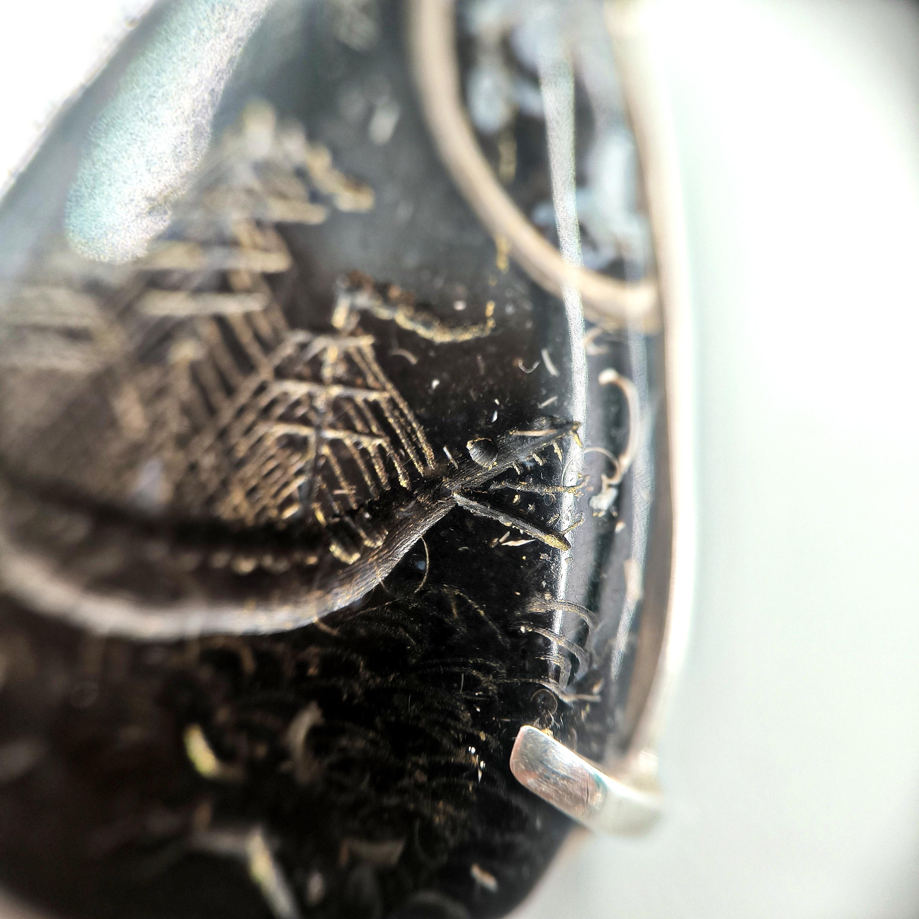 Fosilli Jasper’ın karanlık ve gizemli dokusunda, antik deniz efsanelerini yeniden canlandırdığım bu çalışmada; korkusuzca dalgaları yaran canavar başlı bir gemiyi ve hemen altında yol gösterici ruhu temsil eden yunusu oyma tekniğiyle işledim. Taşın doğal fosil izleri gece denizi gibi derin bir atmosfer yaratırken, el işçiliği altın tonlu detaylar dalgaların ve gemi direklerinin ışıltısını vurguluyor. 925 ayar gümüş çerçevesi ise bu efsaneyi zarif bir forma taşıyor. macerayı, mitolojiyi ve özgürlüğü temsil eden güçlü bir kolye.