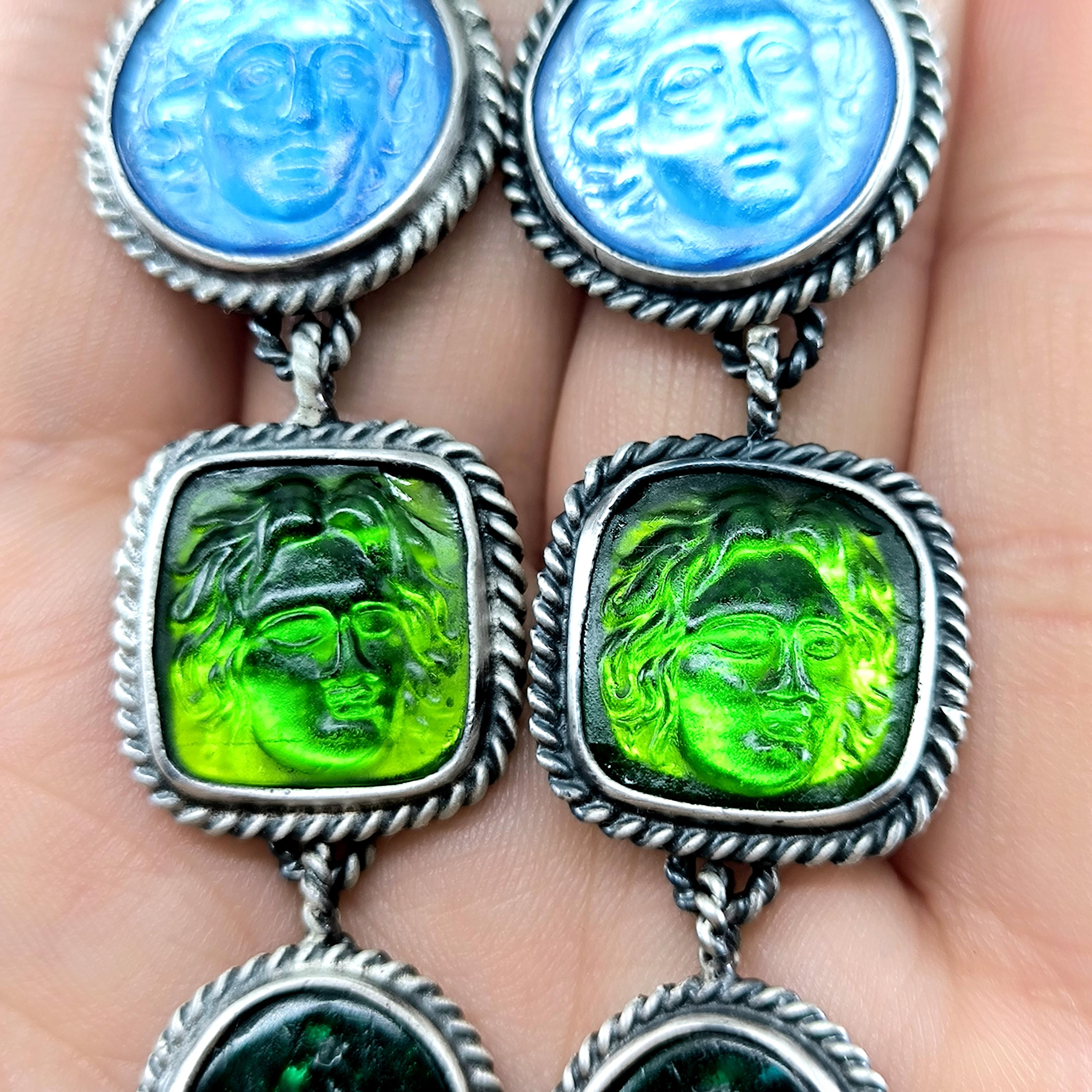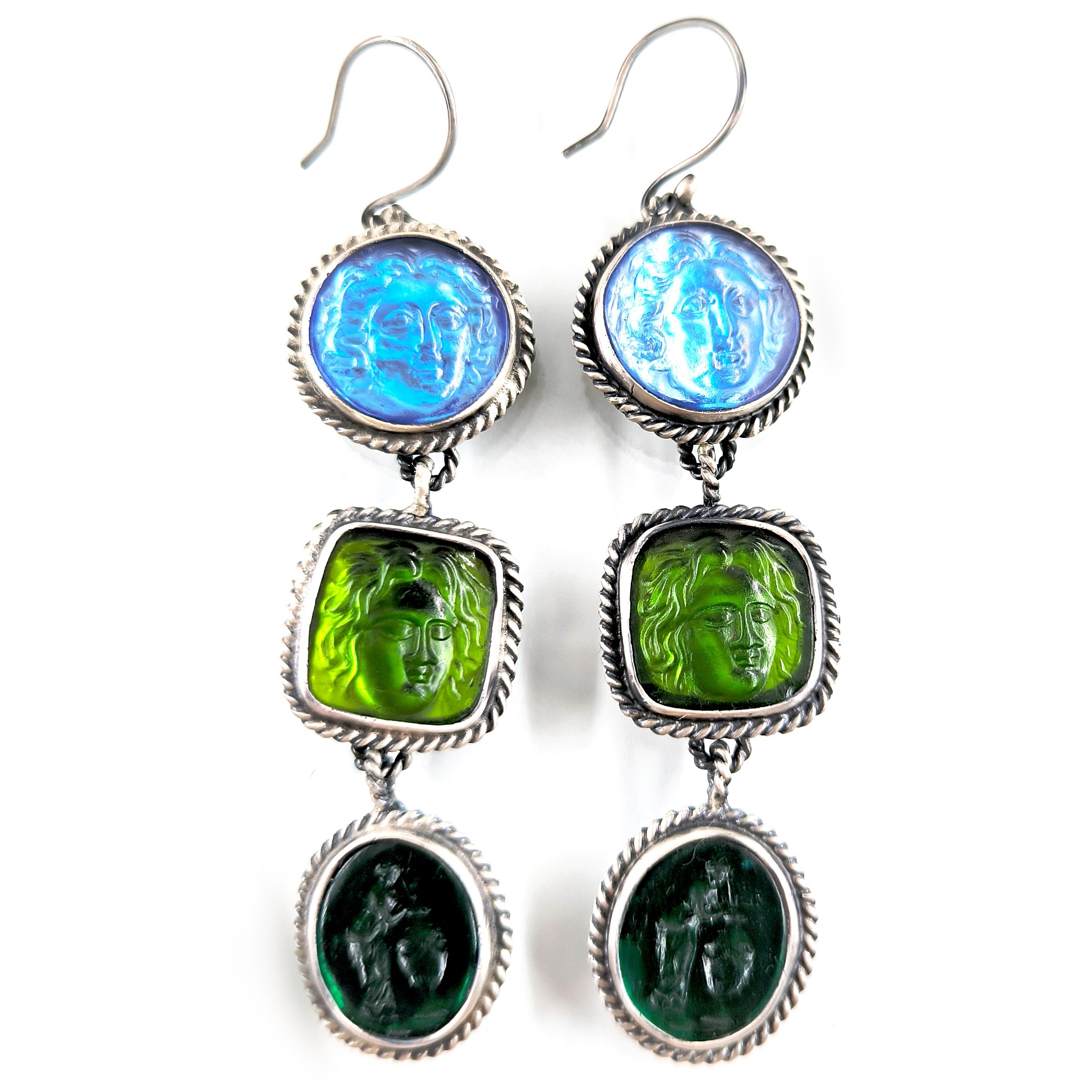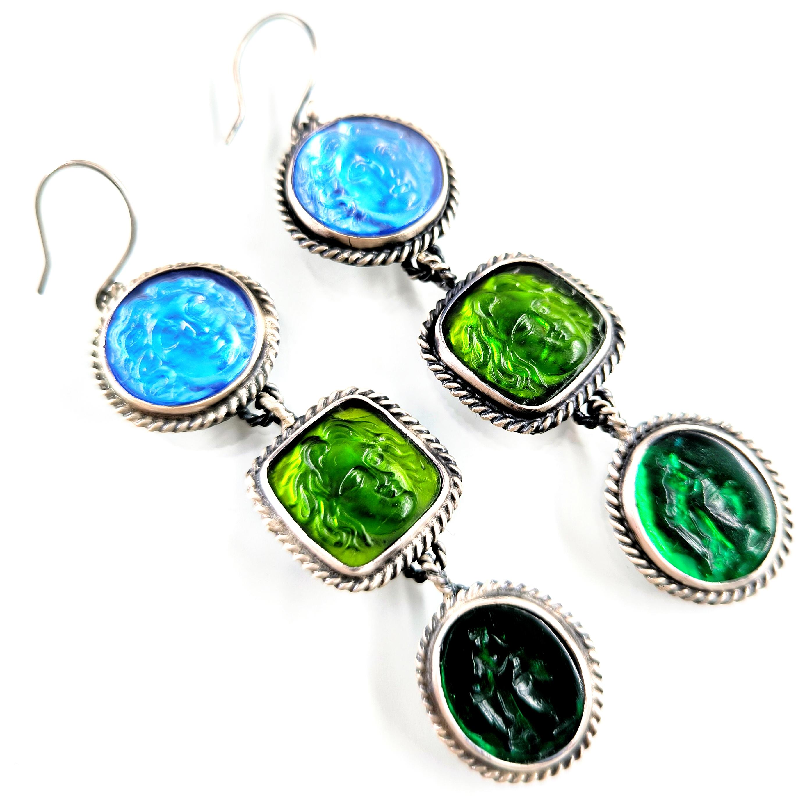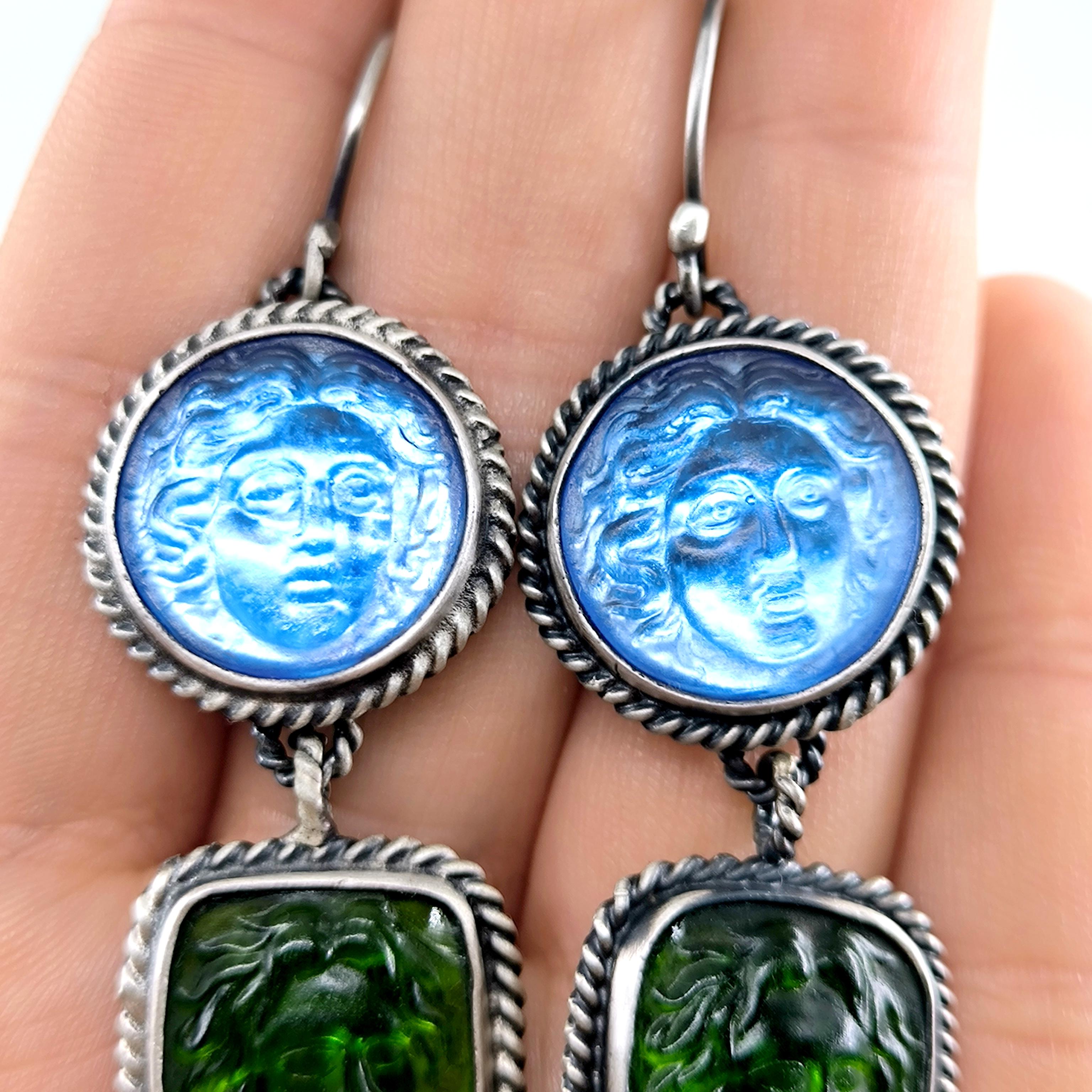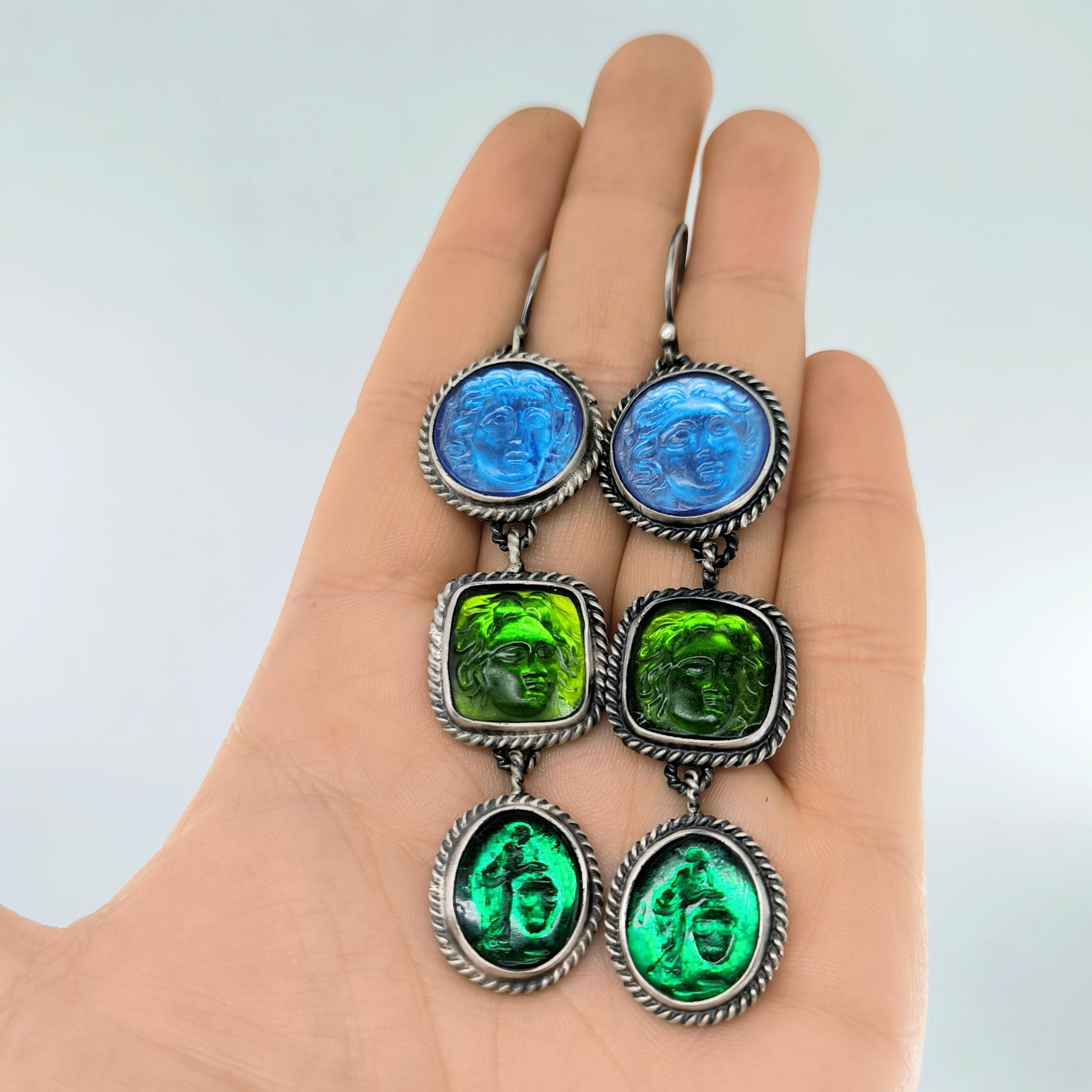 Antik anlatılar, dalgaların sesinde iki farklı ruhun buluştuğunu söyler: Rodos’un koruyucu ışığı ve suya yaslanmış kadının içsel sessizliği. Biri denizlerin gücünü taşırken, diğeri kalbin sakladığı duygu derinliğini fısıldar; mavi özgürlüğün gökyüzünü, yeşil yaşamın sonsuz döngüsünü temsil eder. Cam taşların üzerine oyulan bu figürler, her bakışta mitlerin yankısını bugüne taşıyan sessiz bir dua gibi parlar. Arkalarına yerleştirilen özel folyo taban, ışığı çoğaltarak janjanlı ve göz alıcı bir yansıma yaratır; renkler hareket ettikçe içten yanarak canlılık kazanır. 925 ayar gümüş sallantılı tasarım, modern zarafeti antik bir ruhla buluşturan tek ve özel bir koleksiyon parçasıdır.