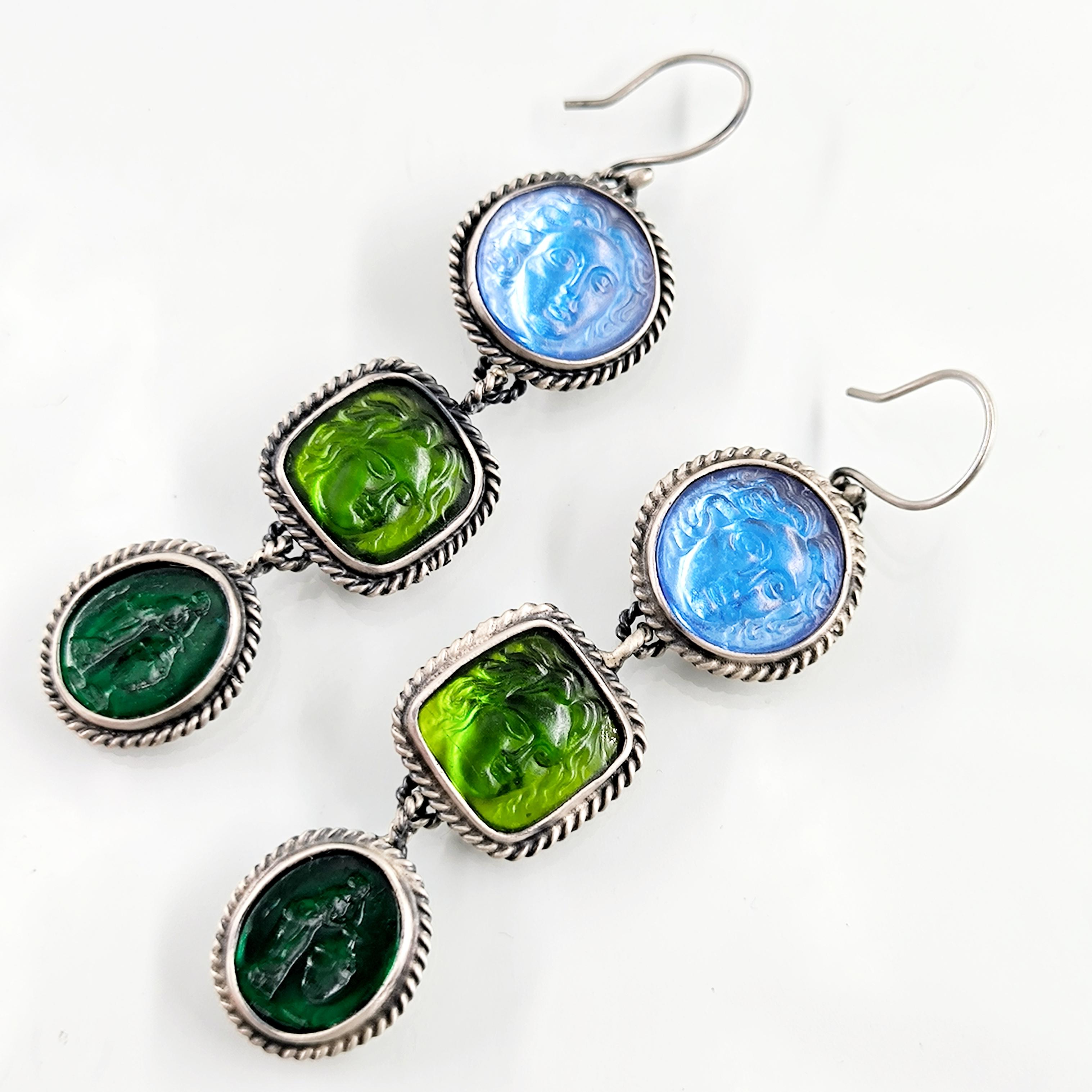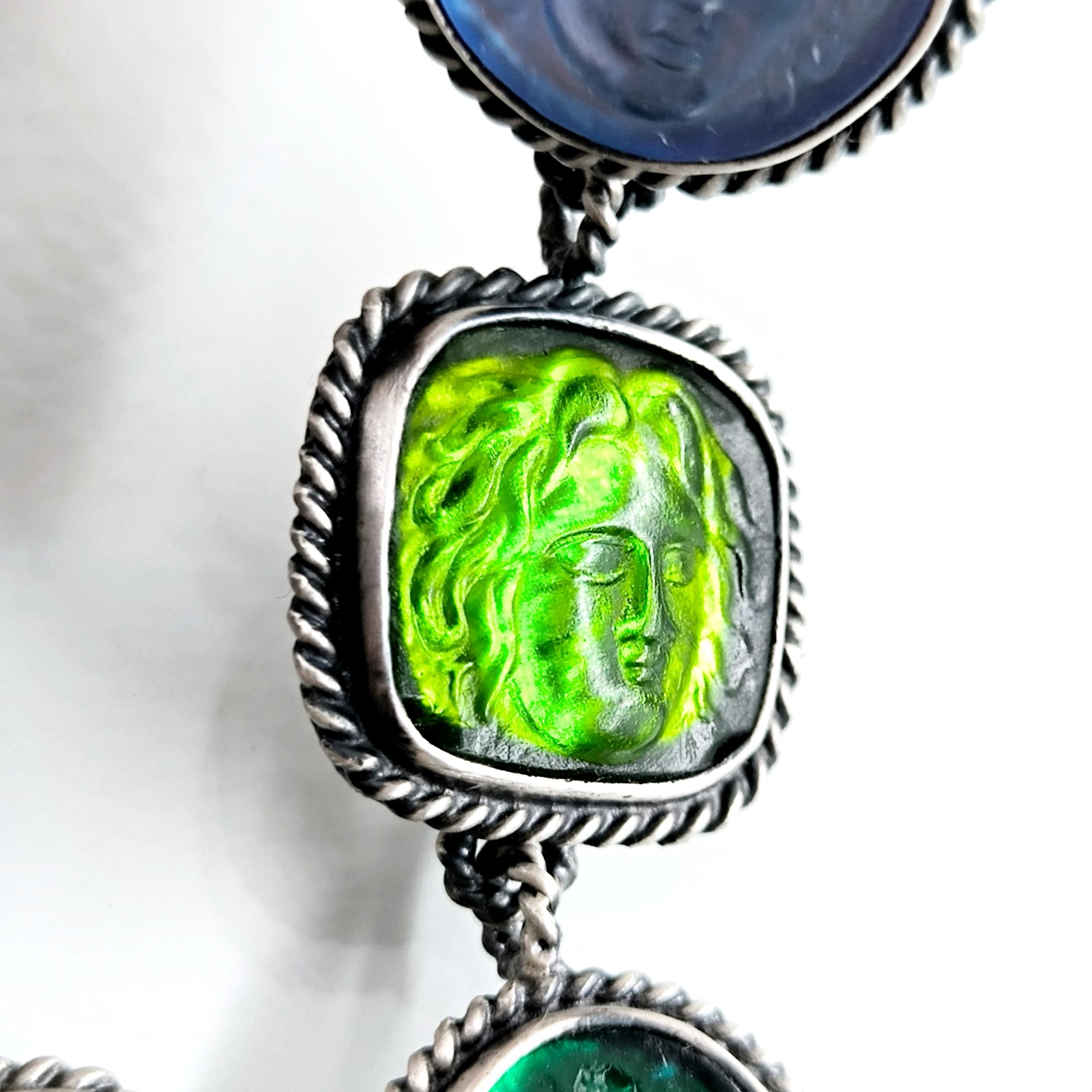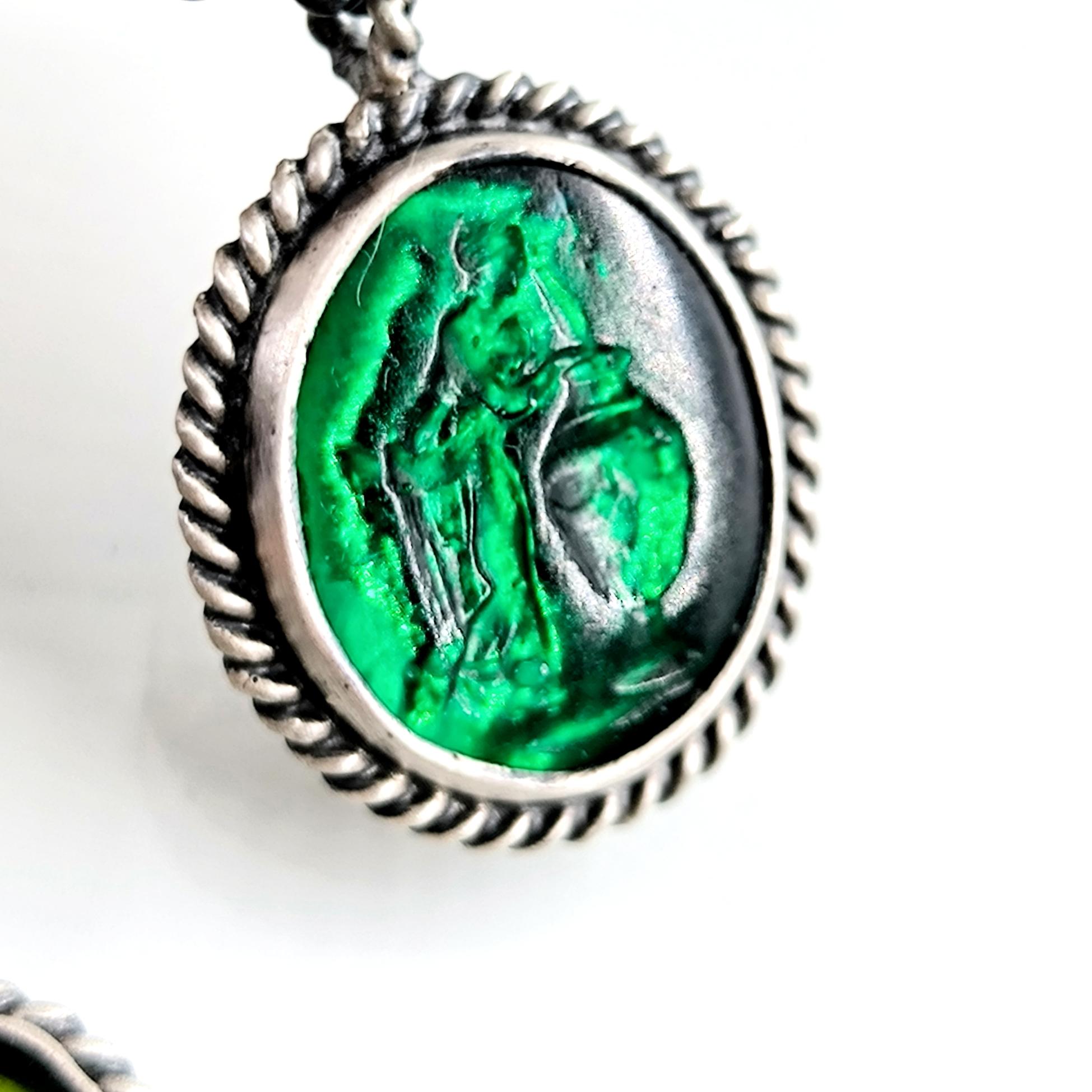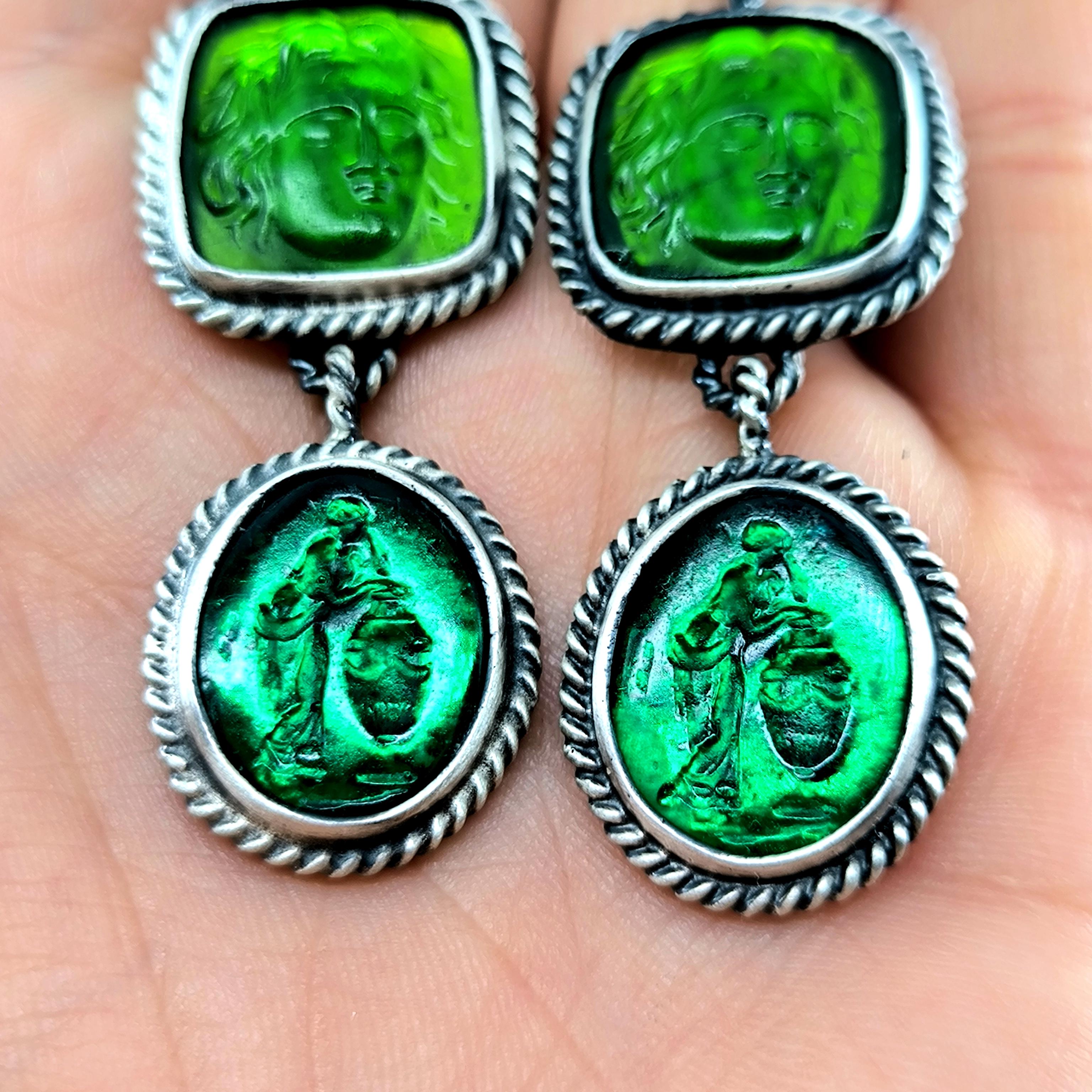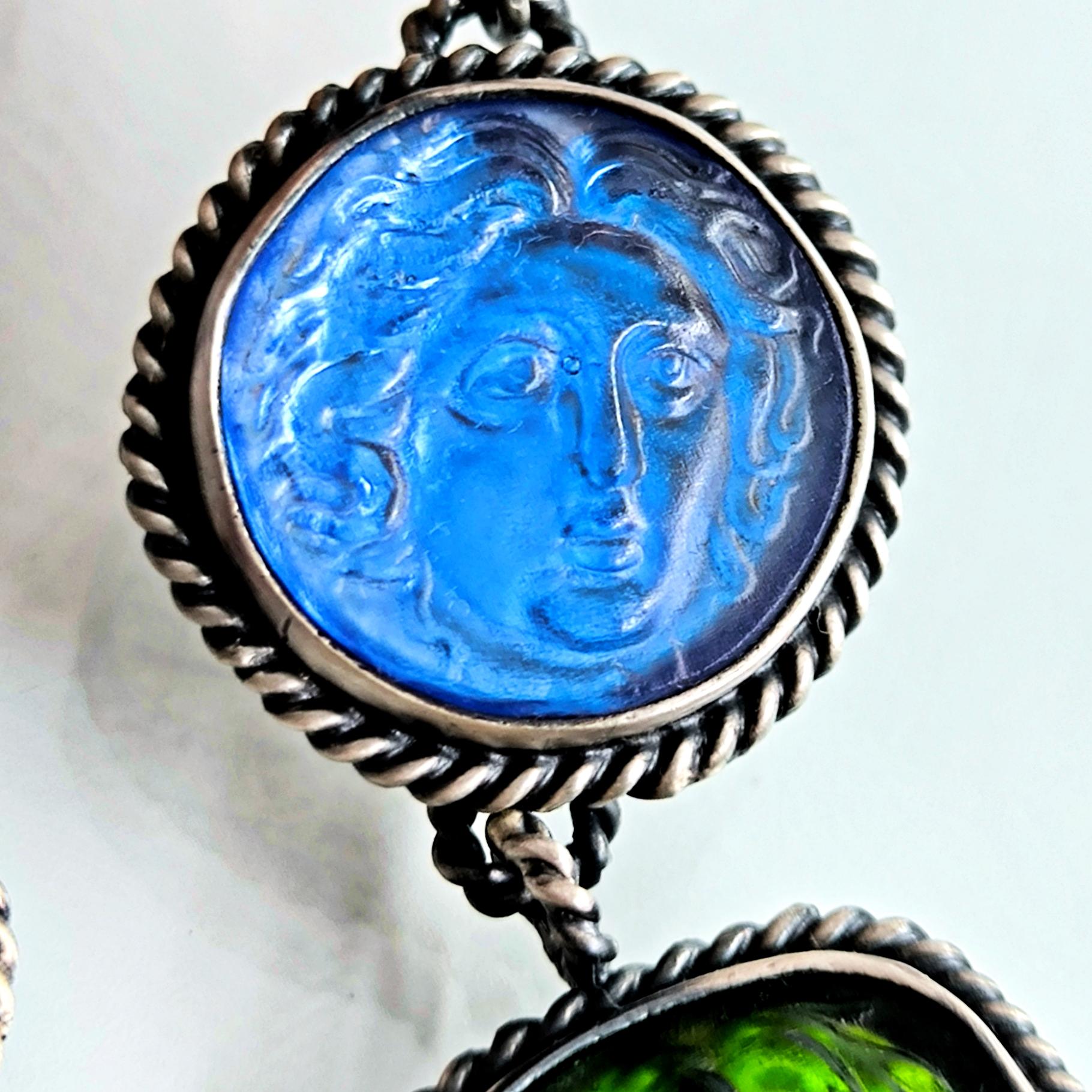 Antik anlatılar, dalgaların sesinde iki farklı ruhun buluştuğunu söyler: Rodos’un koruyucu ışığı ve suya yaslanmış kadının içsel sessizliği. Biri denizlerin gücünü taşırken, diğeri kalbin sakladığı duygu derinliğini fısıldar; mavi özgürlüğün gökyüzünü, yeşil yaşamın sonsuz döngüsünü temsil eder. Cam taşların üzerine oyulan bu figürler, her bakışta mitlerin yankısını bugüne taşıyan sessiz bir dua gibi parlar. Arkalarına yerleştirilen özel folyo taban, ışığı çoğaltarak janjanlı ve göz alıcı bir yansıma yaratır; renkler hareket ettikçe içten yanarak canlılık kazanır. 925 ayar gümüş sallantılı tasarım, modern zarafeti antik bir ruhla buluşturan tek ve özel bir koleksiyon parçasıdır.