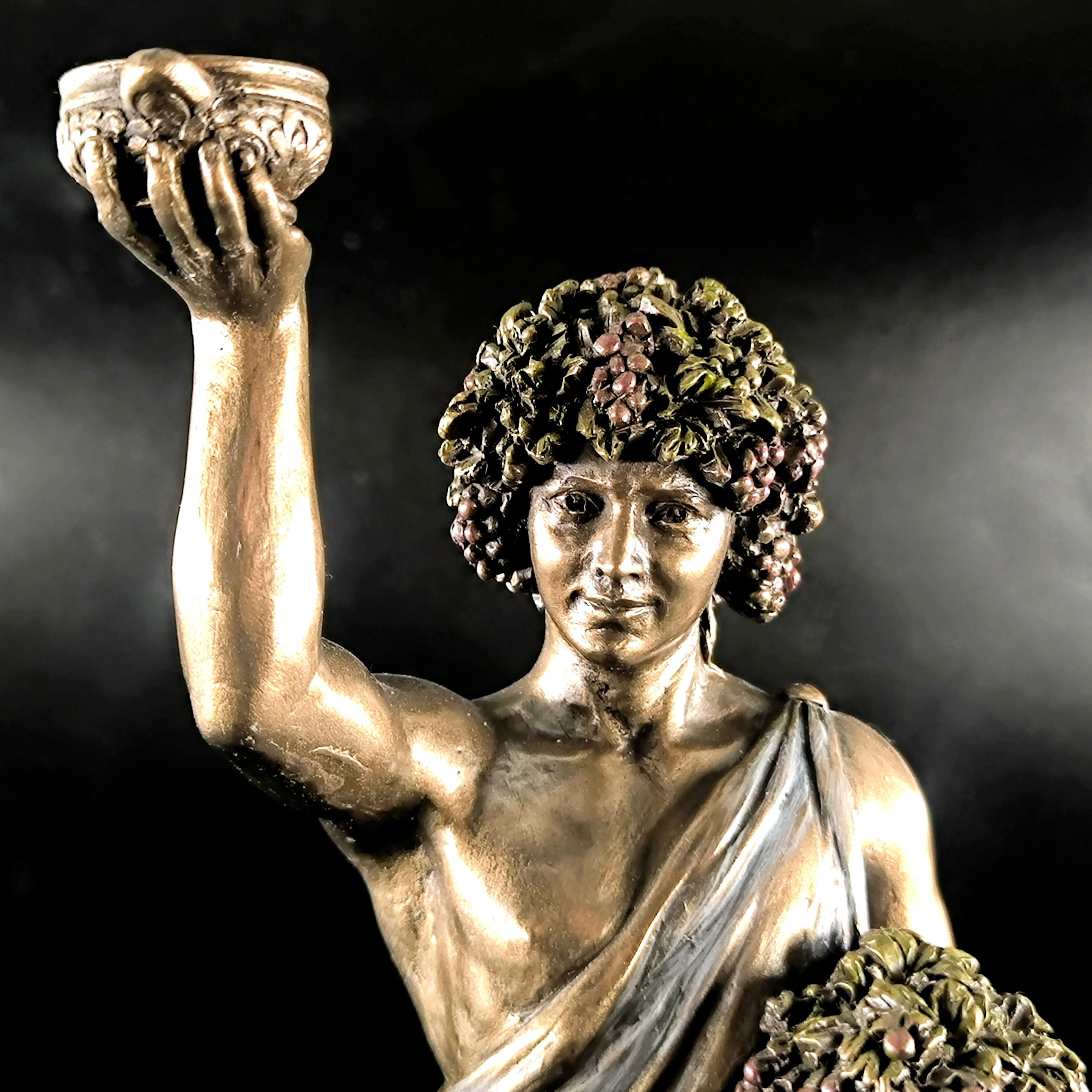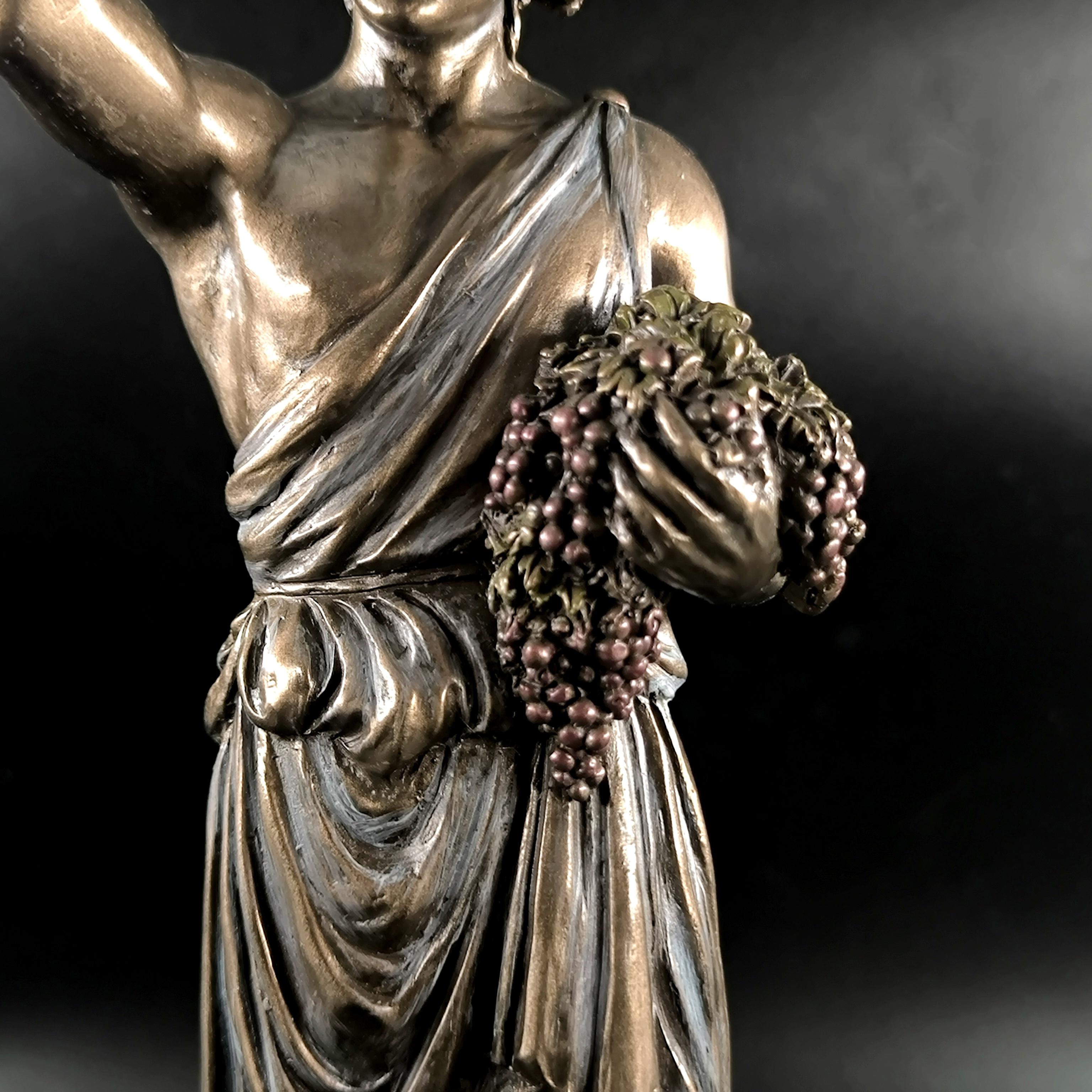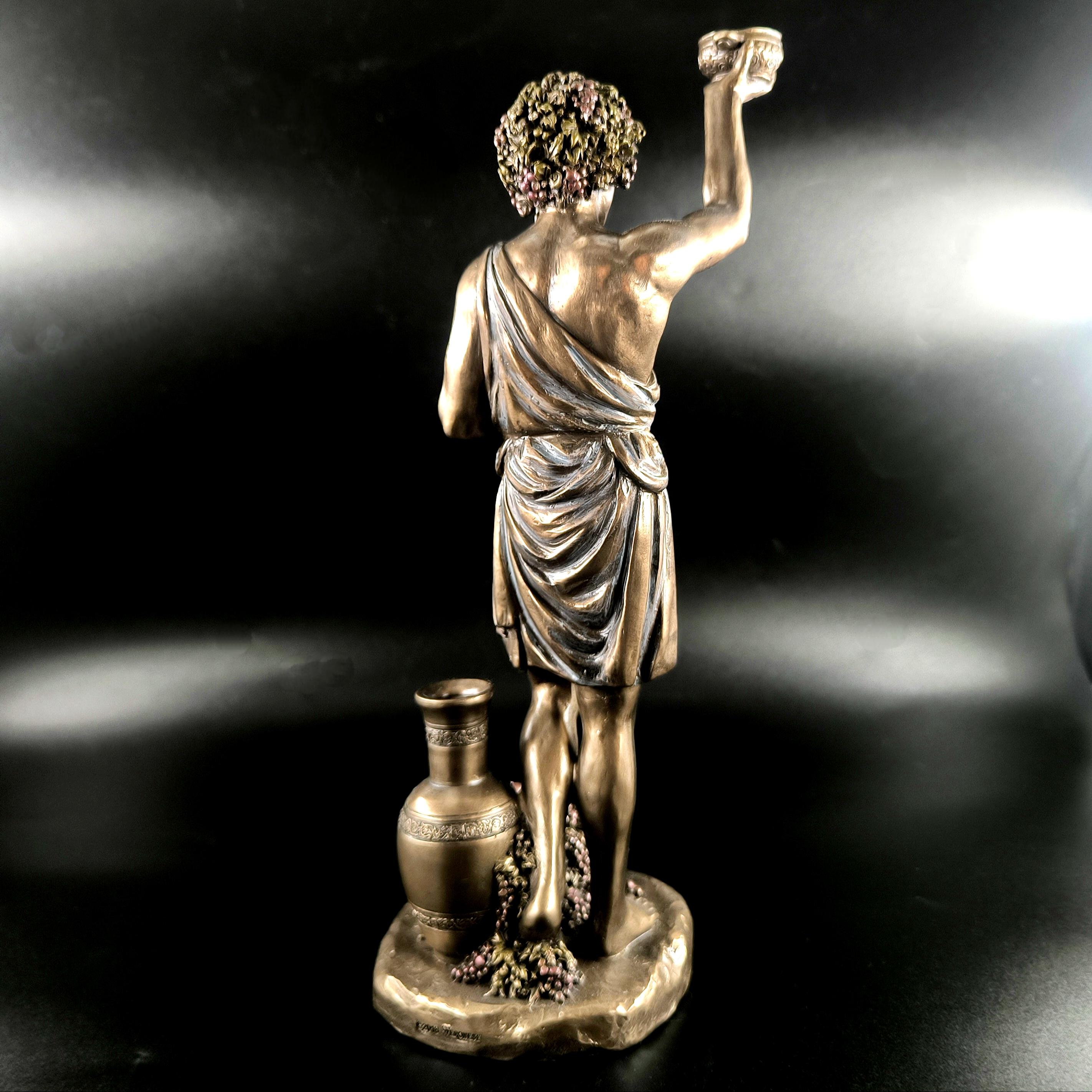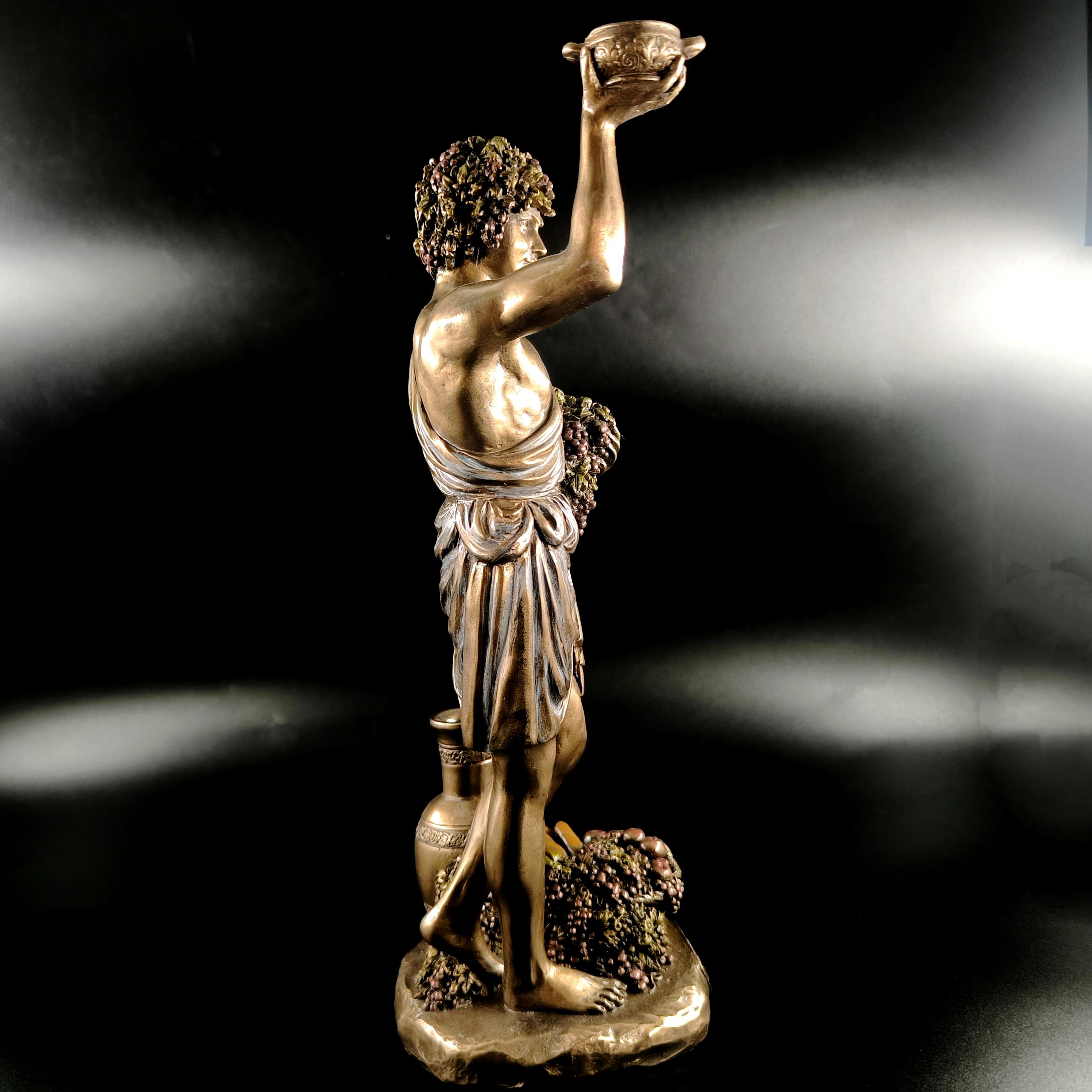 Veronese imzalı Dionysos heykeli, şarap, bereket ve coşkun yaşam enerjisinin tanrısını en ince detaylarıyla betimleyen, klasik mitolojinin güçlü sembollerinden biridir; elinde tuttuğu kadehle özgürlüğü ve neşeyi, kolundaki üzüm salkımlarıyla bereketi ve bolluğu simgeleyen figür, bulunduğu ortama görkemli ve sanatsal bir atmosfer katar. Mermer ve kemik tozu karışımı özel bir madde ile şekillendirilmiş, usta sanatçılar tarafından itinayla boyanmış olup son derece gerçekçi ve detaylı bir işçiliğe sahiptir. Veronese markası dünya çapında işçilikteki ayrıntı ile öne çıkan saygın bir firmadır; marka ve tarih damgası ürünün üzerinde yer almaktadır.
