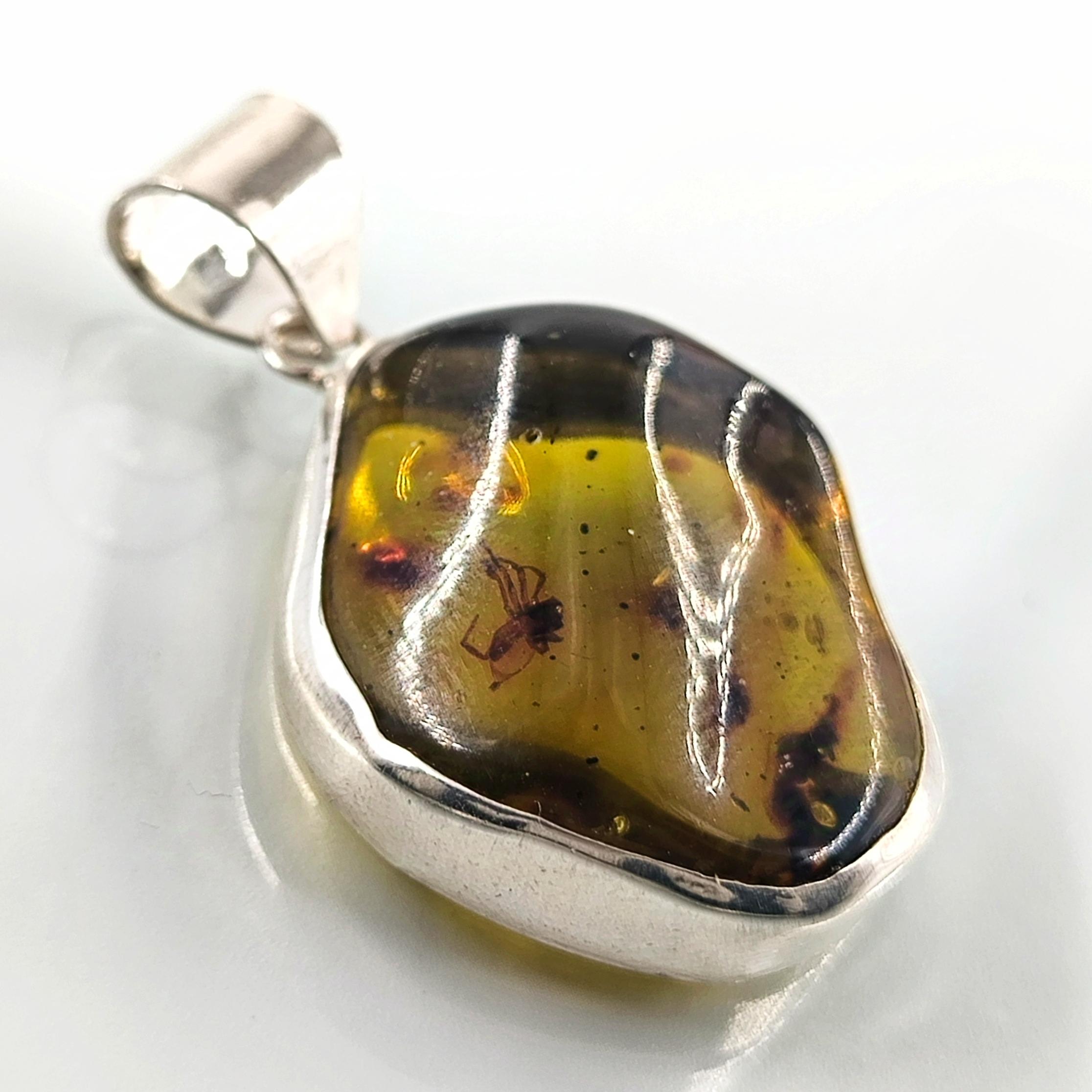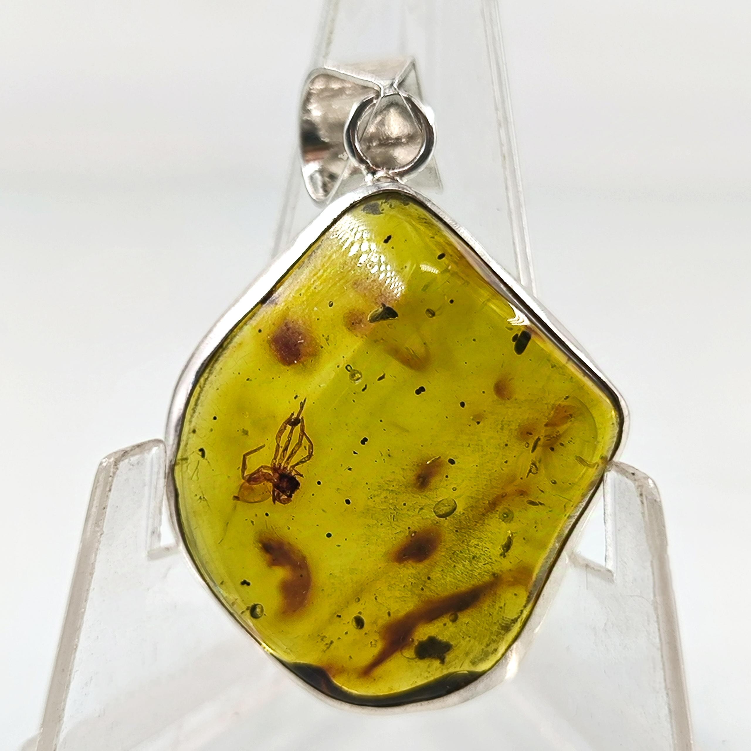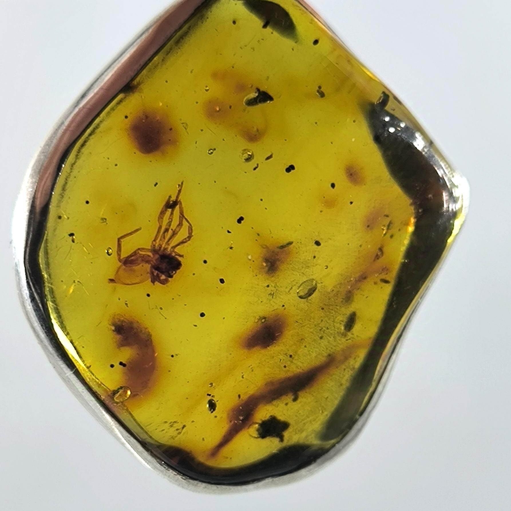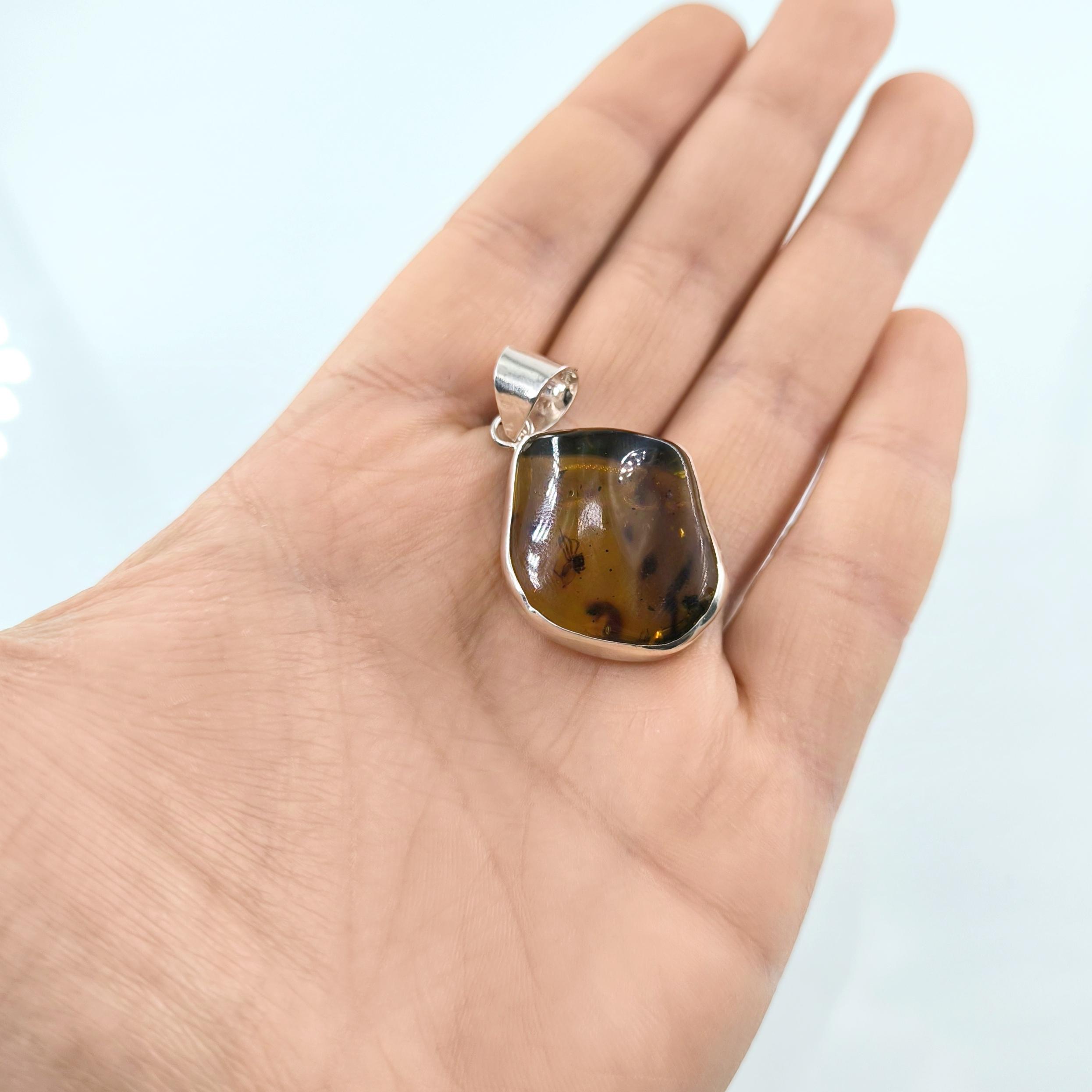 İçerisinde örümcek sinek fosili bulunan Doğu Karayipler Damla Kehribar 925 Ayar Gümüş çerçeveli kolyemiz!