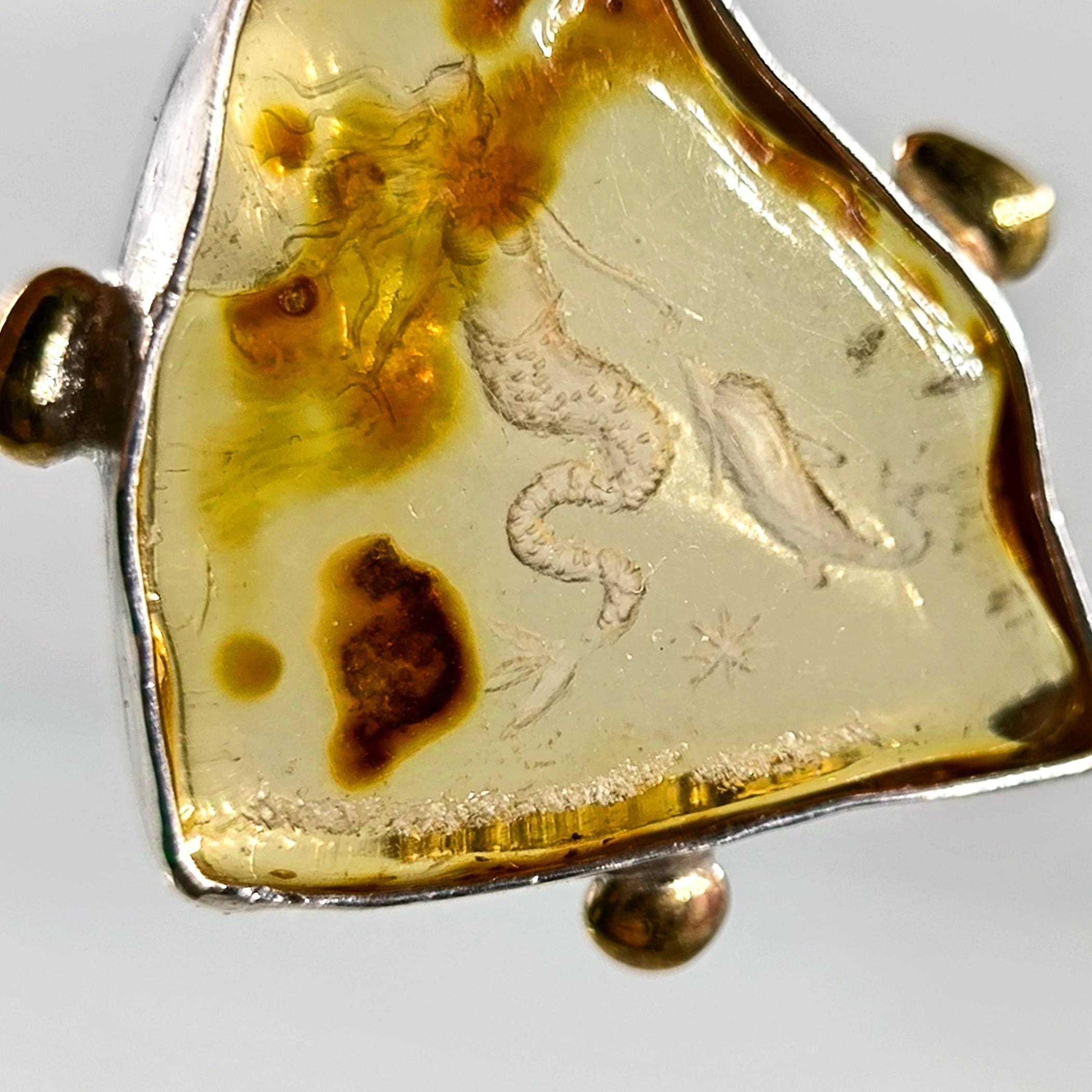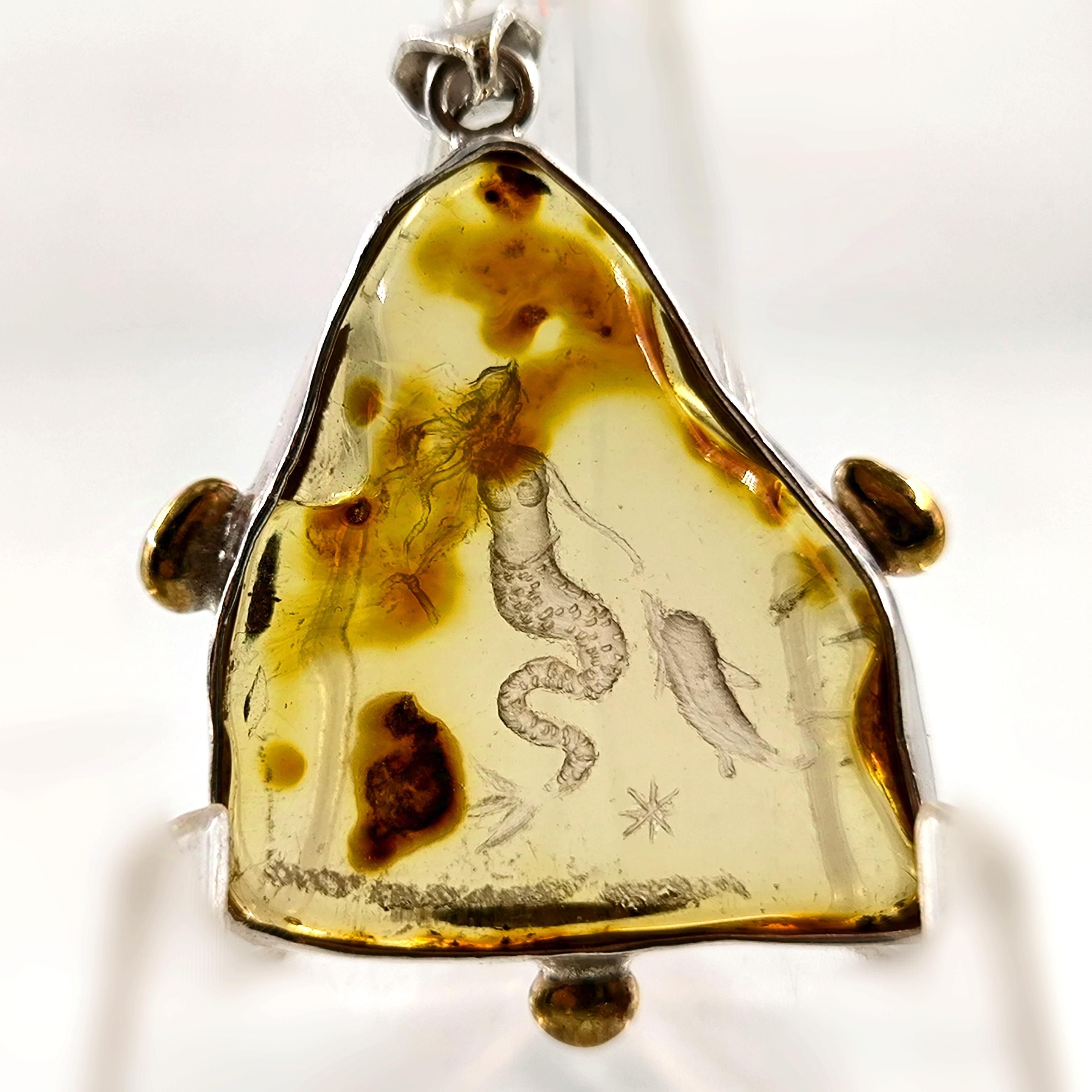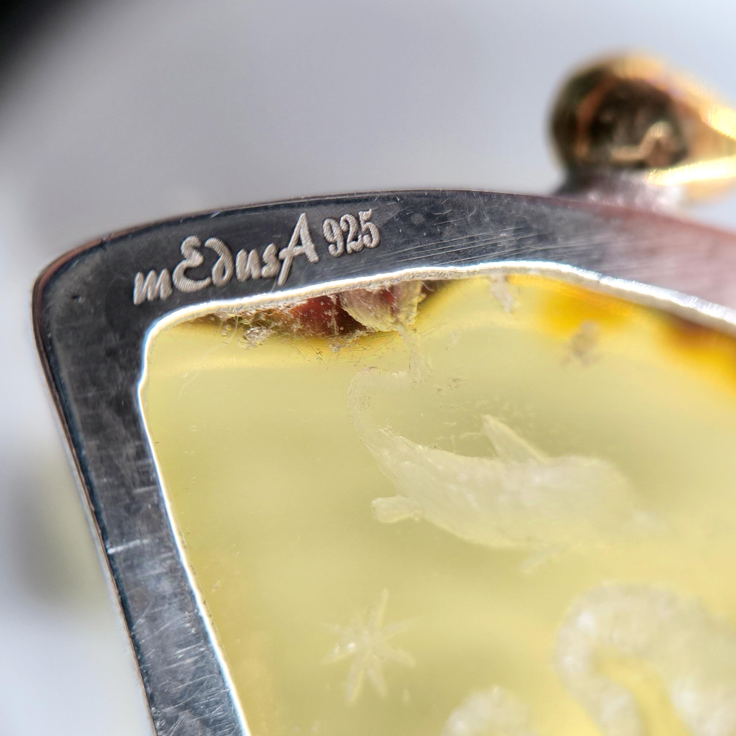 Natürel Baltık kehribar arkasına negatif intaglio çalışması ile ''Okyanusun içinde yunusları besleyen deniz kızı'' tasvirli eşsiz güzellikte Medusa tasarımı gümüş çerçeveli antik stil kolyemiz!