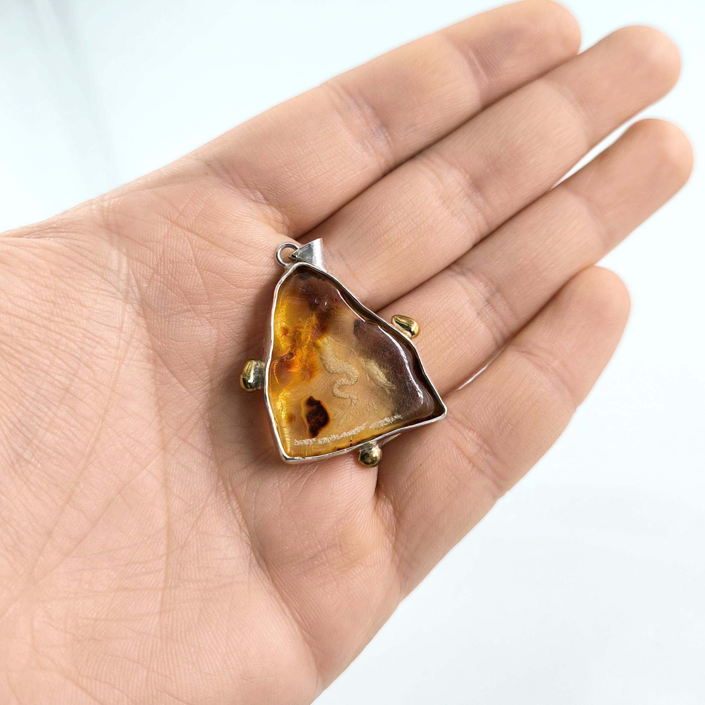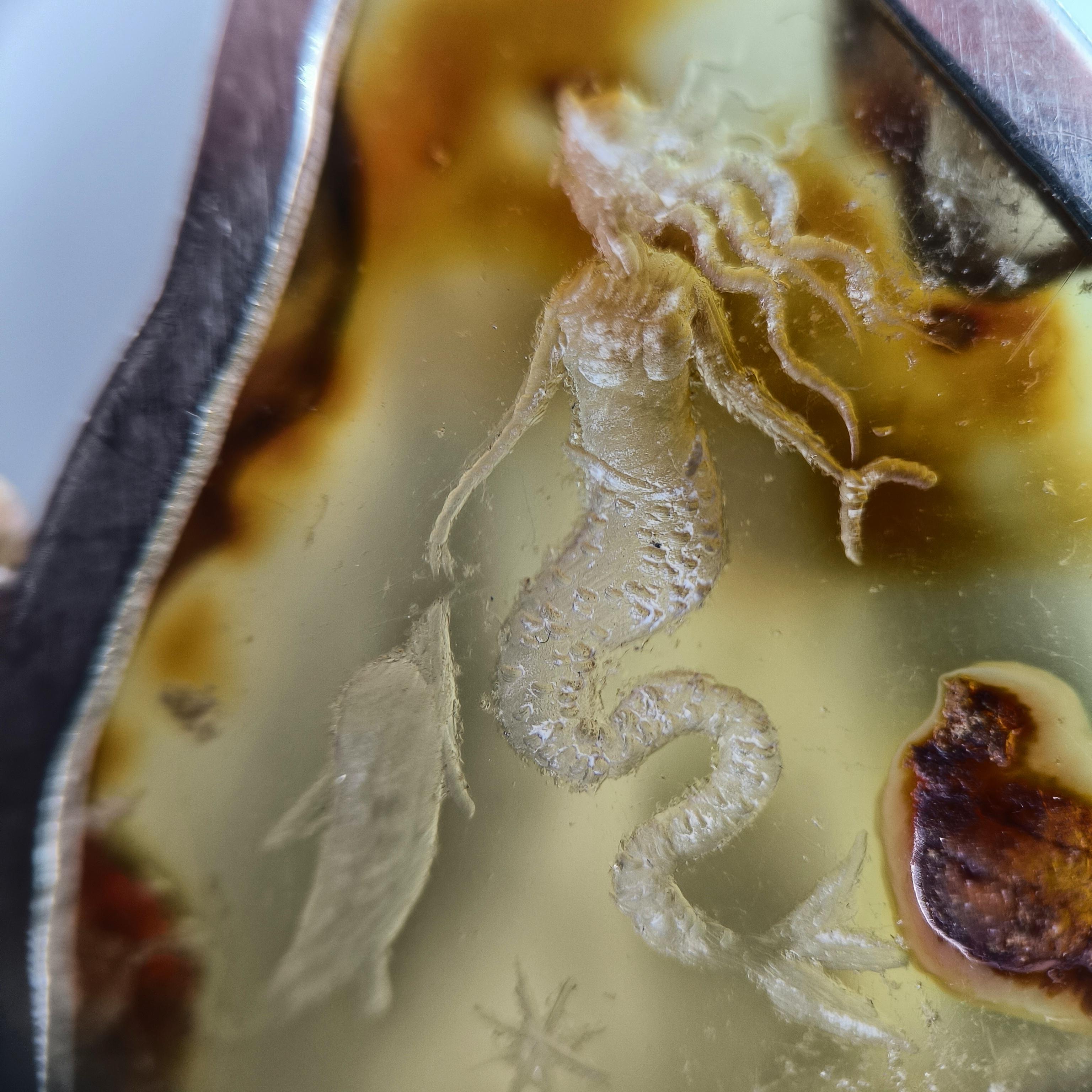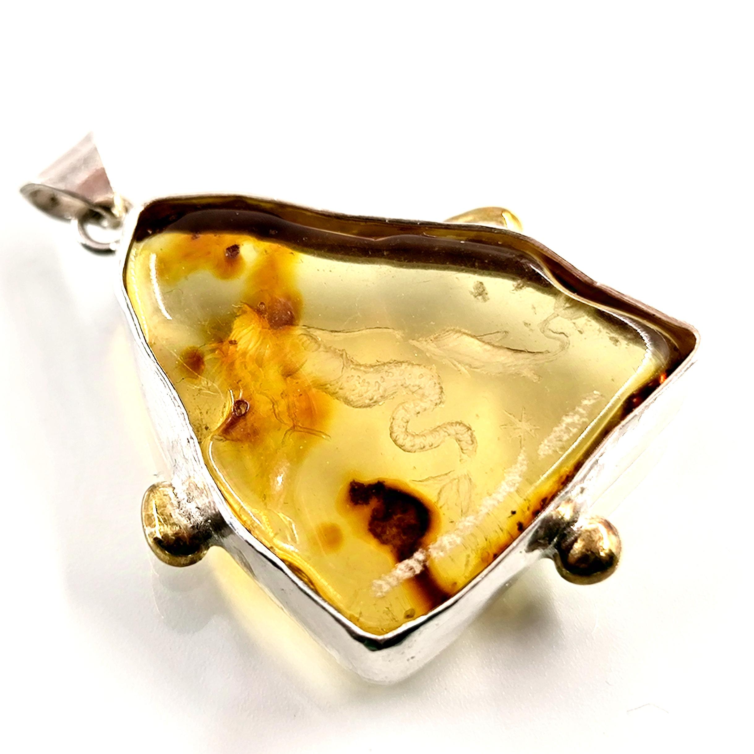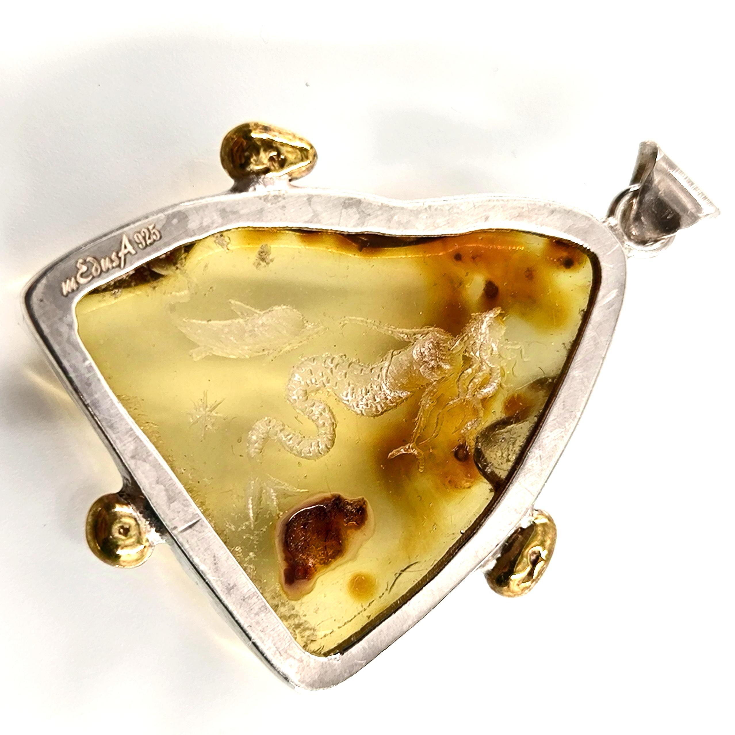Natürel Baltık kehribar arkasına negatif intaglio çalışması ile ''Okyanusun içinde yunusları besleyen deniz kızı'' tasvirli eşsiz güzellikte Medusa tasarımı gümüş çerçeveli antik stil kolyemiz!