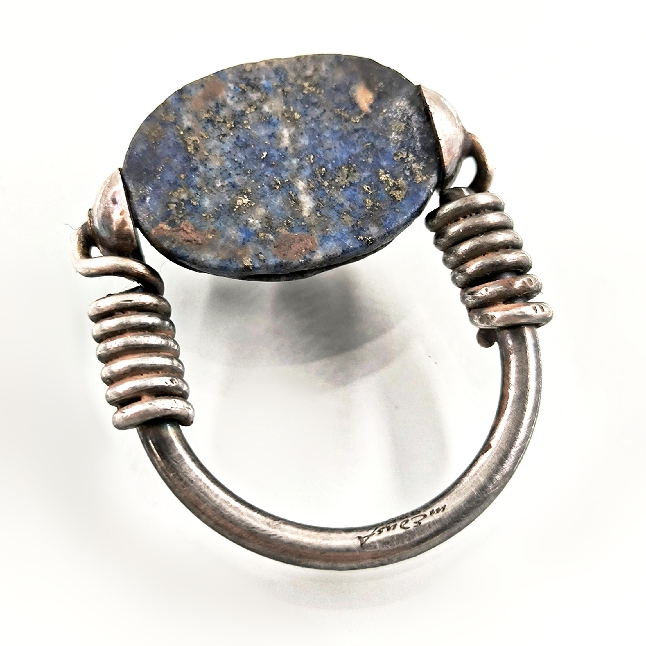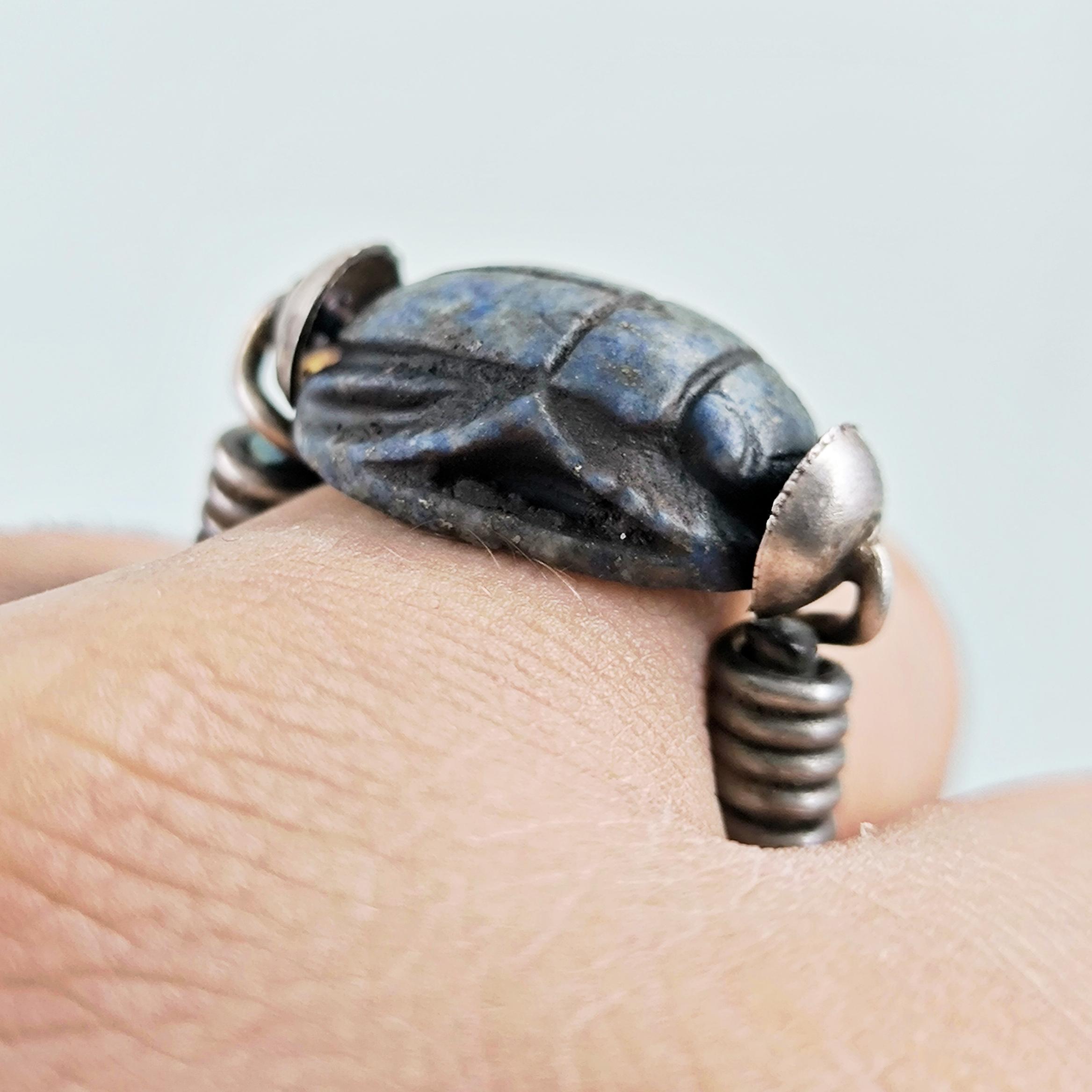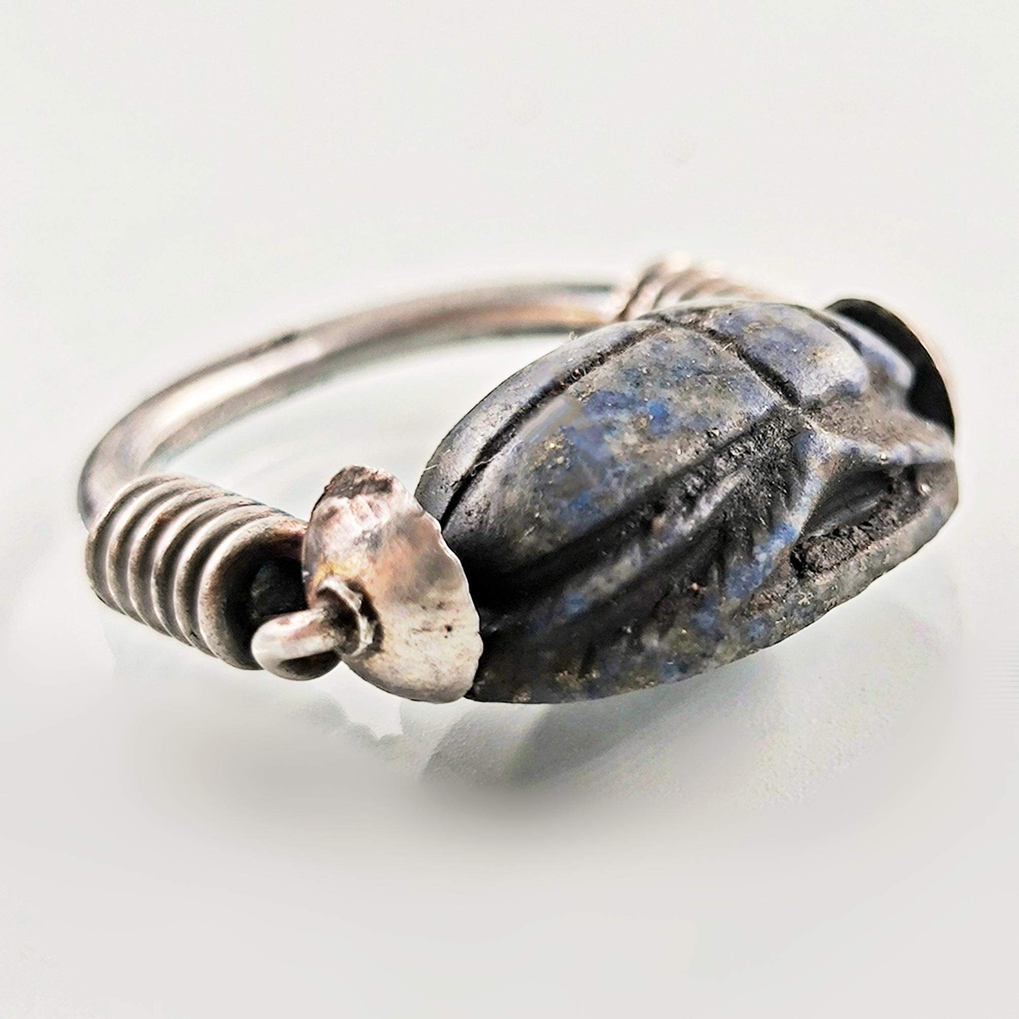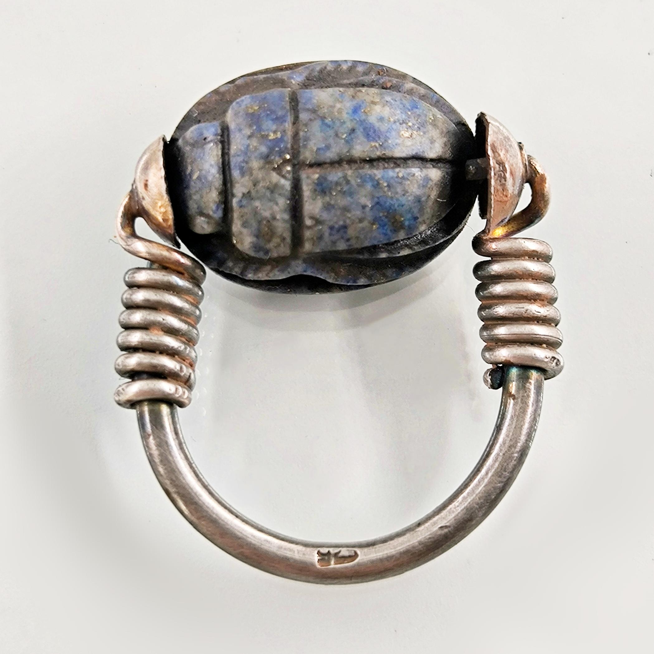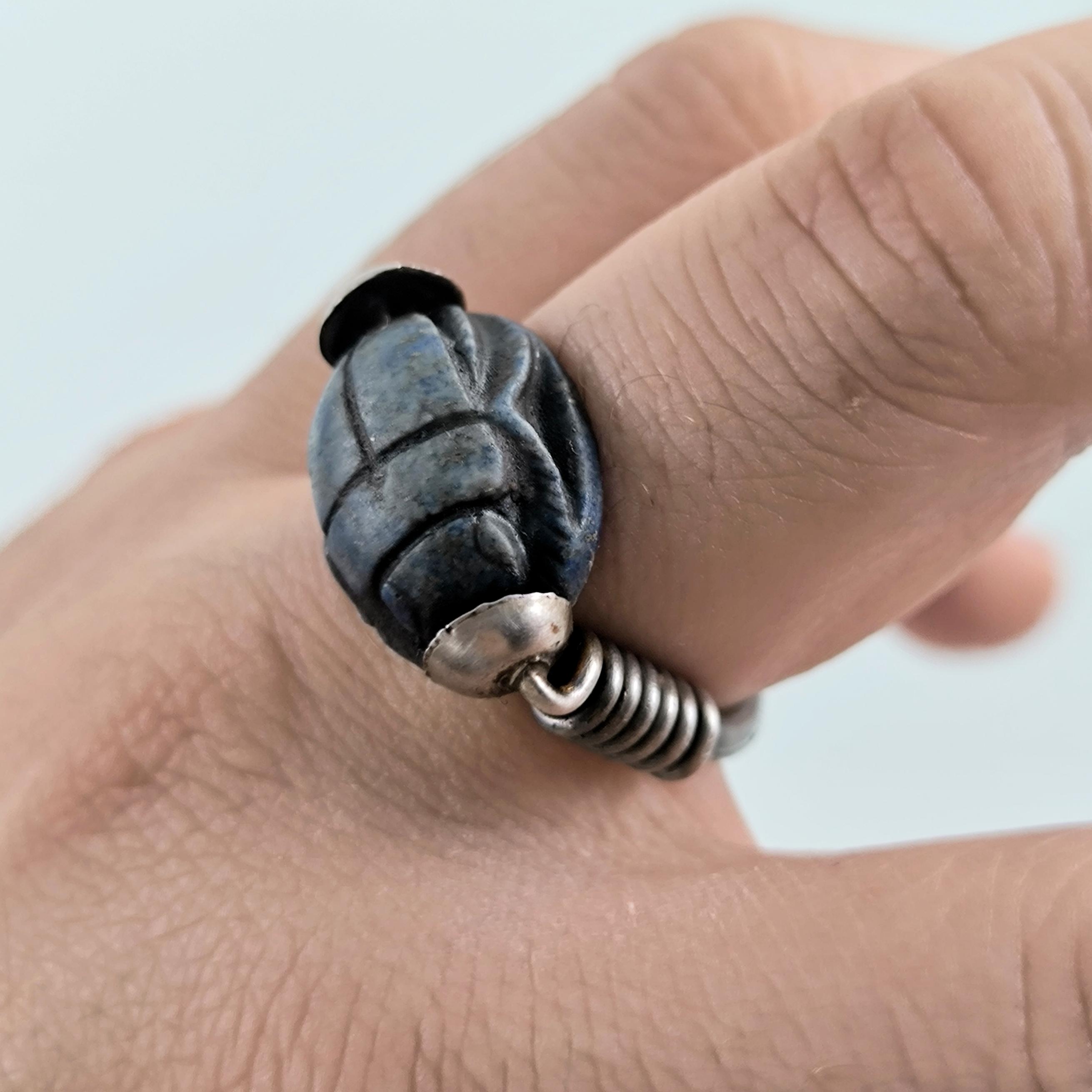 925 ayar gümüşten el işi olarak ürettiğimiz bu zarif tasarımda, doğal lapis lazuli taşına antik Mısır yüzükleri stilinde scarab oyması işledik. Dönerli formda tasarlanan taş, antik dönemdeki koruyucu mühür yüzüklerine gönderme yapar. Scarab figürü, yeniden doğuşun, ilahi bilincin ve ruhsal korumanın sembolüdür. Lapis’in derin mavi dokusu, gökyüzüyle tanrısal bilgeliği birleştirirken, el işçiliği gümüş form zamansız bir estetik yaratır.
