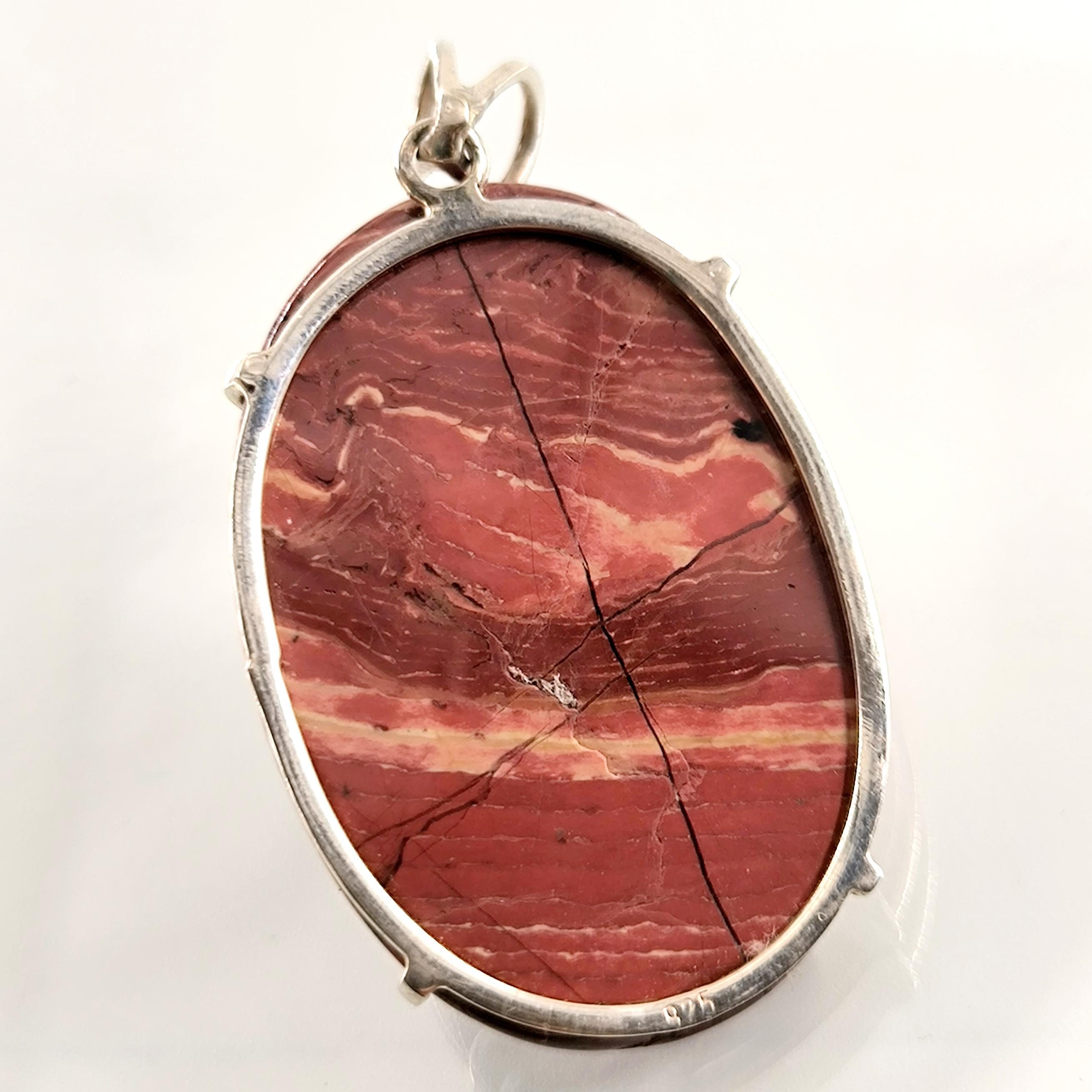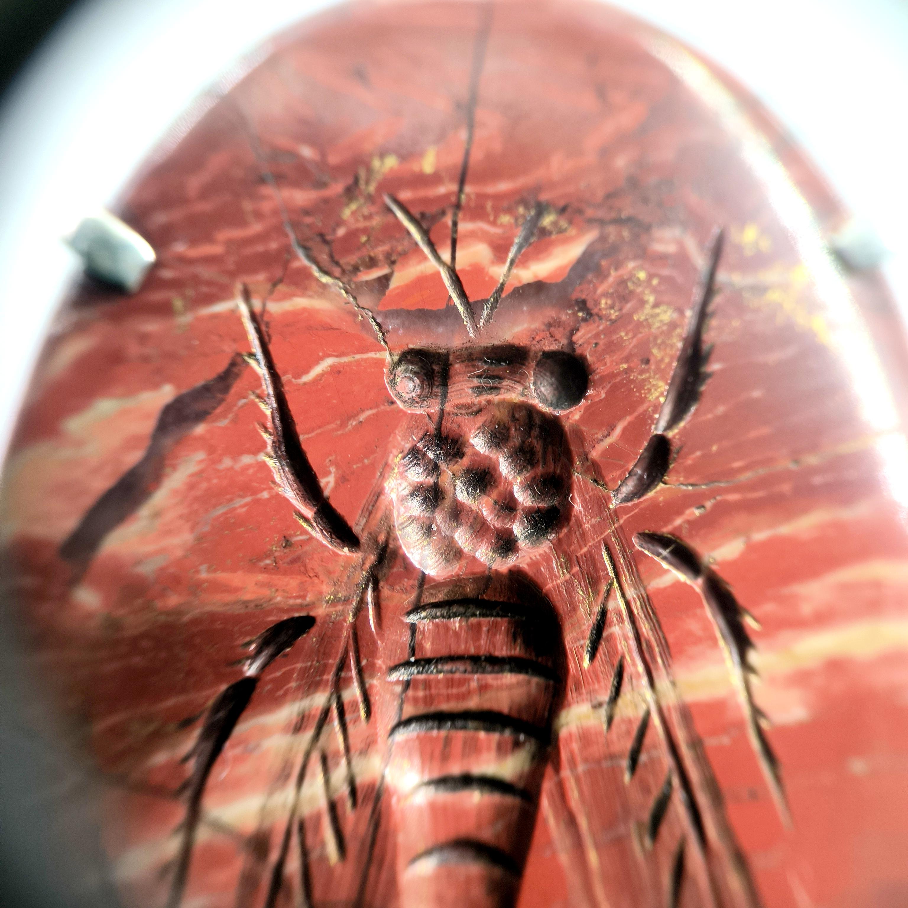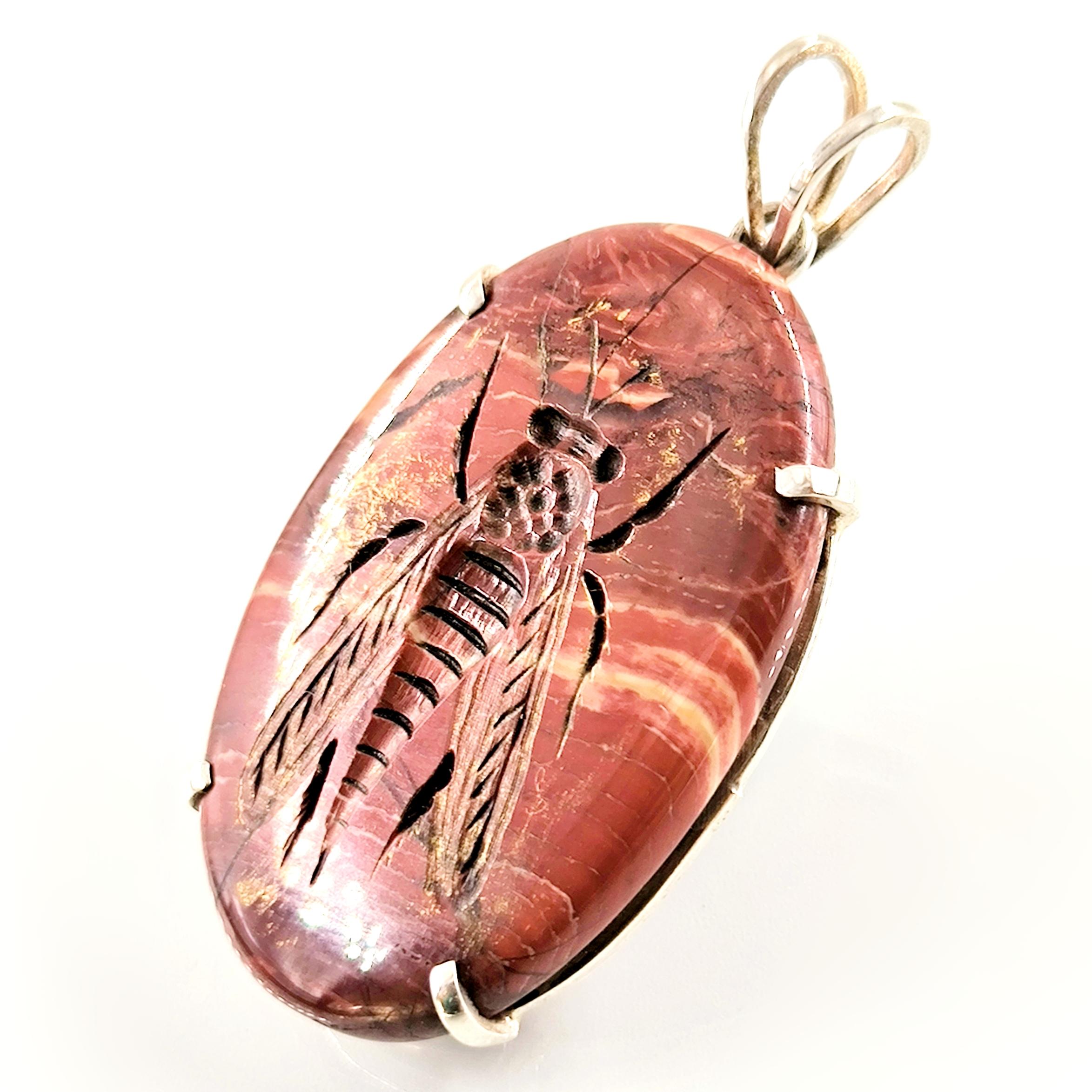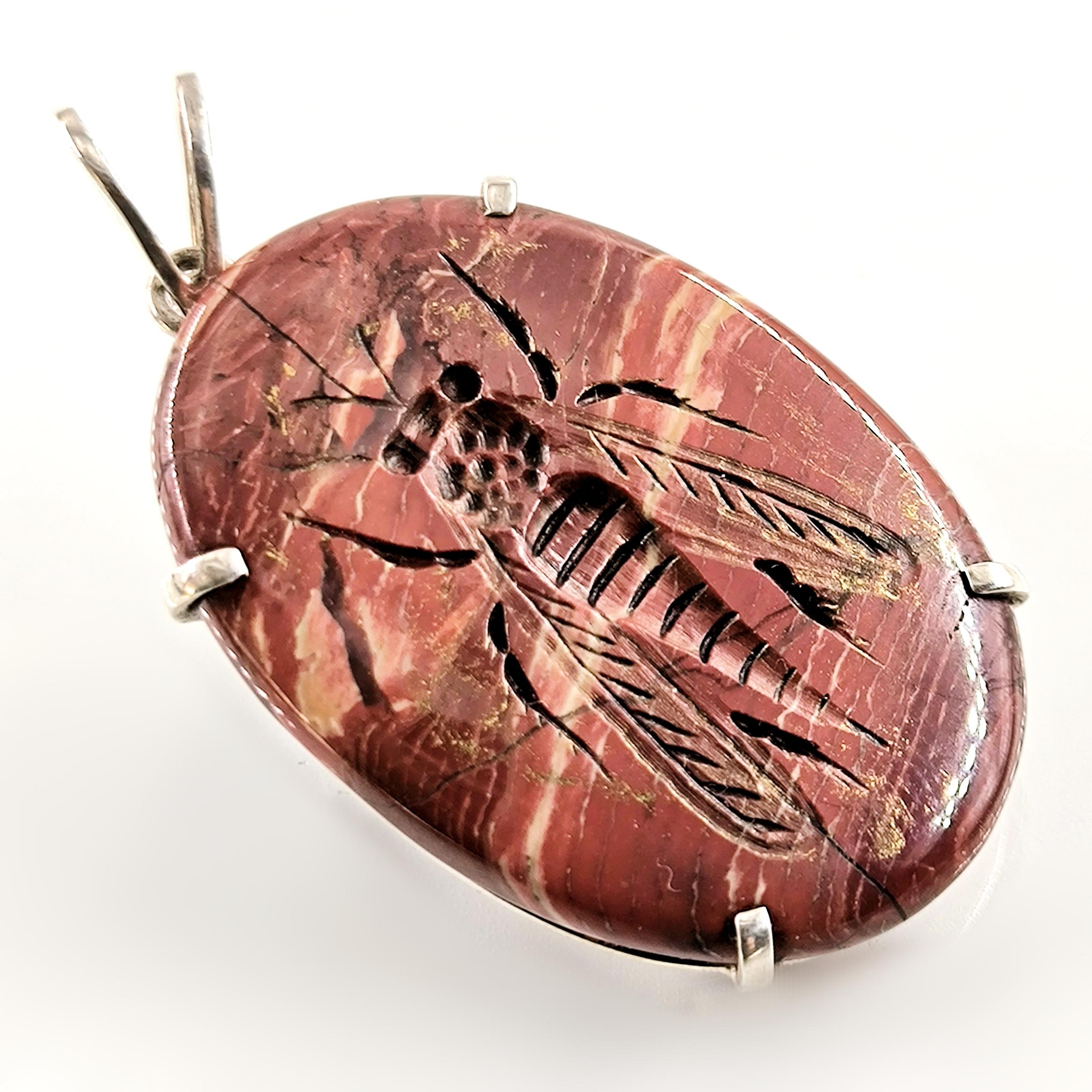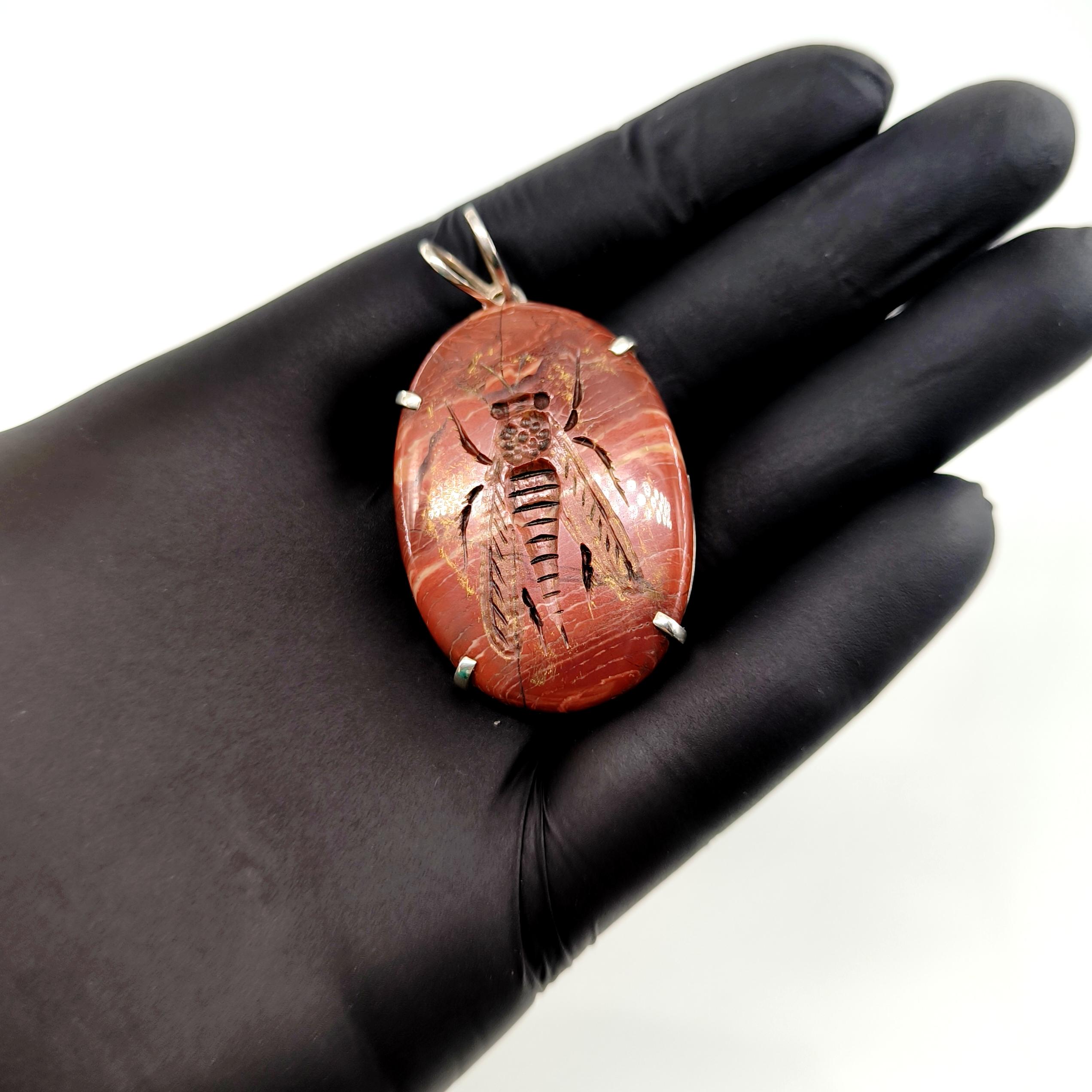 Bu eser, antik Efes’in bereket ve koruyucu ruhunu simgeleyen kutsal arı figürünü, doğal Jasper taşının kırmızı tonları üzerinde negatif intaglio tekniğiyle oyduğum özel bir kolyedir. Jasper’ın damarlarının oluşturduğu dramatik zemin, arının mistik varlığını daha da belirgin kılıyor; her çizgi bizzat el işçiliğidir ve taşın doğal karakterine sadık kalınarak işlenmiştir. Gümüş çerçeve ile tamamlanan form, hem modern hem arkaik bir güç hissettirir zamanı aşan bir ruh gibi. Ruhunda tarih taşıyanlar ve benzersizliği önemseyenler için tek ve eşsiz bir parça.