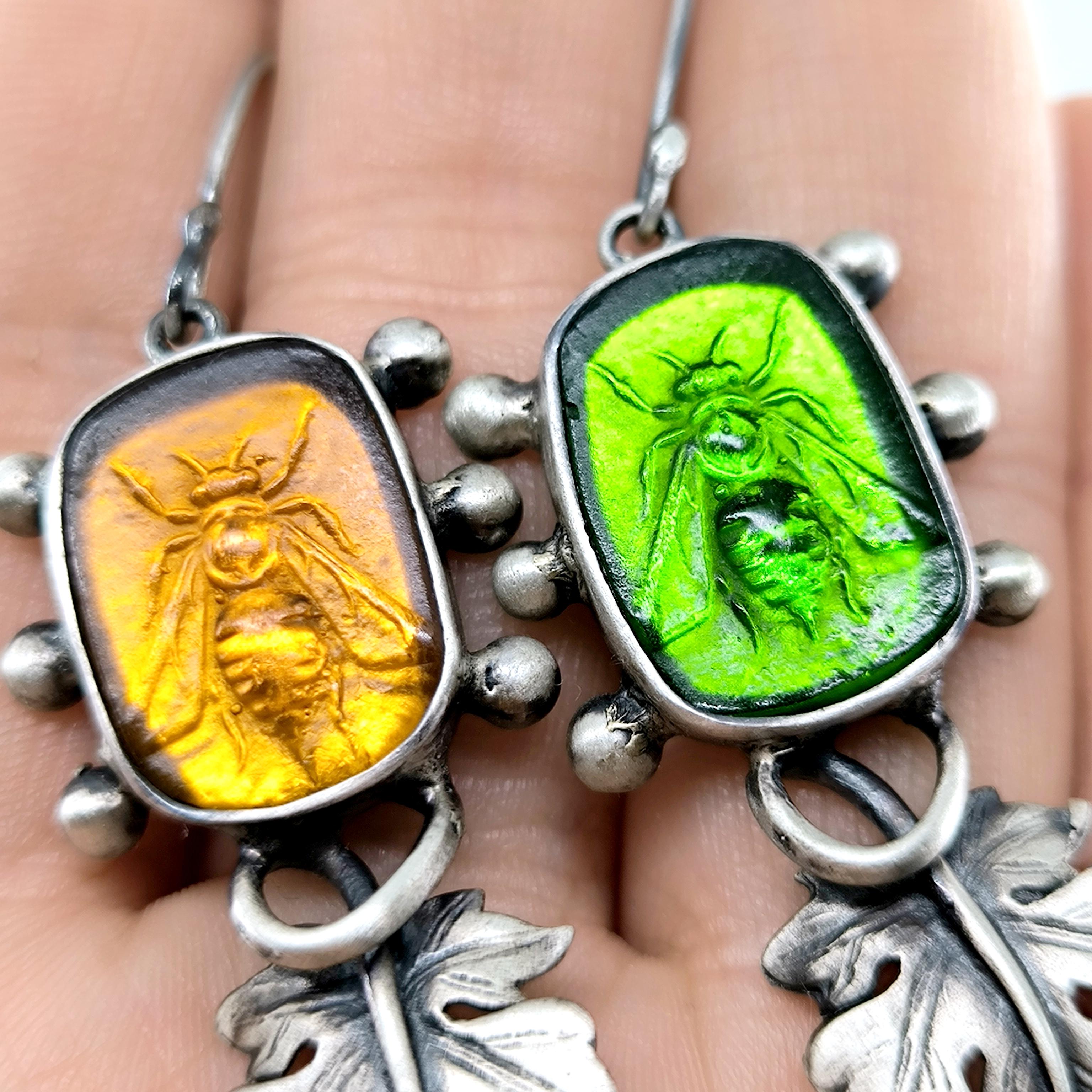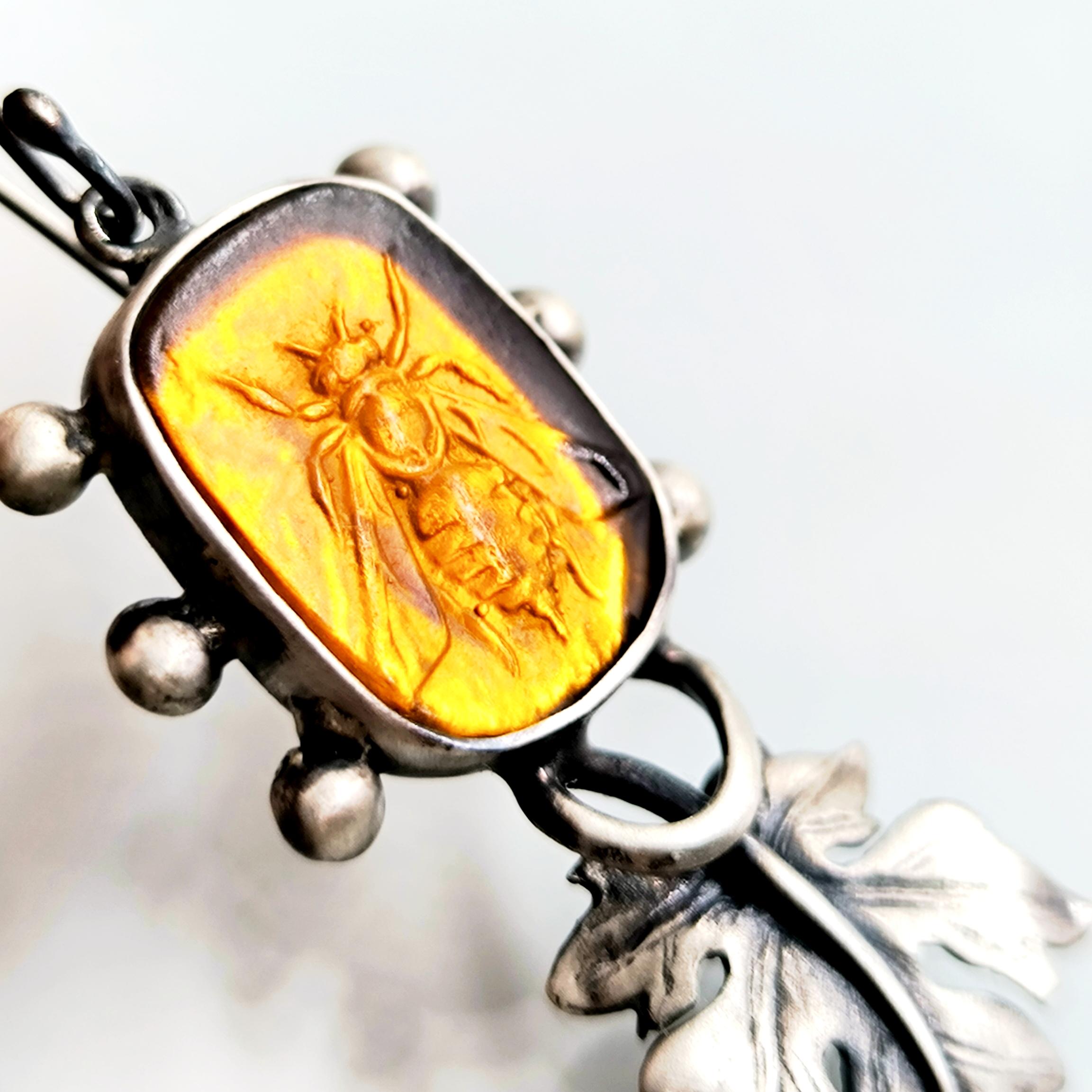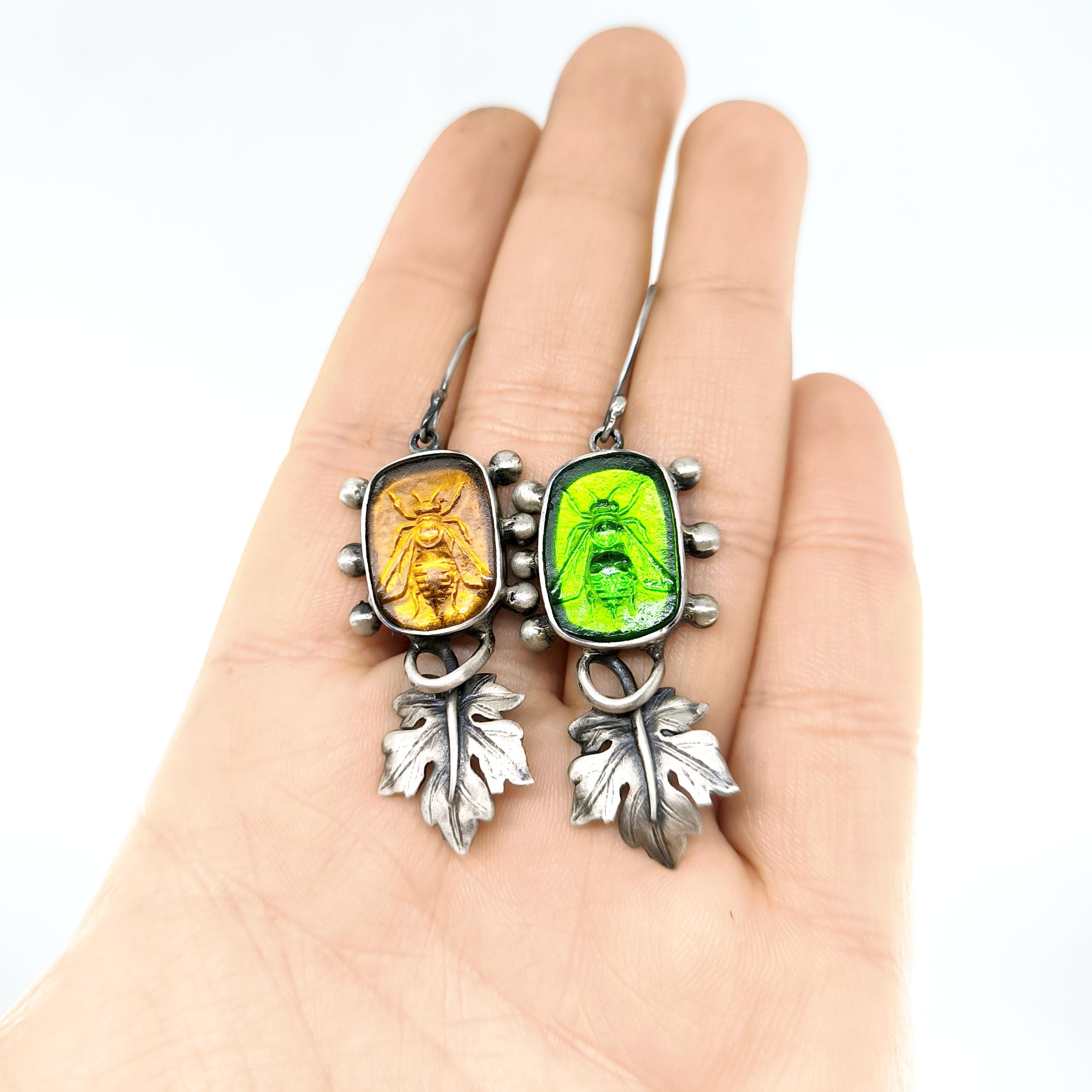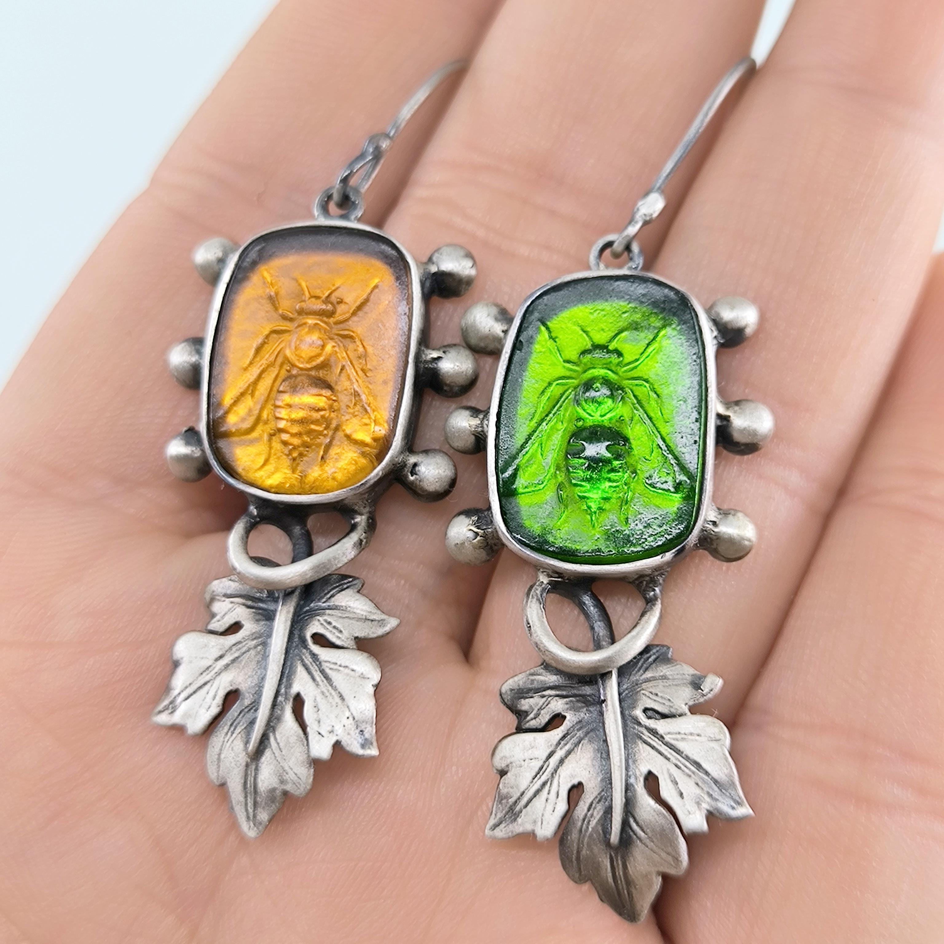 Antik Efes’in taş sokaklarında, bereketin ve ilahi korumanın sembolü olarak görülen Arı, tanrıların mesajını taşıyan kutsal bir varlık sayılırdı; onun uğultusu, şehrin kalbinde yaşayan görünmez bir dualar zinciri gibi yankılanırdı. Doğanın yaşam döngüsünü temsil eden asma yaprağıyla birleştiğinde, çalışkanlık, üretkenlik ve ruhsal uyanış aynı ritimde nefes alır. Cam taşların üzerine kabartma olarak işlenen bu Efes arısı figürü, yeşil ile sarının güçlü uyumuyla hayat bulur; yeşil doğanın yenilenmesini, sarı ise güneşin şifasını simgeler. Arkasına yerleştirilen özel folyo taban, ışığı çoğaltarak janjanlı ve göz alıcı bir yansıma yaratır; renkler her hareketle içten yanarak parıldar. El işçiliği 925 ayar gümüşten üretilen sallantılı tasarım, asma yaprağı detayıyla tamamlanmış tek ve özel bir koleksiyon parçasıdır.