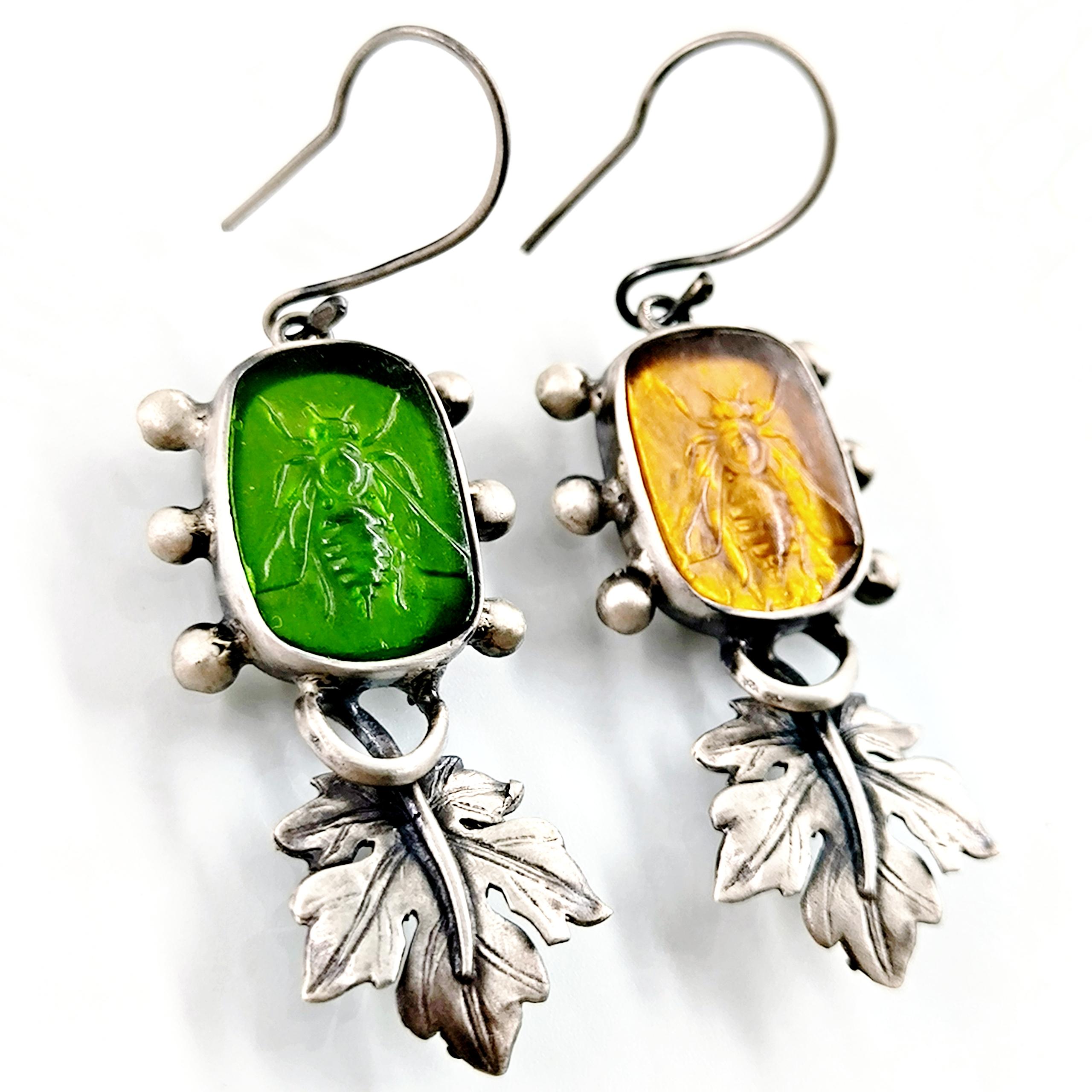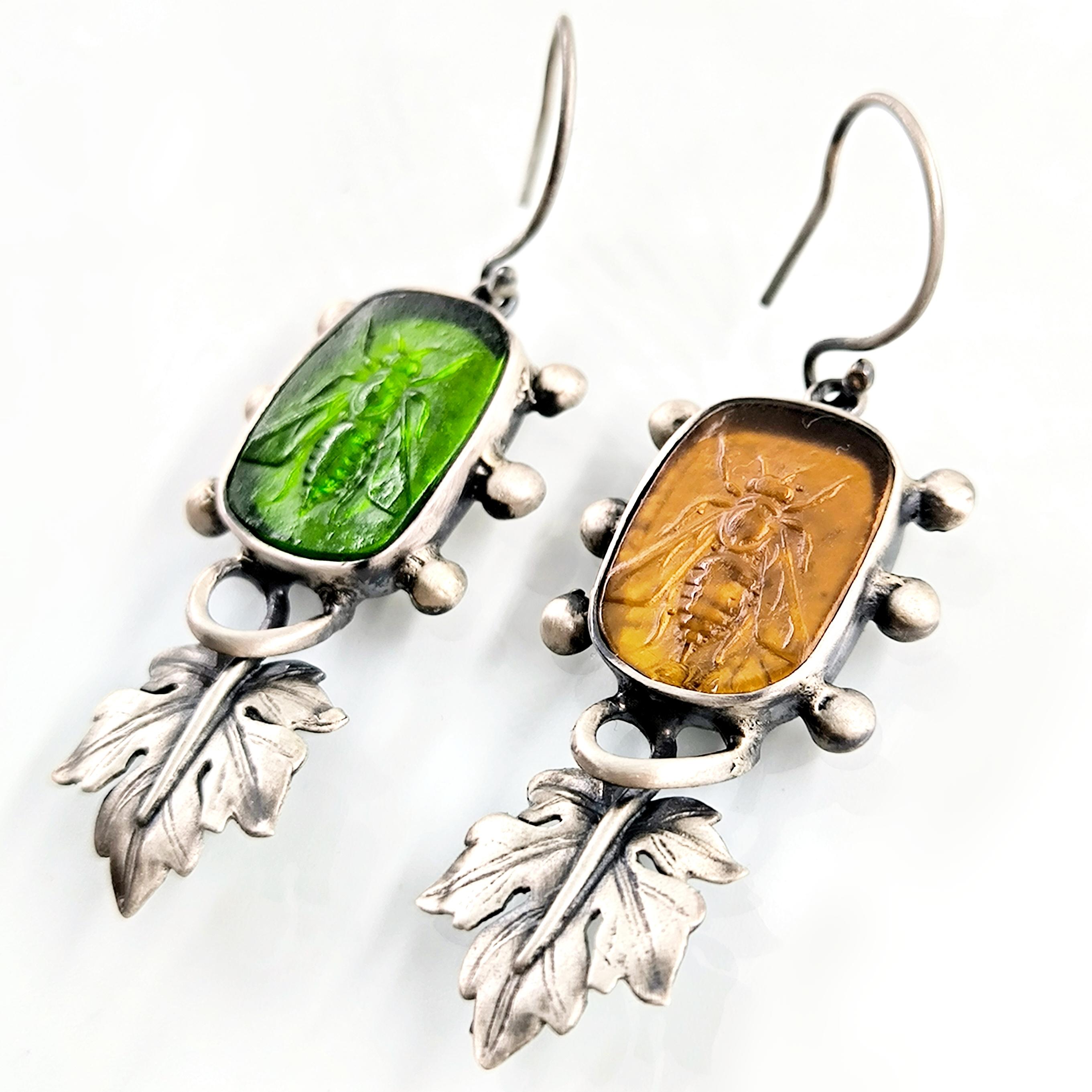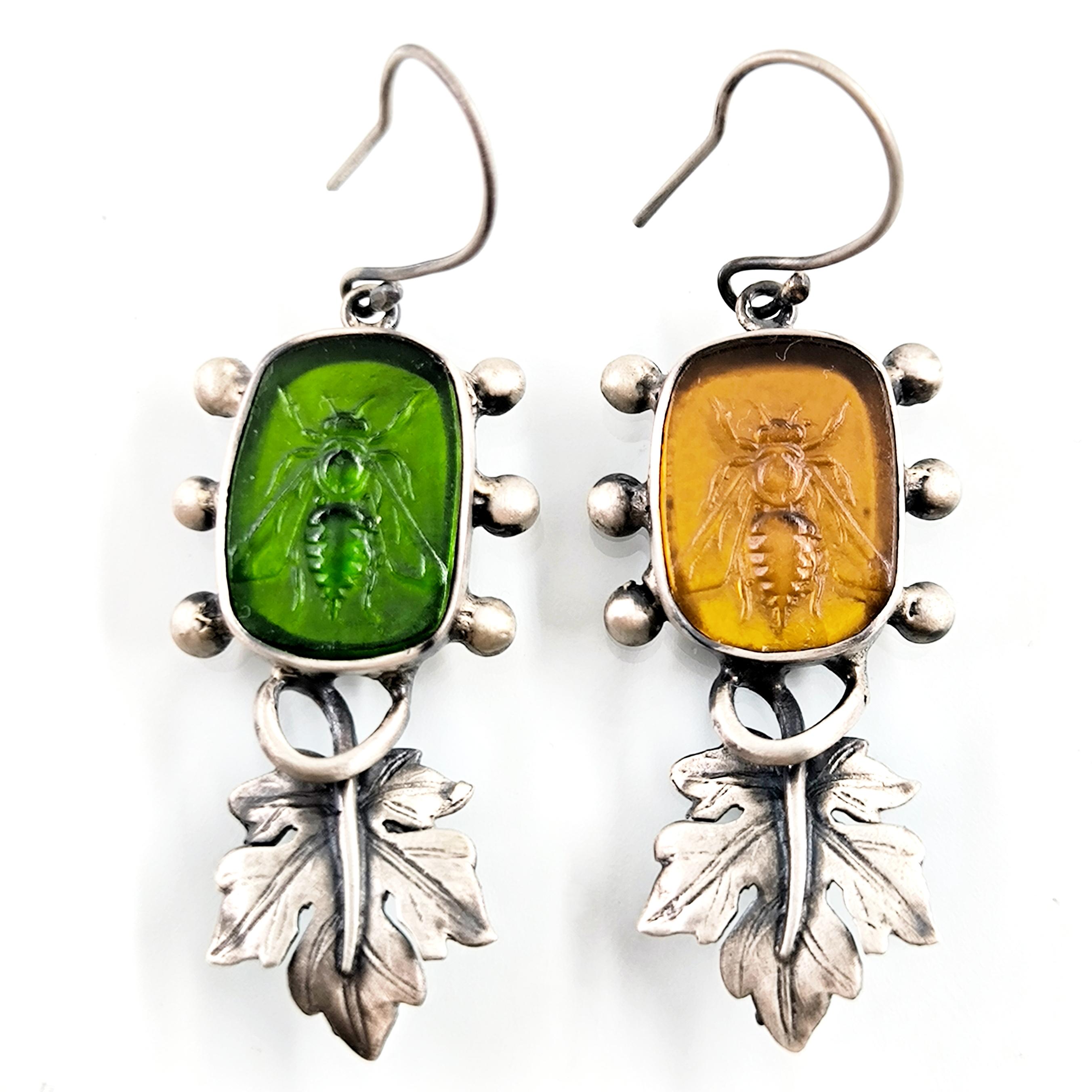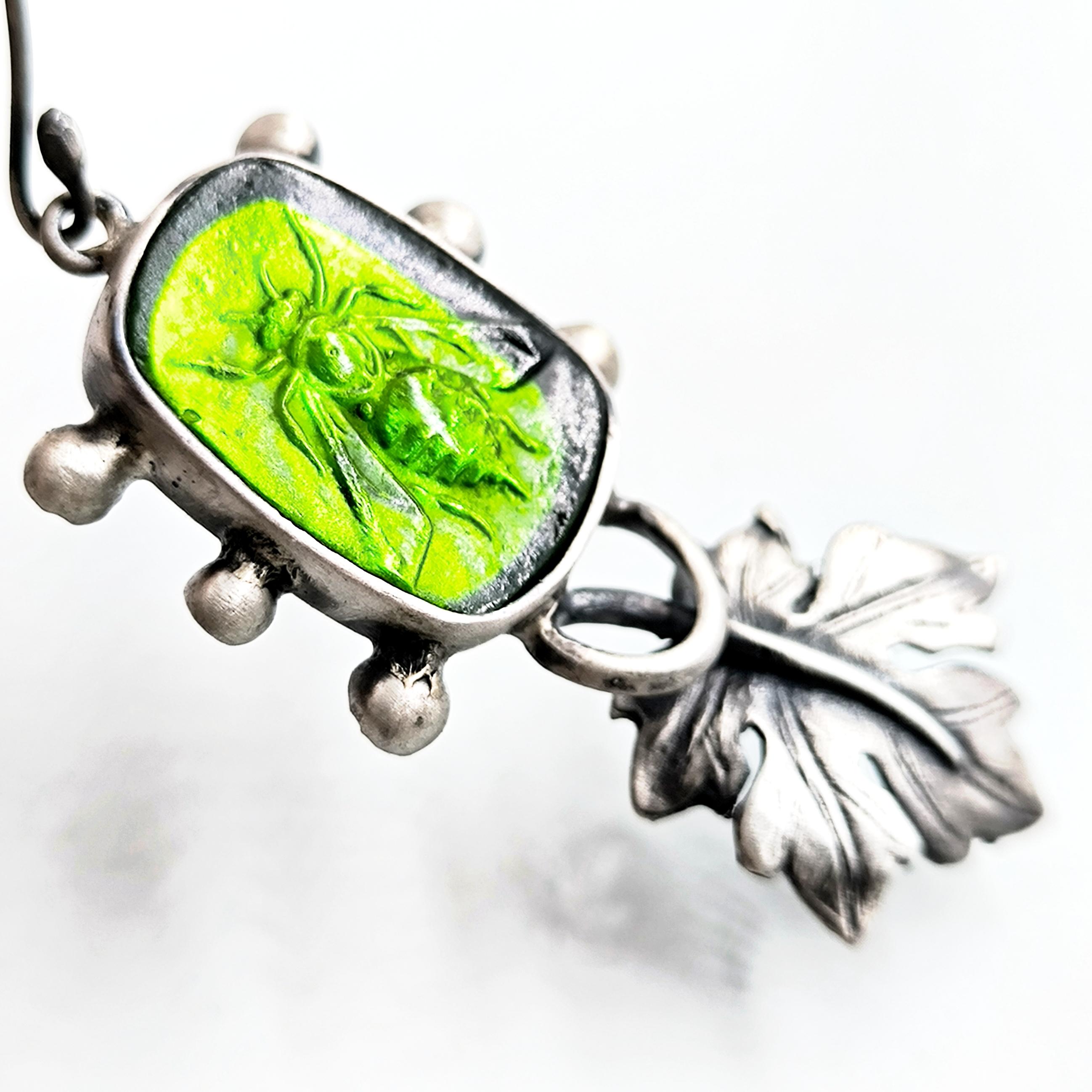 Antik Efes’in taş sokaklarında, bereketin ve ilahi korumanın sembolü olarak görülen Arı, tanrıların mesajını taşıyan kutsal bir varlık sayılırdı; onun uğultusu, şehrin kalbinde yaşayan görünmez bir dualar zinciri gibi yankılanırdı. Doğanın yaşam döngüsünü temsil eden asma yaprağıyla birleştiğinde, çalışkanlık, üretkenlik ve ruhsal uyanış aynı ritimde nefes alır. Cam taşların üzerine kabartma olarak işlenen bu Efes arısı figürü, yeşil ile sarının güçlü uyumuyla hayat bulur; yeşil doğanın yenilenmesini, sarı ise güneşin şifasını simgeler. Arkasına yerleştirilen özel folyo taban, ışığı çoğaltarak janjanlı ve göz alıcı bir yansıma yaratır; renkler her hareketle içten yanarak parıldar. El işçiliği 925 ayar gümüşten üretilen sallantılı tasarım, asma yaprağı detayıyla tamamlanmış tek ve özel bir koleksiyon parçasıdır.