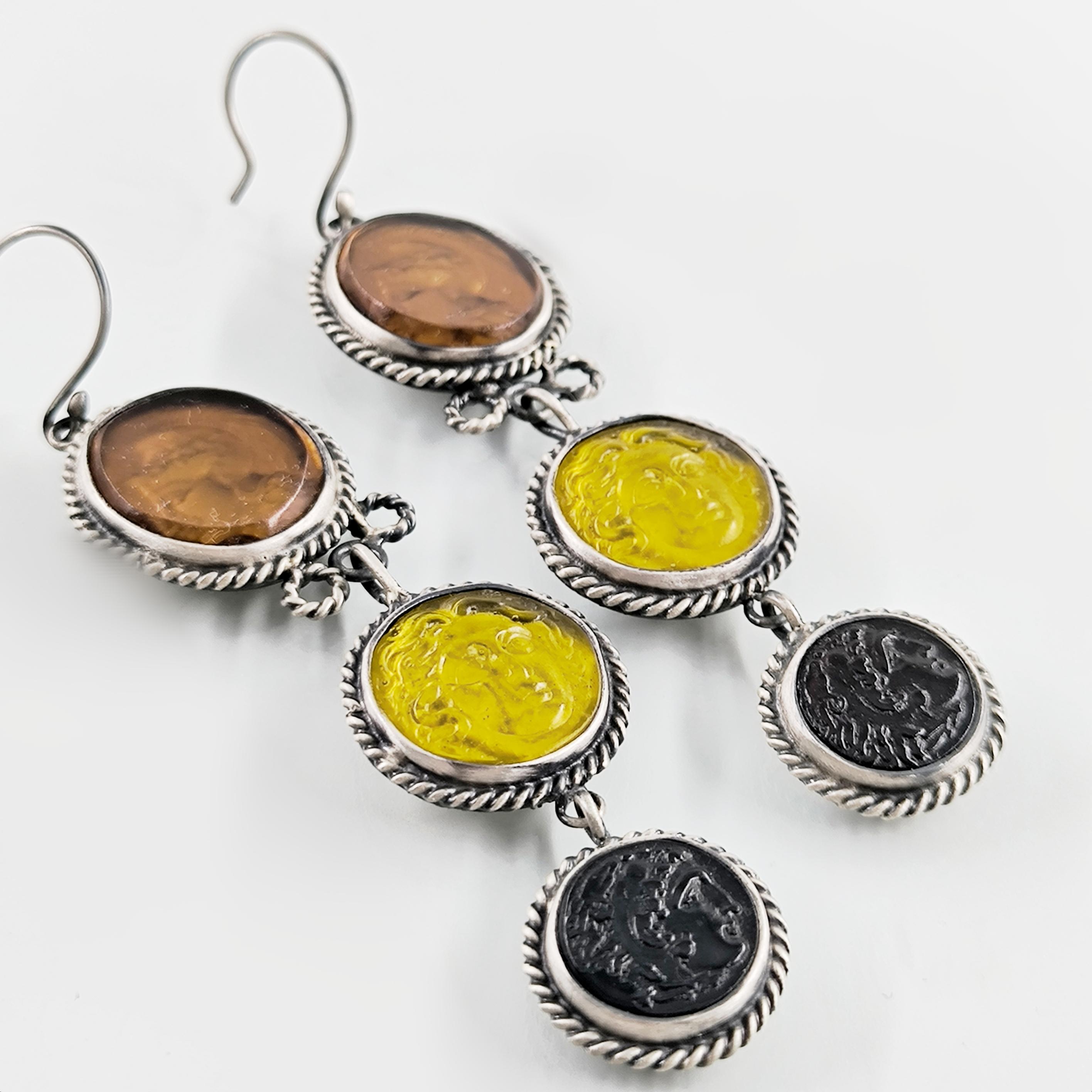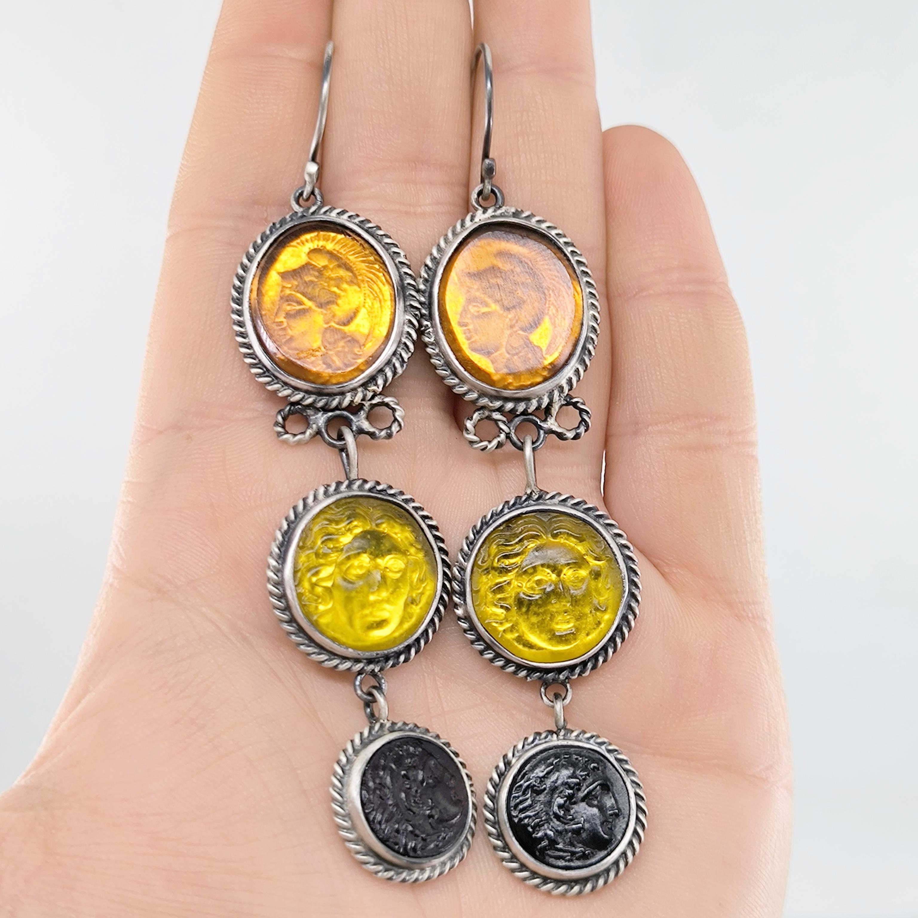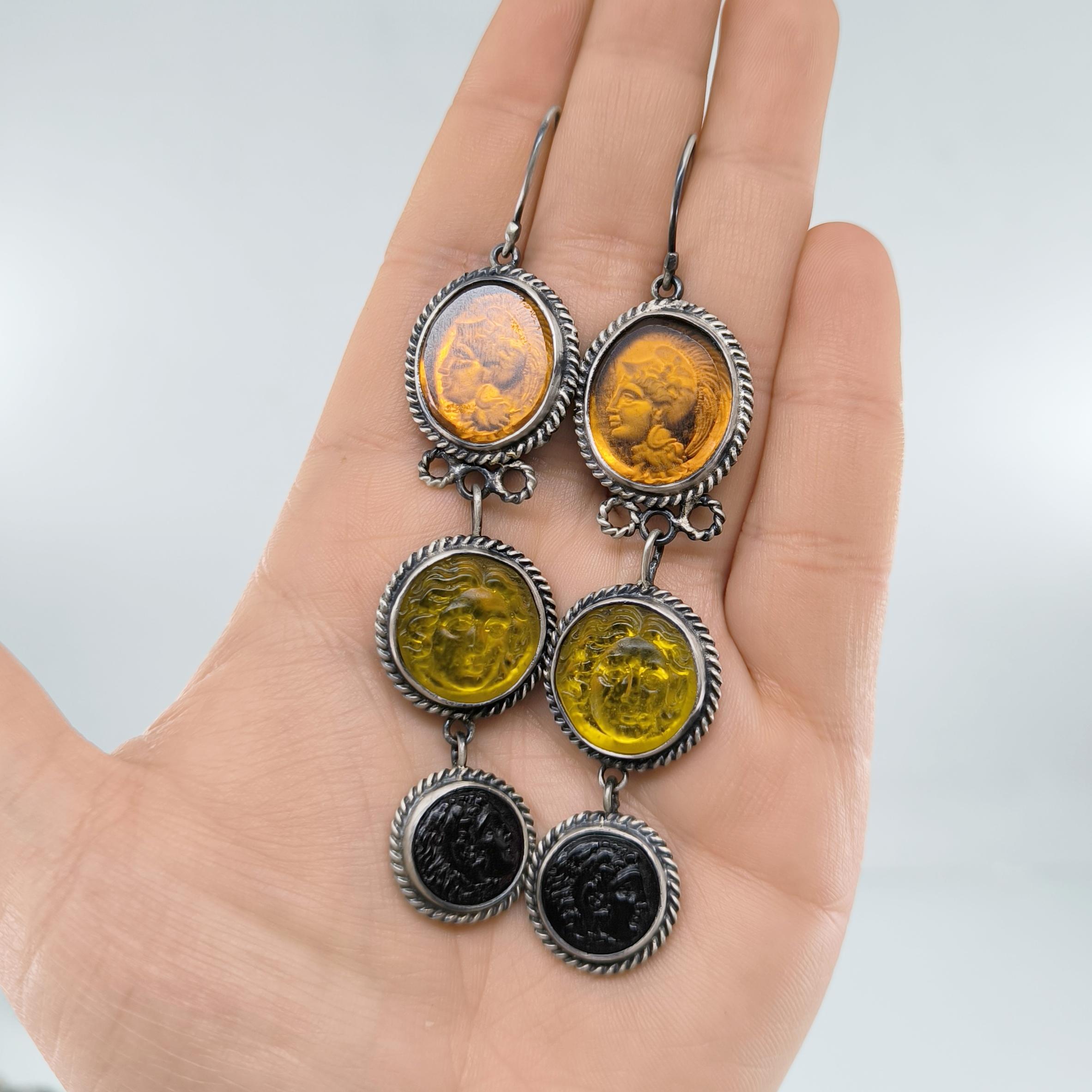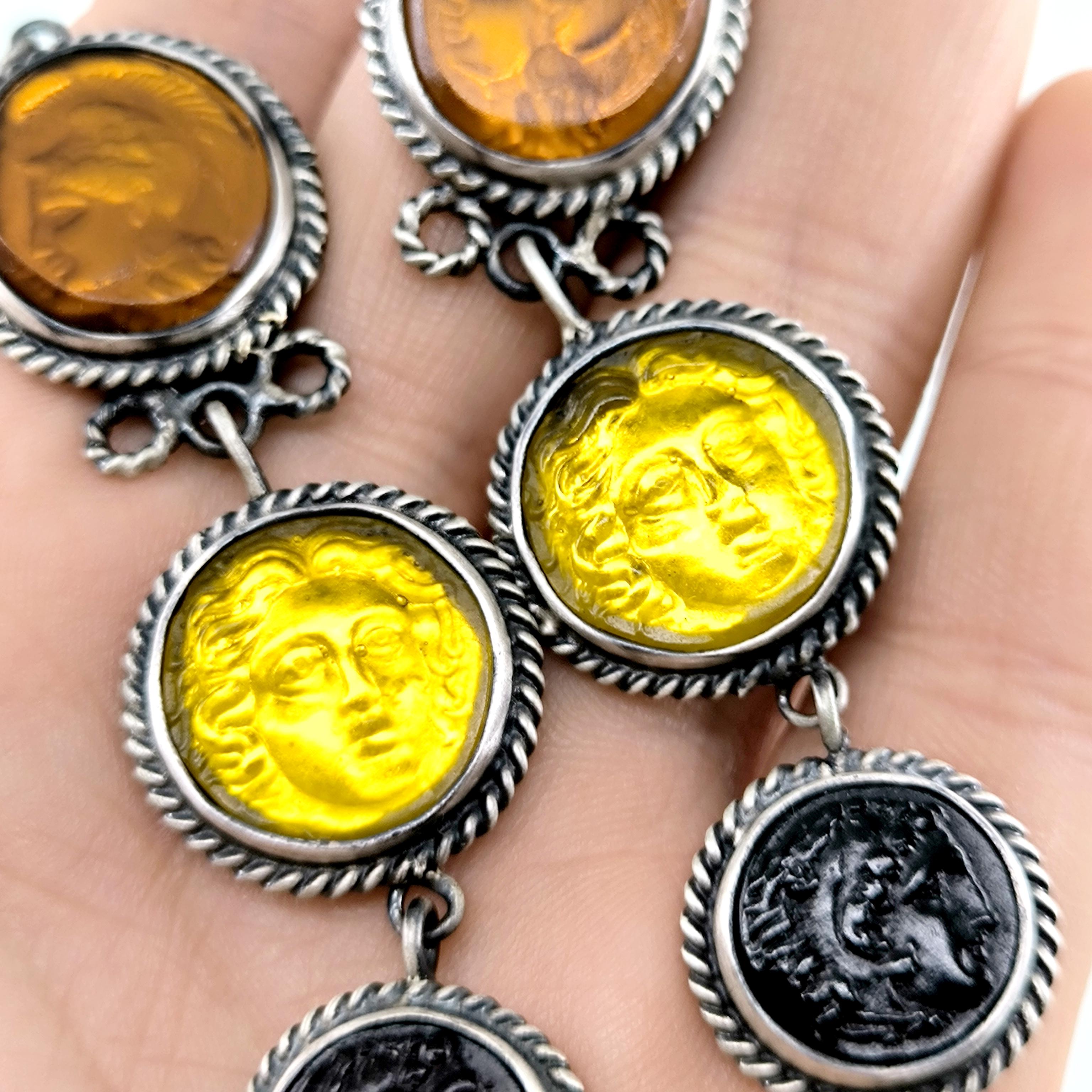 Antik dünyanın büyük kahramanları ve tanrıları! Athena’nın bilgeliği, Rodos’un koruyucu gücü ve İskender’in fetheden iradesi, kaderin ipliğini aynı gökyüzü altında birbirine bağlar. Turuncu, sarı ve siyahın büyülü uyumu, ateş, güneş ve gece arasında kurulmuş kadim bir dengeyi temsil eder. Figürlerin arkasına yerleştirilen özel folyo taban, cam taşların içindeki ışığı çoğaltarak janjanlı, canlı ve göz alıcı bir etki yaratır; her bakışta farklı bir renk yankısı görünür. Cam oyma figürlerin her biri tarihin büyük karakterlerini modern bir tılsım gibi taşırken, 925 ayar gümüş sallantılı tasarım zarif bir hareket ve güç hissi kazandırır. Tek ve özel tasarlanmış seçkin bir koleksiyon eseridir.
