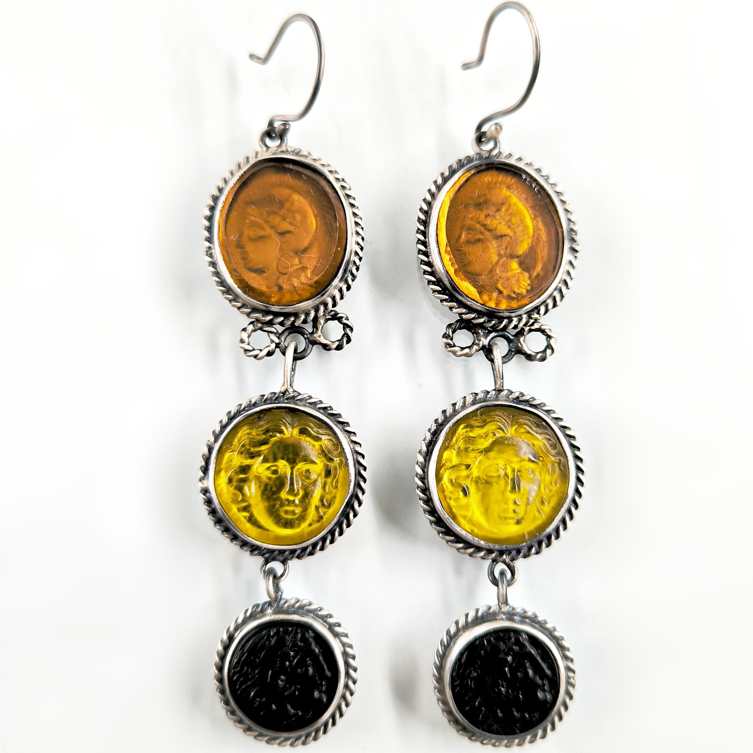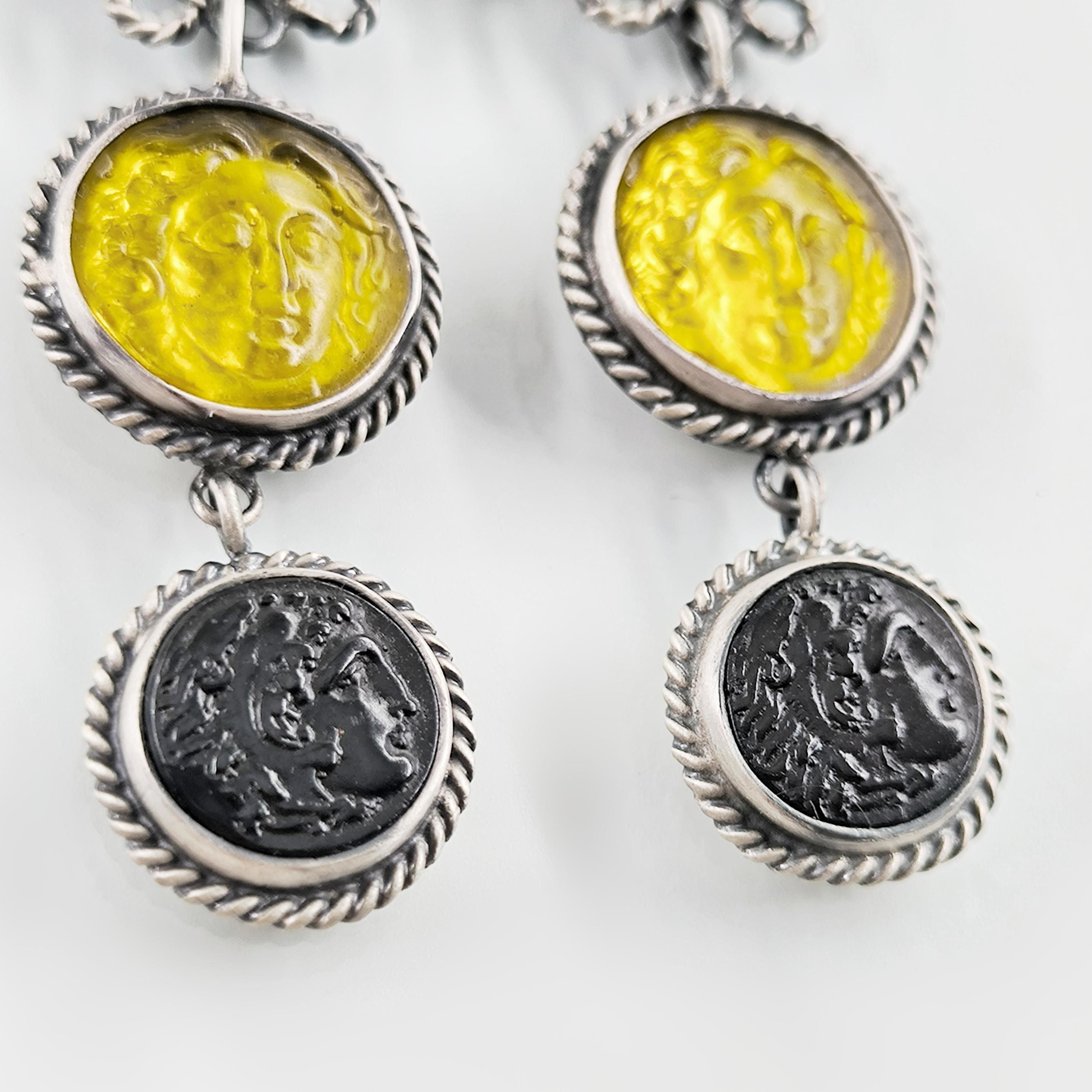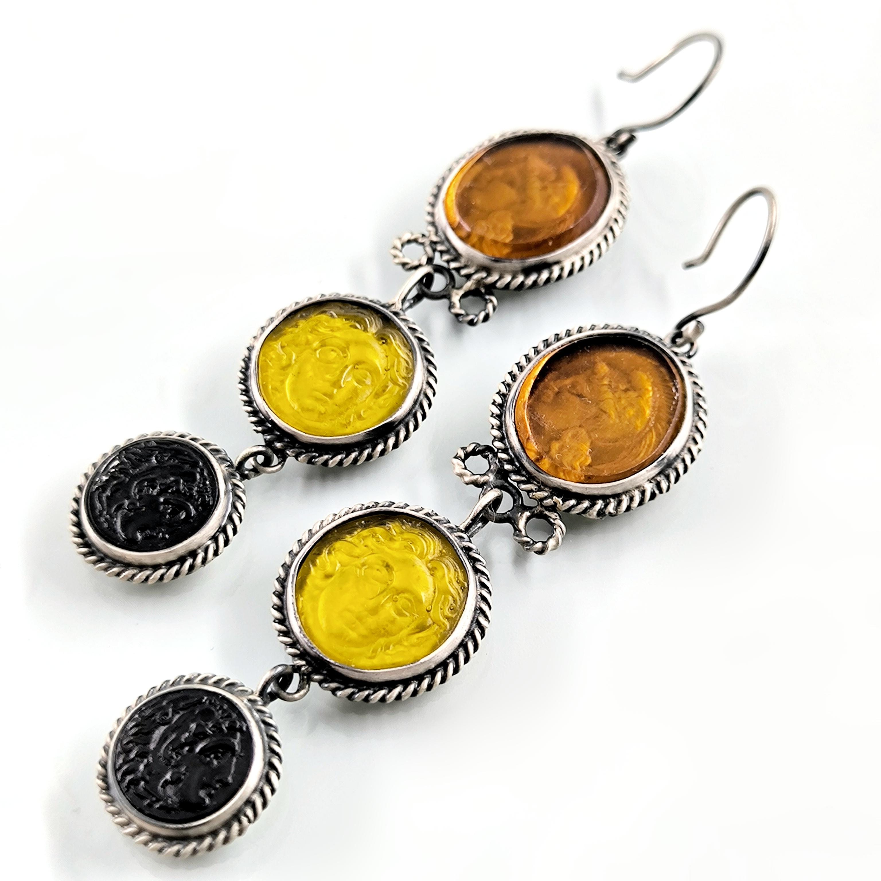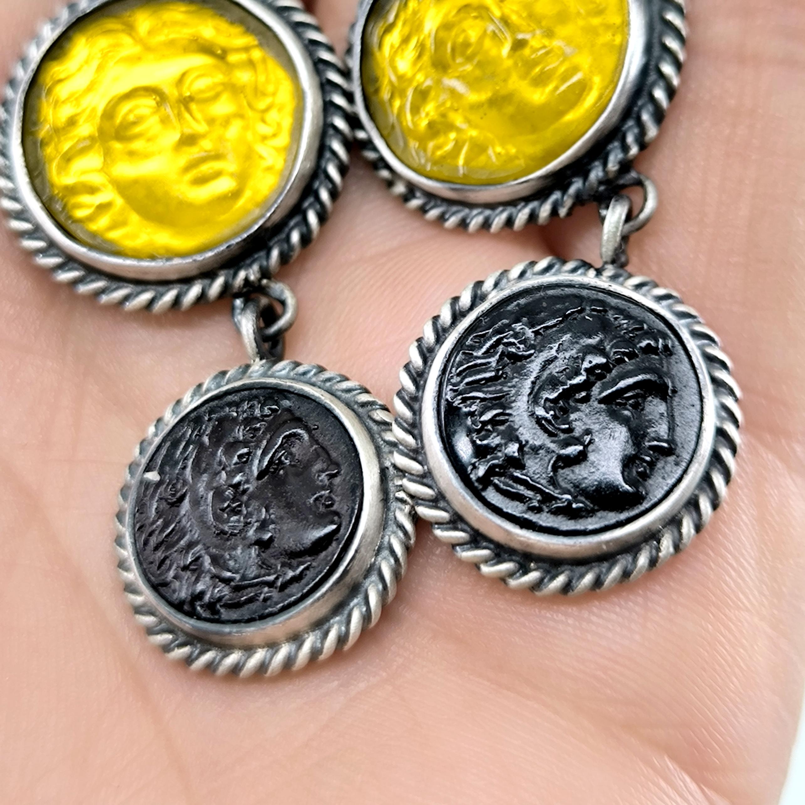 Antik dünyanın büyük kahramanları ve tanrıları! Athena’nın bilgeliği, Rodos’un koruyucu gücü ve İskender’in fetheden iradesi, kaderin ipliğini aynı gökyüzü altında birbirine bağlar. Turuncu, sarı ve siyahın büyülü uyumu, ateş, güneş ve gece arasında kurulmuş kadim bir dengeyi temsil eder. Figürlerin arkasına yerleştirilen özel folyo taban, cam taşların içindeki ışığı çoğaltarak janjanlı, canlı ve göz alıcı bir etki yaratır; her bakışta farklı bir renk yankısı görünür. Cam oyma figürlerin her biri tarihin büyük karakterlerini modern bir tılsım gibi taşırken, 925 ayar gümüş sallantılı tasarım zarif bir hareket ve güç hissi kazandırır. Tek ve özel tasarlanmış seçkin bir koleksiyon eseridir.