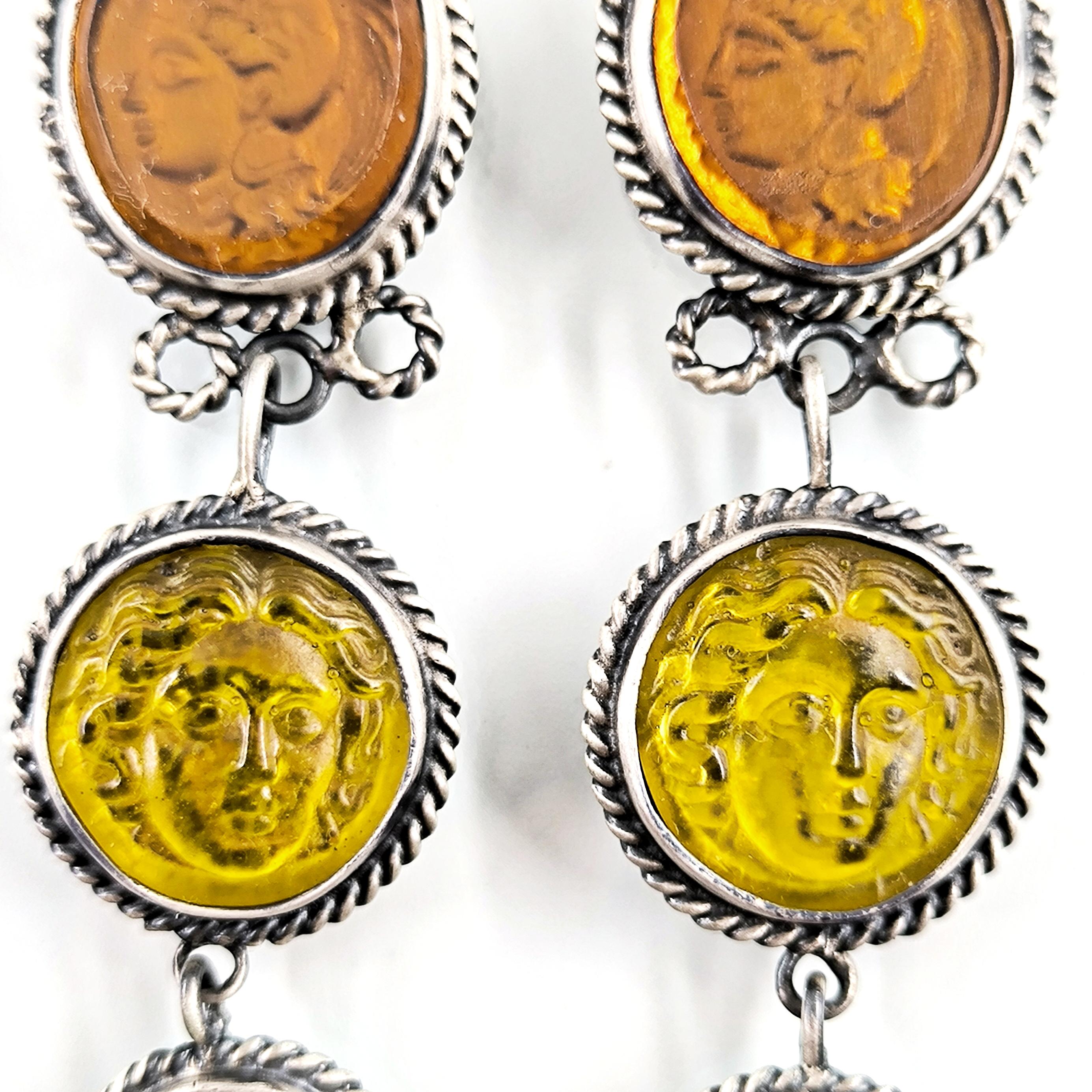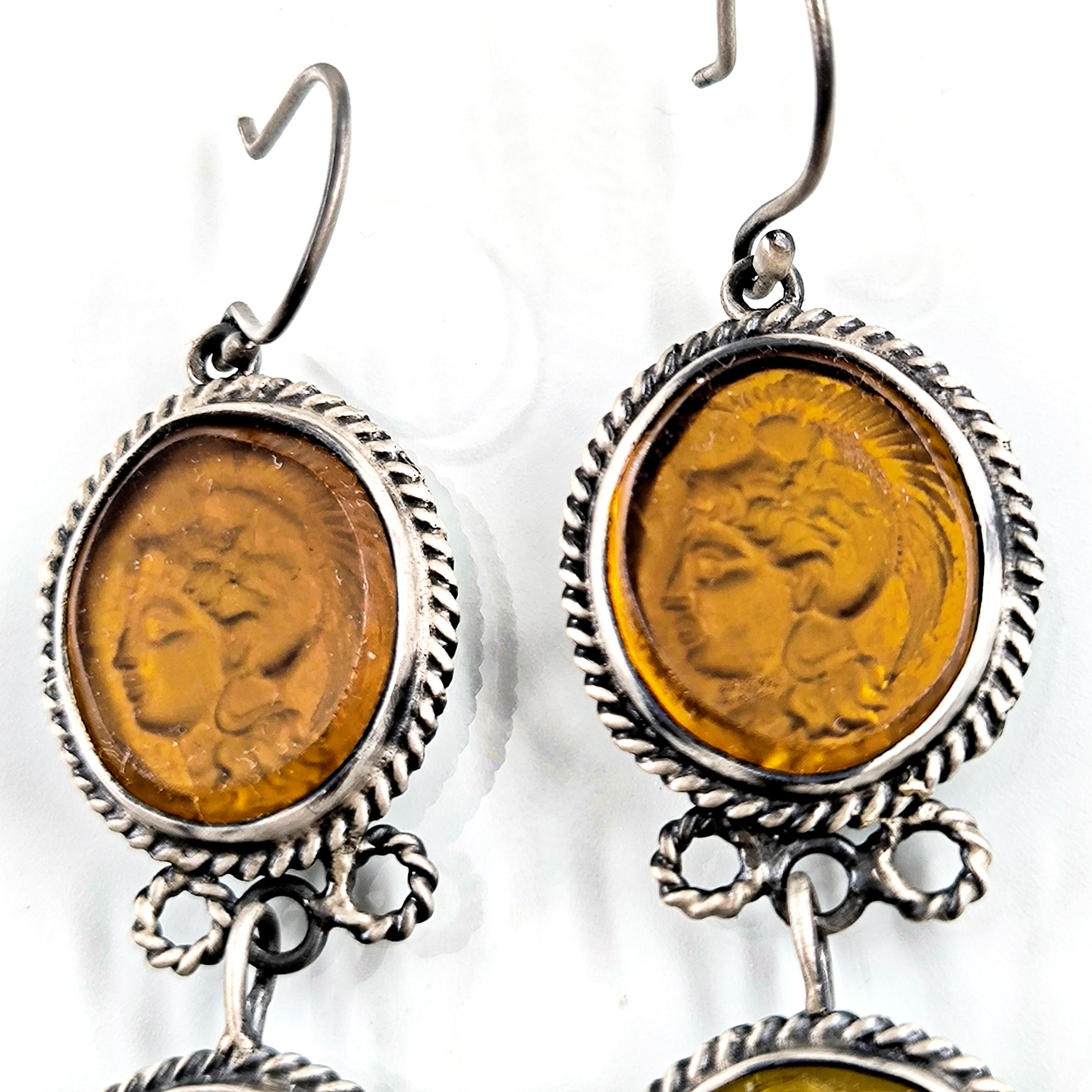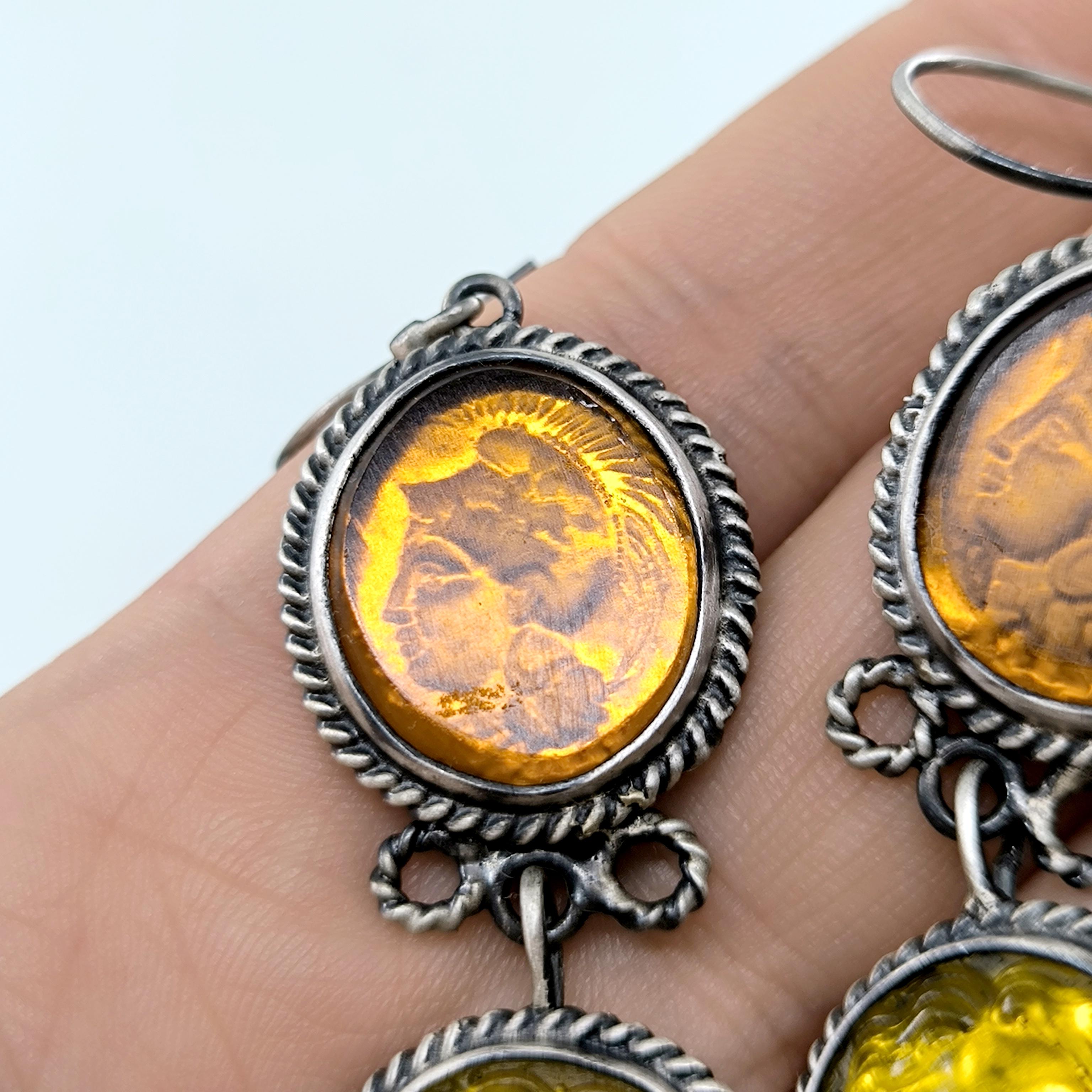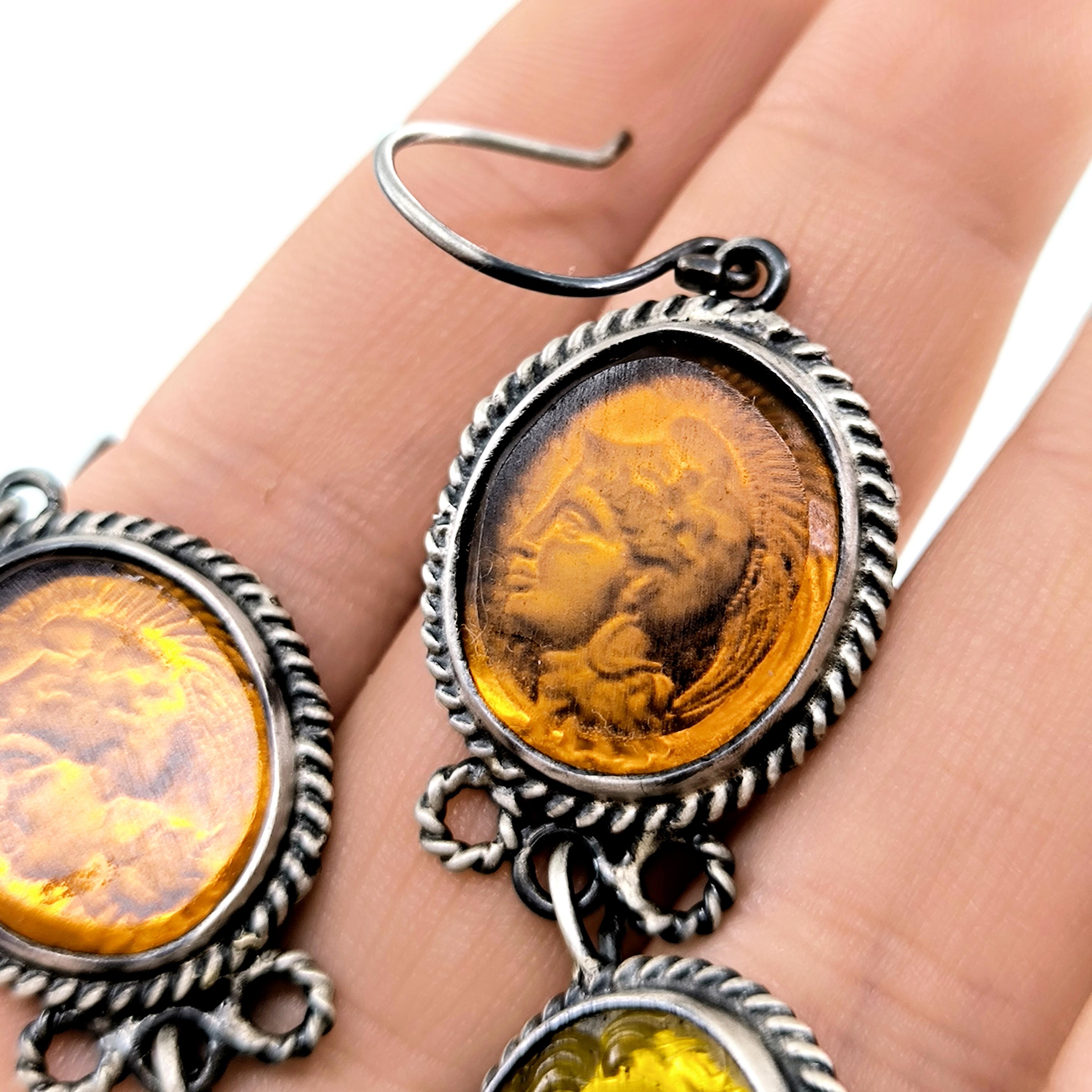 Antik dünyanın büyük kahramanları ve tanrıları! Athena’nın bilgeliği, Rodos’un koruyucu gücü ve İskender’in fetheden iradesi, kaderin ipliğini aynı gökyüzü altında birbirine bağlar. Turuncu, sarı ve siyahın büyülü uyumu, ateş, güneş ve gece arasında kurulmuş kadim bir dengeyi temsil eder. Figürlerin arkasına yerleştirilen özel folyo taban, cam taşların içindeki ışığı çoğaltarak janjanlı, canlı ve göz alıcı bir etki yaratır; her bakışta farklı bir renk yankısı görünür. Cam oyma figürlerin her biri tarihin büyük karakterlerini modern bir tılsım gibi taşırken, 925 ayar gümüş sallantılı tasarım zarif bir hareket ve güç hissi kazandırır. Tek ve özel tasarlanmış seçkin bir koleksiyon eseridir.