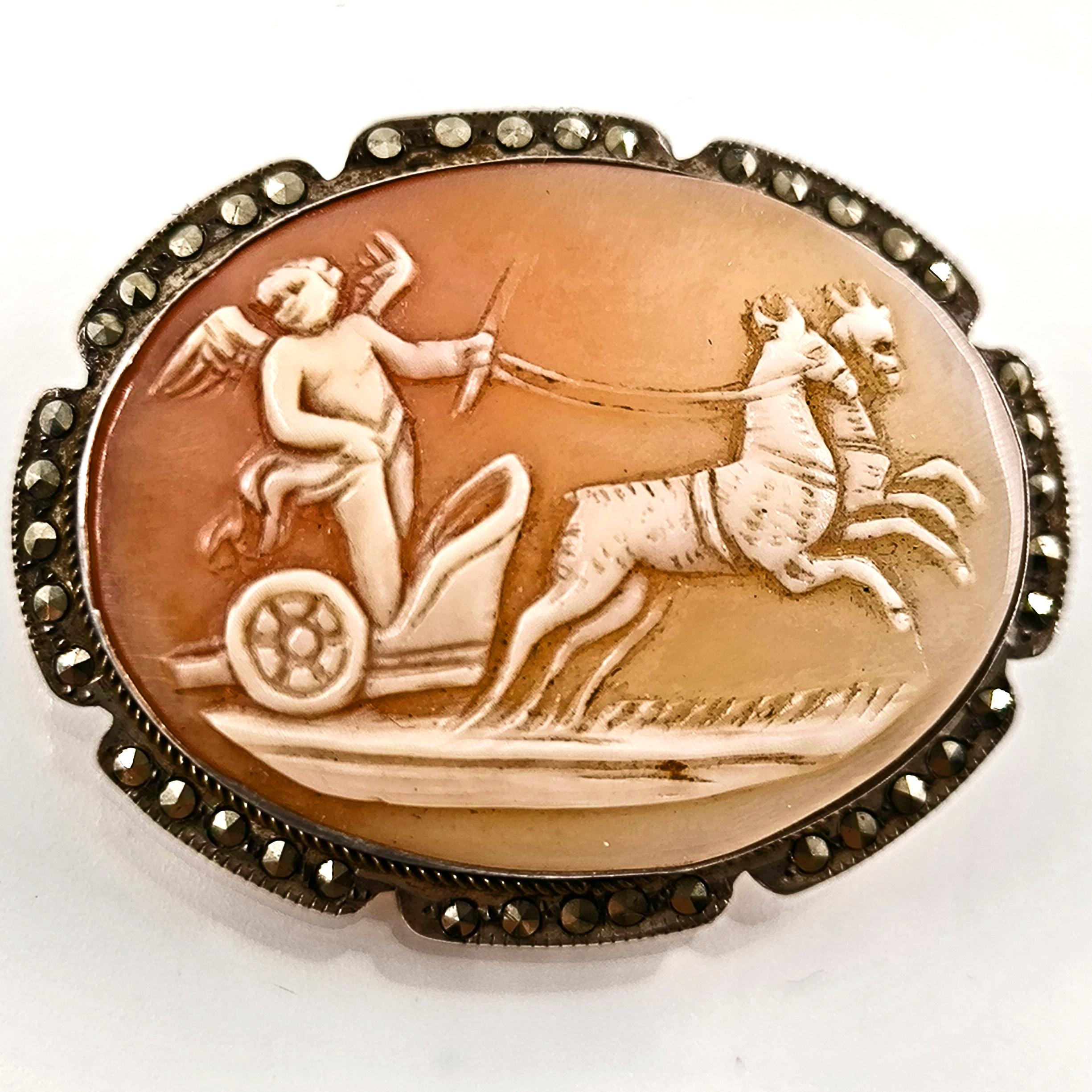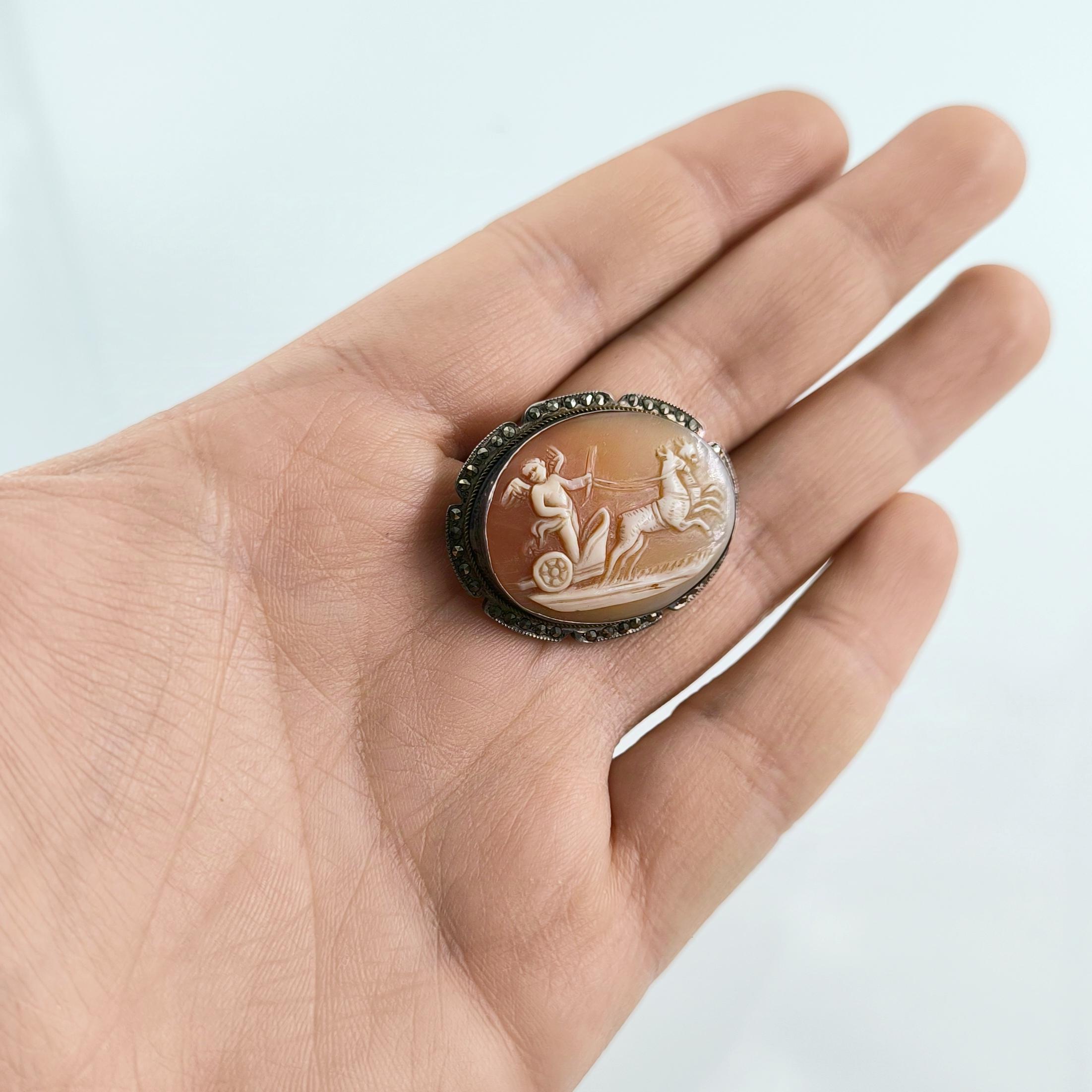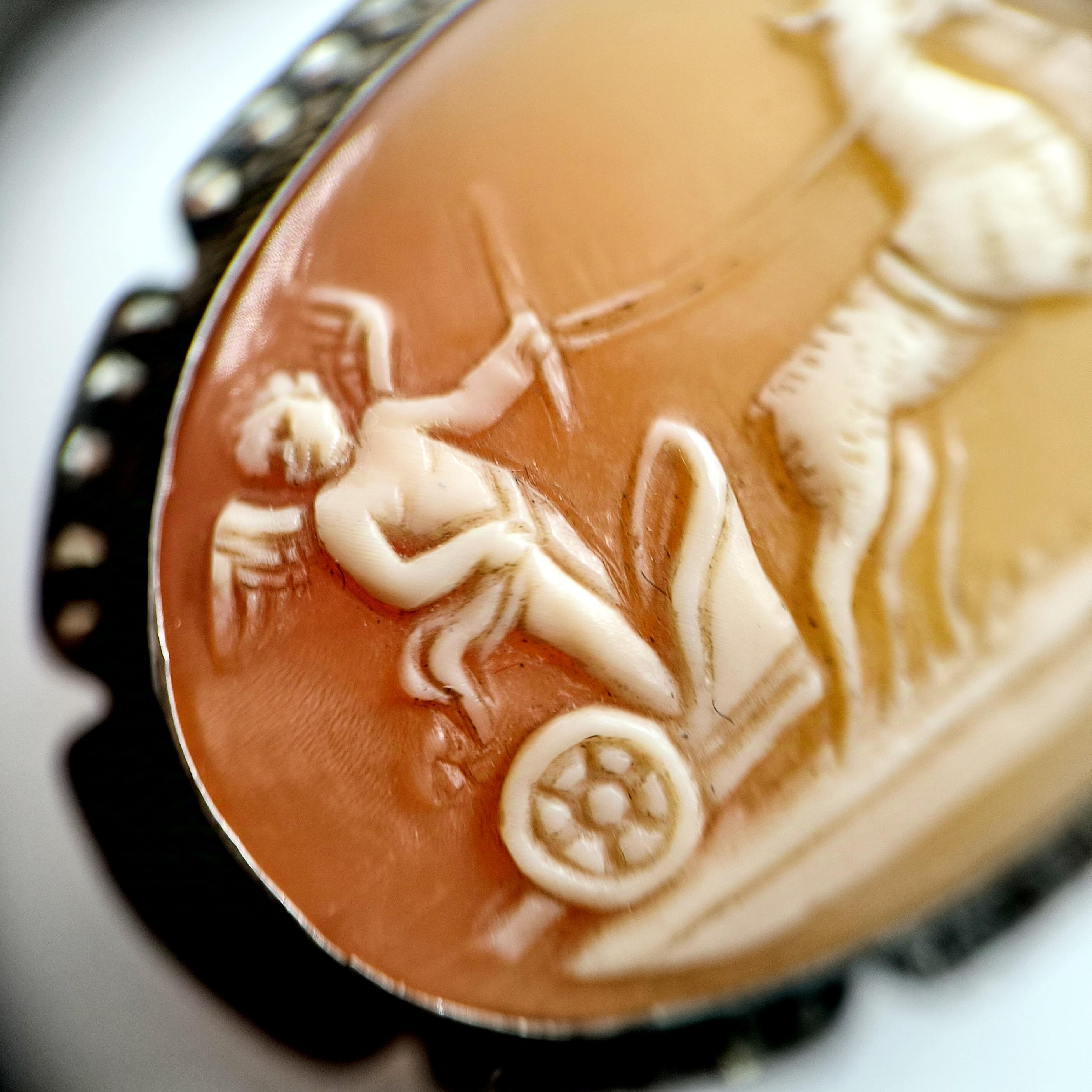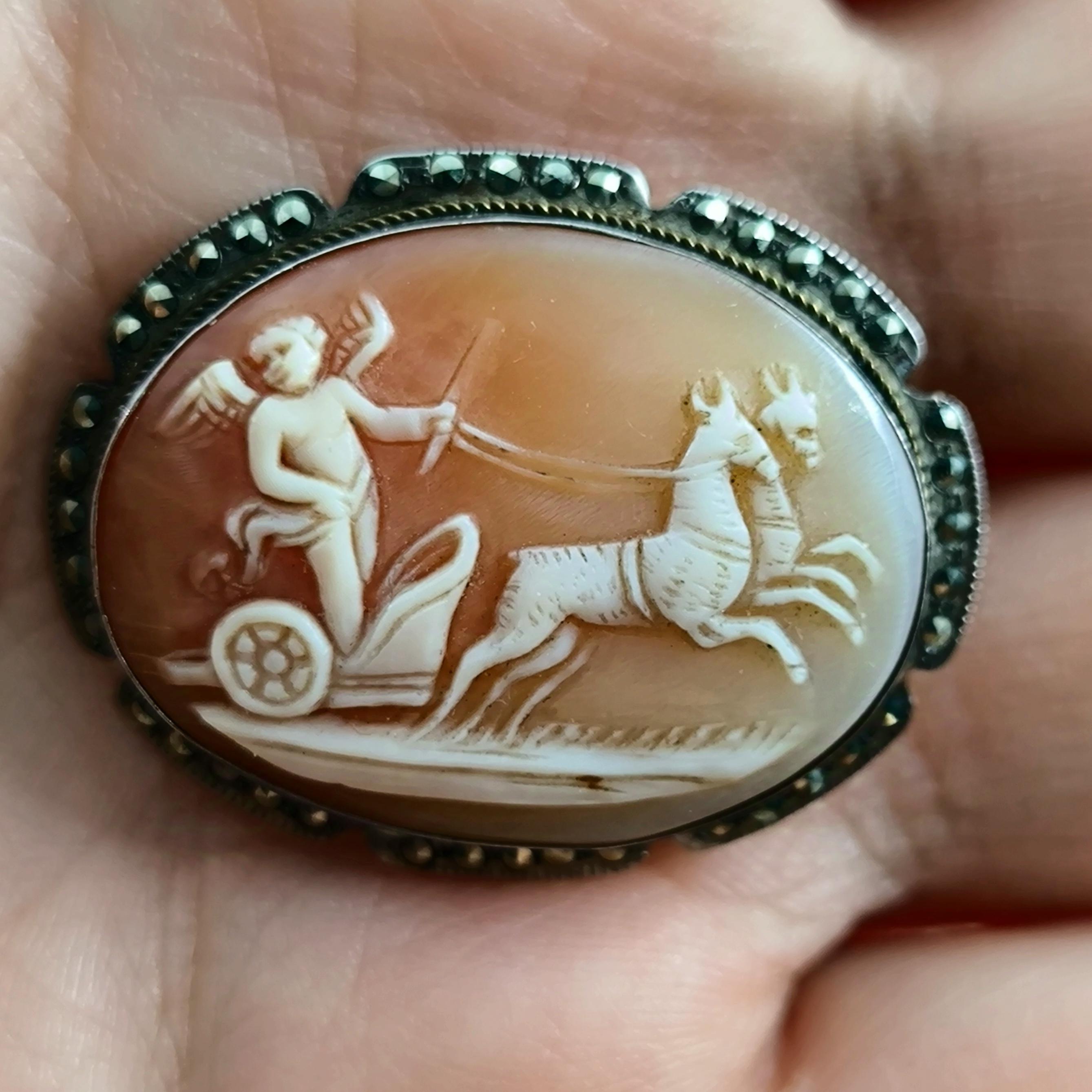 Eşsiz bir Antika Cameo mücevher ! Deniz kabuğu Üzerine "savaş arabası süren Eros" rölyefi çalışılmış & Avrupa yapımı gerçek bir antika mücevher! Çerçevesi markazit taşlarla süslü hem kolye hem broş olarak kullanılabilecek eşsiz bir cameo!