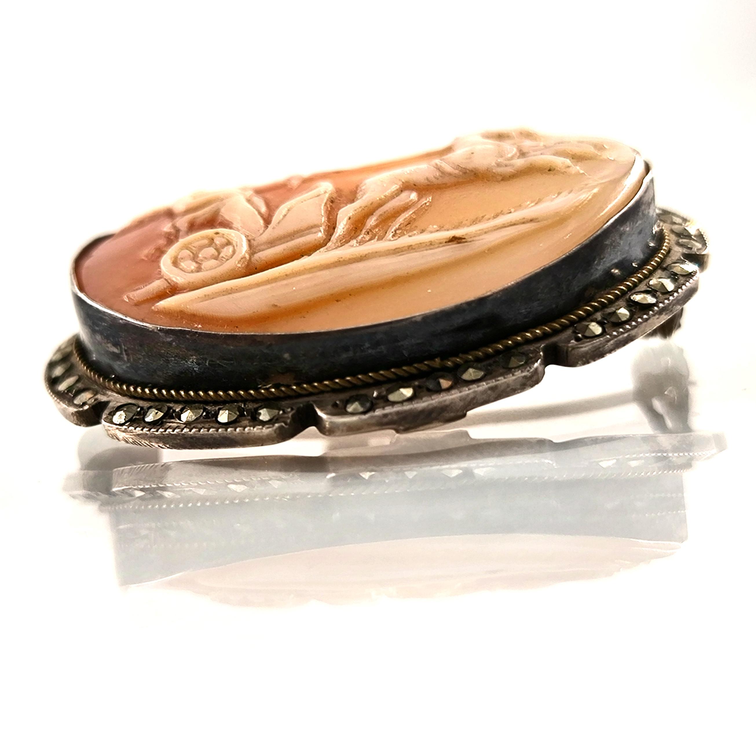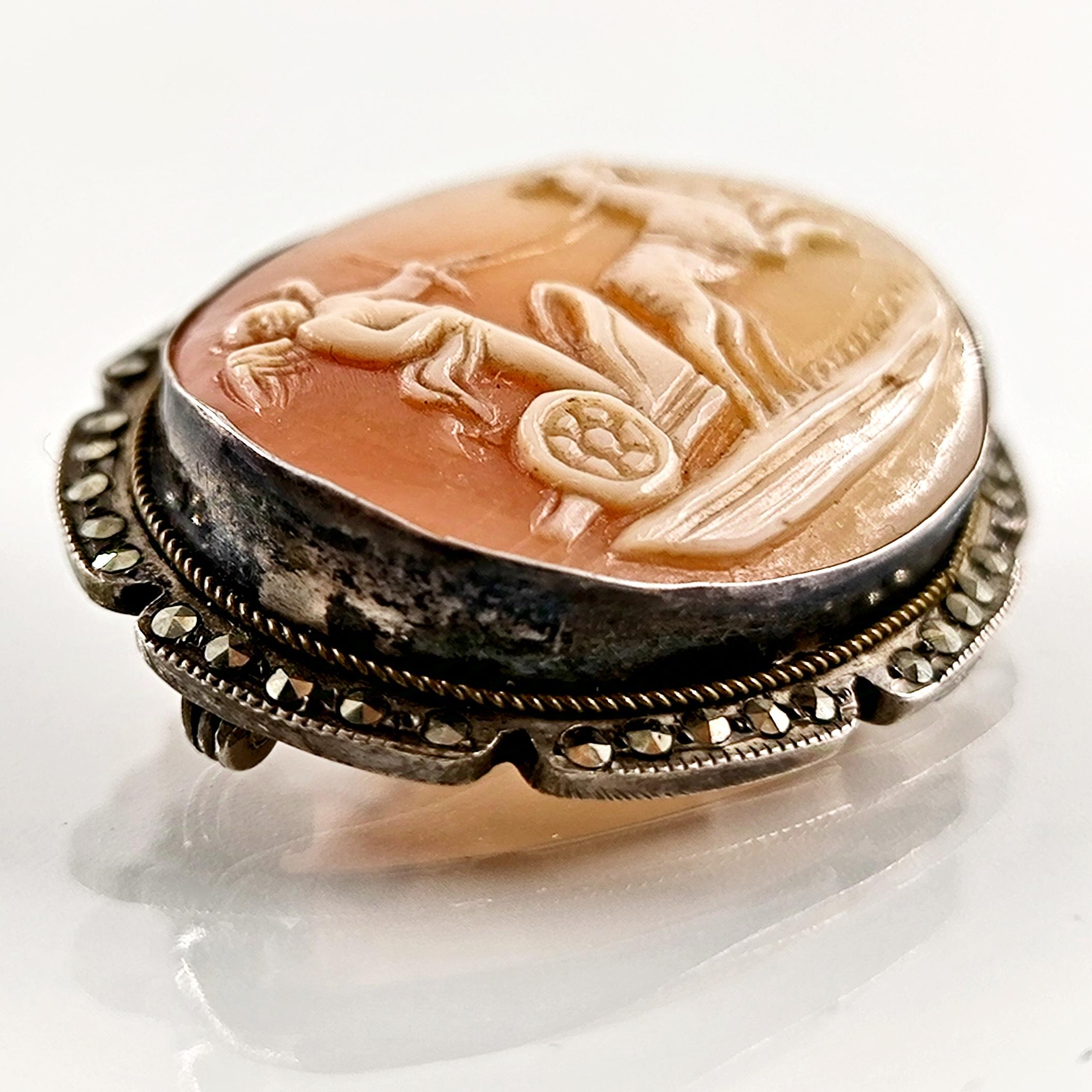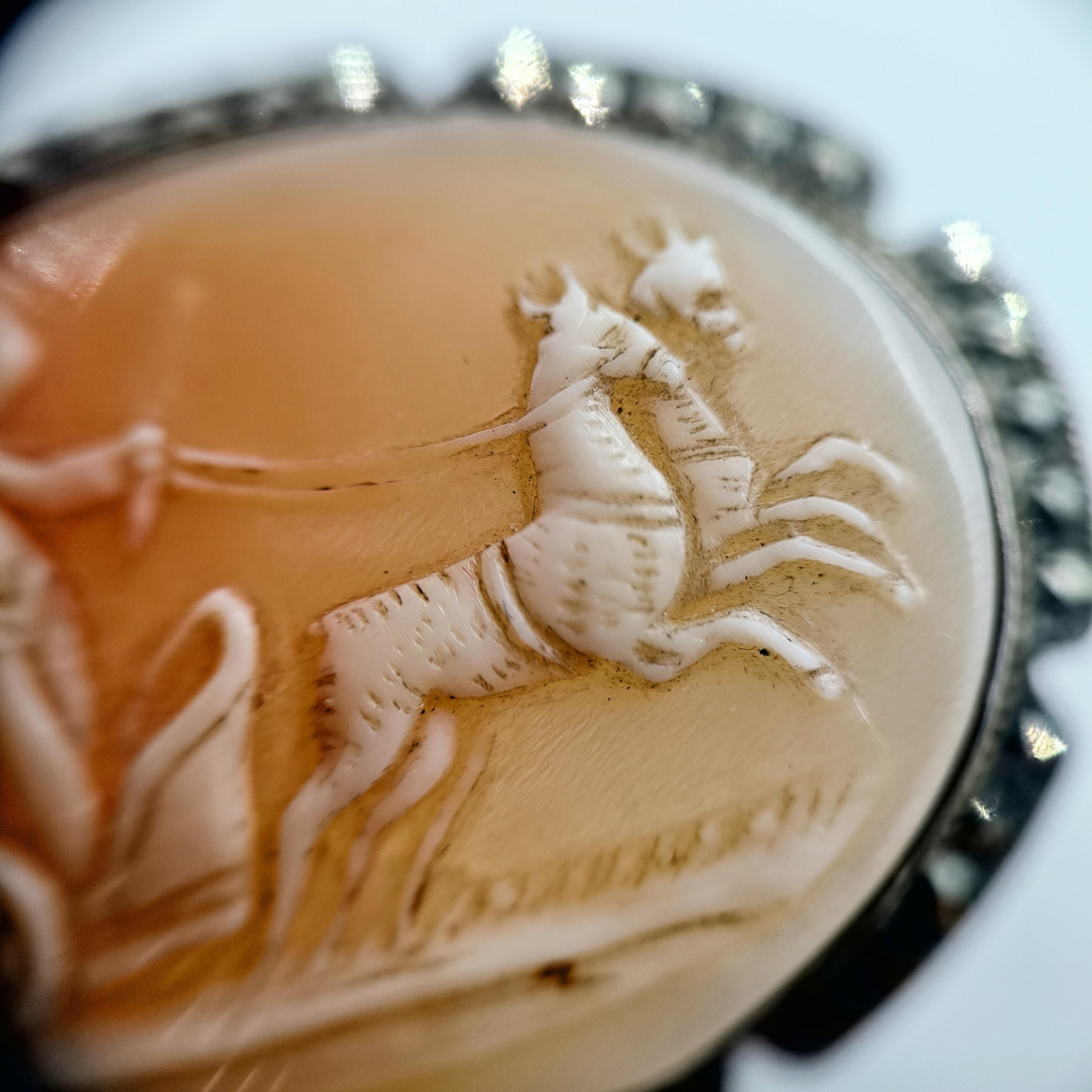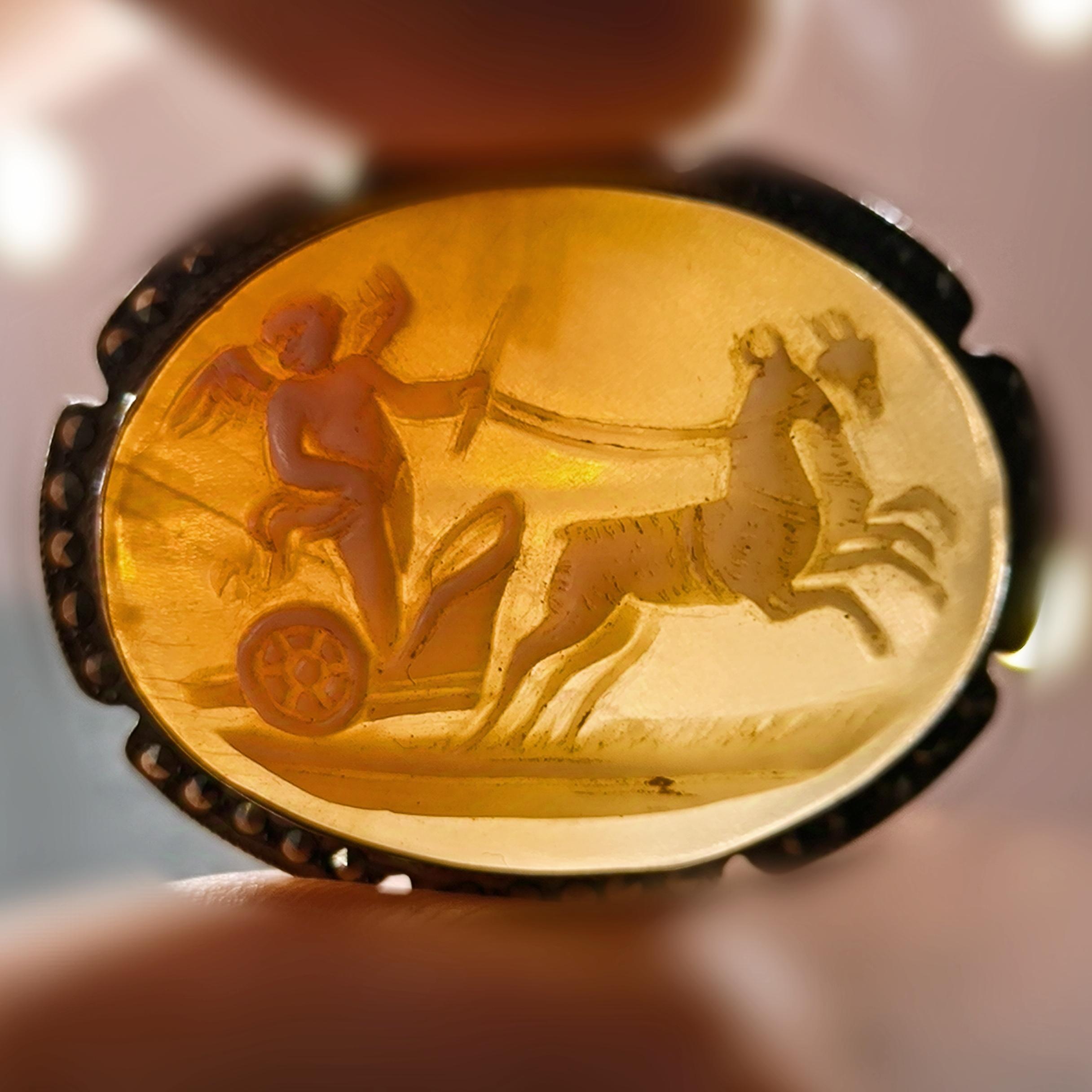 Eşsiz bir Antika Cameo mücevher ! Deniz kabuğu Üzerine "savaş arabası süren Eros" rölyefi çalışılmış & Avrupa yapımı gerçek bir antika mücevher! Çerçevesi markazit taşlarla süslü hem kolye hem broş olarak kullanılabilecek eşsiz bir cameo!