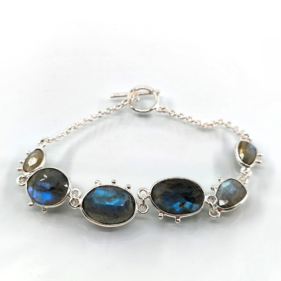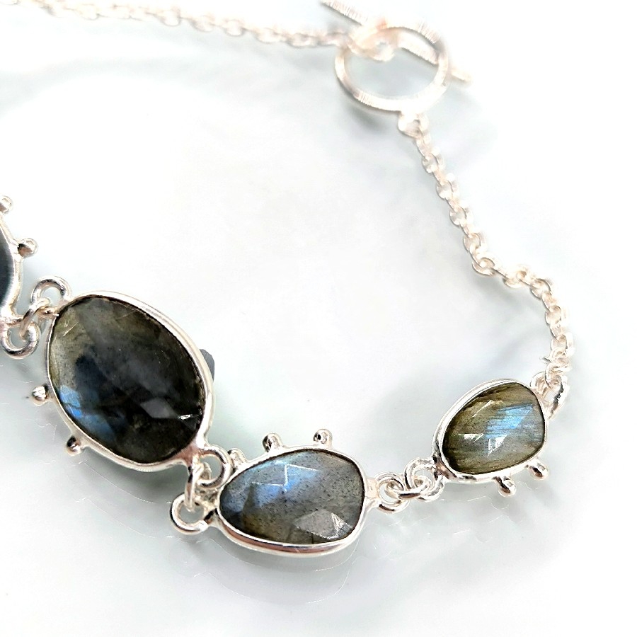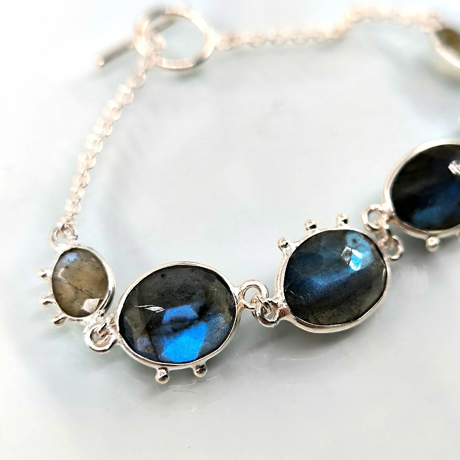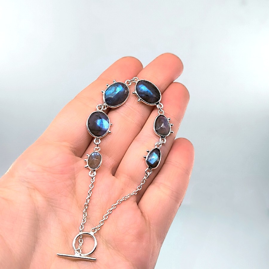 Bu şık bileklik, Faset Kesim Labradorit Taşı ile tasarlanmış ve tamamen el yapımıdır. Bu eşsiz tasarıma sahip olan bileklik, doğal bir labradorit taşının benzersiz renklerini ve desenlerini ortaya çıkarmak için özenle faset kesilmiştir. Labradorit taşı, doğanın bir mucizesi olarak bilinir ve taşın her bir parçası, farklı bir renk tonu ve desen sunar.