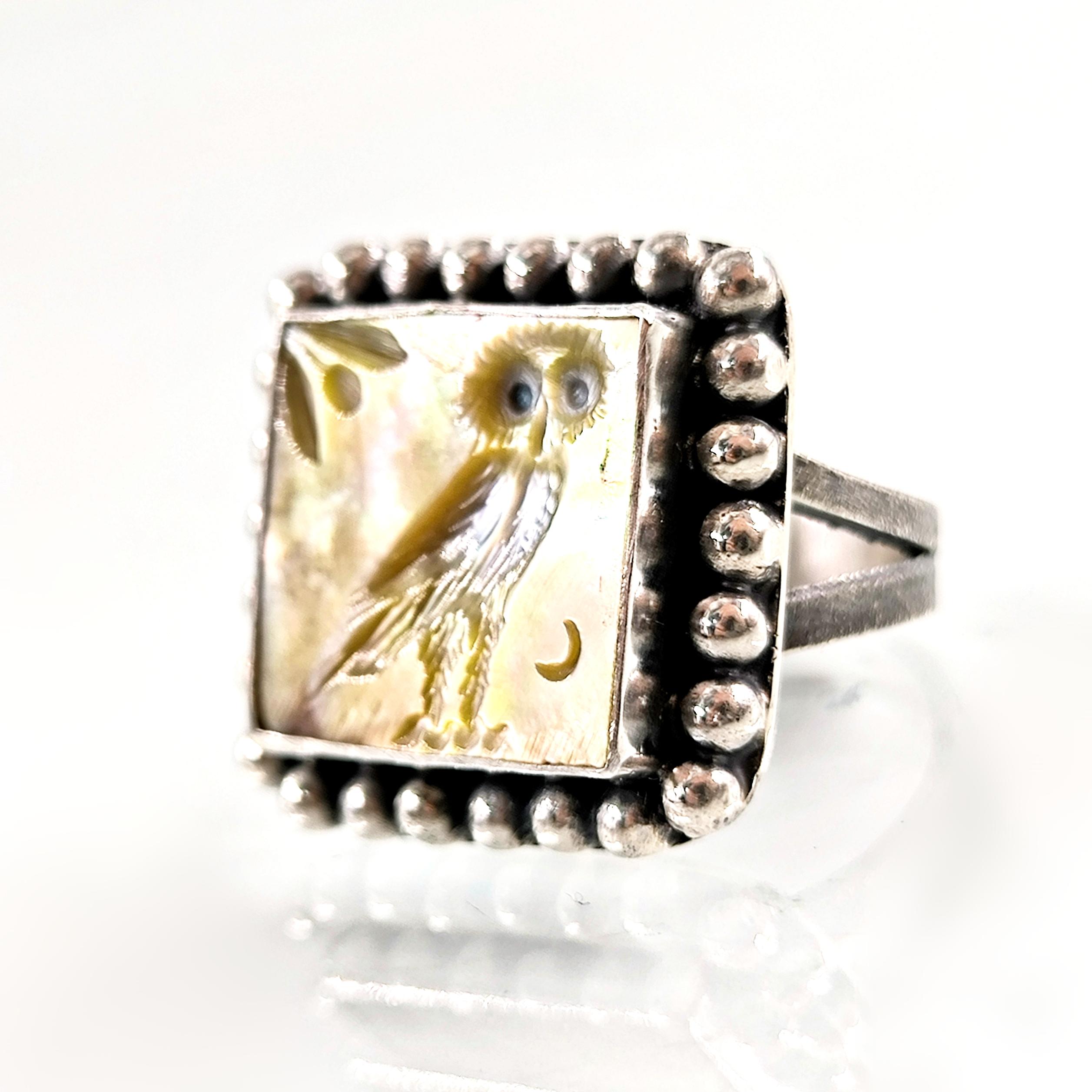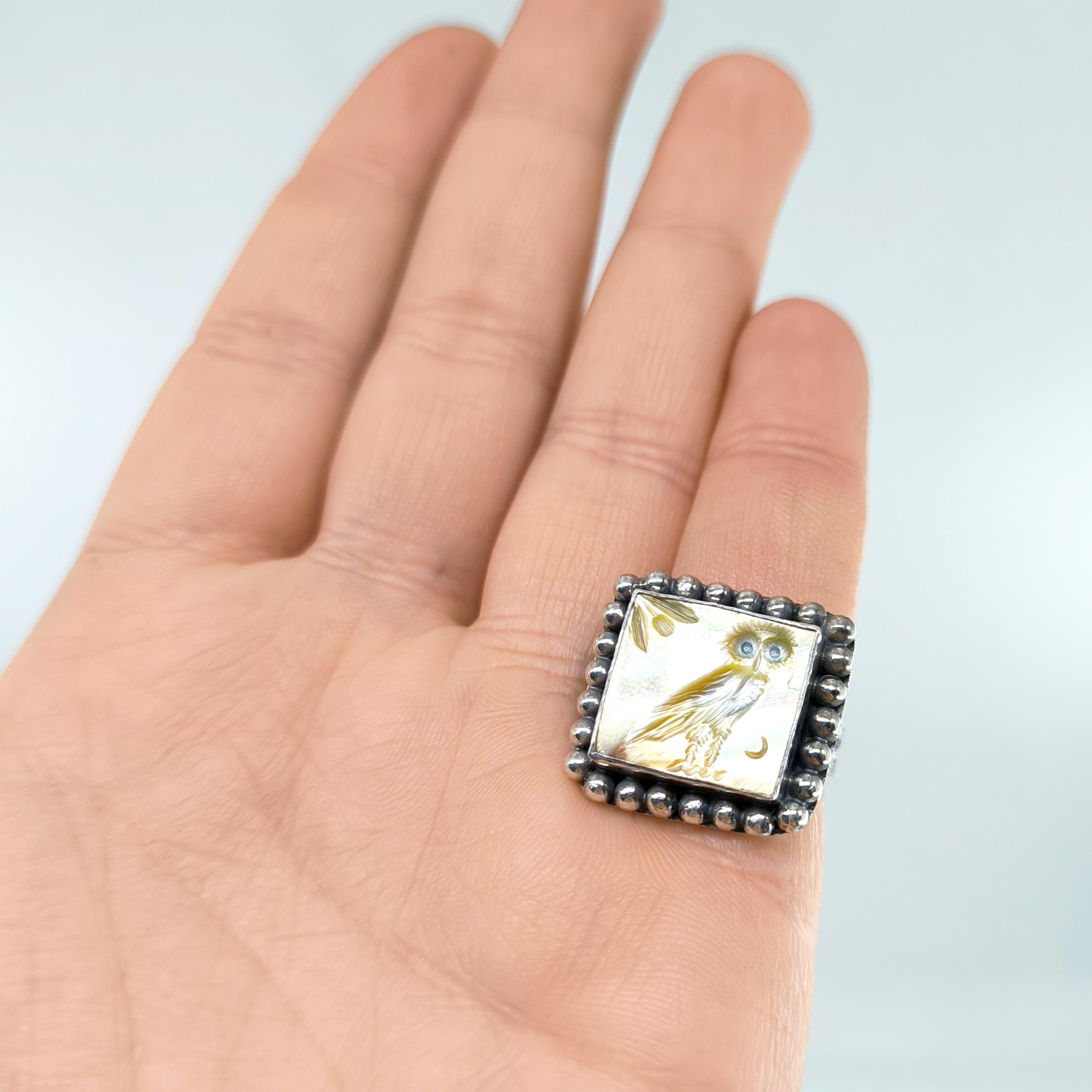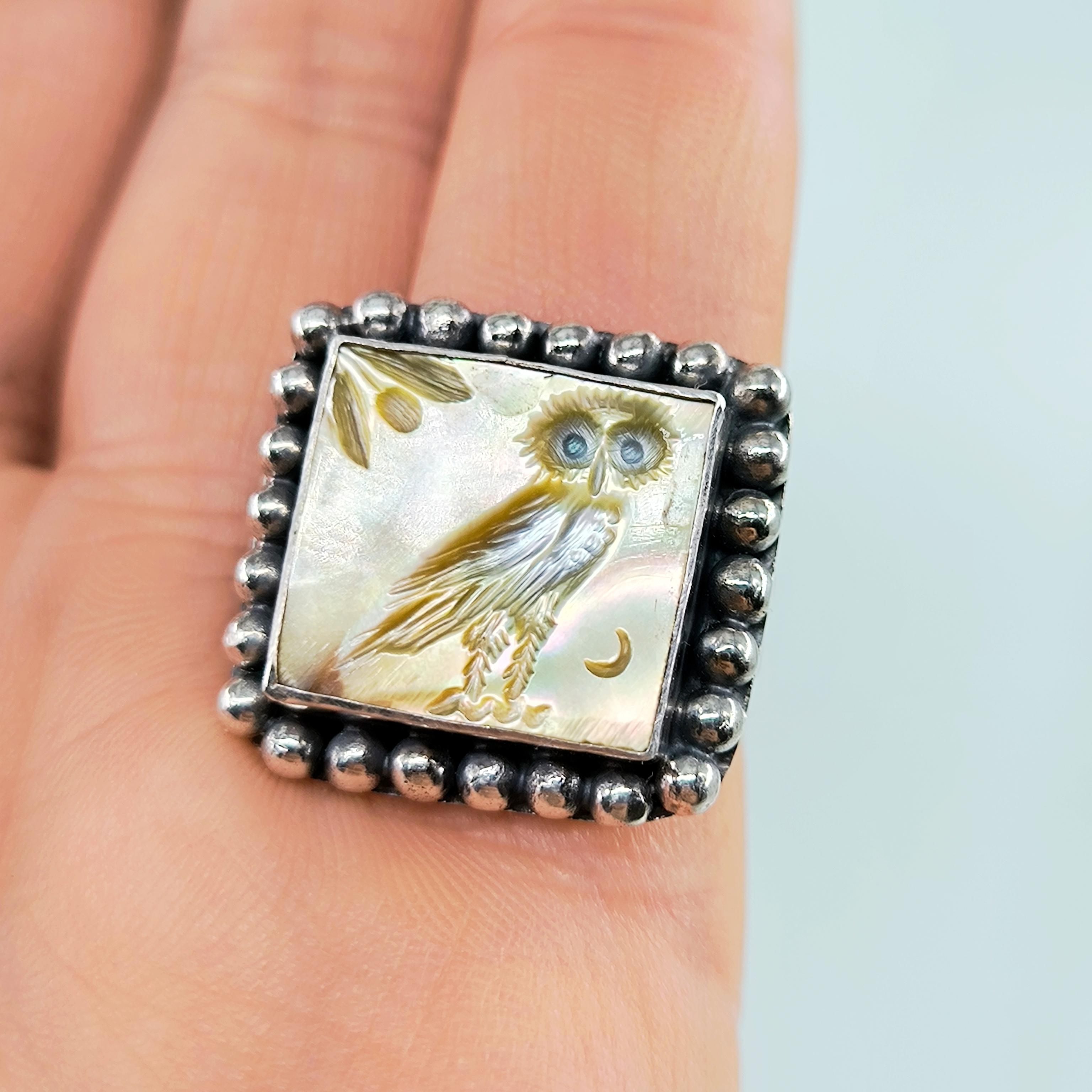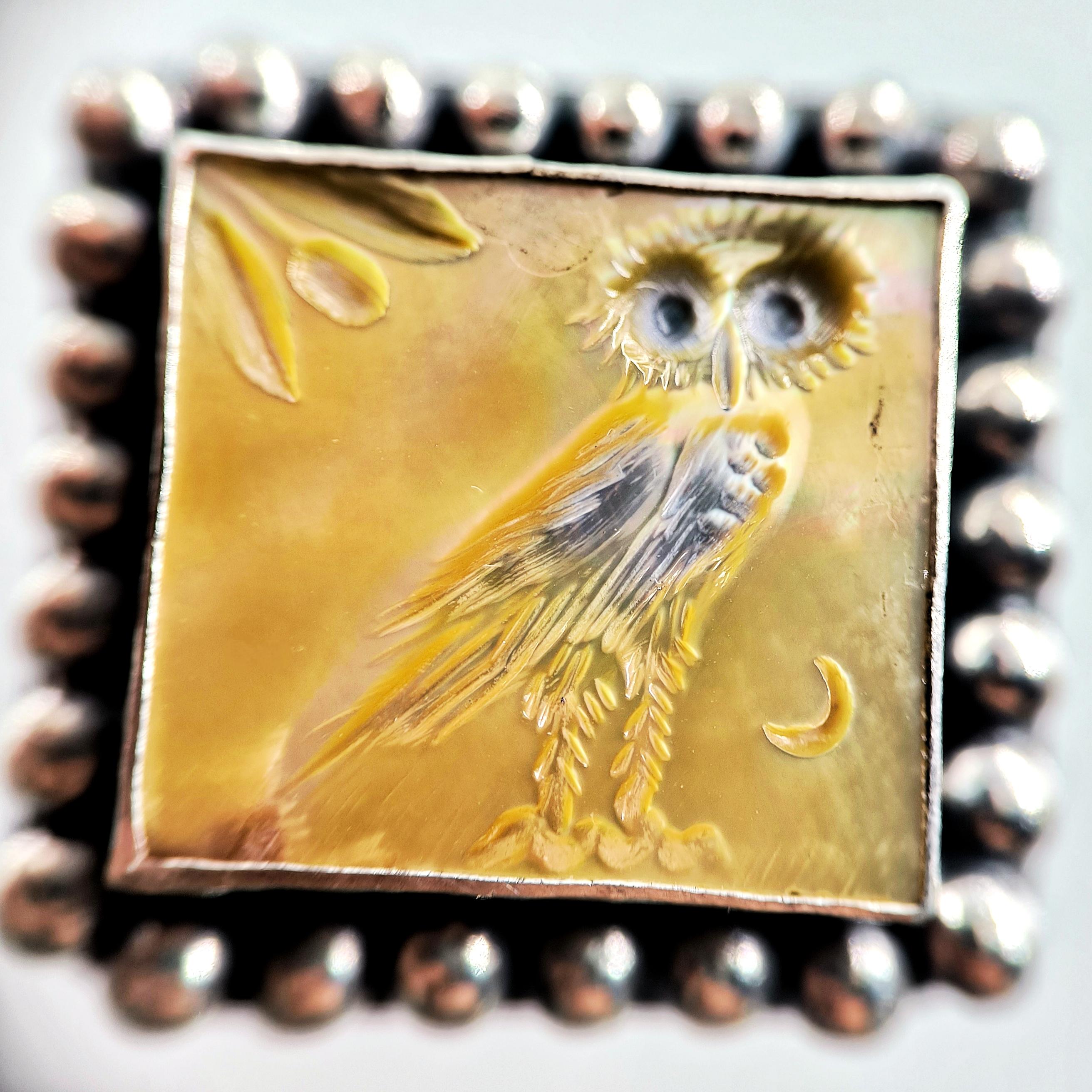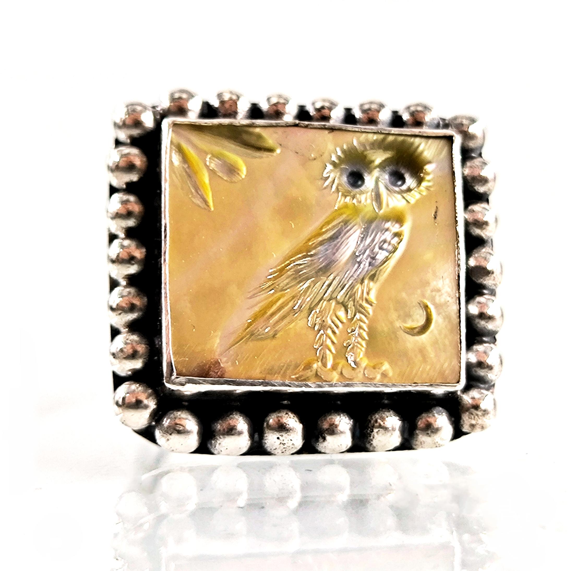 Antik Atina’nın taş duvarları arasında anlatılan efsaneler, gecenin en sessiz anında baykuşun gözlerinde saklanan hakikatten bahseder. Ay ışığı zeytin dallarına değdiğinde, bilgelik ve sezgi kapılarını aralar; gören değişir, anlayan dönüşür. Altın sarısı sedefin ışıltısında hayat bulan bu figür, tetradrahmi sikkelerinin arkasında yer alan kadim baykuşun koruyucu ruhunu modern bir tılsıma dönüştürür. El oyma negatif intaglio tekniğiyle işlenmiş her çizgi, bilgeliğin sessiz gücünü ve karanlıkta yön bulma kabiliyetini simgeler. El işçiliği 925 ayar gümüşten üretilmiş olup tek adet hazırlanmıştır.