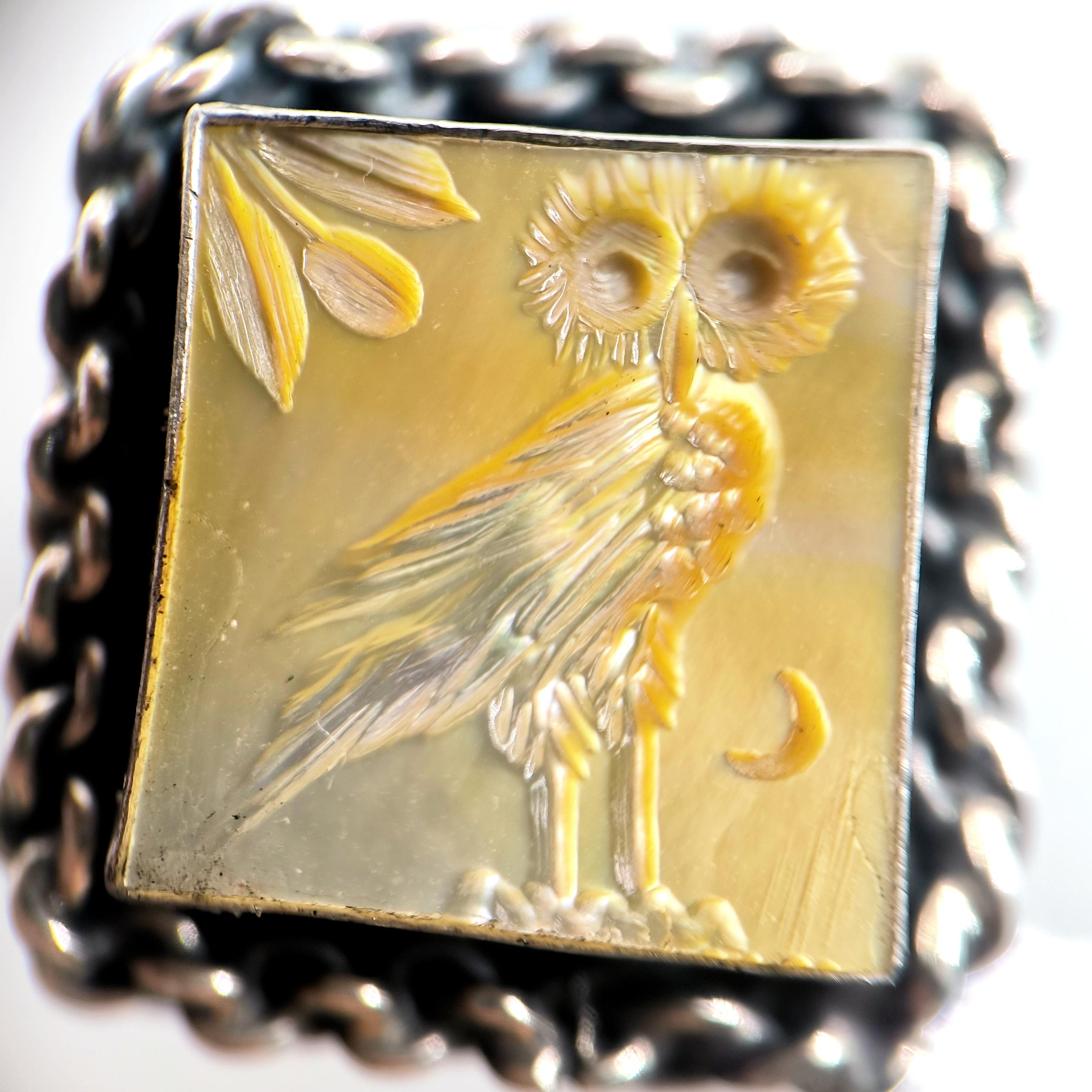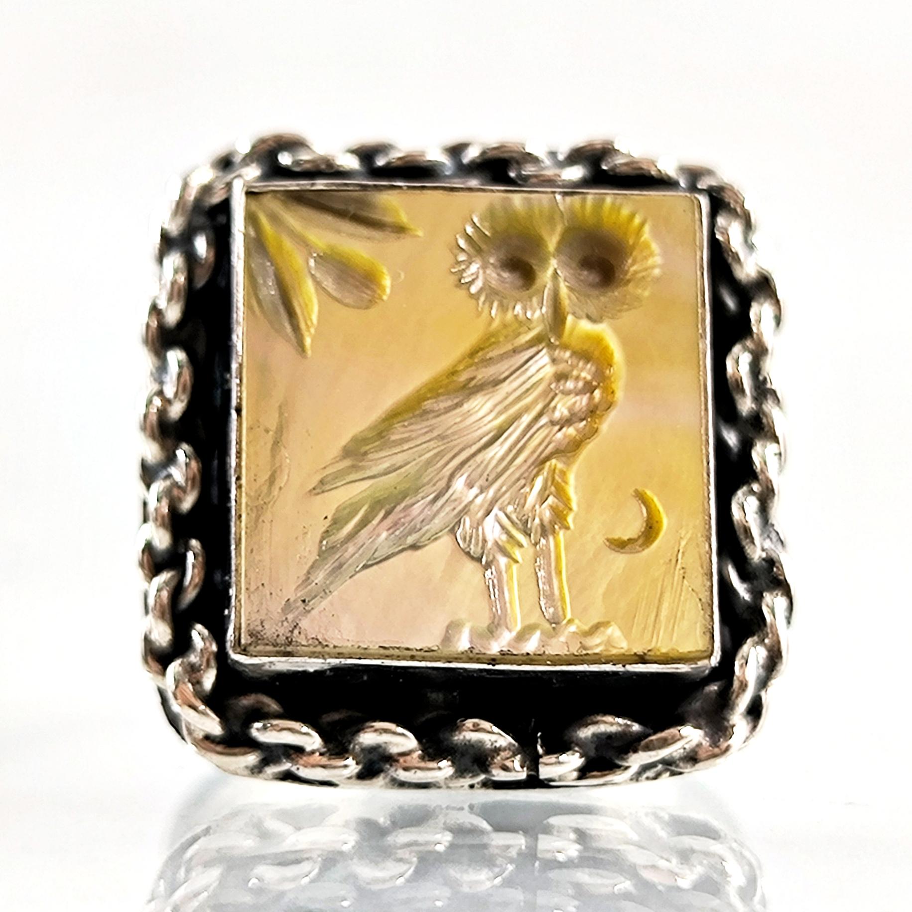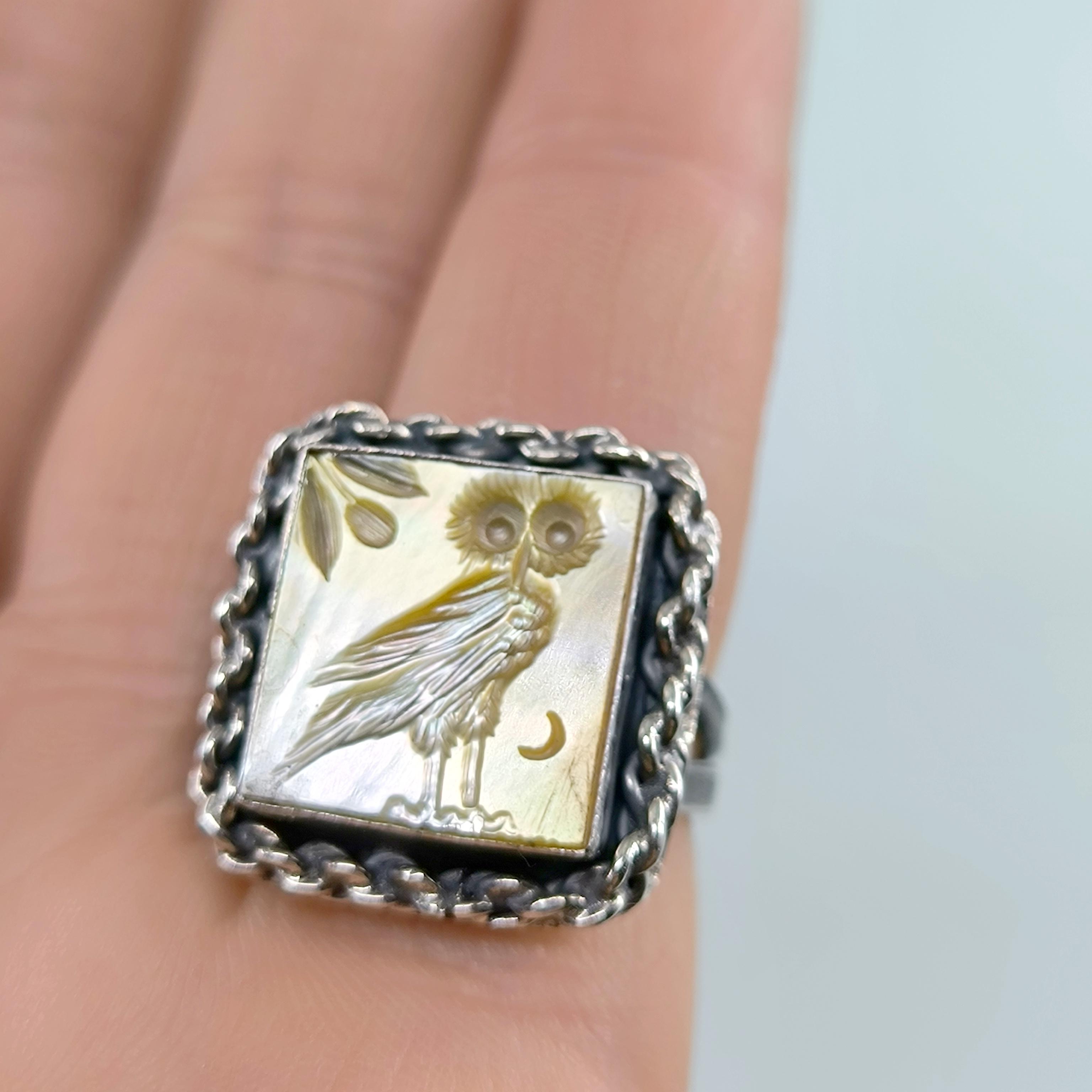Antik Atina’nın taş duvarları arasında anlatılan efsaneler, gecenin en sessiz anında baykuşun gözlerinde saklanan hakikatten bahseder. Ay ışığı zeytin dallarına değdiğinde, bilgelik ve sezgi kapılarını aralar; gören değişir, anlayan dönüşür. Altın sarısı sedefin ışıltısında hayat bulan bu figür, tetradrahmi sikkelerinin arkasında yer alan kadim baykuşun koruyucu ruhunu modern bir tılsıma dönüştürür. El oyma negatif intaglio tekniğiyle işlenmiş her çizgi, bilgeliğin sessiz gücünü ve karanlıkta yön bulma kabiliyetini simgeler. El işçiliği 925 ayar gümüşten üretilmiş olup zincir çerçeve tasarımıyla güçlü bir karakter kazanmıştır.
