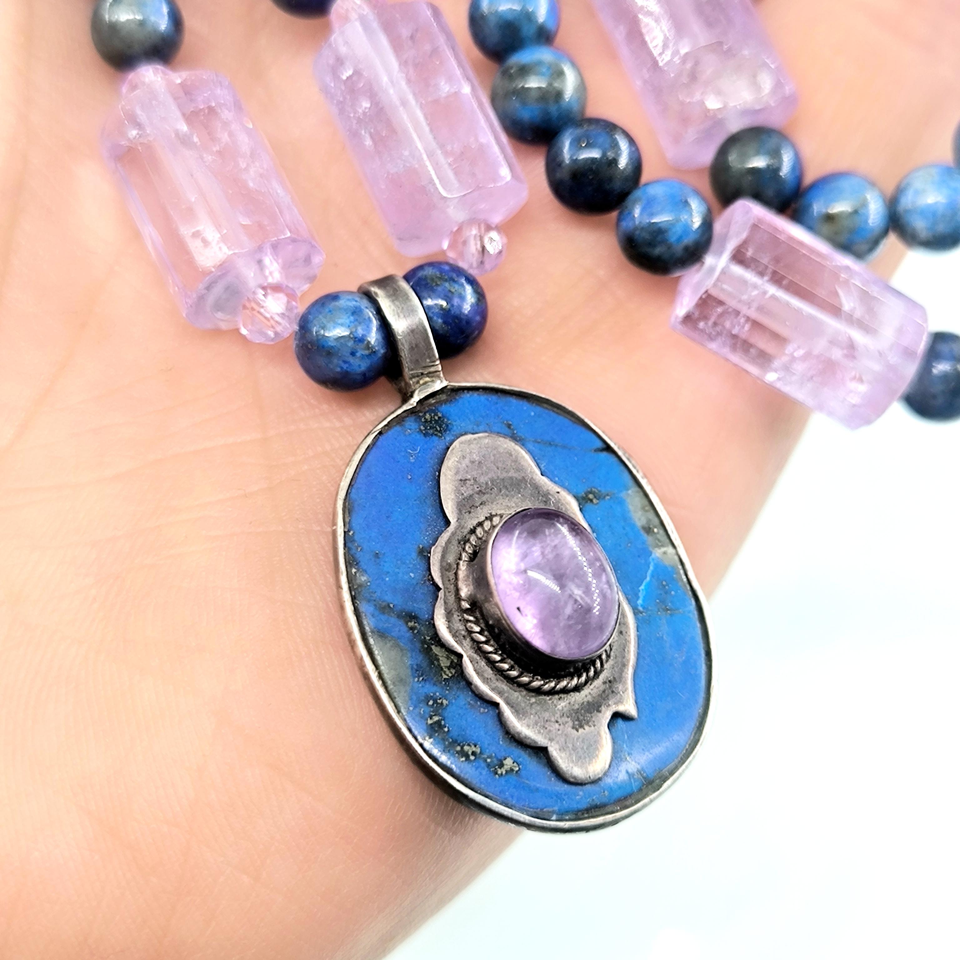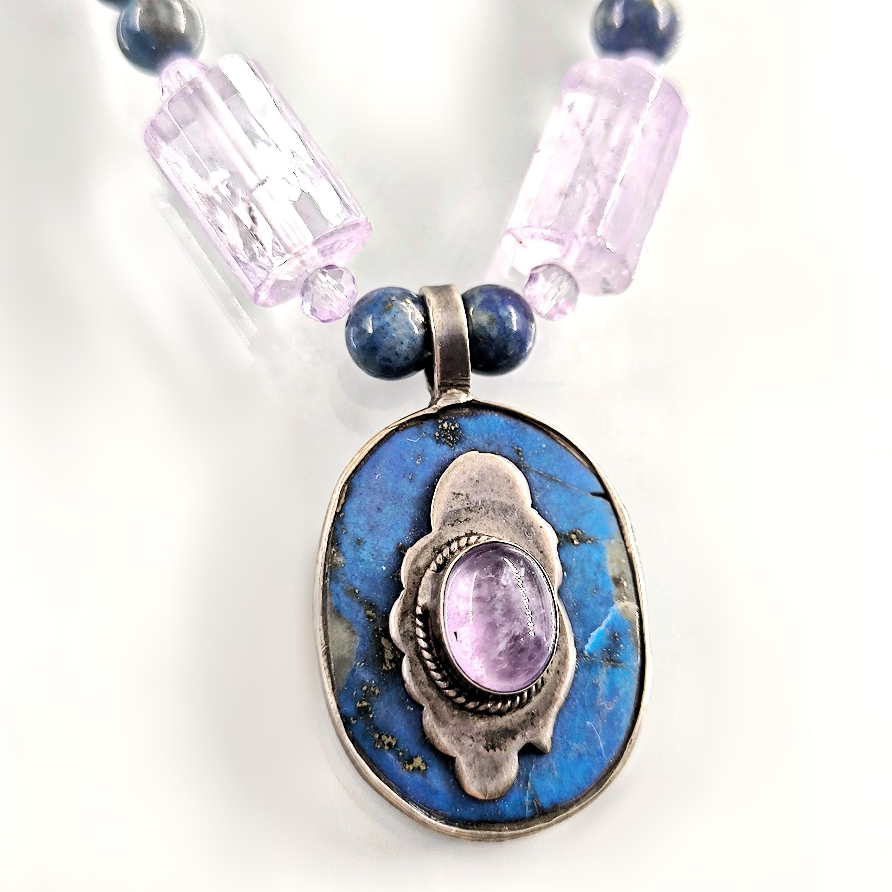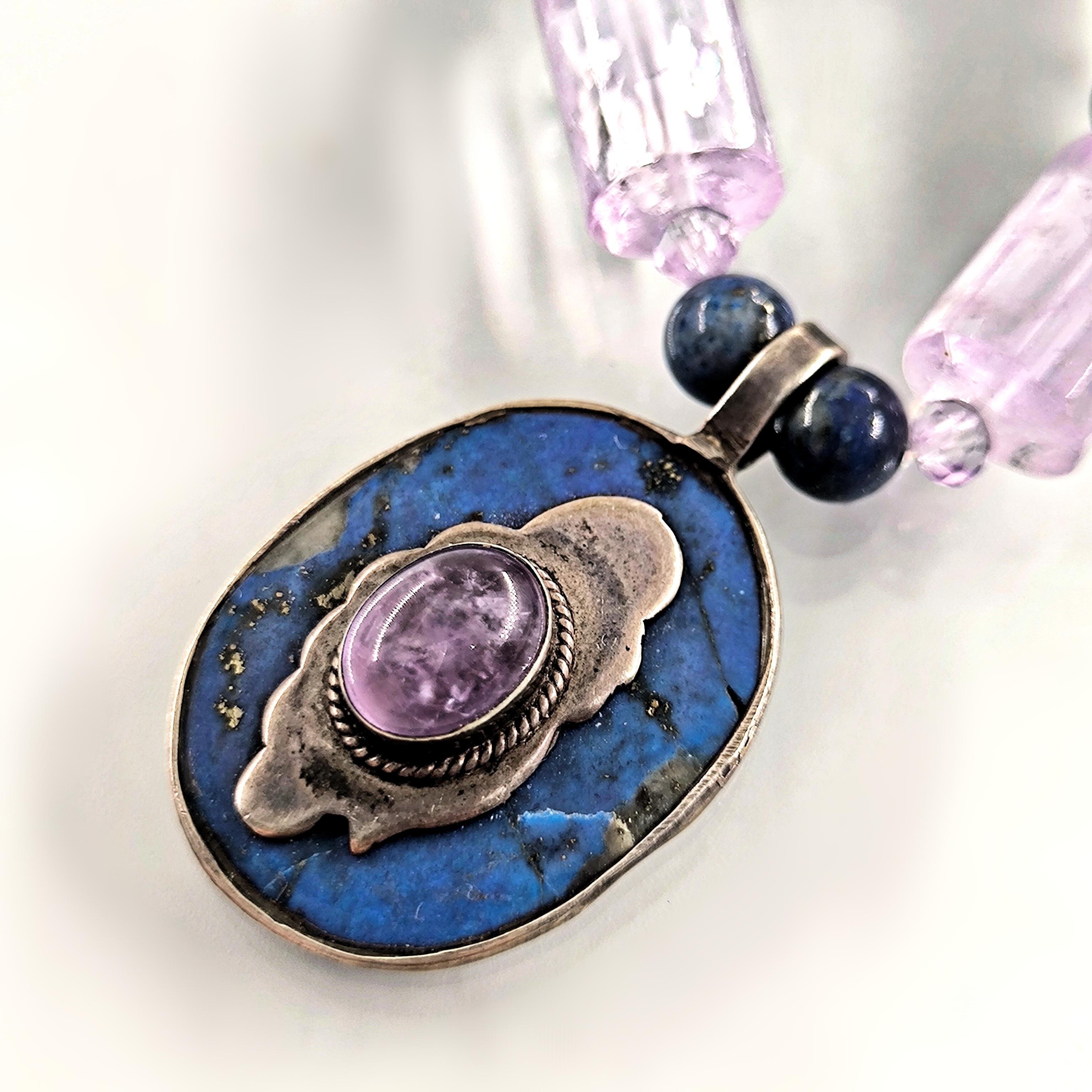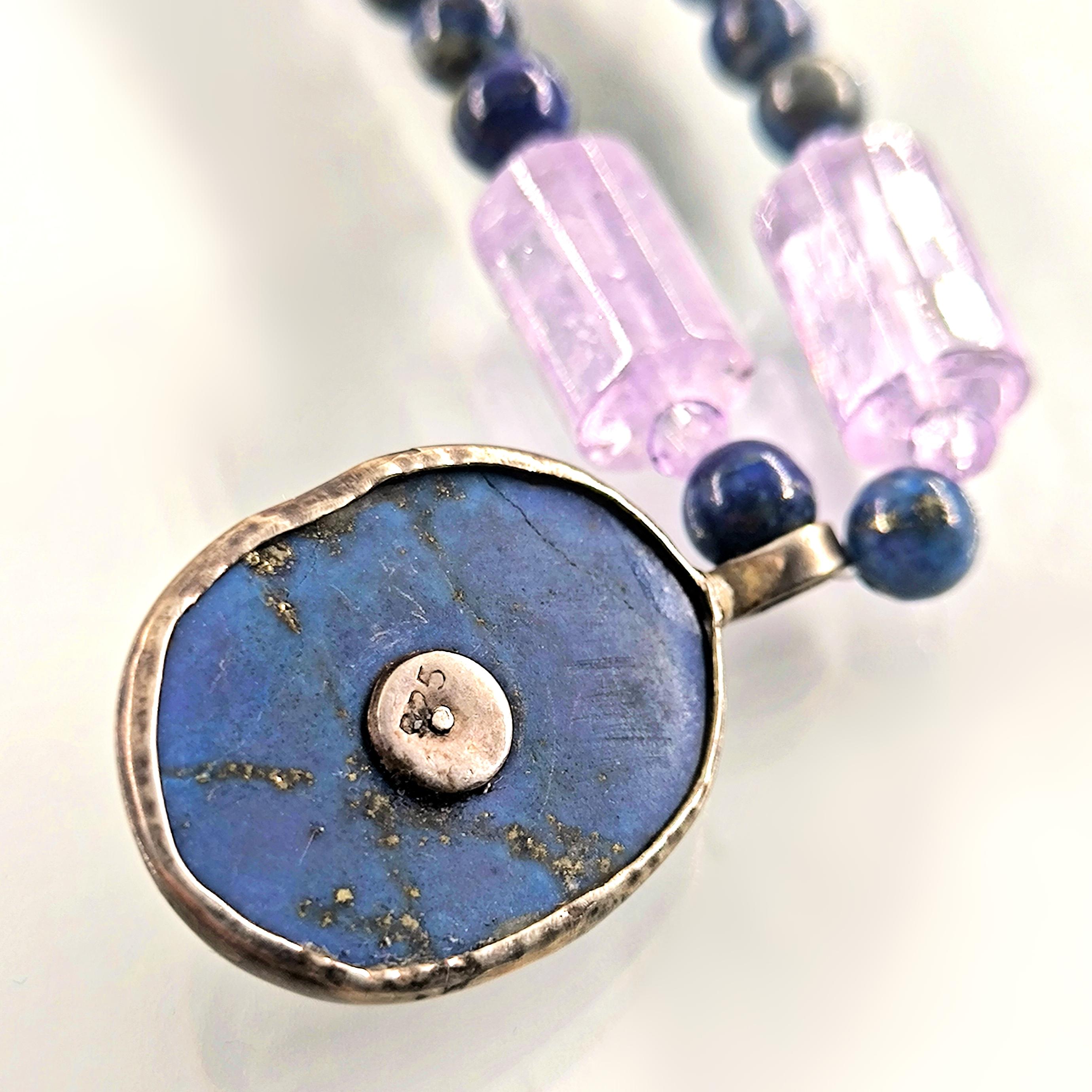 Bu tasarımda gökyüzünün iki kadim taşını bir araya getirdim. Ametistin büyülü mor tonları ile lapis lazulinin derin laciverti, gece göğünün yıldızlı sessizliğini hatırlatır. Zincirdeki taşların ışıkla dans eden renkleri kolyenin merkezindeki ametist kalbe doğru akıyormuş gibi görünür. Lapis üzerine yerleştirilmiş ametist taş, sezgi ve bilgelik sembolü olarak tasarımın ruhunu taşır. Antik bir tılsımı andıran bu parça, boyunda taşınan mistik ve zarif bir sanat eseri gibidir. Her bakışta başka bir derinlik, başka bir hikâye fısıldar.