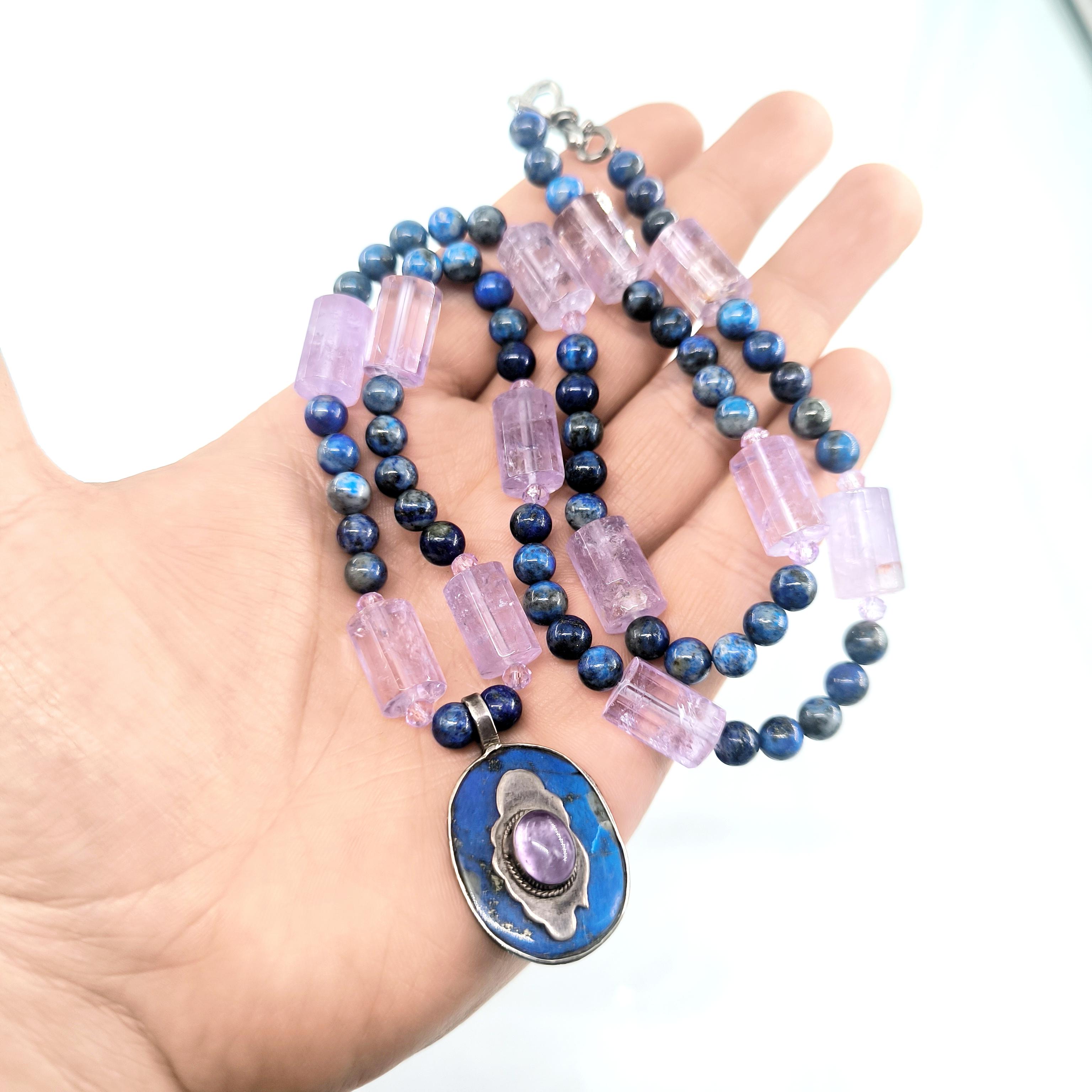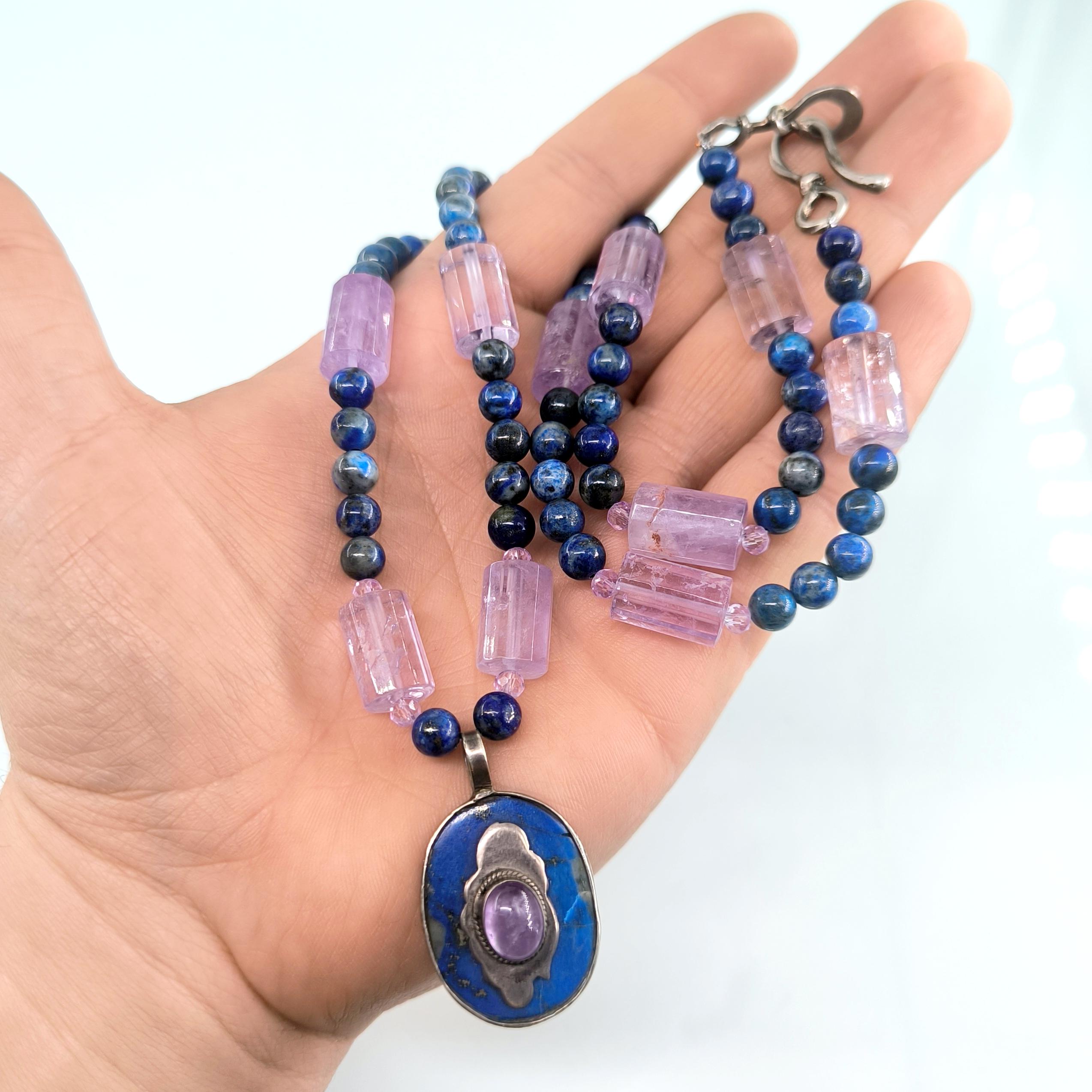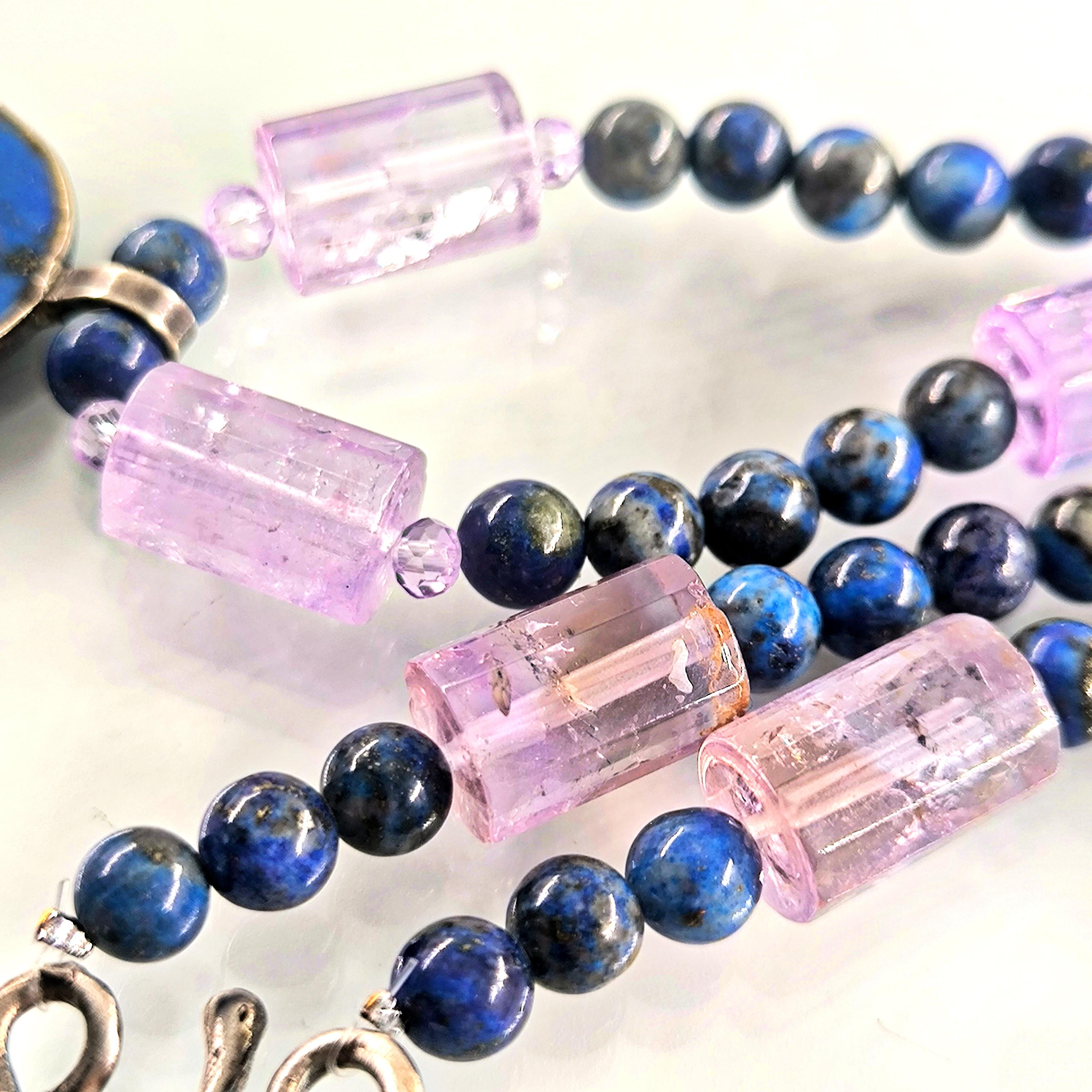 Bu tasarımda gökyüzünün iki kadim taşını bir araya getirdim. Ametistin büyülü mor tonları ile lapis lazulinin derin laciverti, gece göğünün yıldızlı sessizliğini hatırlatır. Zincirdeki taşların ışıkla dans eden renkleri kolyenin merkezindeki ametist kalbe doğru akıyormuş gibi görünür. Lapis üzerine yerleştirilmiş ametist taş, sezgi ve bilgelik sembolü olarak tasarımın ruhunu taşır. Antik bir tılsımı andıran bu parça, boyunda taşınan mistik ve zarif bir sanat eseri gibidir. Her bakışta başka bir derinlik, başka bir hikâye fısıldar.