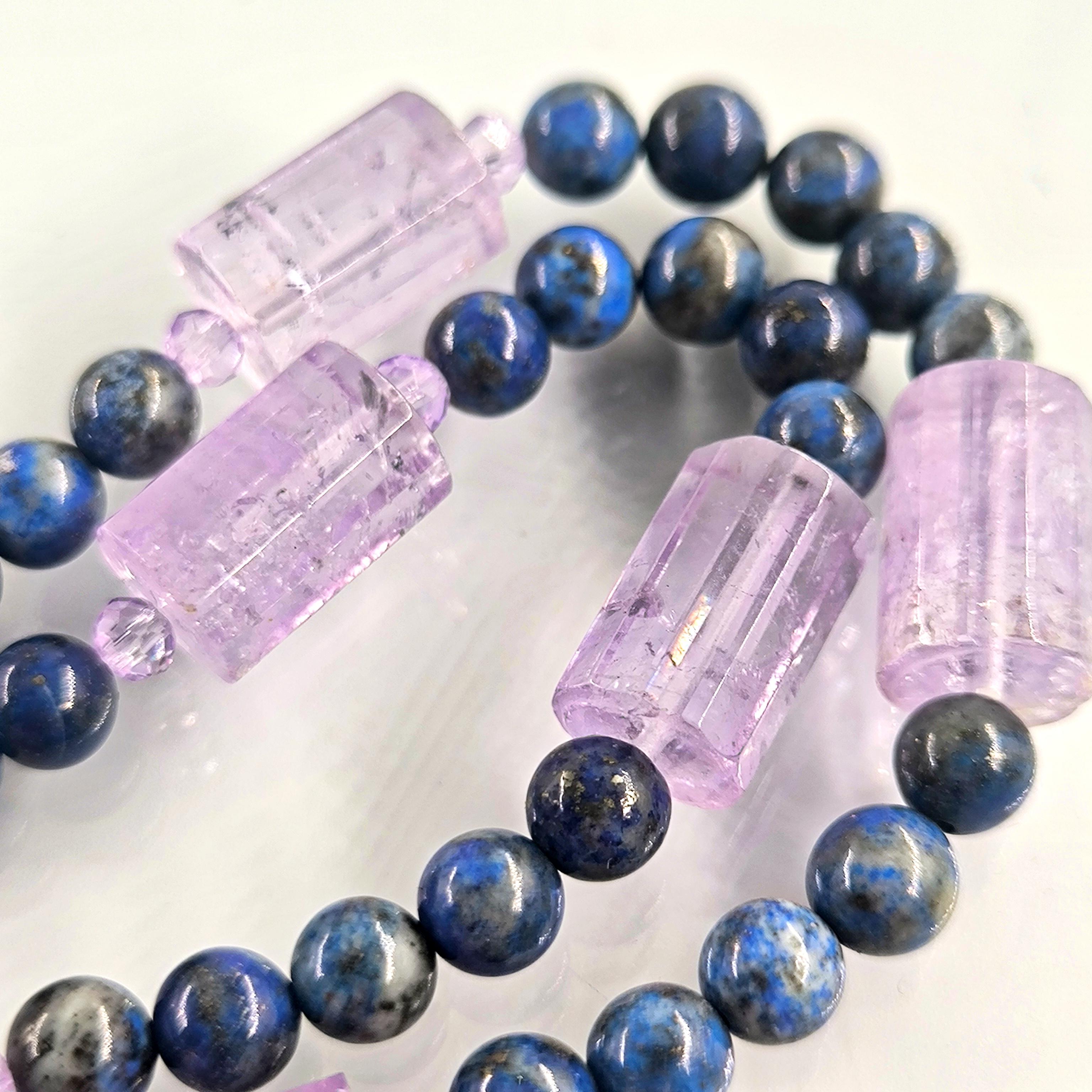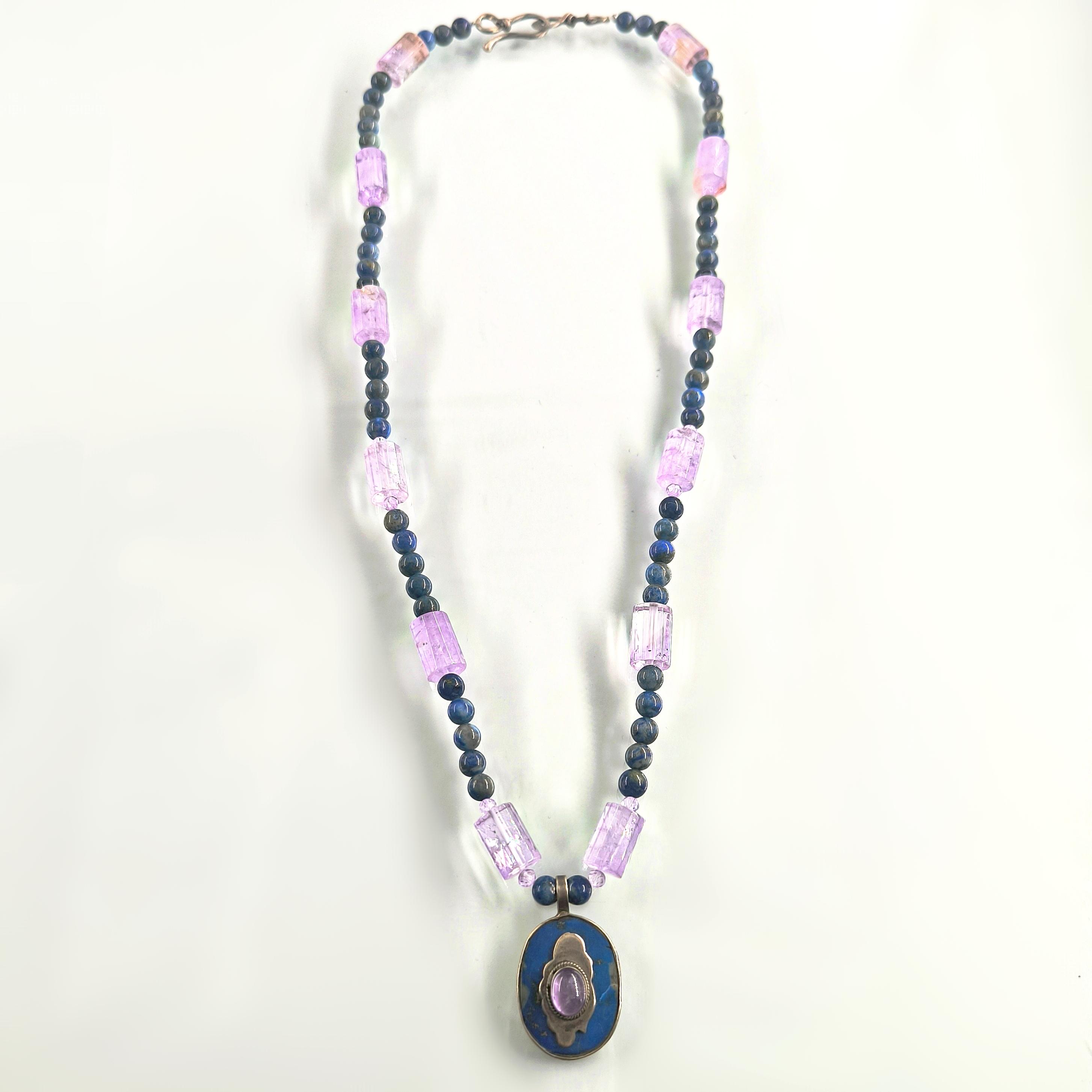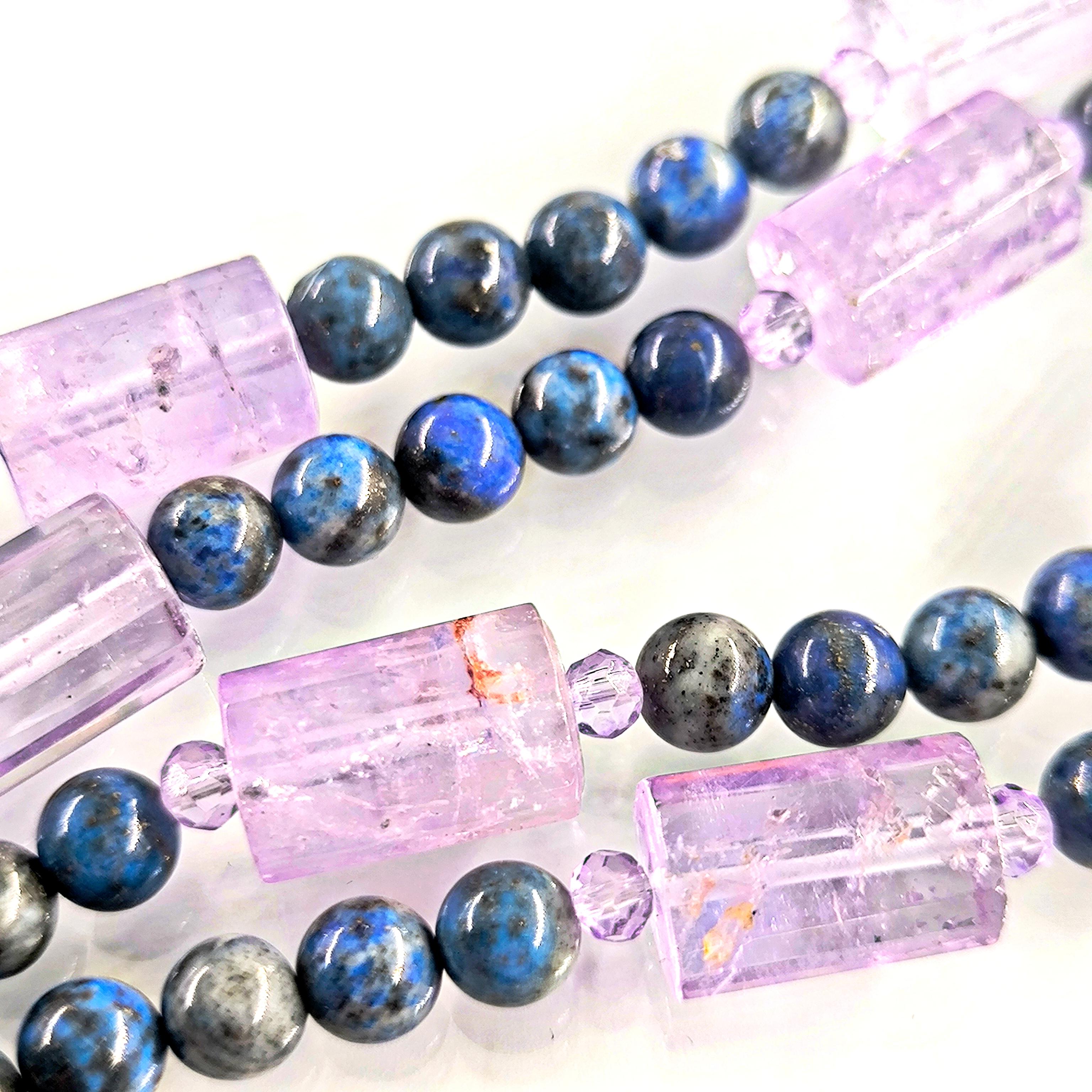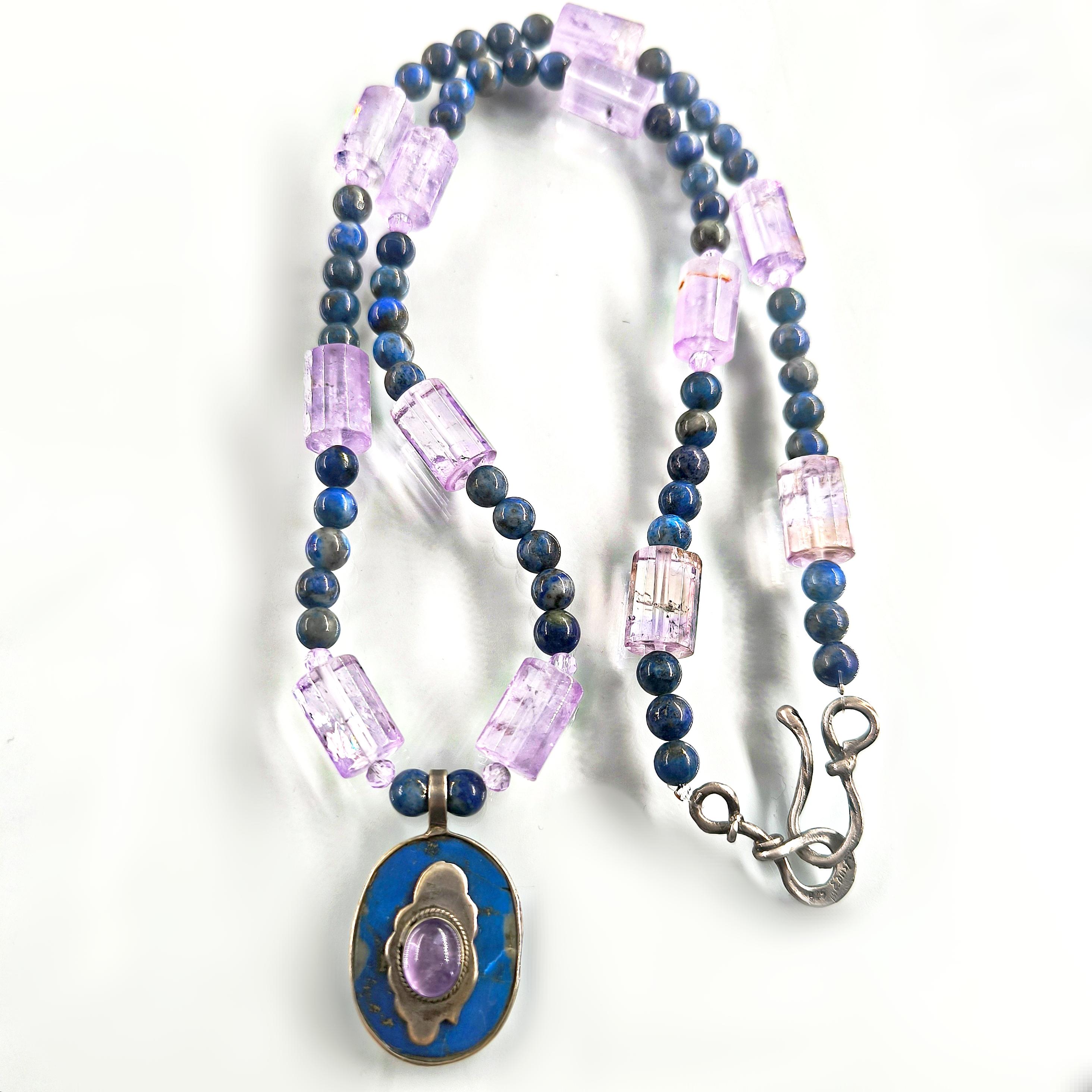 Bu tasarımda gökyüzünün iki kadim taşını bir araya getirdim. Ametistin büyülü mor tonları ile lapis lazulinin derin laciverti, gece göğünün yıldızlı sessizliğini hatırlatır. Zincirdeki taşların ışıkla dans eden renkleri kolyenin merkezindeki ametist kalbe doğru akıyormuş gibi görünür. Lapis üzerine yerleştirilmiş ametist taş, sezgi ve bilgelik sembolü olarak tasarımın ruhunu taşır. Antik bir tılsımı andıran bu parça, boyunda taşınan mistik ve zarif bir sanat eseri gibidir. Her bakışta başka bir derinlik, başka bir hikâye fısıldar.