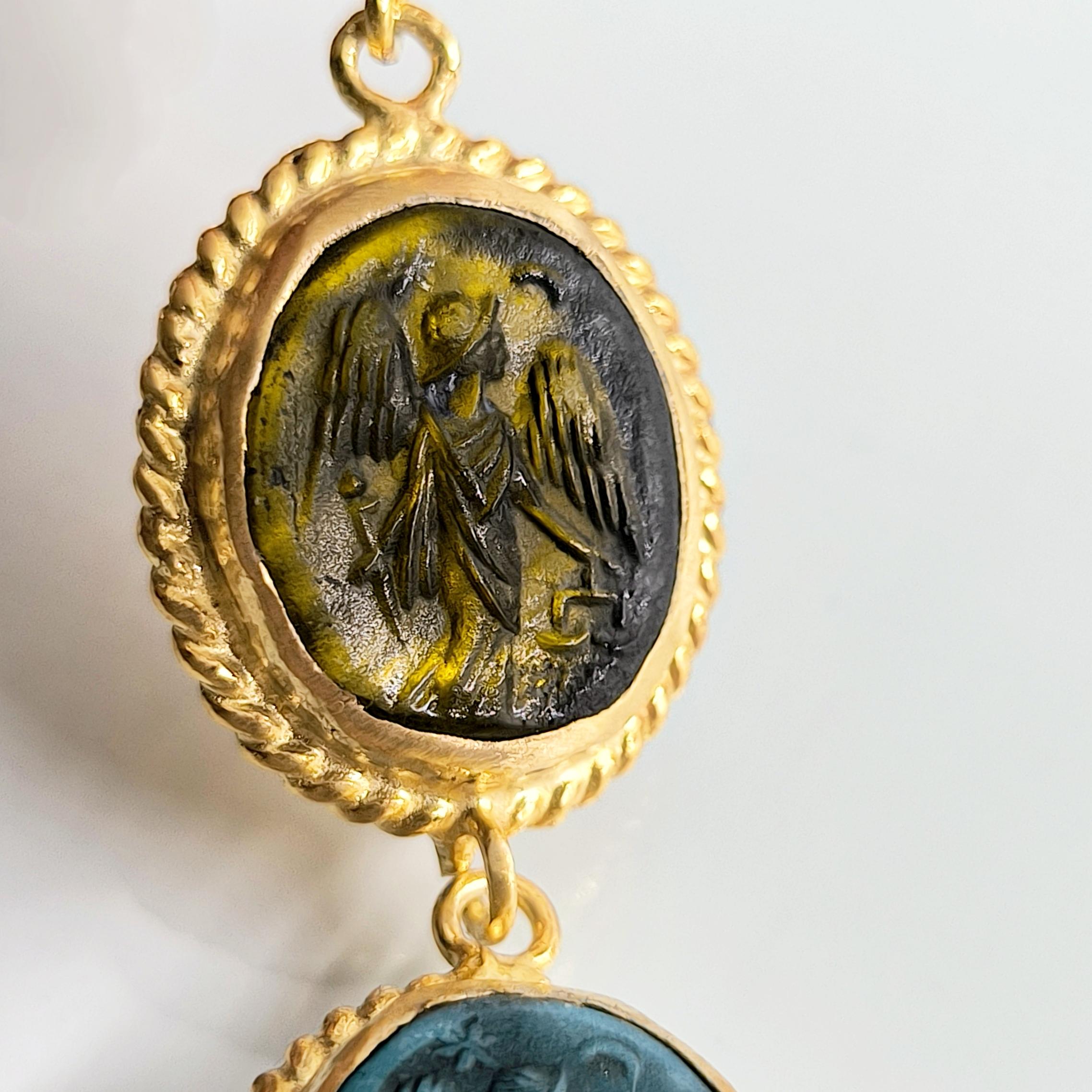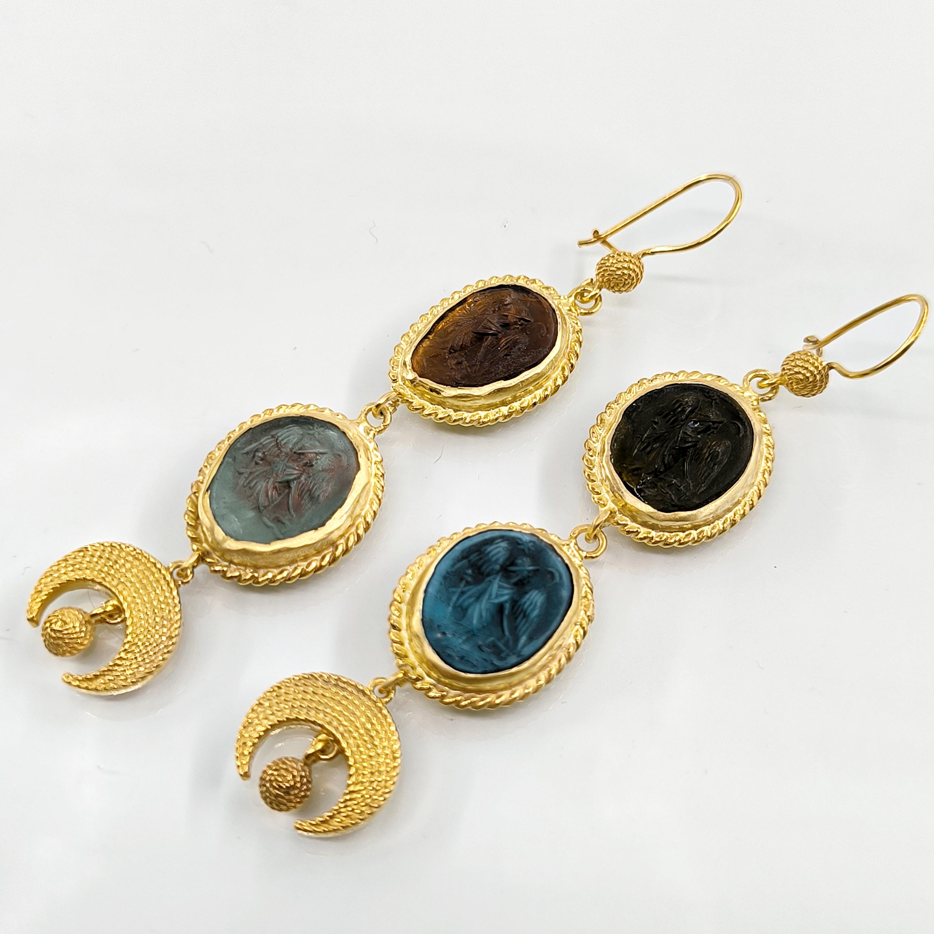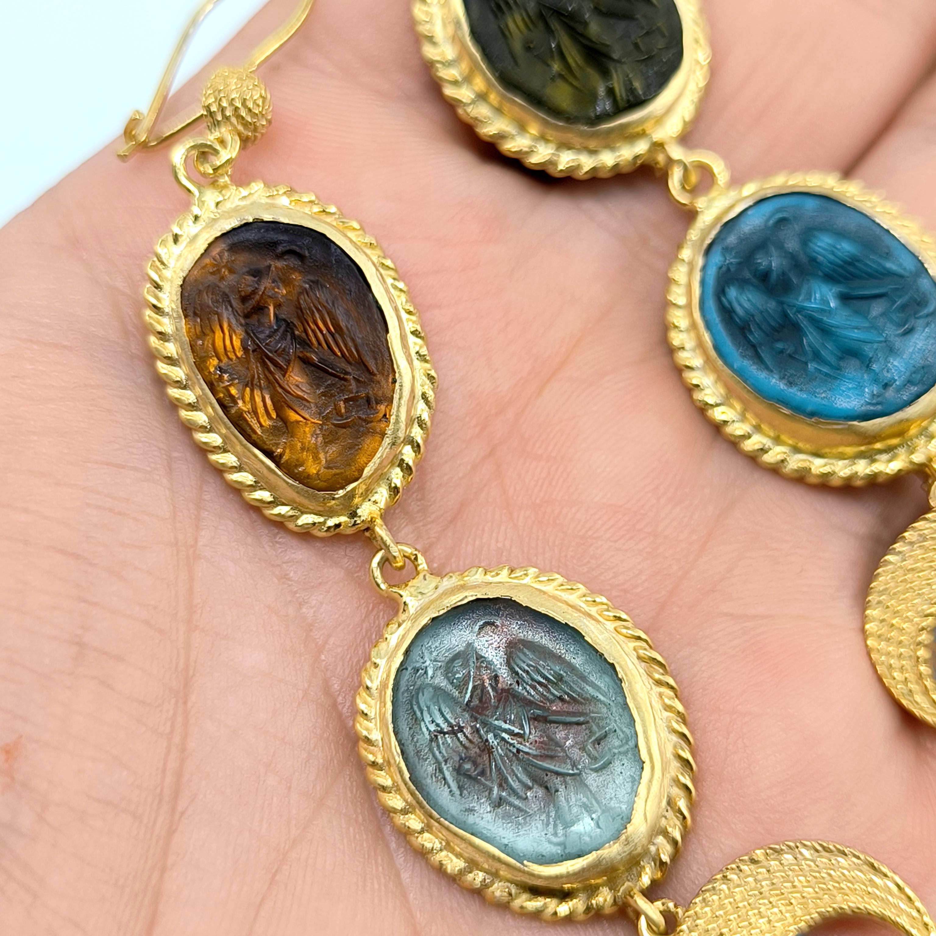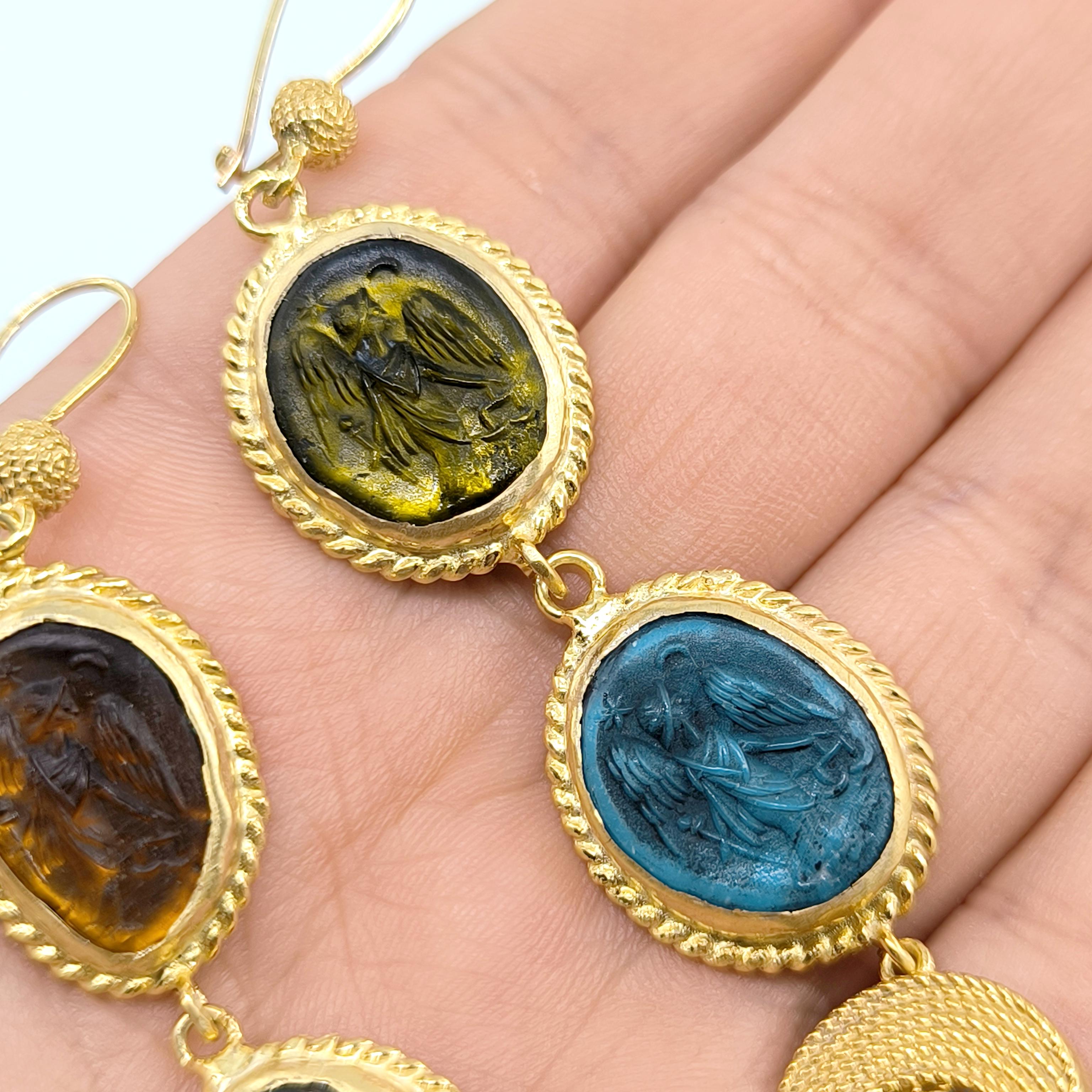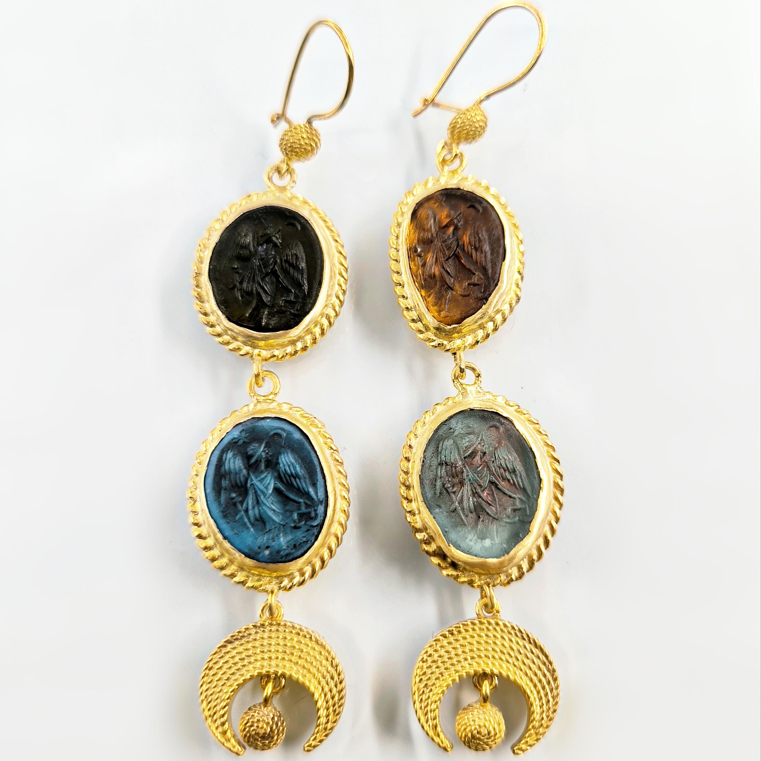 Mitolojik zafer tanrıçaları, üç farklı renkte cam üzerine ustalıkla işlenmiş figürlerle hayat buluyor.