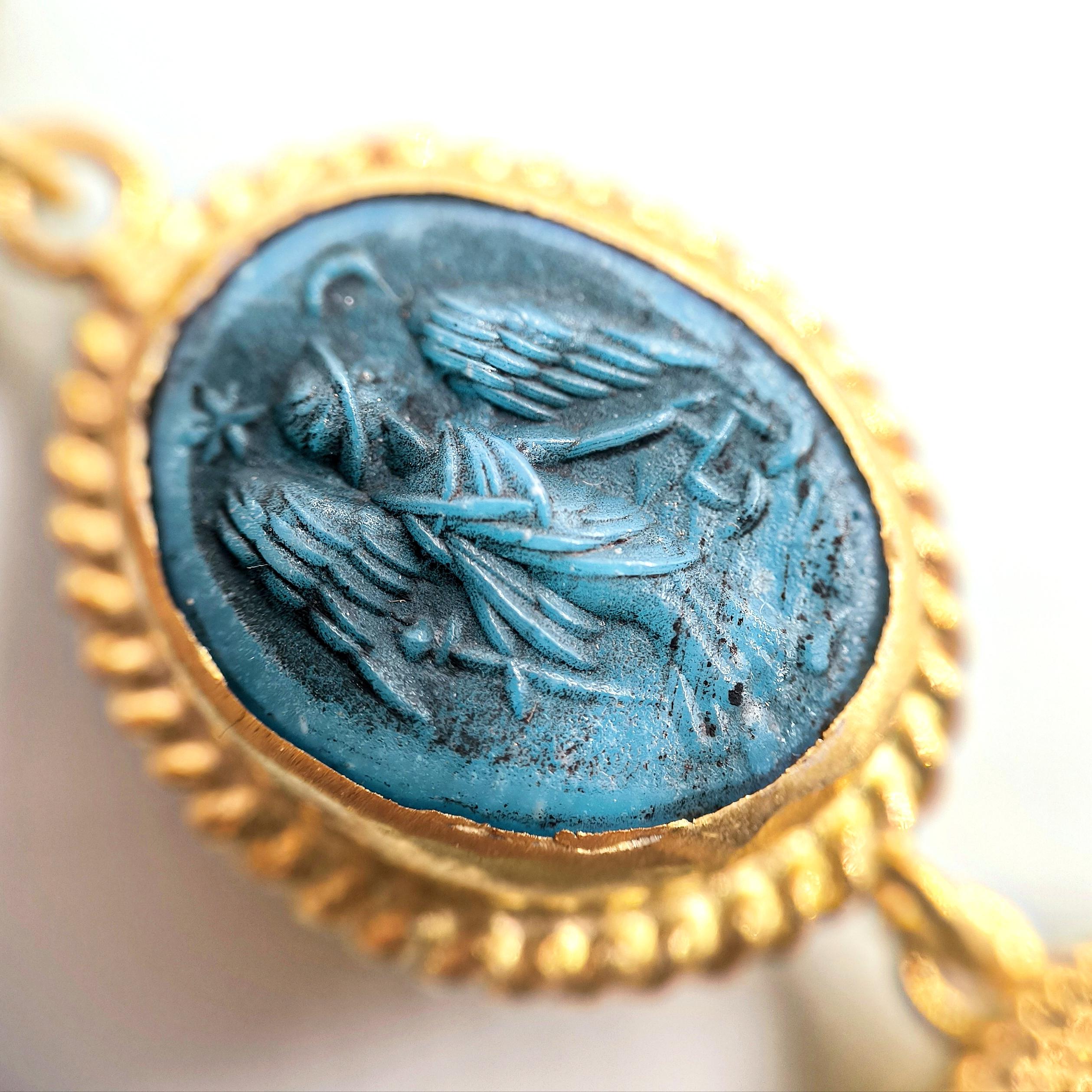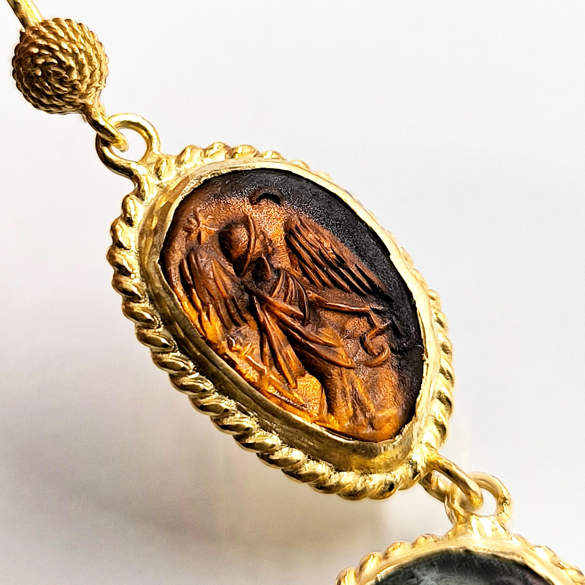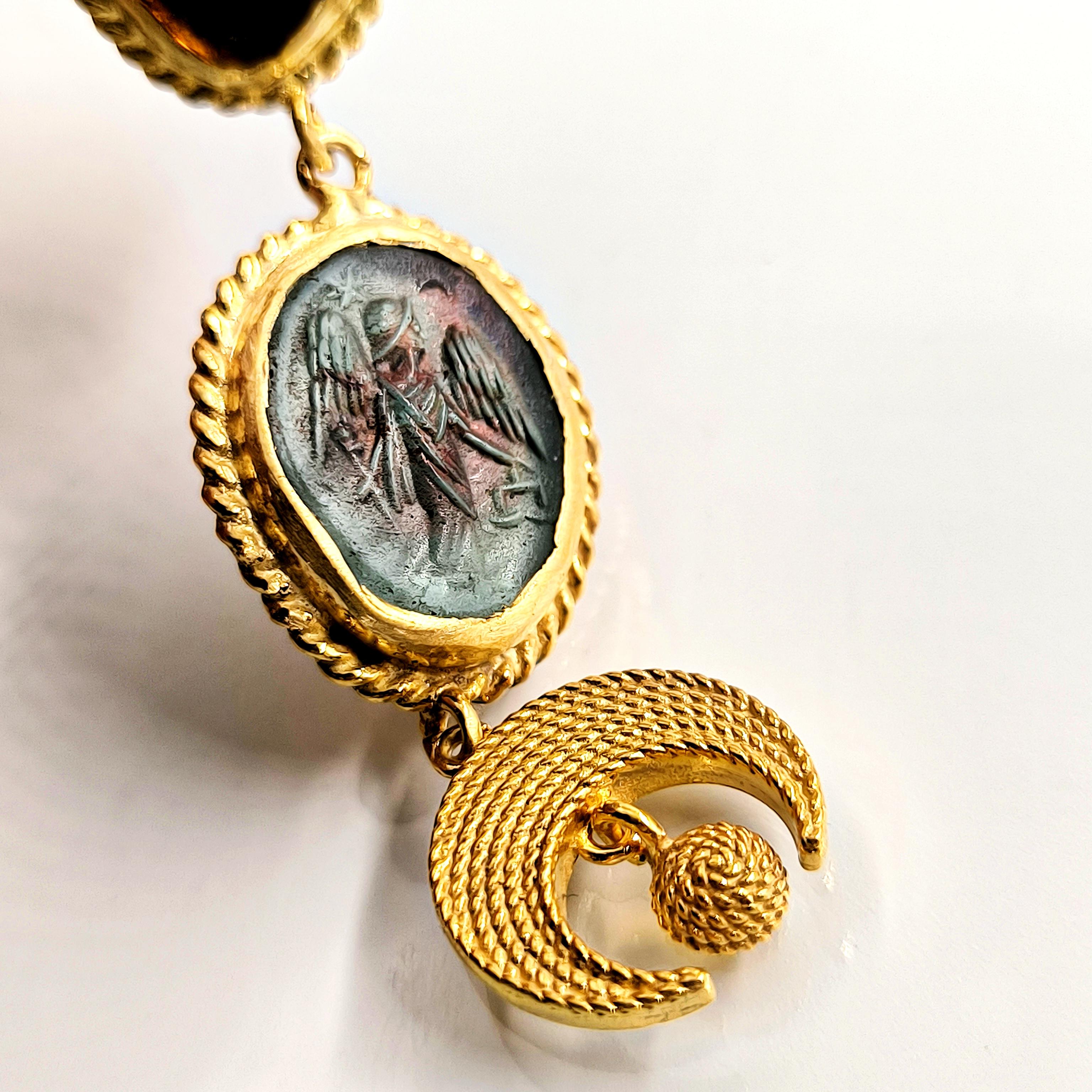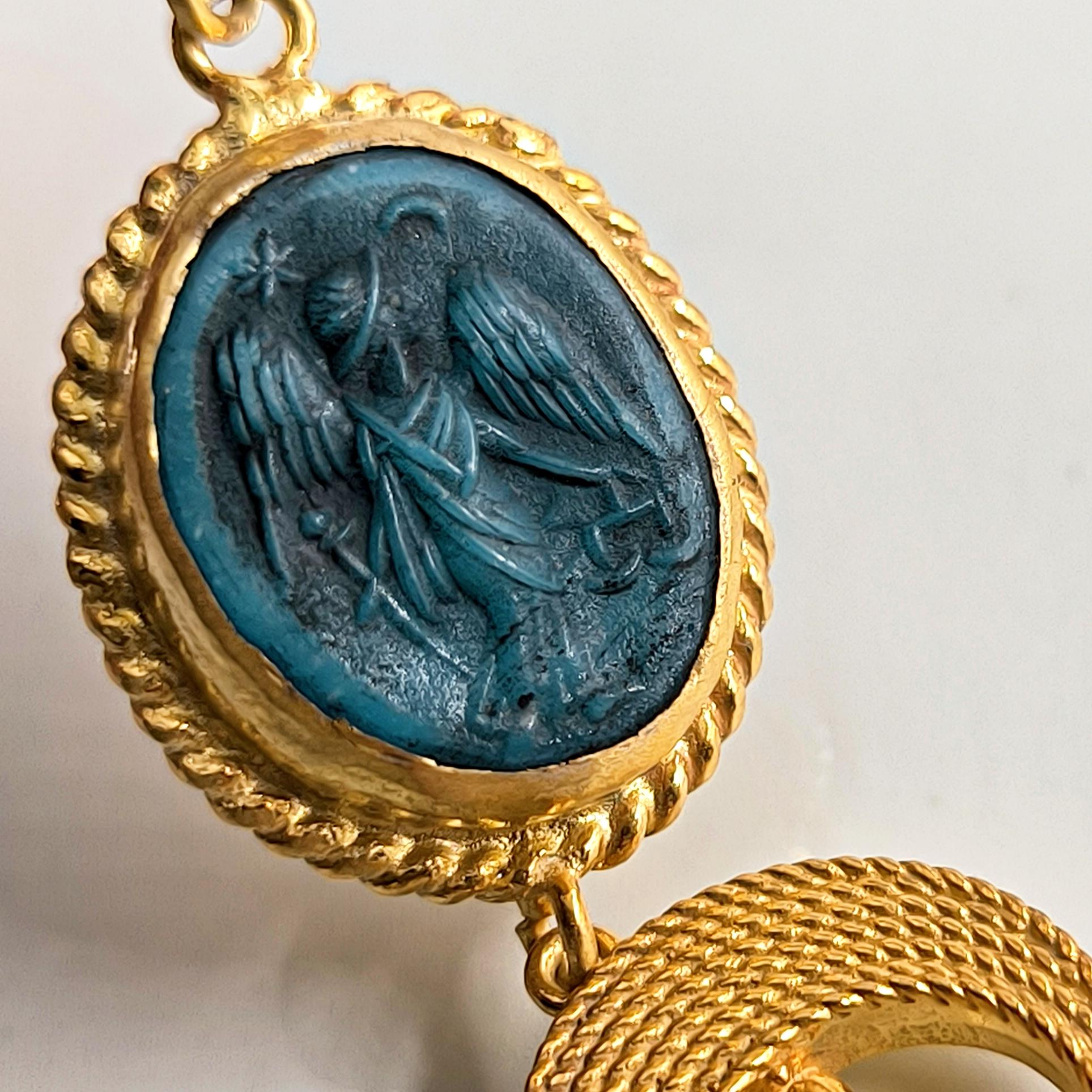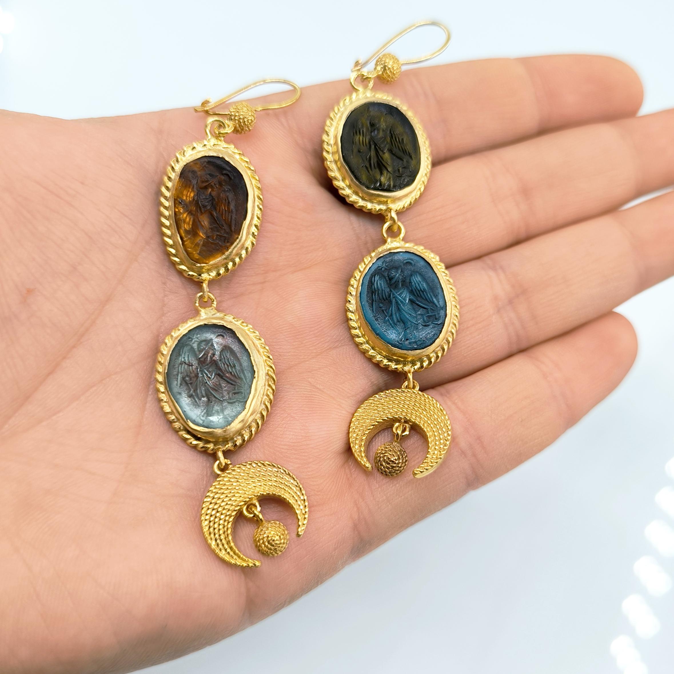 Mitolojik zafer tanrıçaları, üç farklı renkte cam üzerine ustalıkla işlenmiş figürlerle hayat buluyor.