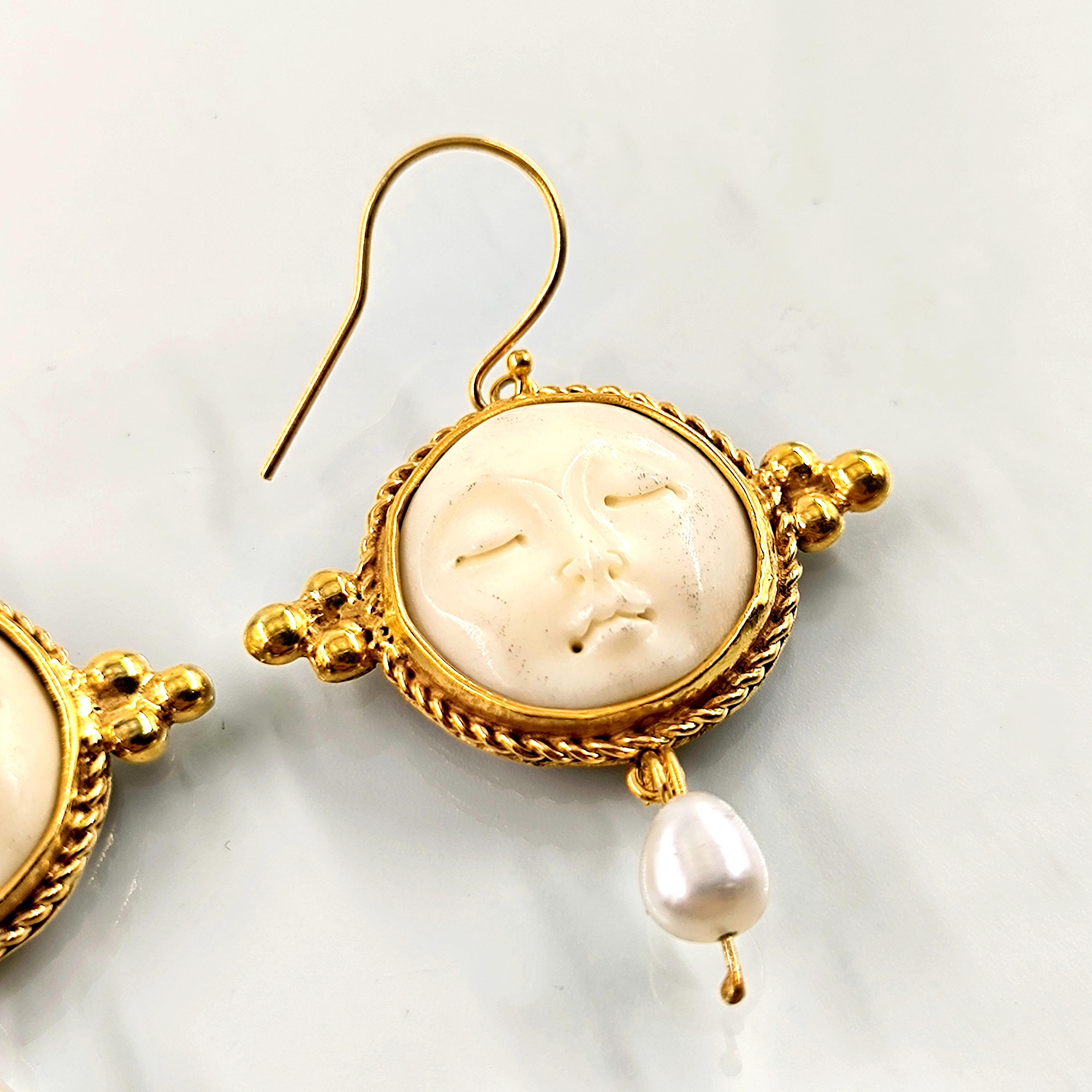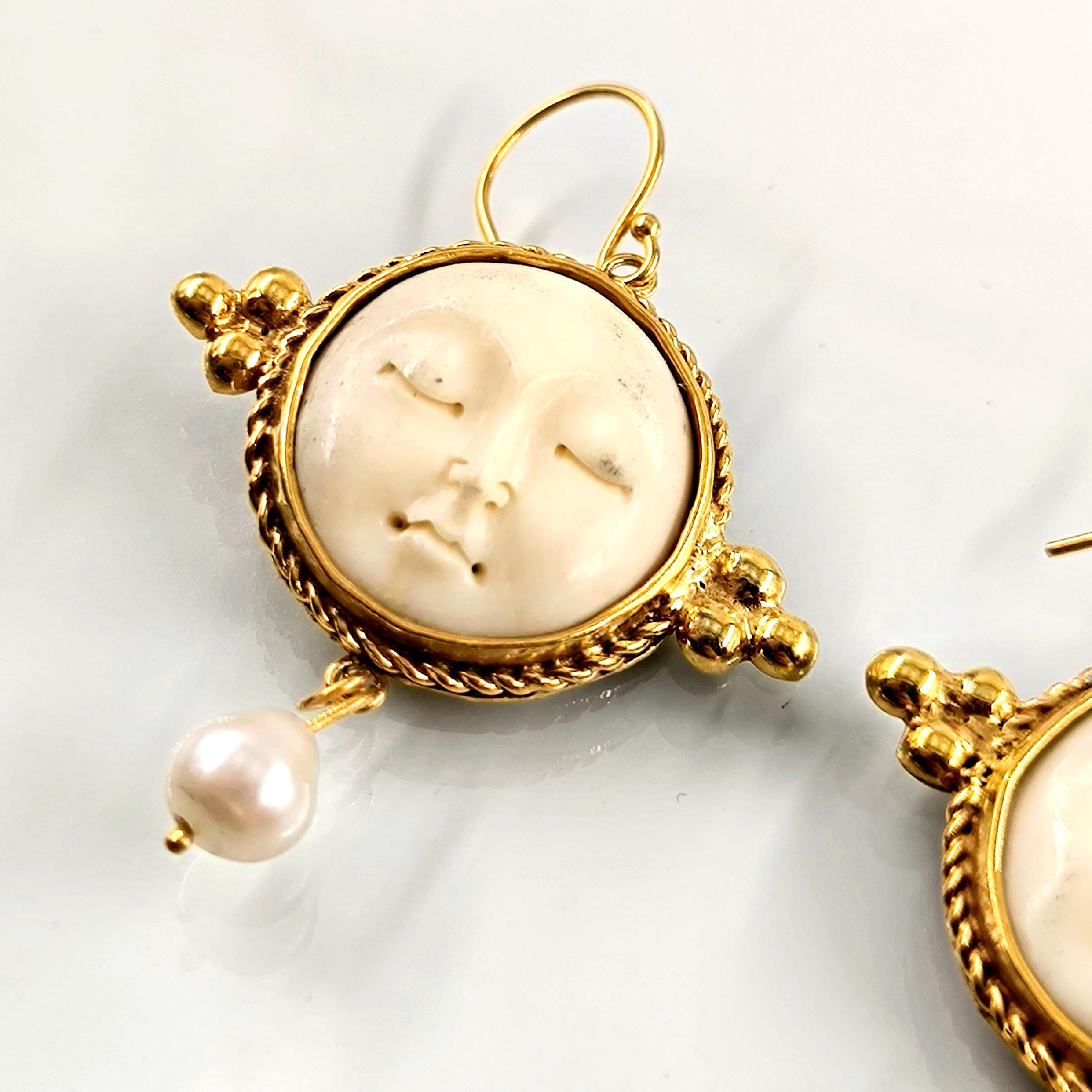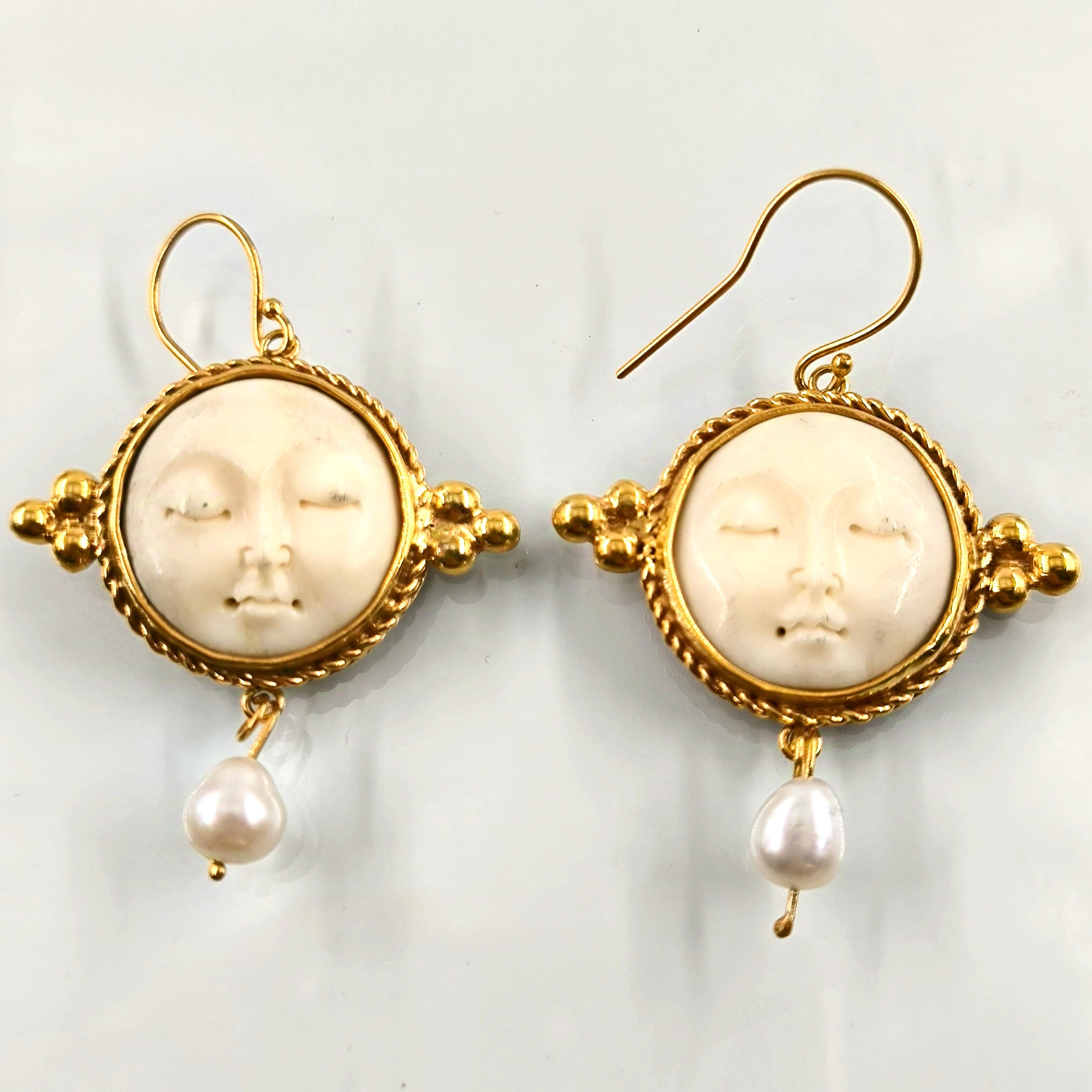 Kemik üzeri gülümseyen yüz carving yapılmış (uzak doğu işçiliği) ve küpe tasarımı biz tarafından yapılan incilerle süslü 925 Ayar gümüş ve üzeri altın kaplama antik stil küpelerimiz!