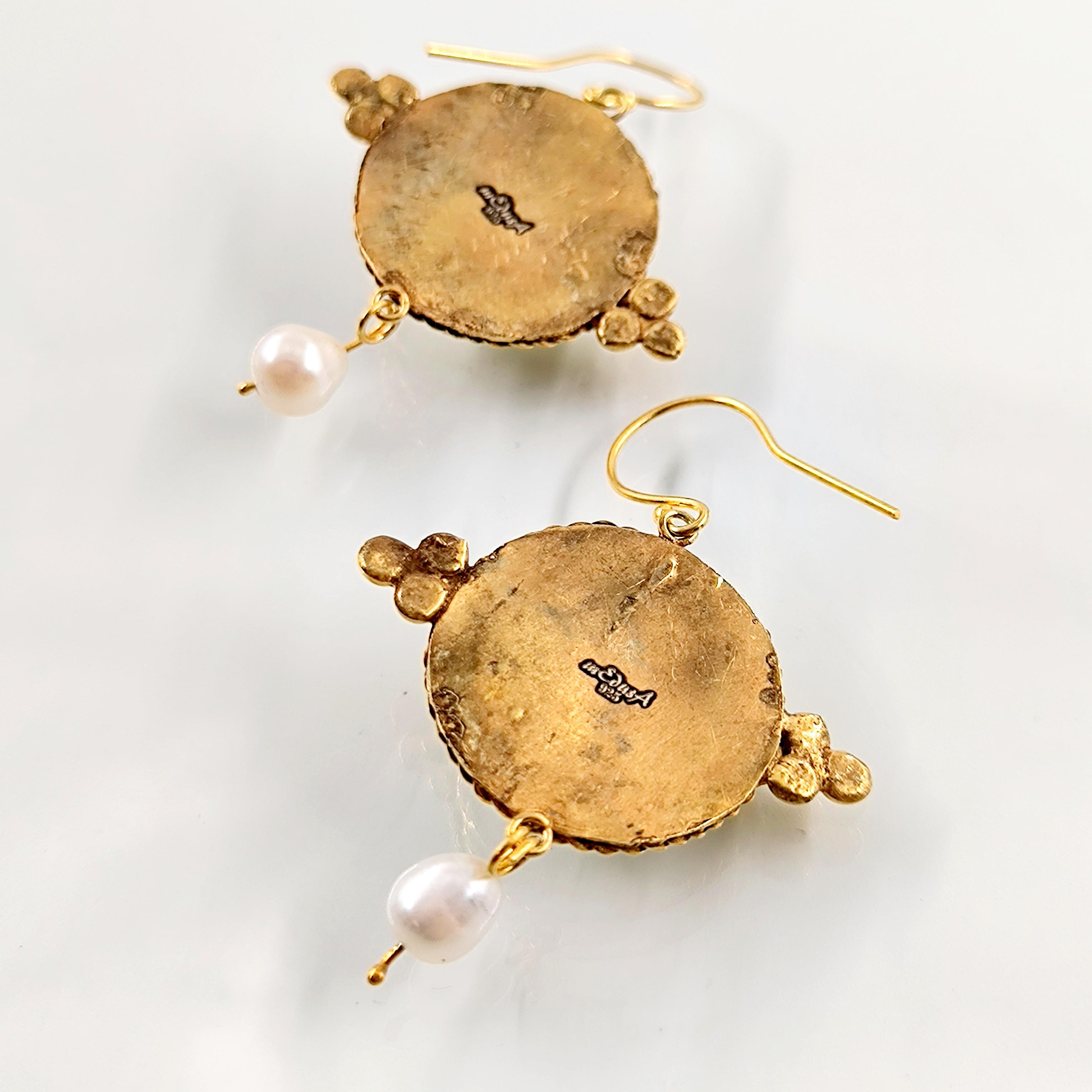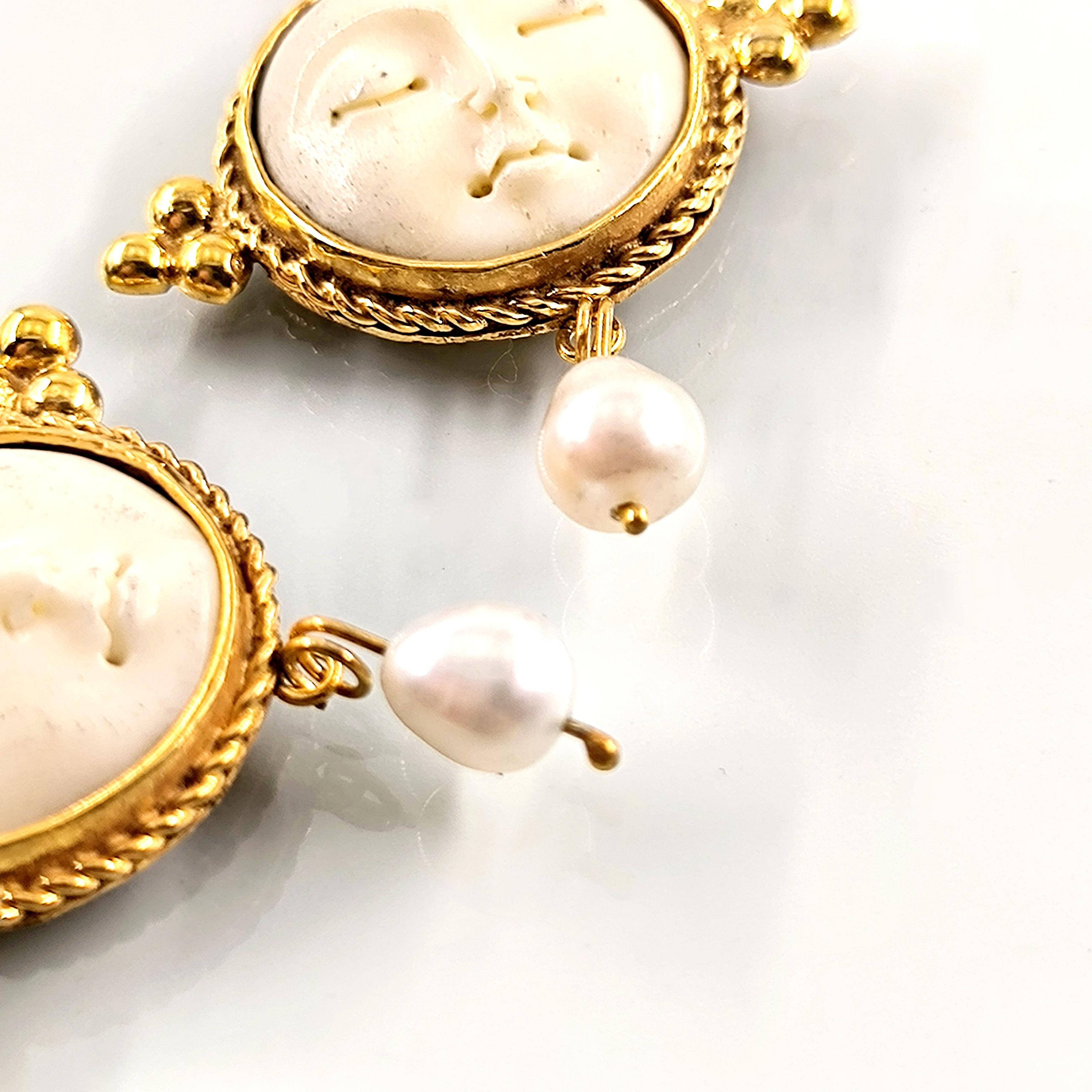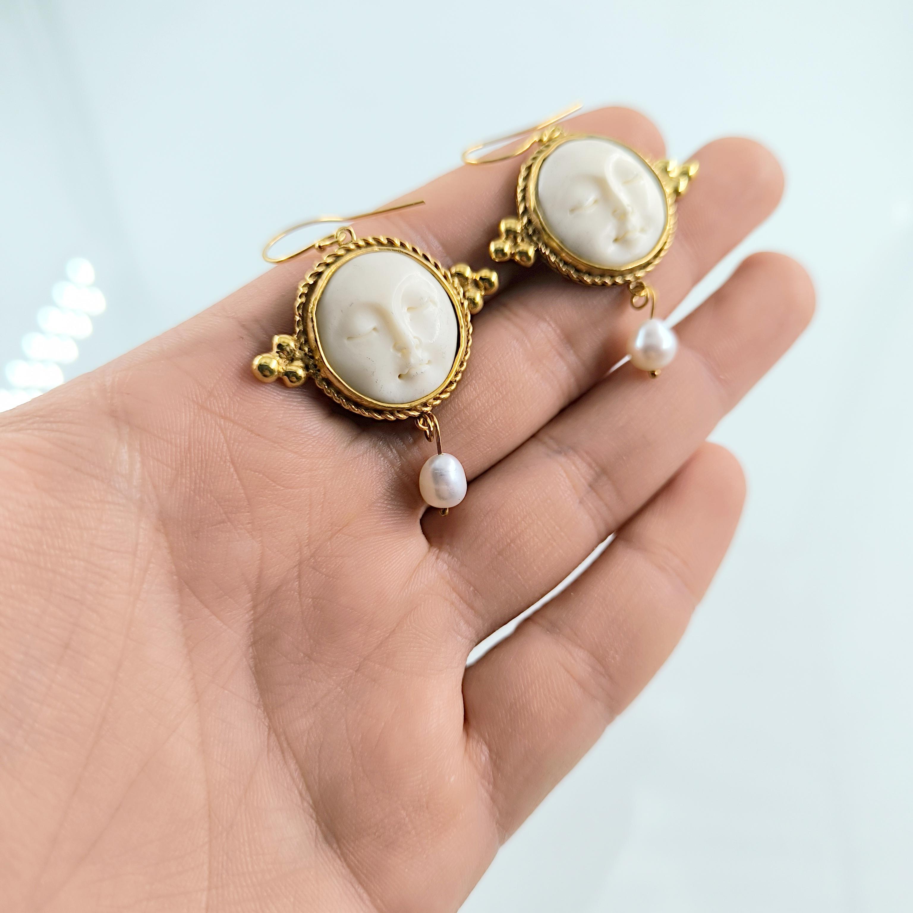 Kemik üzeri gülümseyen yüz carving yapılmış (uzak doğu işçiliği) ve küpe tasarımı biz tarafından yapılan incilerle süslü 925 Ayar gümüş ve üzeri altın kaplama antik stil küpelerimiz!