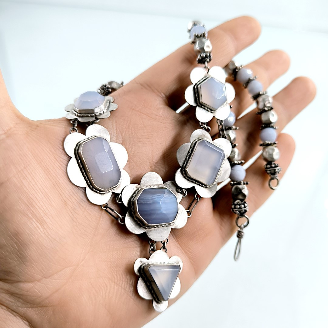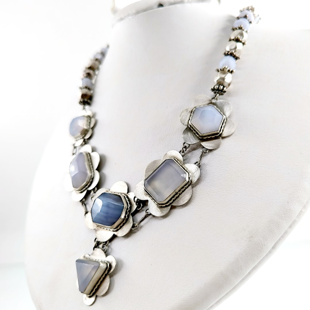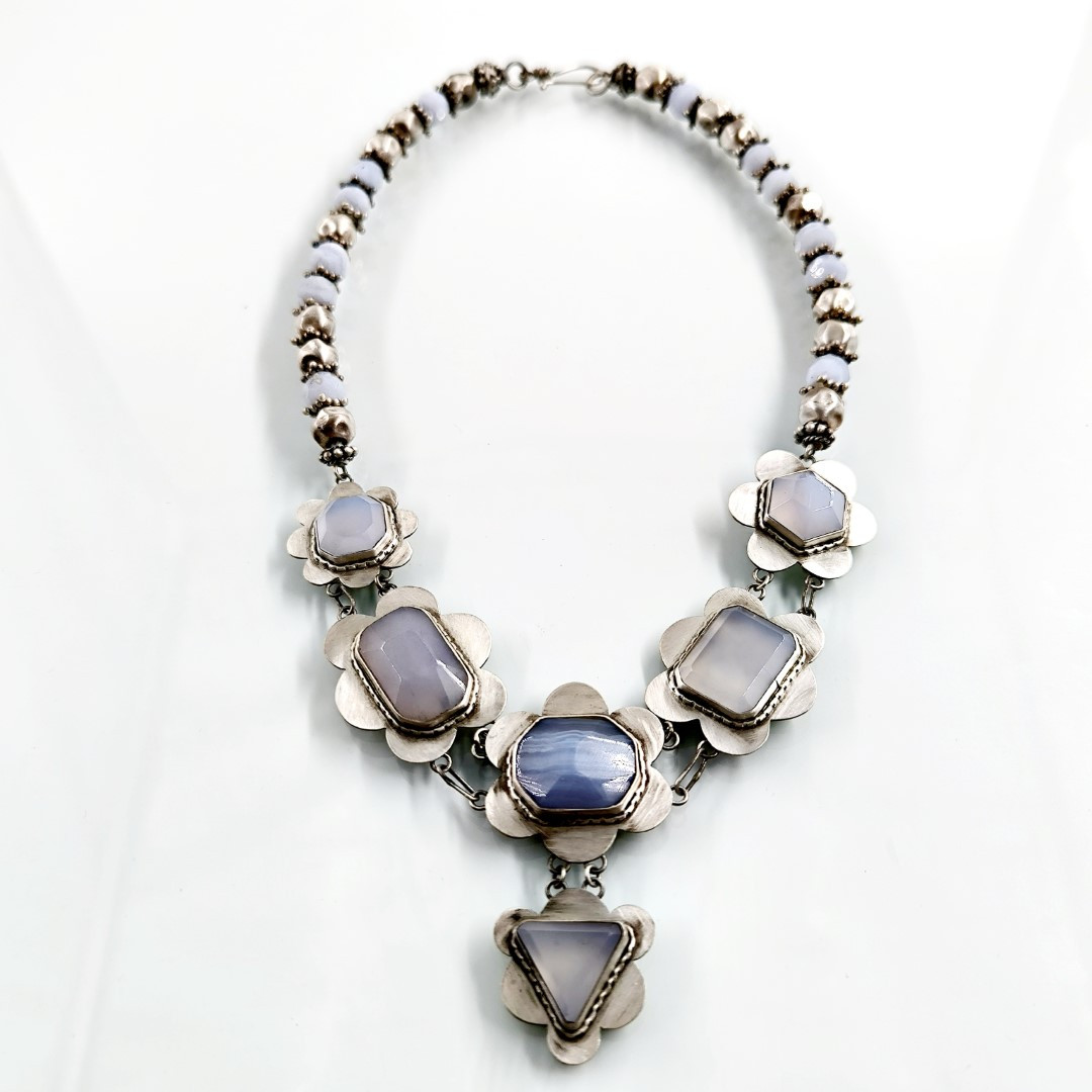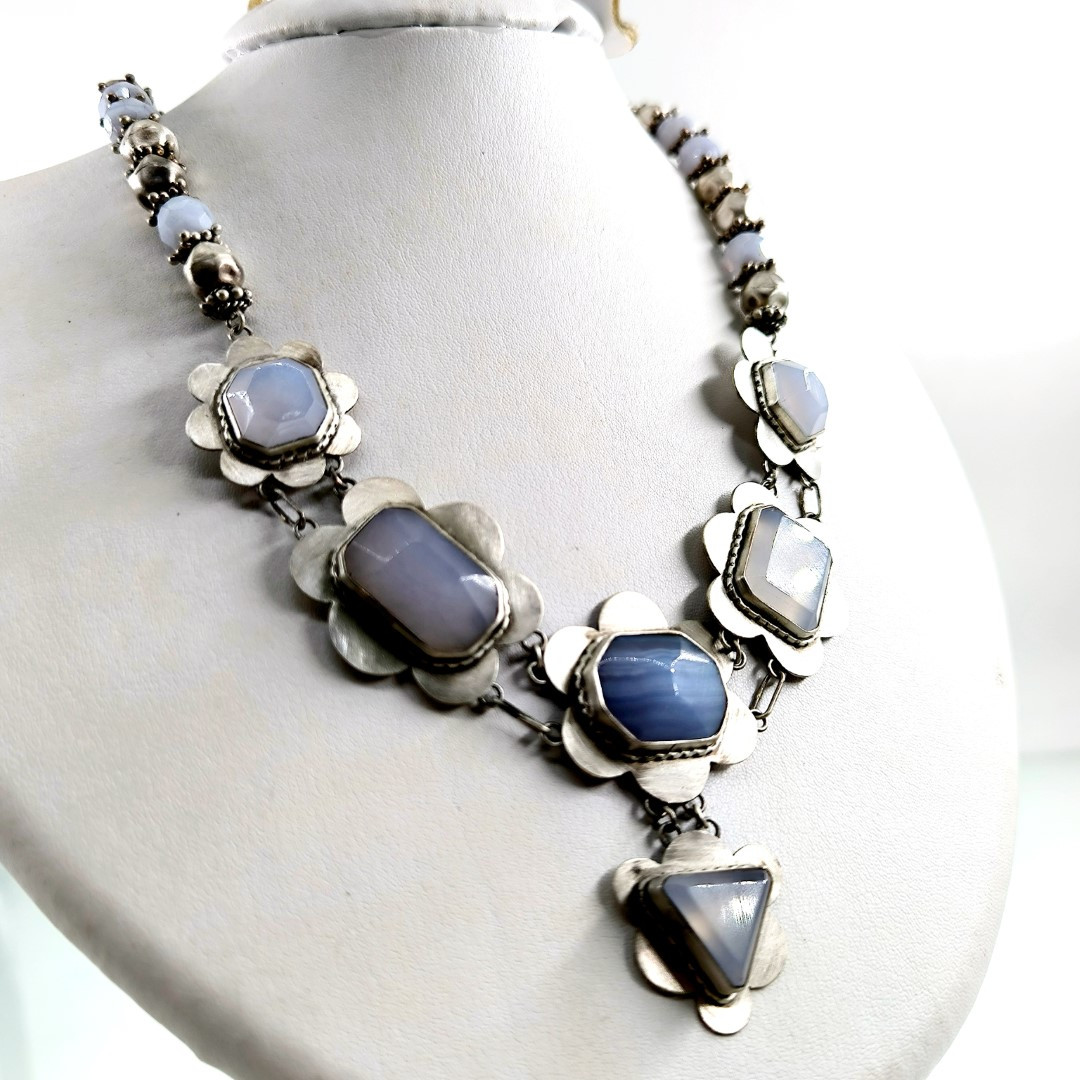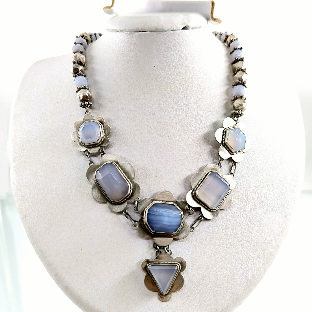 Eski vintage yapım 925 Ayar Gümüşten sanatçı imzalı Kalsedon taşlarla bezeli müthiş bir doğaltaş gerdanlık!