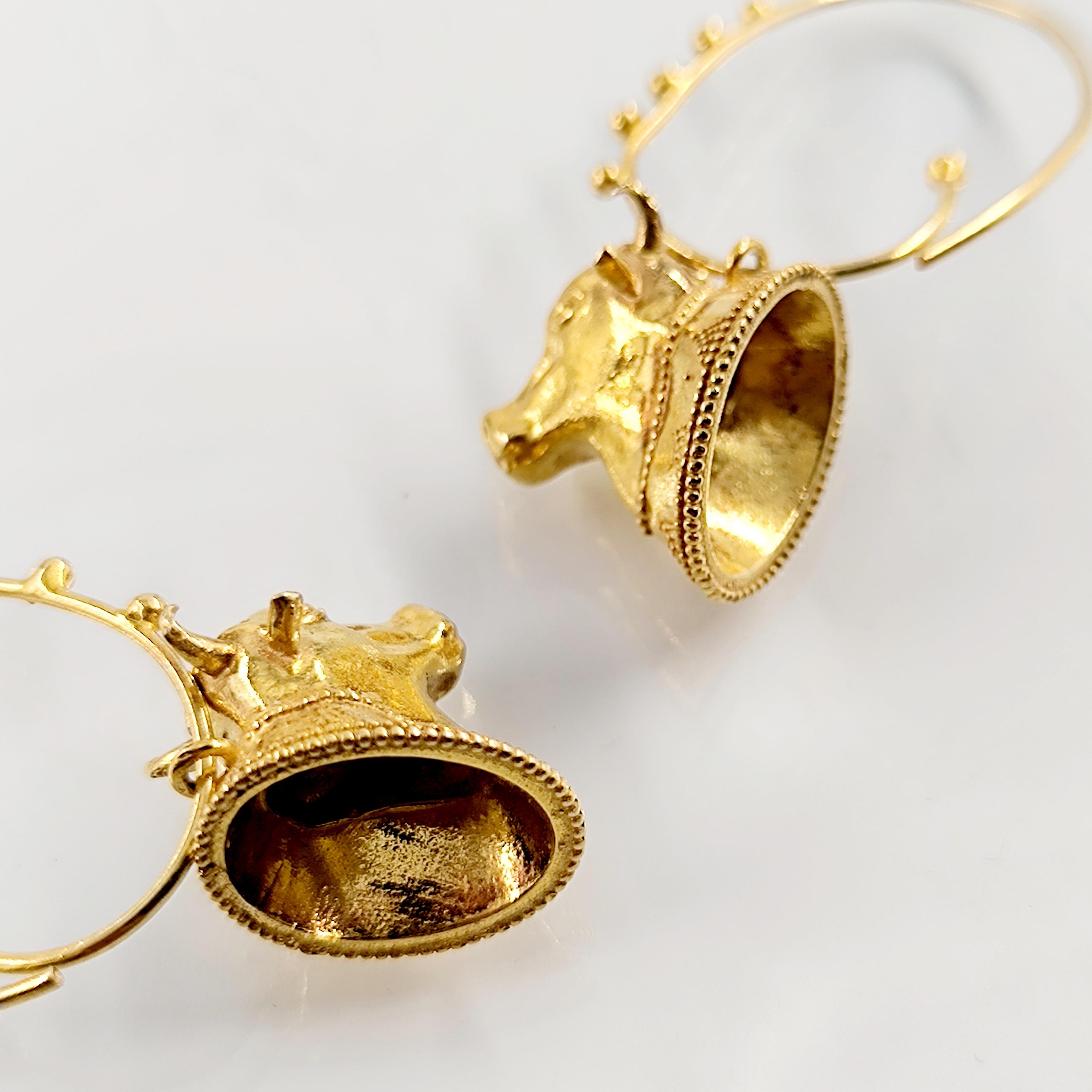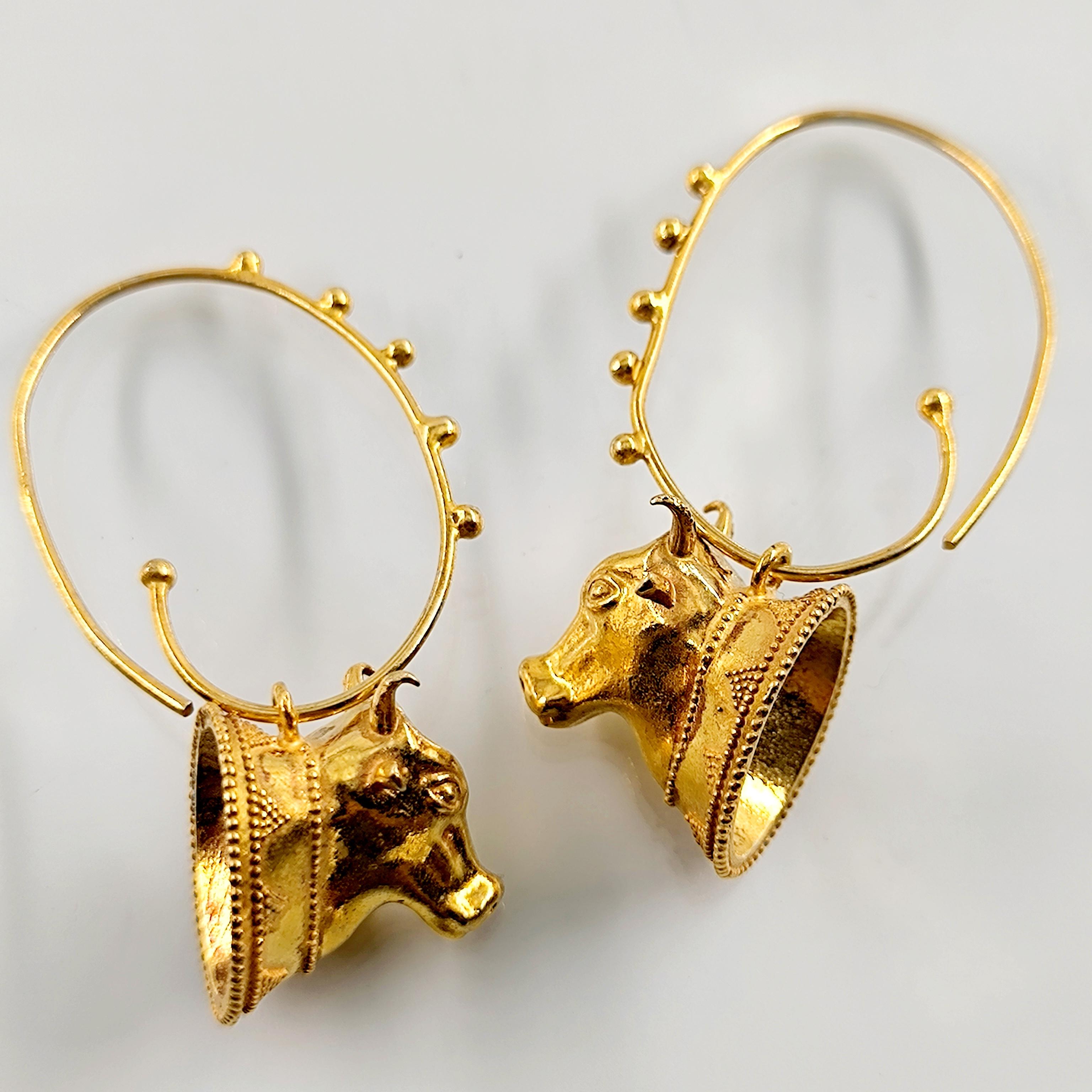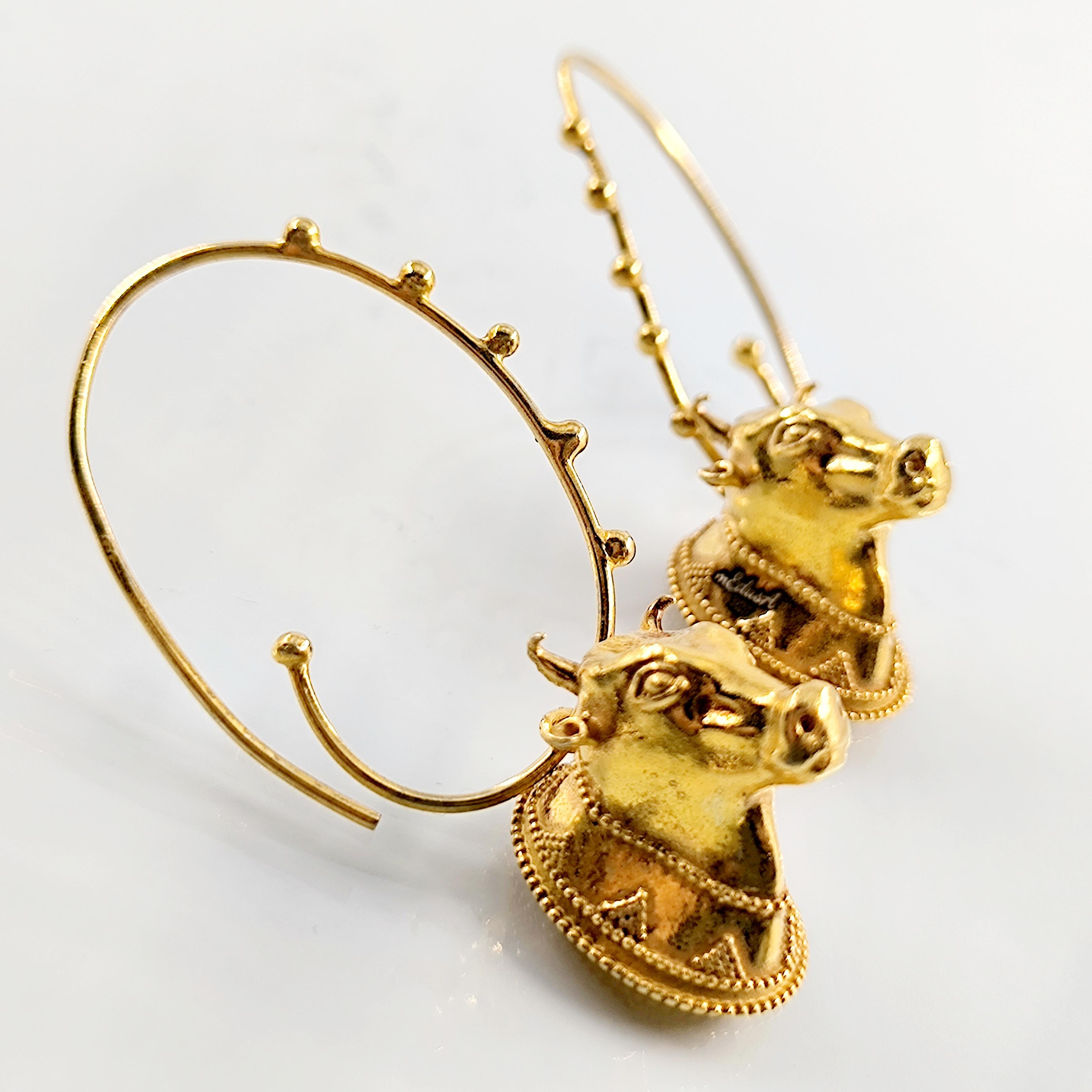 Helenistik dönem mücevherlerinden ilham alarak tasarladığımız, Boğa başlı yoğun güverse işçilikli İnek başlı 925 Ayar Gümüş üzeri altın kaplama küpelerimiz!