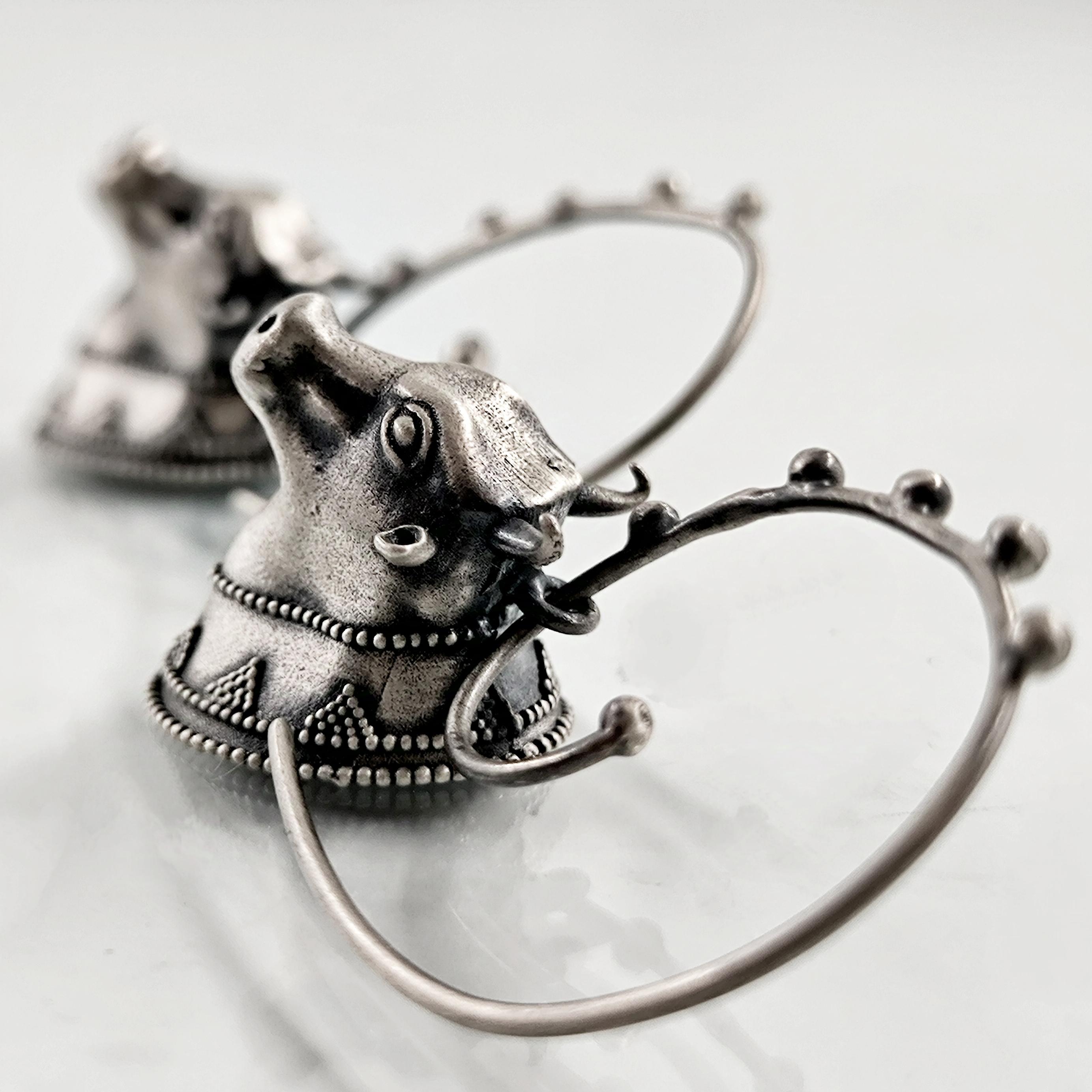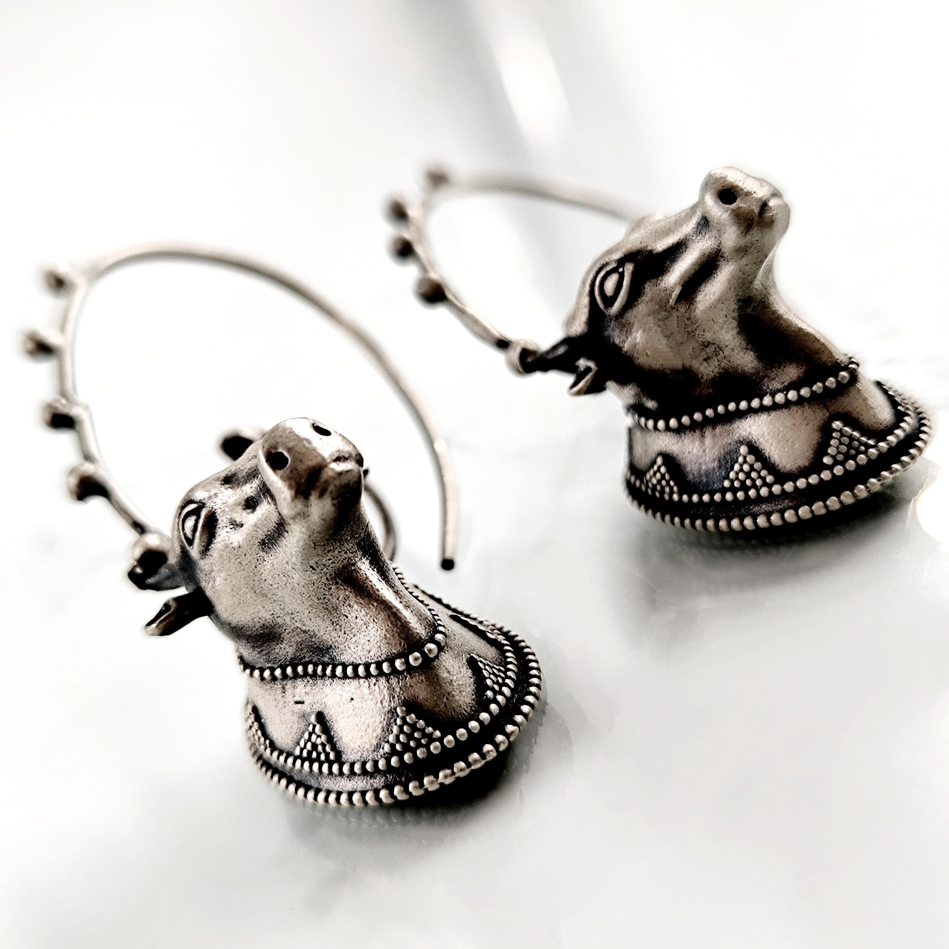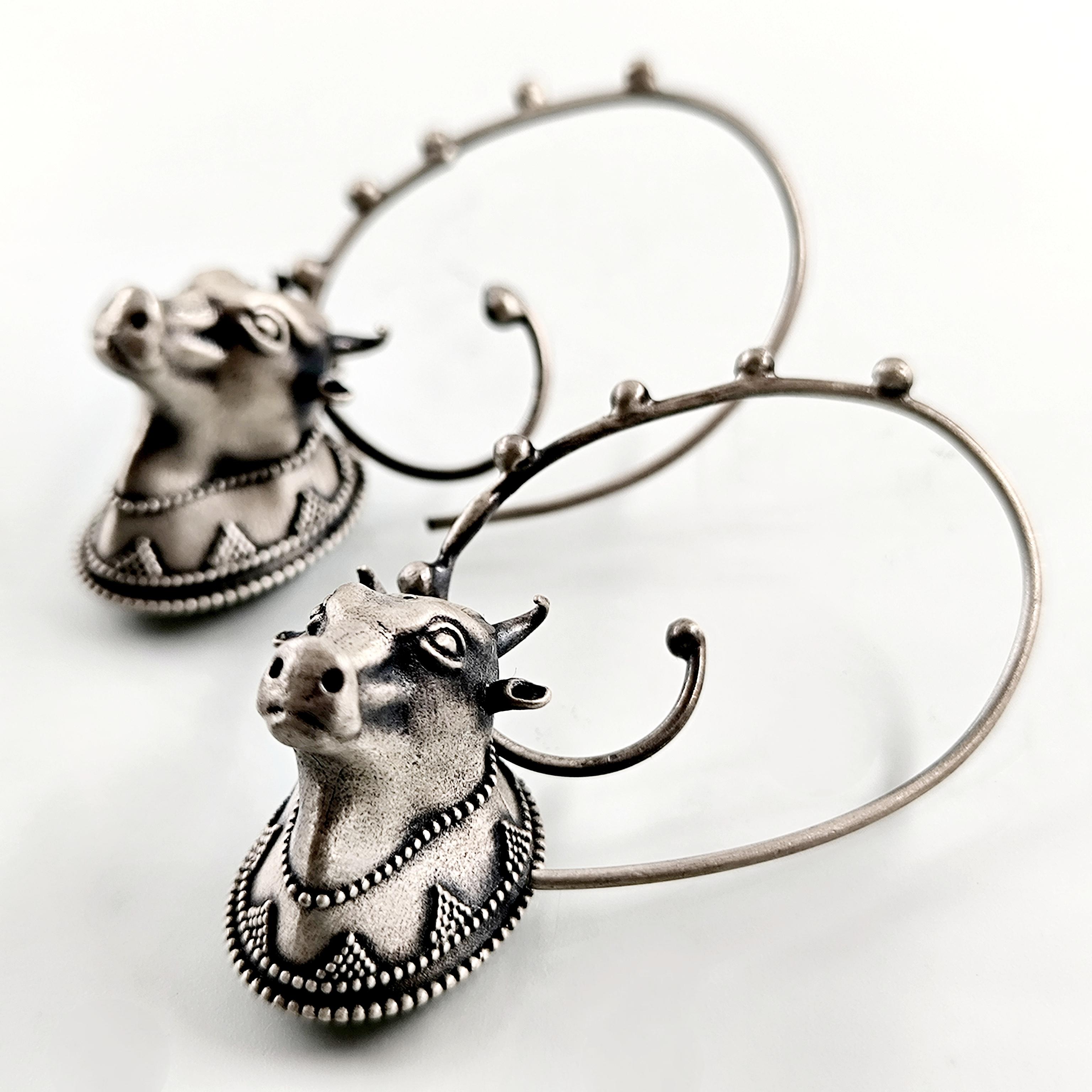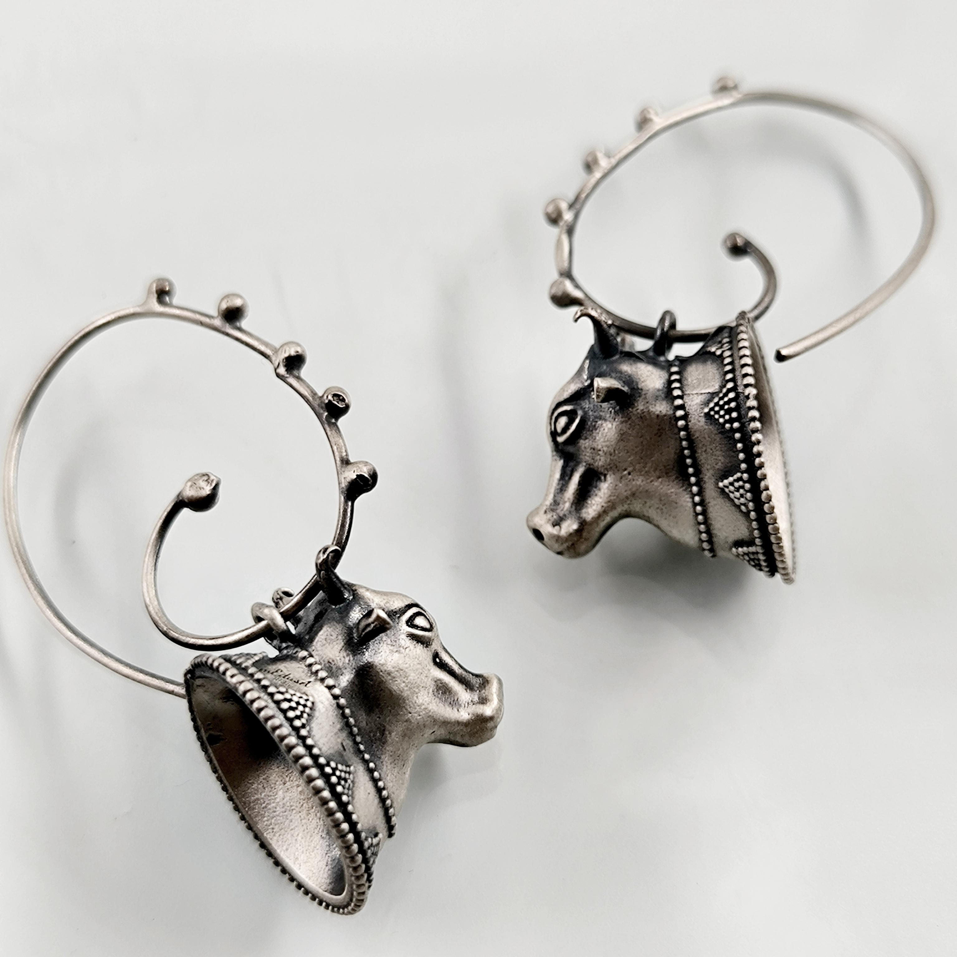 Helenistik dönem mücevherlerinden ilham alarak tasarladığımız, Boğa başlı yoğun güverse işçilikli İnek başlı 925 Ayar Gümüş küpelerimiz!