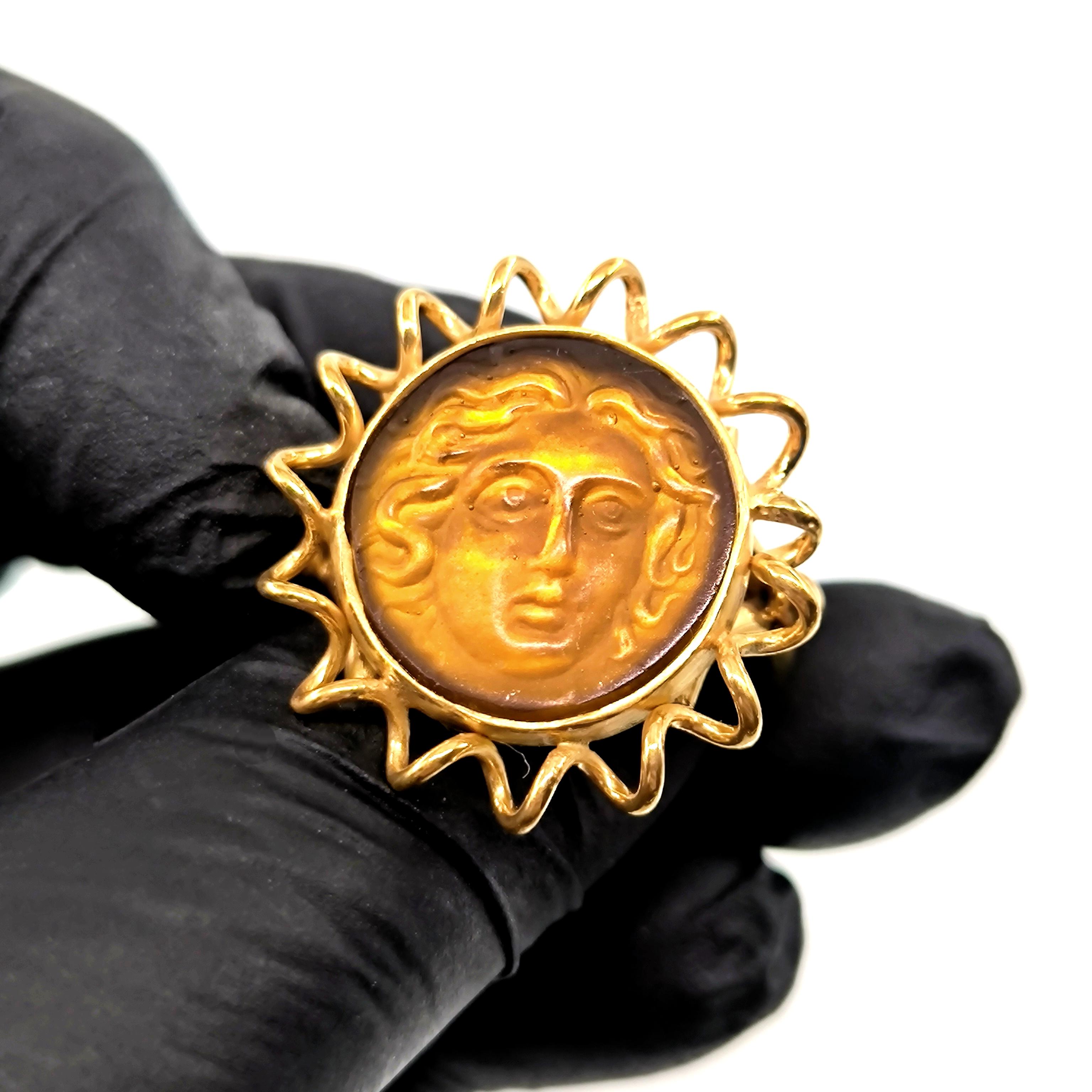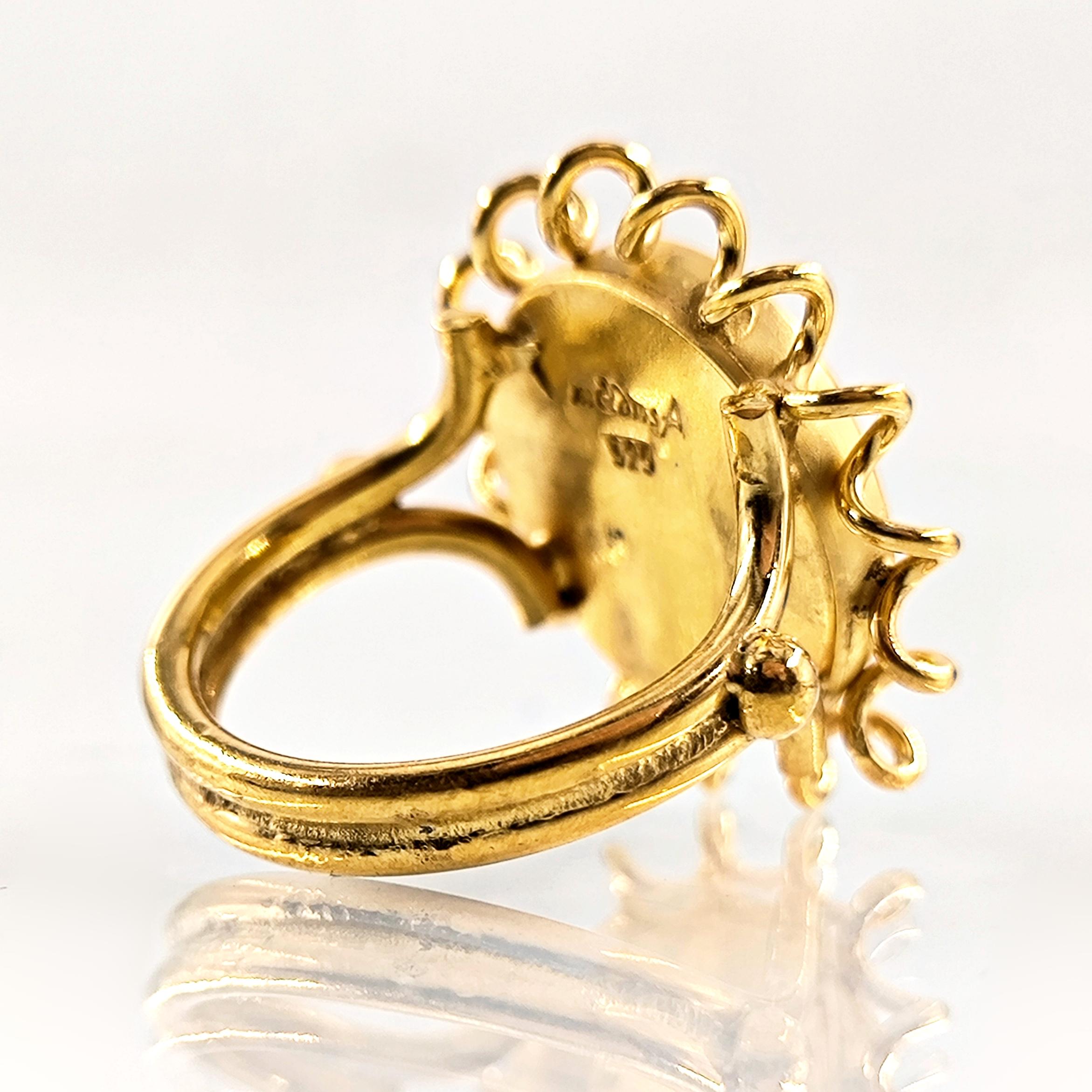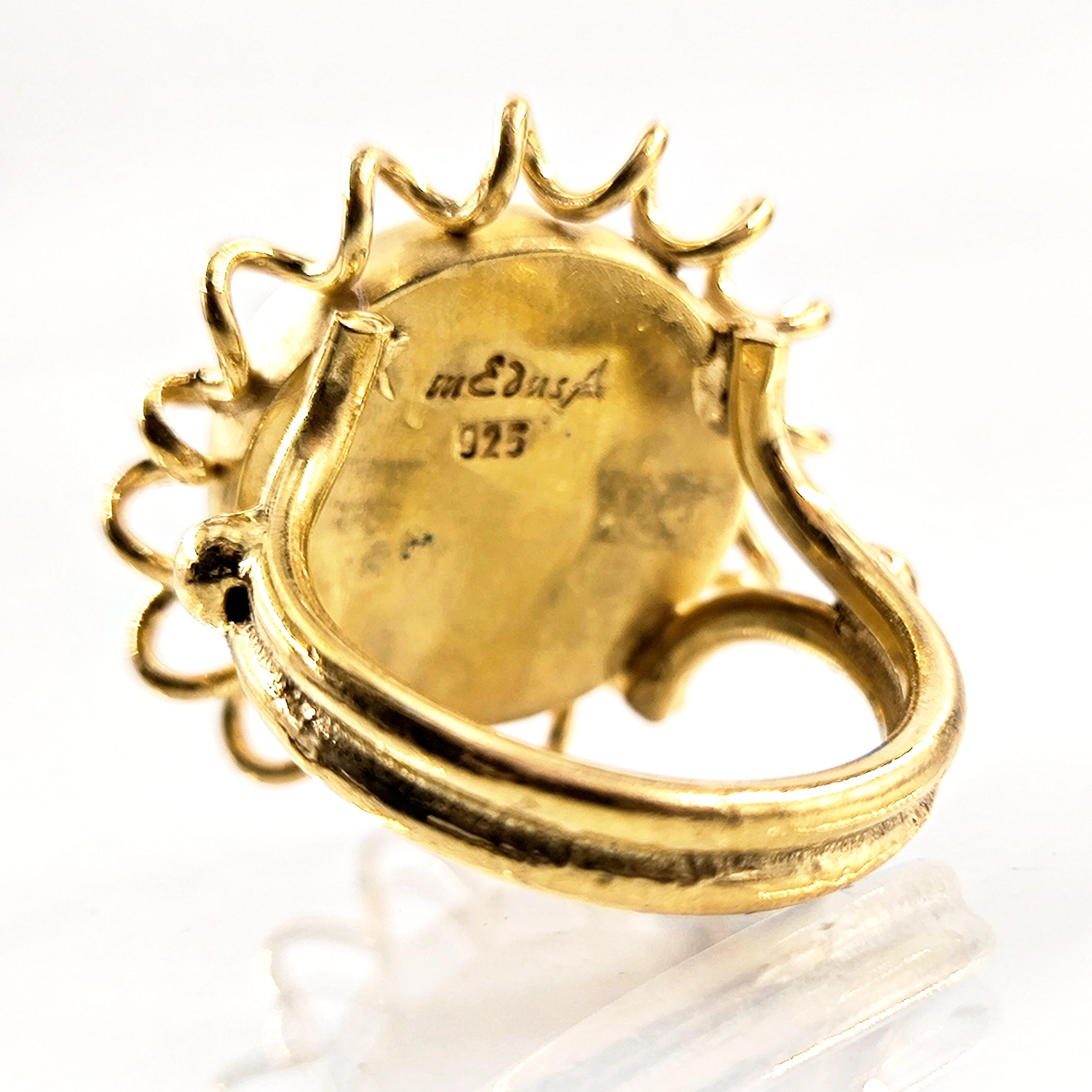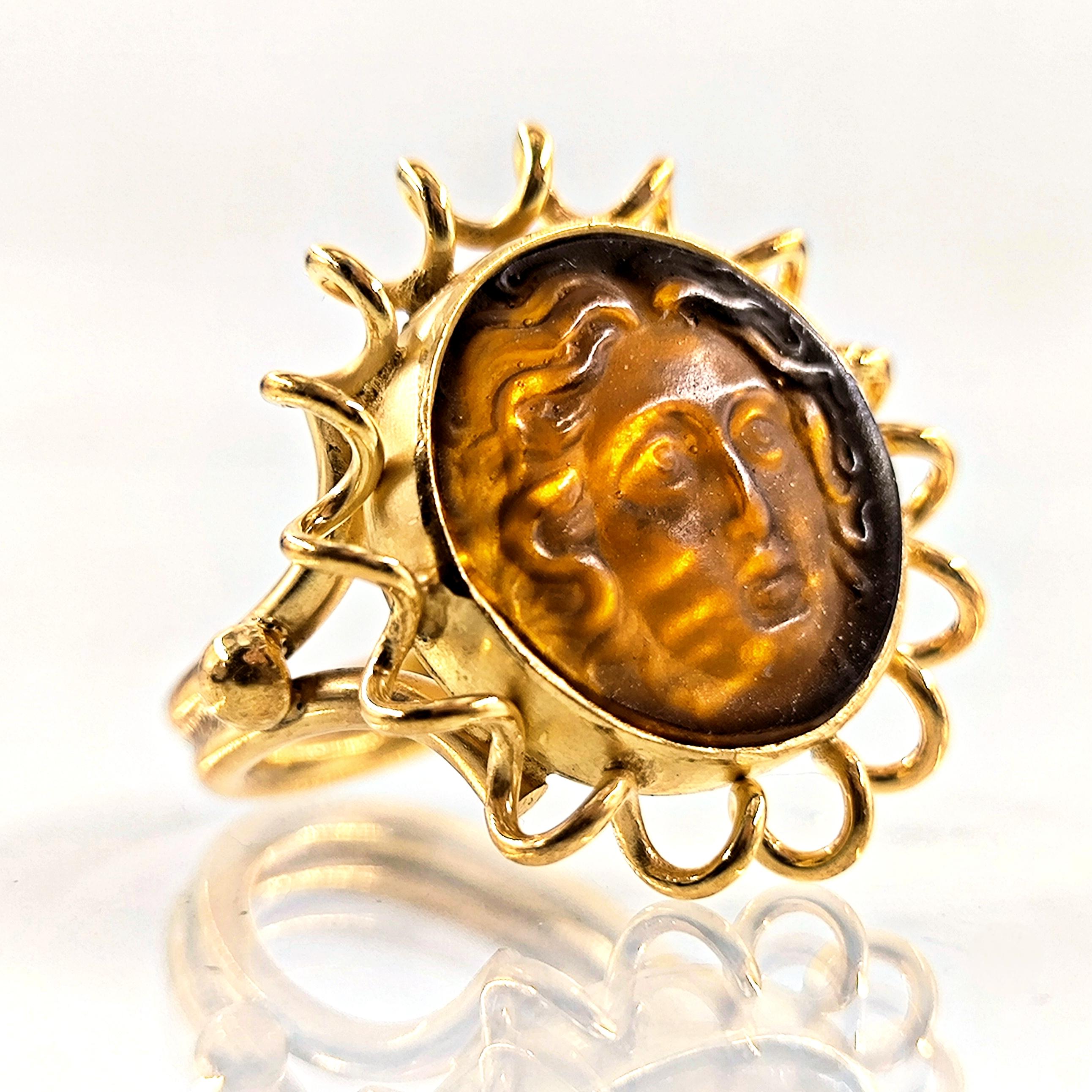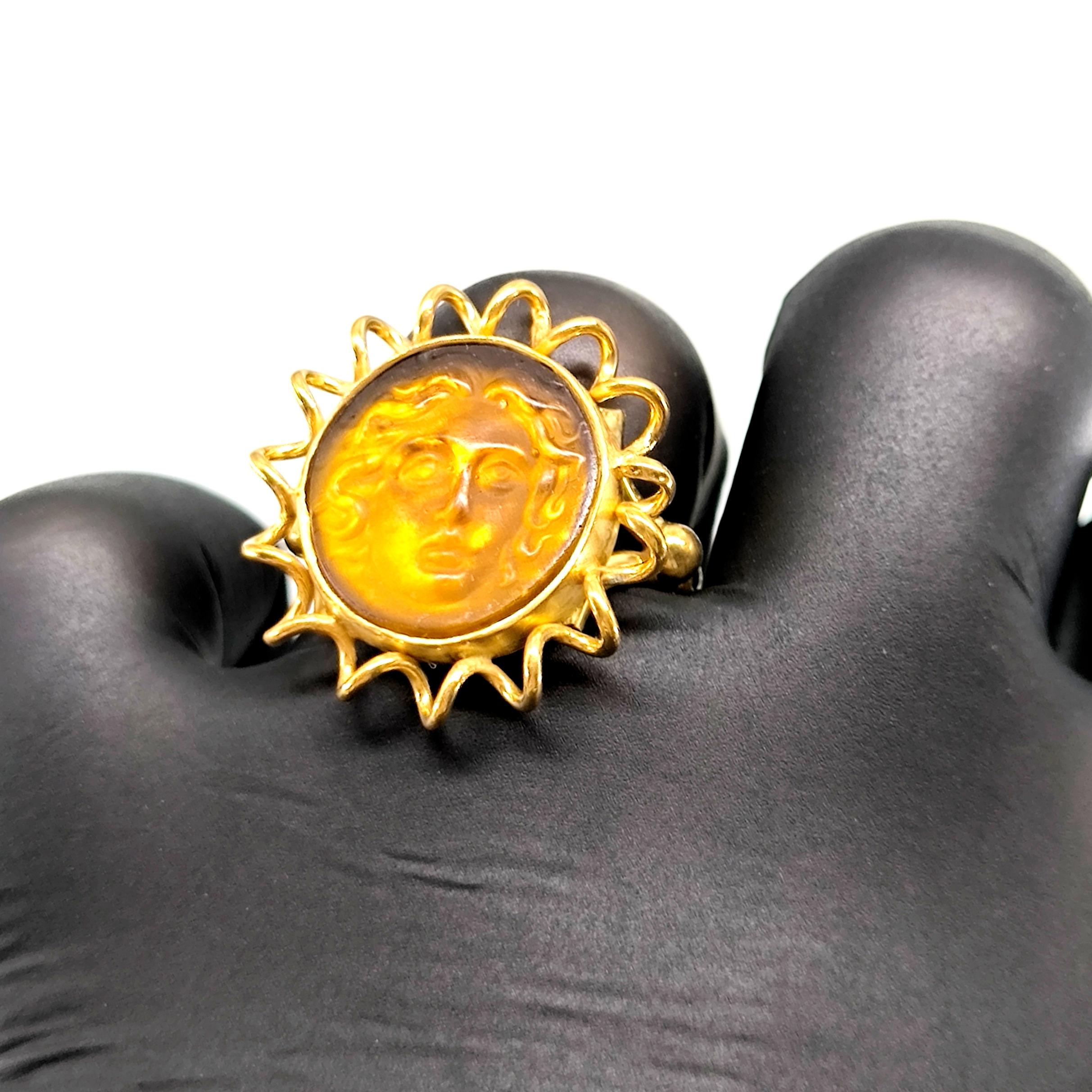 Güneşin gün batımına yaklaşırken aldığı sıcak altın tonları ve zamanın durduğu o büyülü an, bu yüzükte Helios’un yüzünde yeniden can buluyor. Antik çağlarda yaşamı, kudreti ve kozmik düzeni temsil eden güneş tanrısı, turuncu camın içinden yükselen ateş rengi bir ışıkla parmağınızda adeta nefes alıyor. Işığa göre derinleşen ve hareketlenen bu ifade, Helios’un her an değişen gücünü ve evrensel döngüsünü simgelerken, yüzüğü yalnızca bir takı değil, sembolik bir mühür hâline getiriyor. Antik stil formu ve güçlü duruşuyla koleksiyonluk bir karakter taşıyan bu parça, bakıldıkça farklı bir ruh hâli sunar. Yüzüğün orta taşı camdır; pres tekniğiyle cam üzerine kabartma Helios figürü işlenmiş, turuncu camın altına yerleştirilen özel foya sayesinde taş janjanlı ve derin bir parlaklık kazanmıştır, metal aksamlar ise antik eskitme gümüşten üretilmiştir.